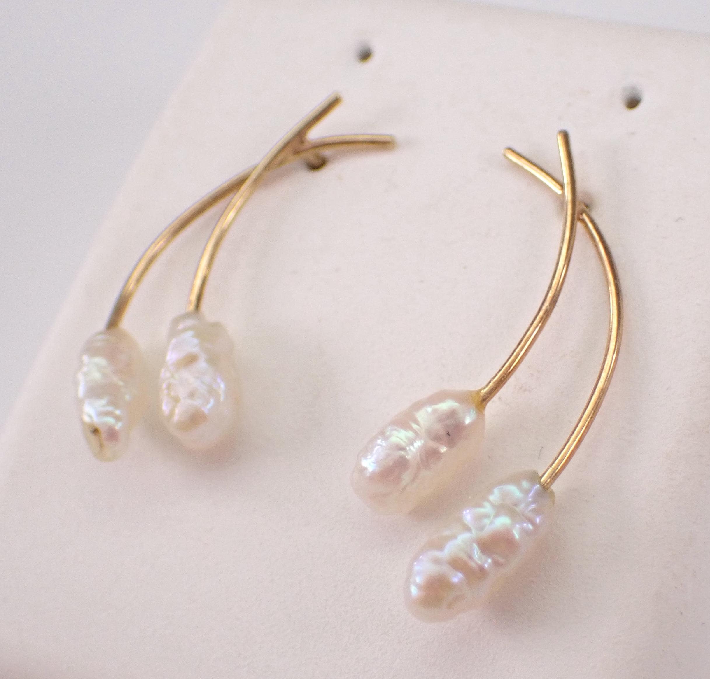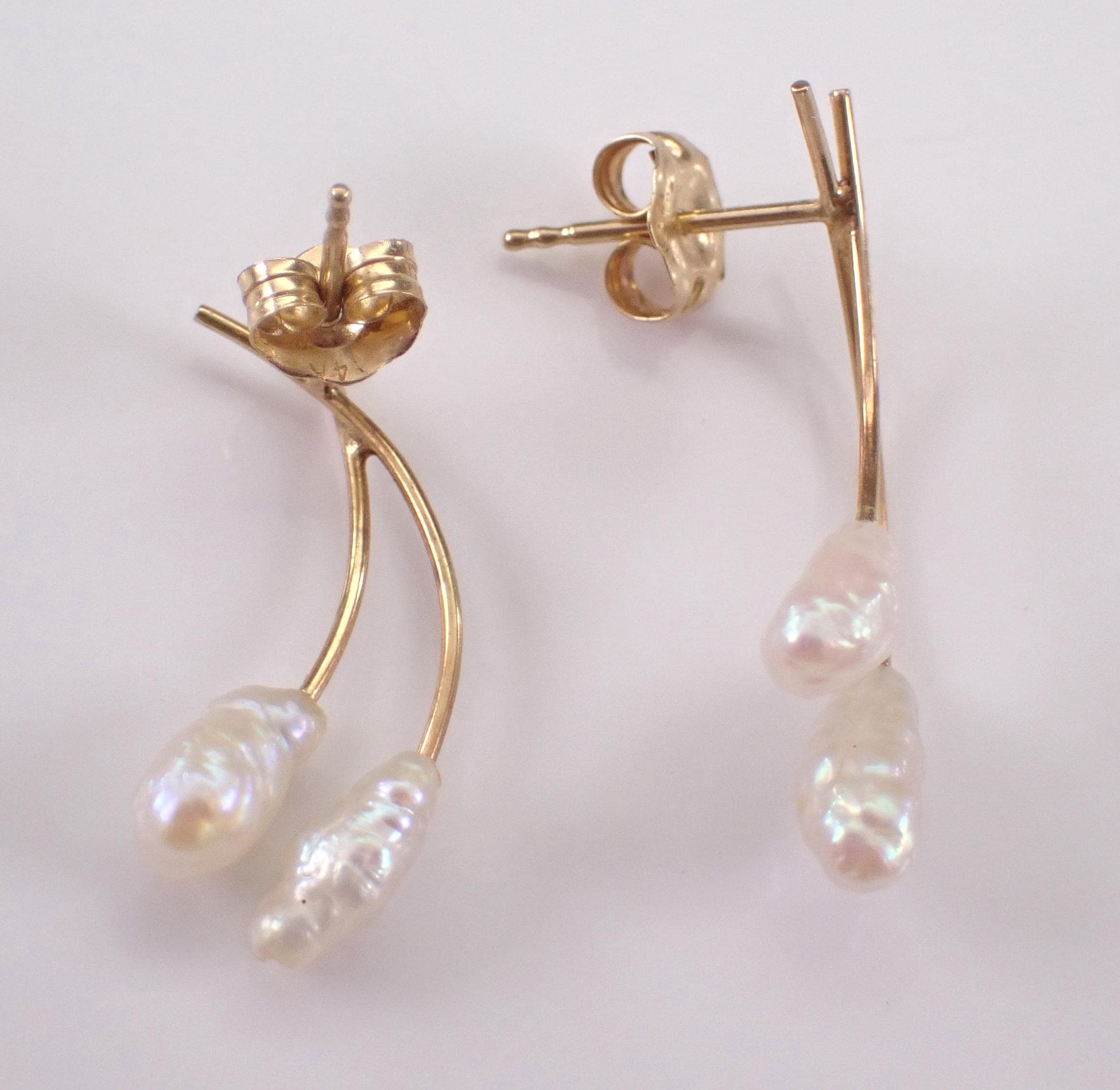 Vintage 14K Yellow Gold Pearl Earrings. There are two genuine Freshwater pearls set in each earring. These earrings weigh a total of 1.0 grams and the earrings measure 22 mm in length. These earrings are for pierced ears and have friction post backings. These earrings will be shipped promptly in a gift box.