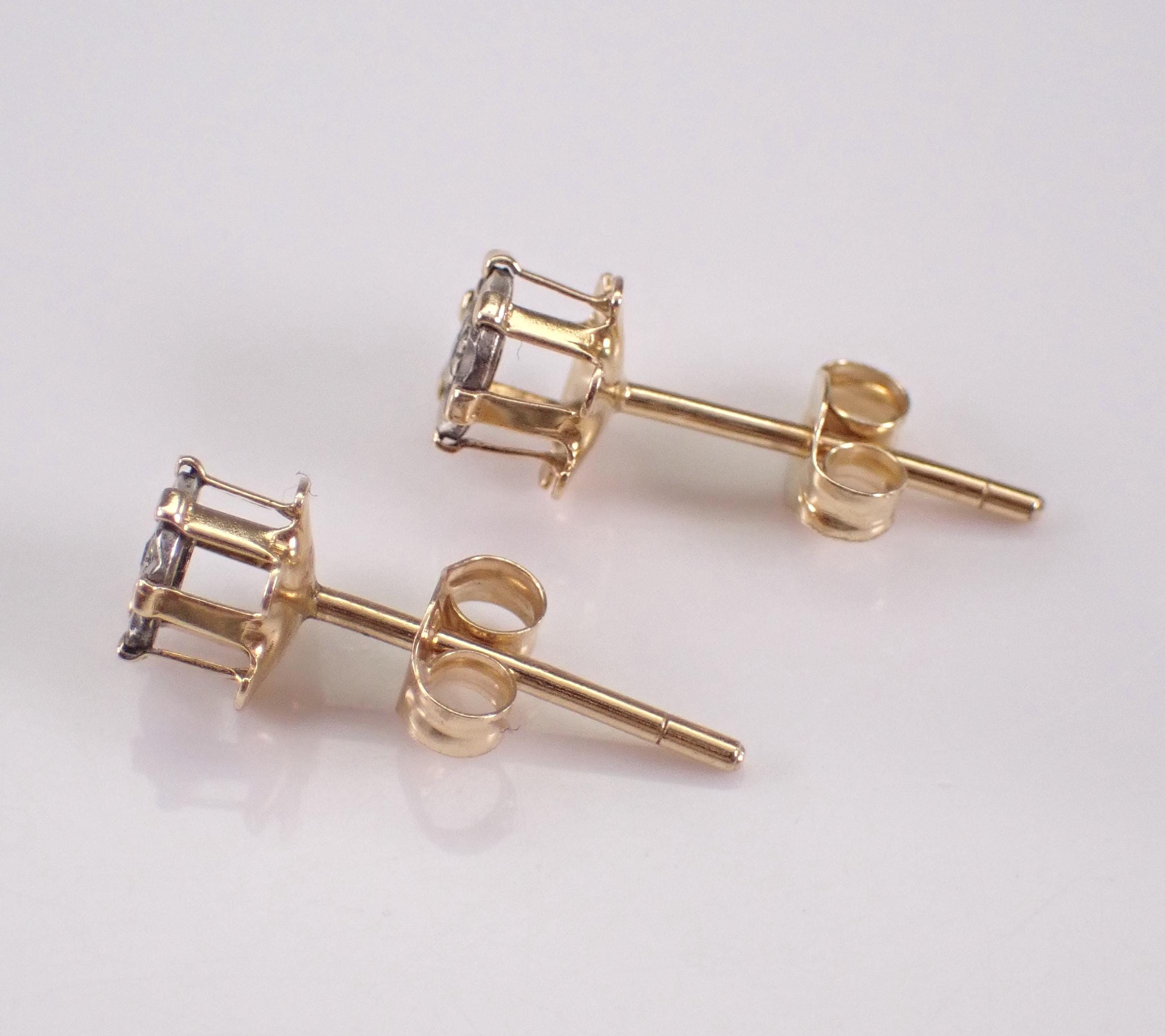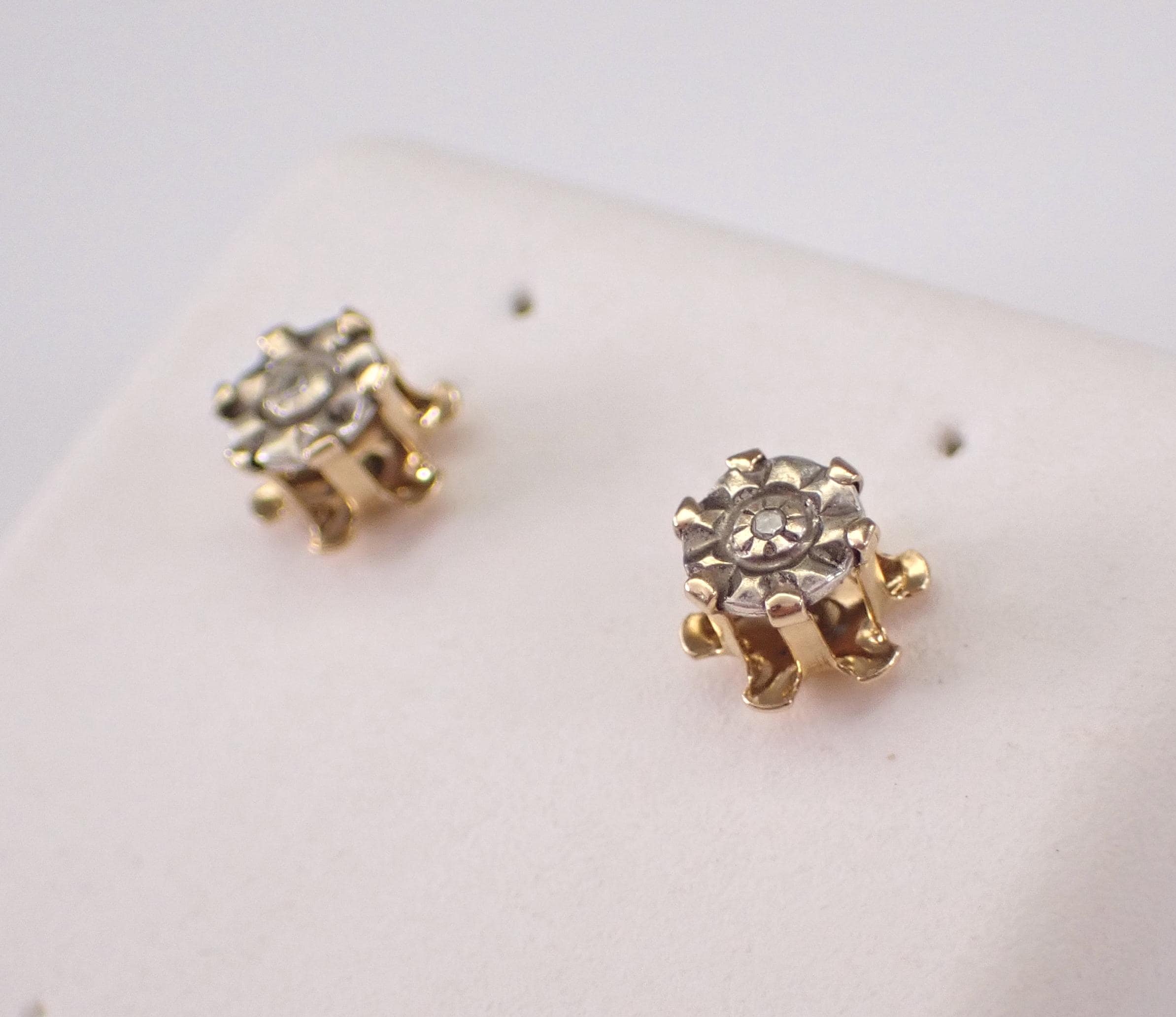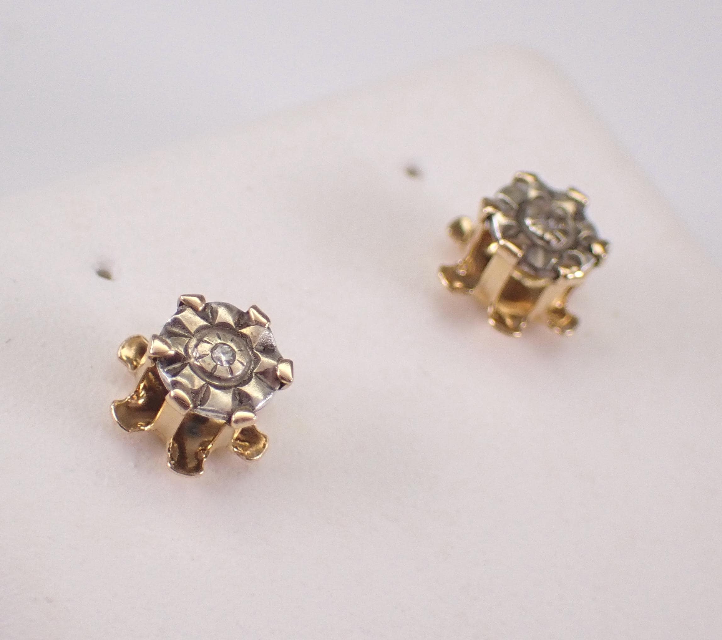 14K Yellow Gold Vintage Diamond Stud Earrings. These earrings are set with one genuine Round Diamond in EACH earring. These Diamonds are illusion set and amount to a total weight of .02 carat. These earrings weigh a total of .6 grams and measure 4.5 mm in diameter each. These earrings are for pierced ears and have friction post backings. I will ship these earrings promptly in a gift box.