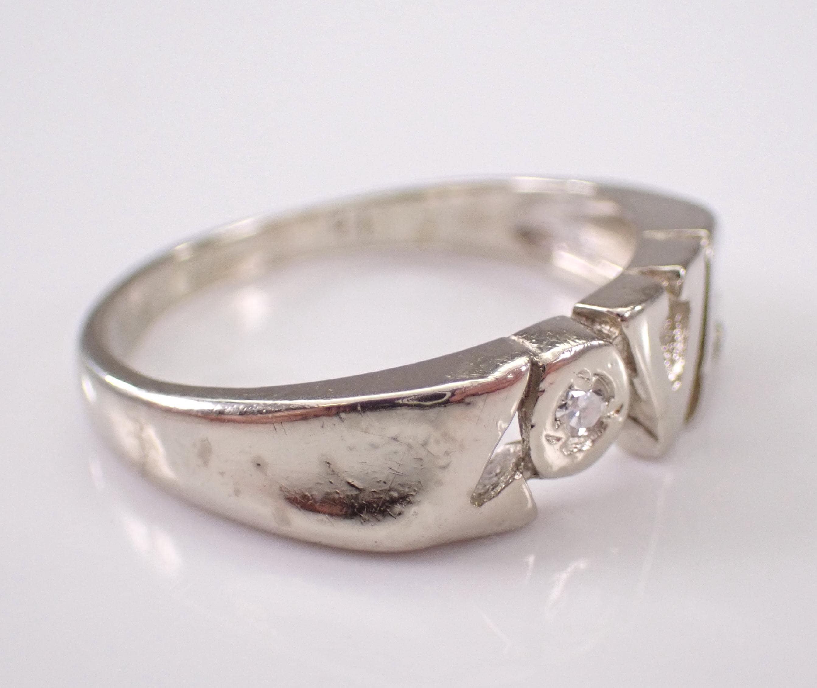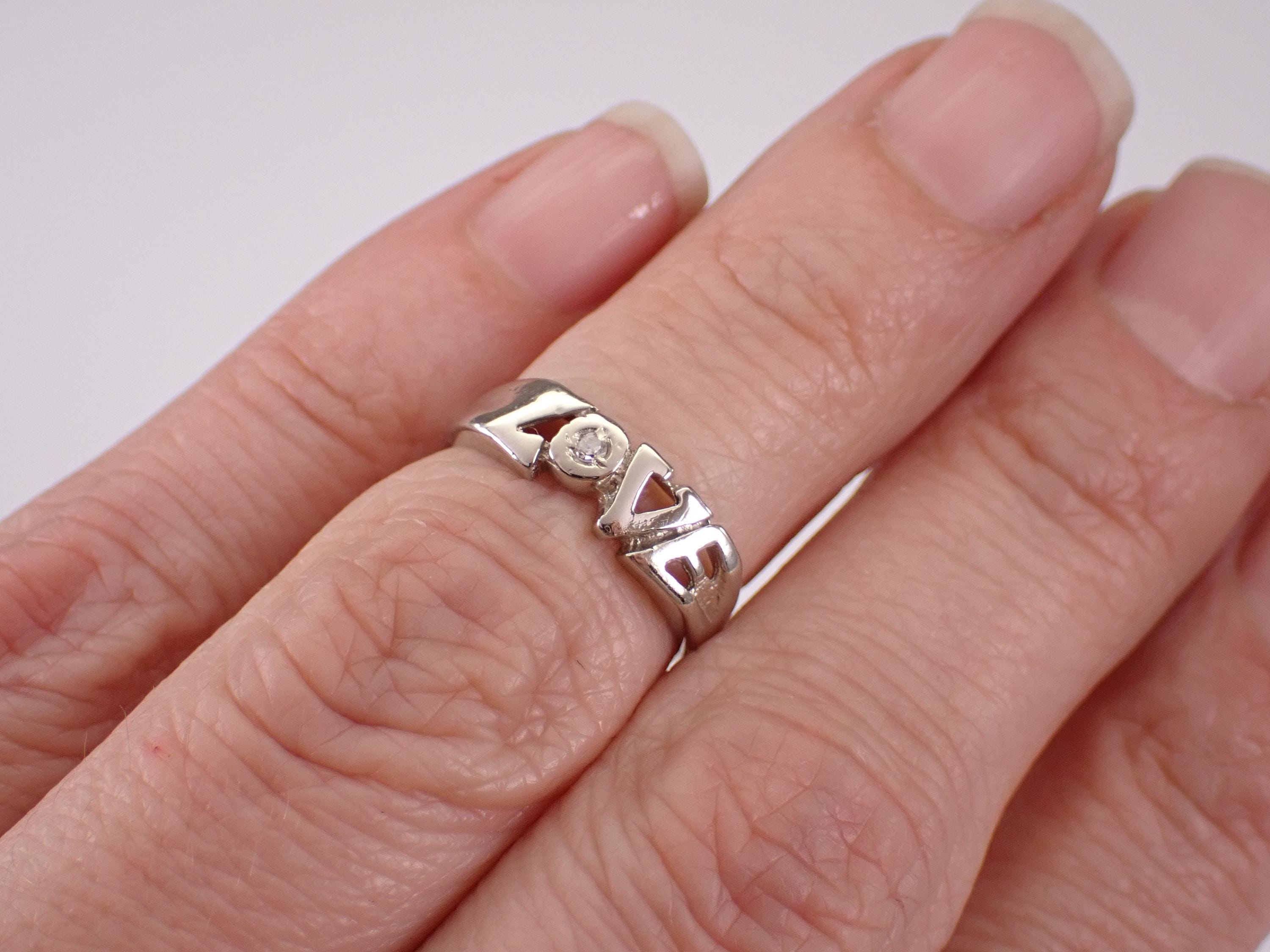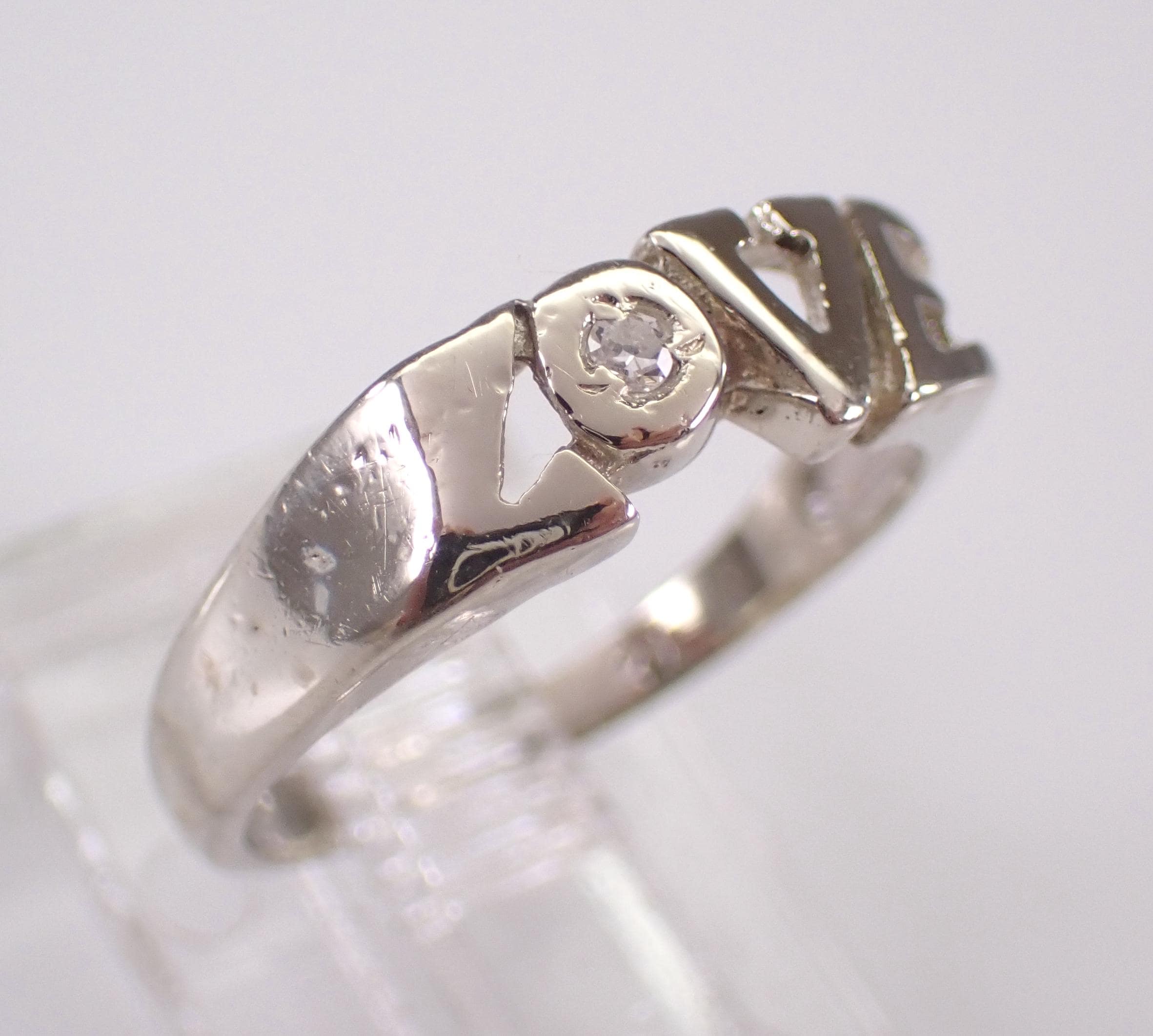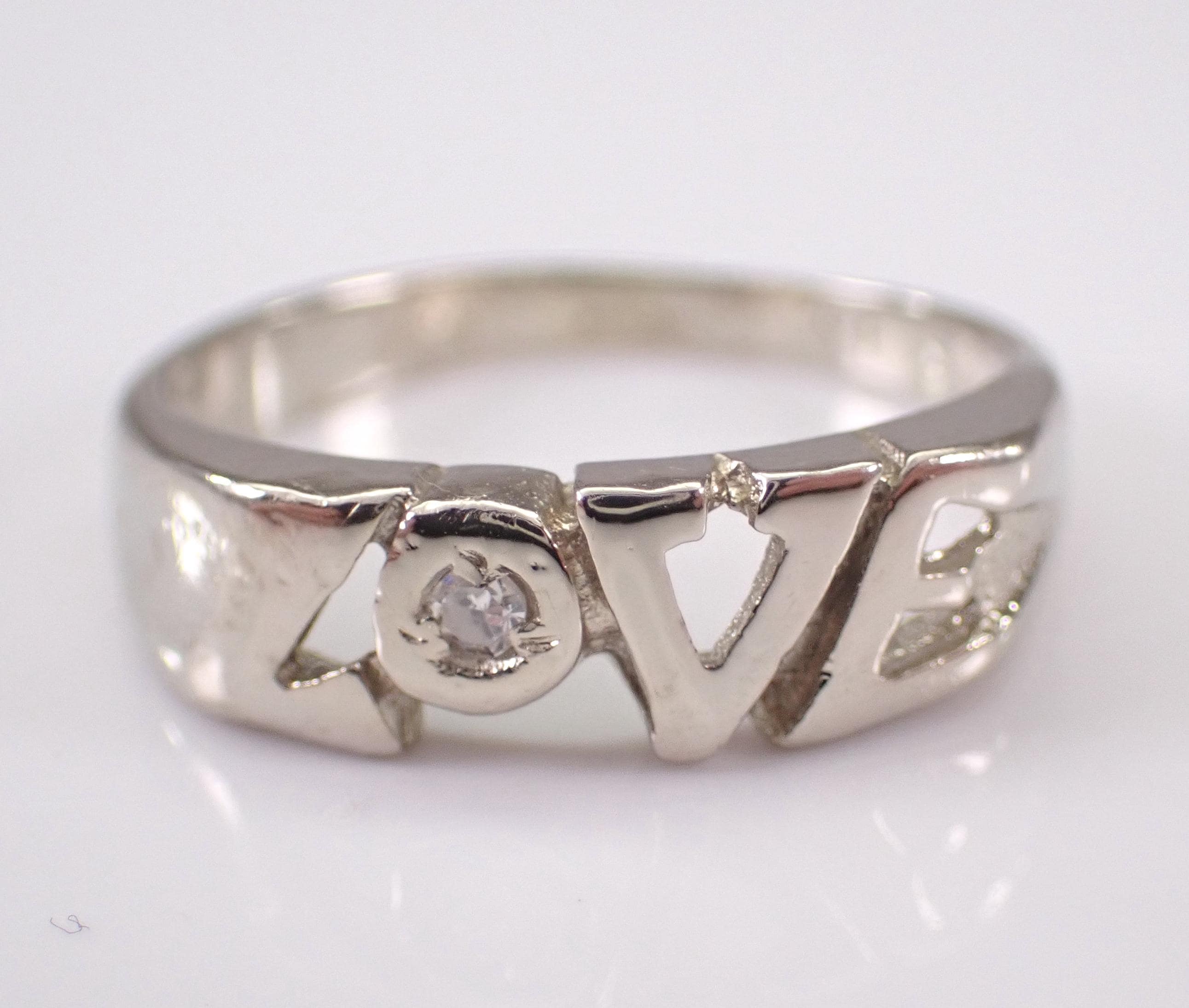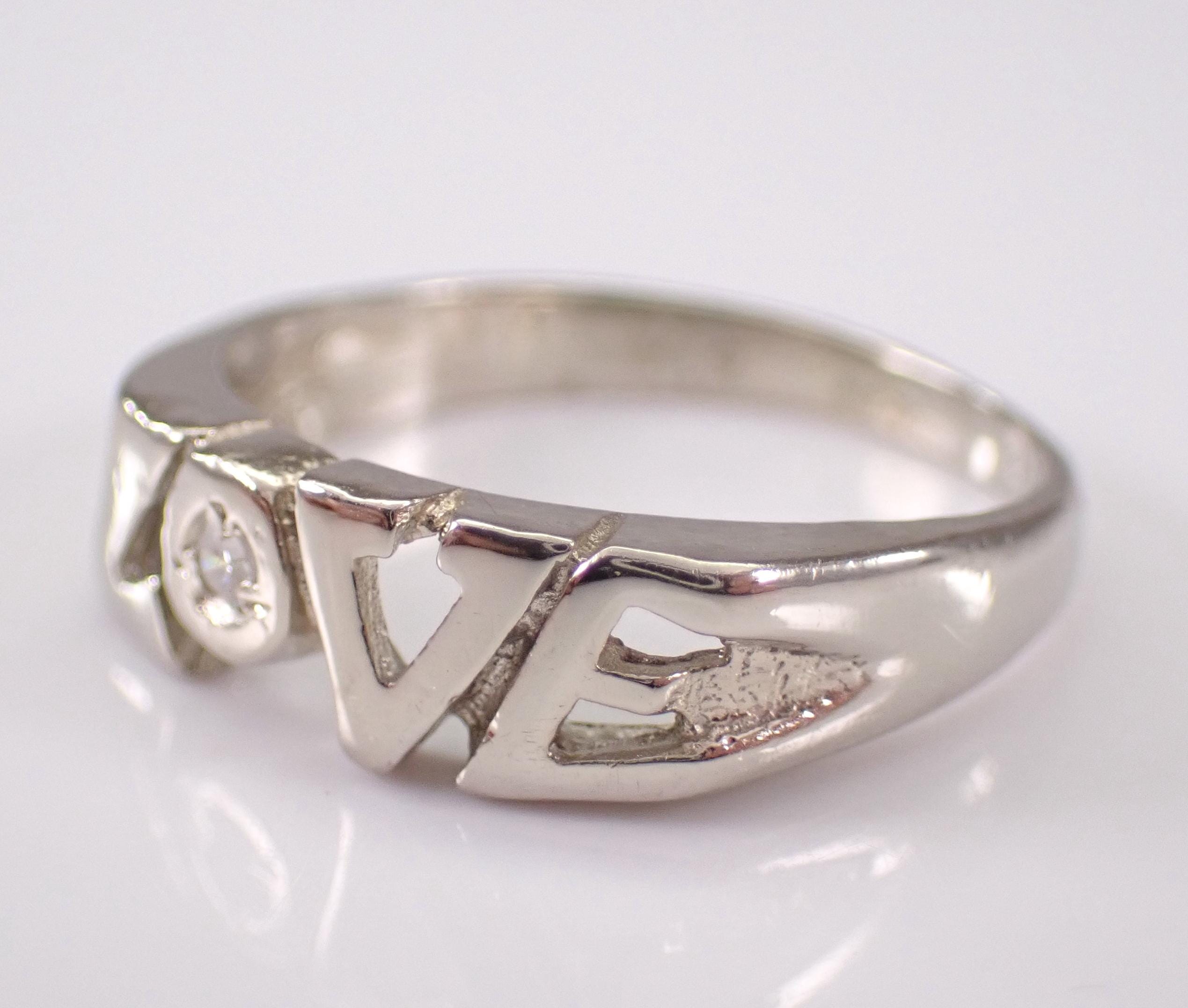 14K White Gold Diamond LOVE Ring. This ring is set one natural round Diamond. This diamond is H color, SI clarity and weighs .02 carat. This ring is 14KT White Gold, weighs 1.6 grams and is a finger size 3 1/2, which can be resized (please inquire about sizing with the finger size you need). I will ship this ring promptly in a gift box.