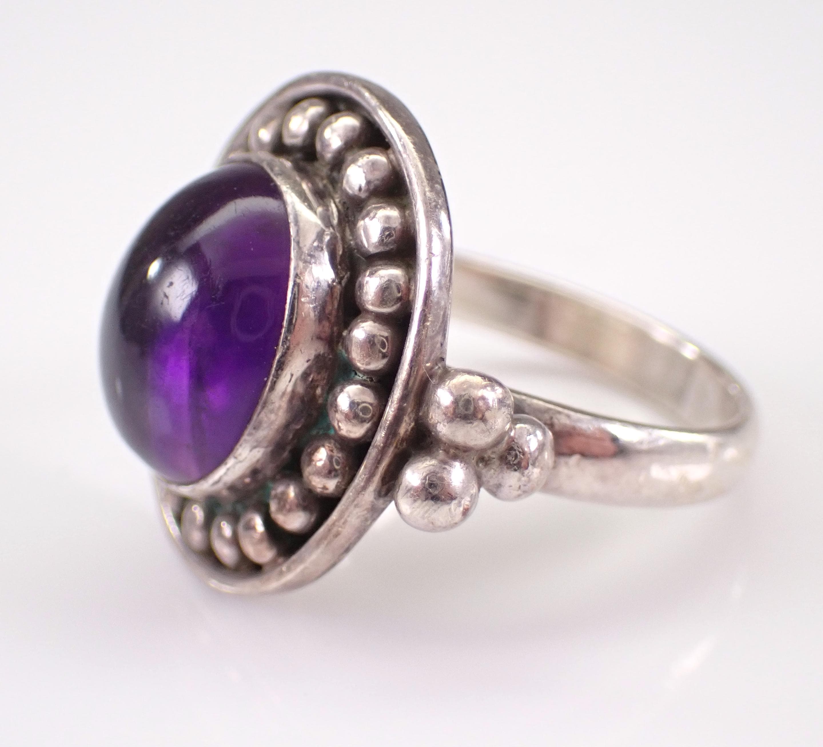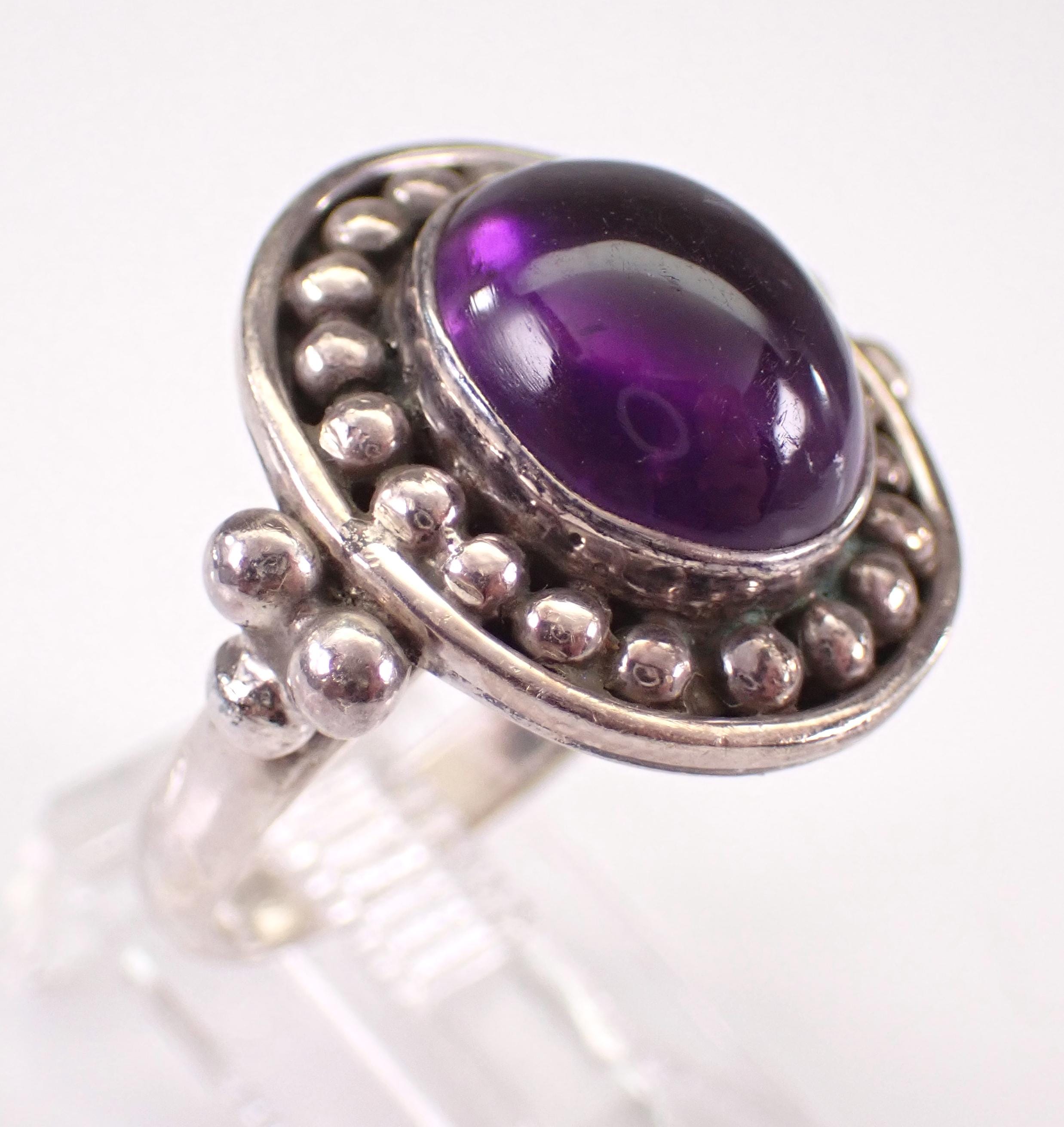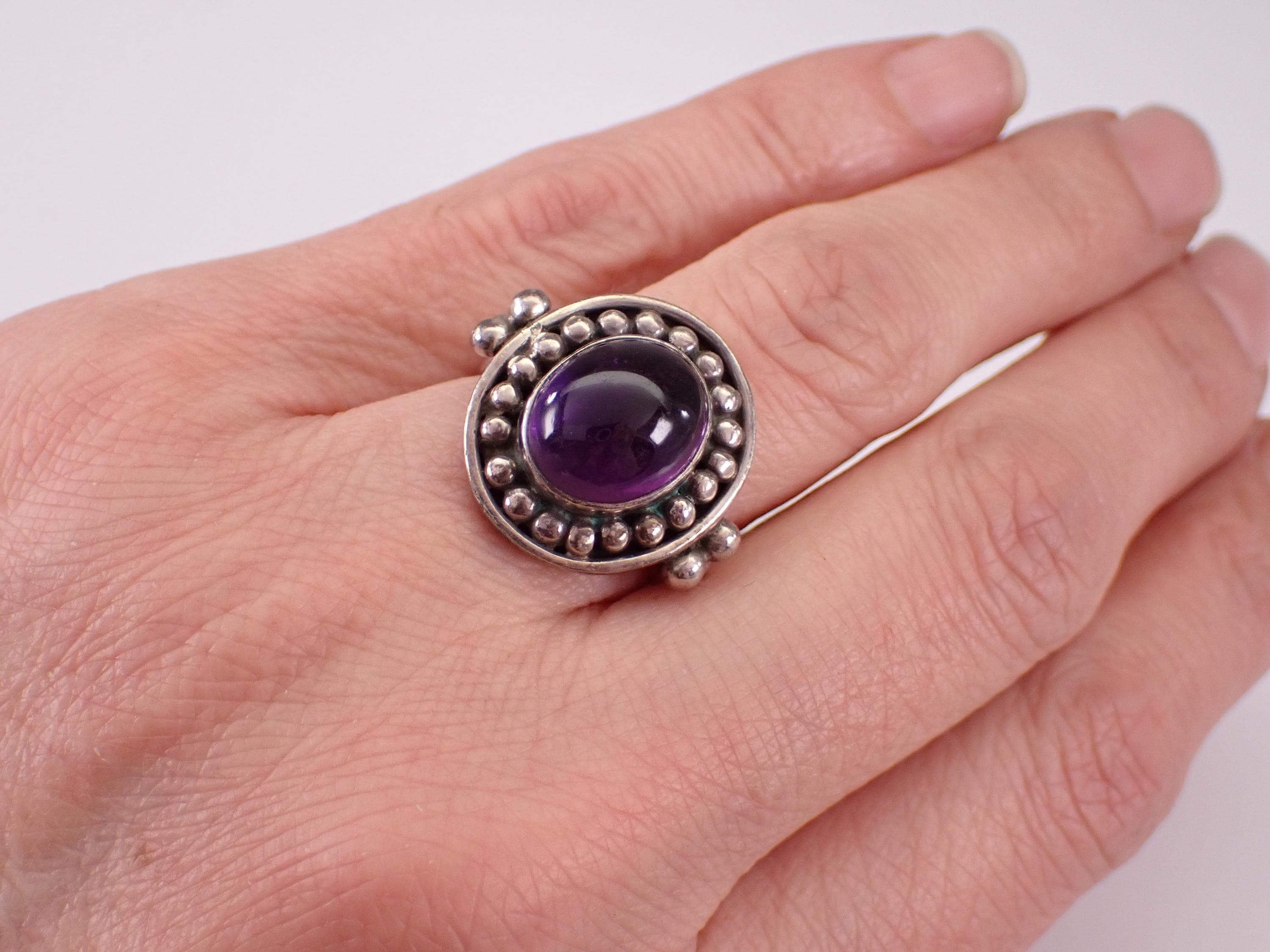 Vintage Sterling Silver Amethyst ring. This ring is set with a genuine Oval Amethyst. This Amethyst measures 12 X 9 mm and is set in a bezel setting. This ring is finger size 7 and weighs 7.6 grams. This ring measures 19 mm along the finger. This ring will be shipped promptly in a gift pouch.