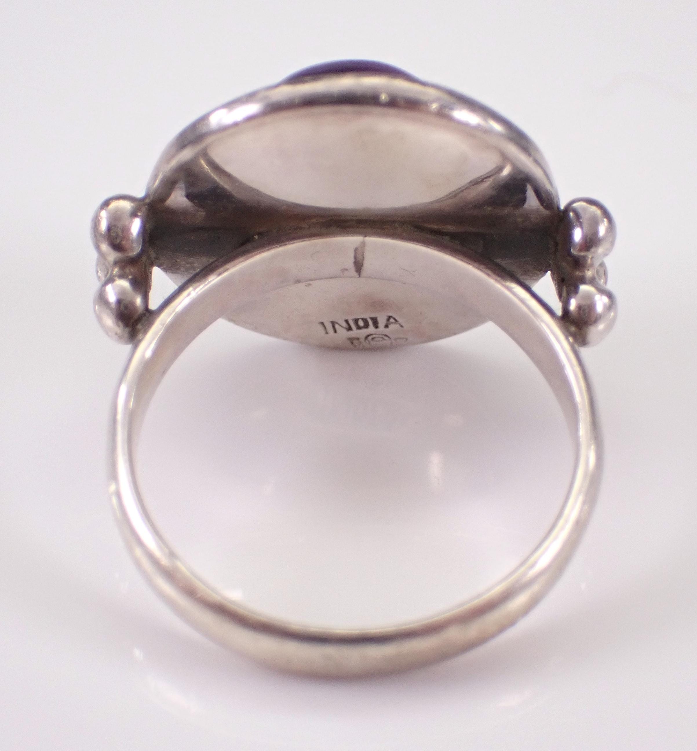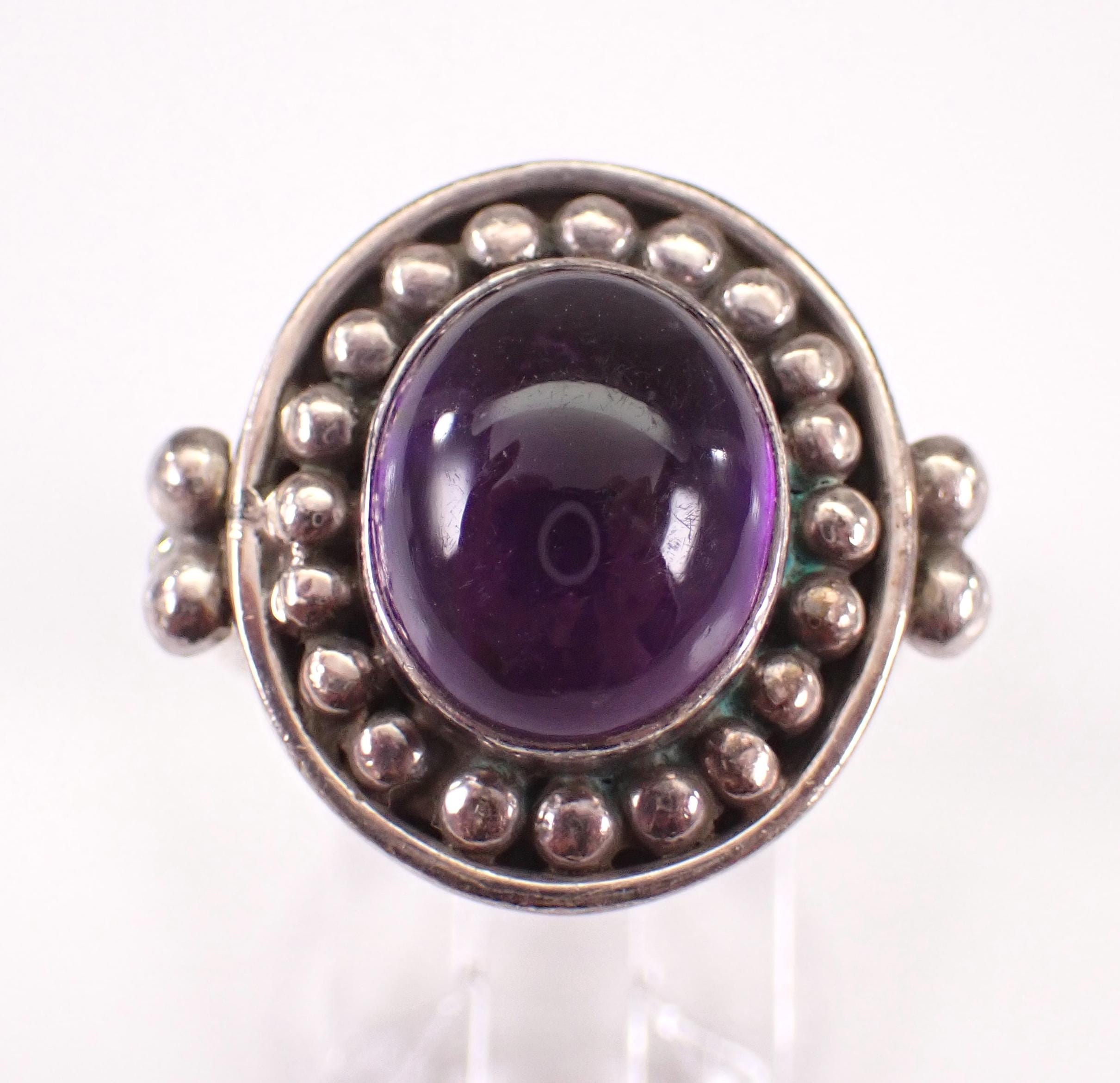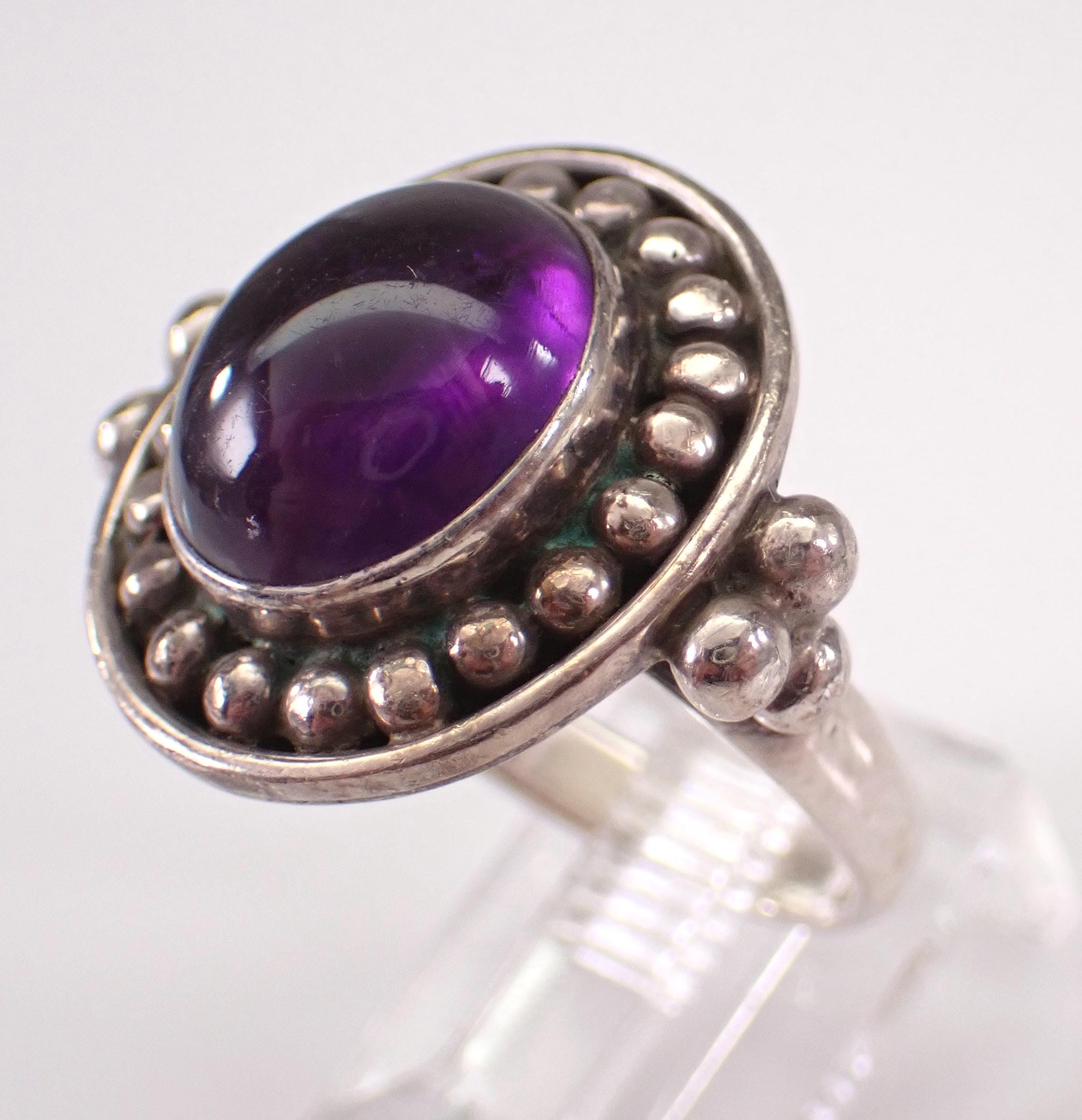 Vintage Sterling Silver Amethyst ring. This ring is set with a genuine Oval Amethyst. This Amethyst measures 12 X 9 mm and is set in a bezel setting. This ring is finger size 7 and weighs 7.6 grams. This ring measures 19 mm along the finger. This ring will be shipped promptly in a gift pouch.
