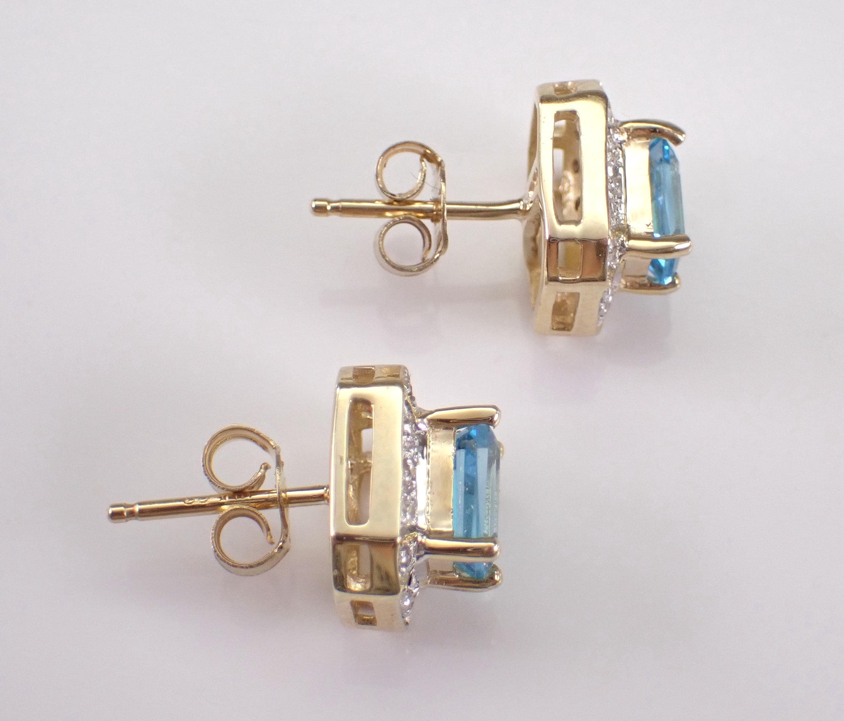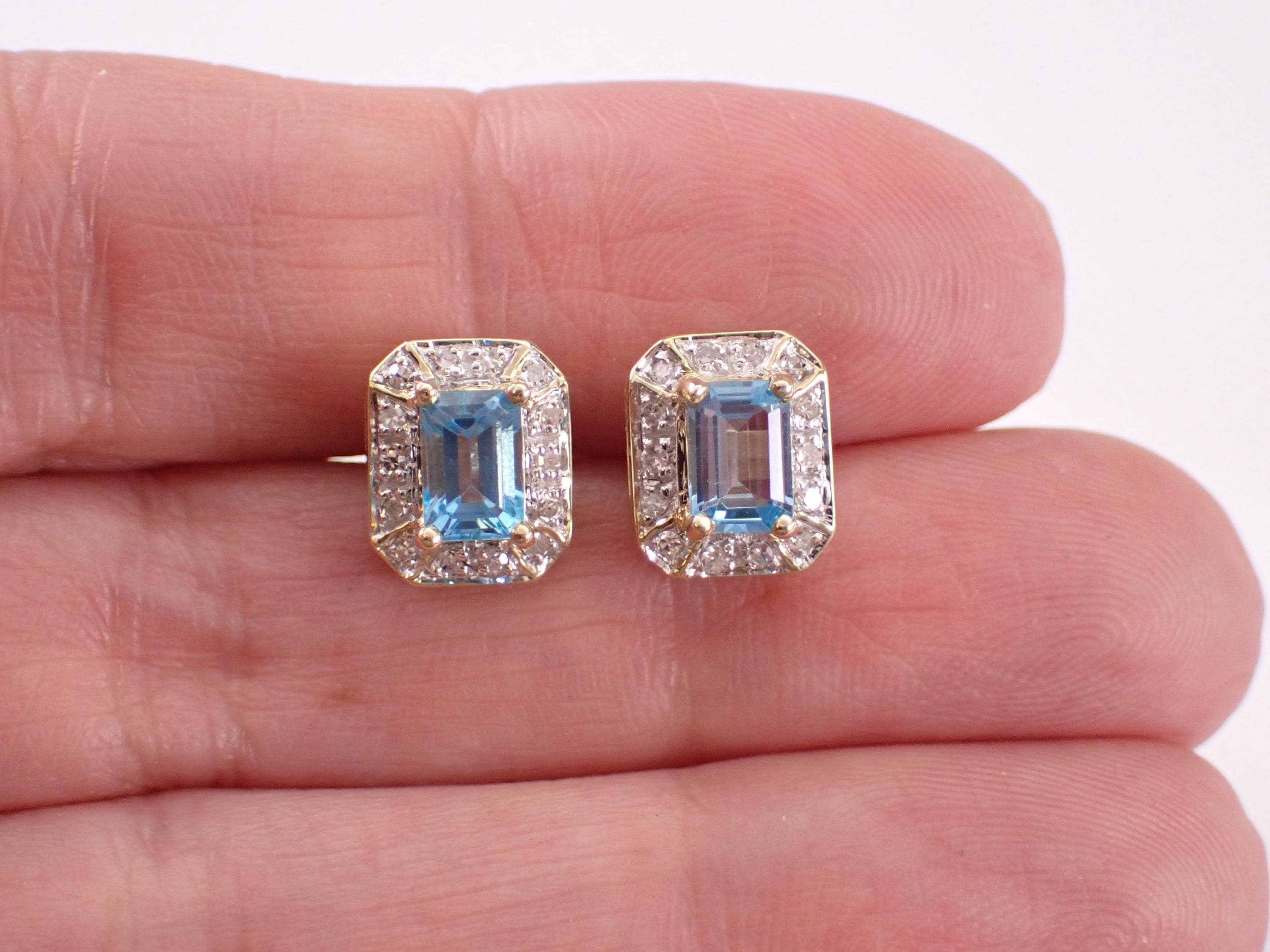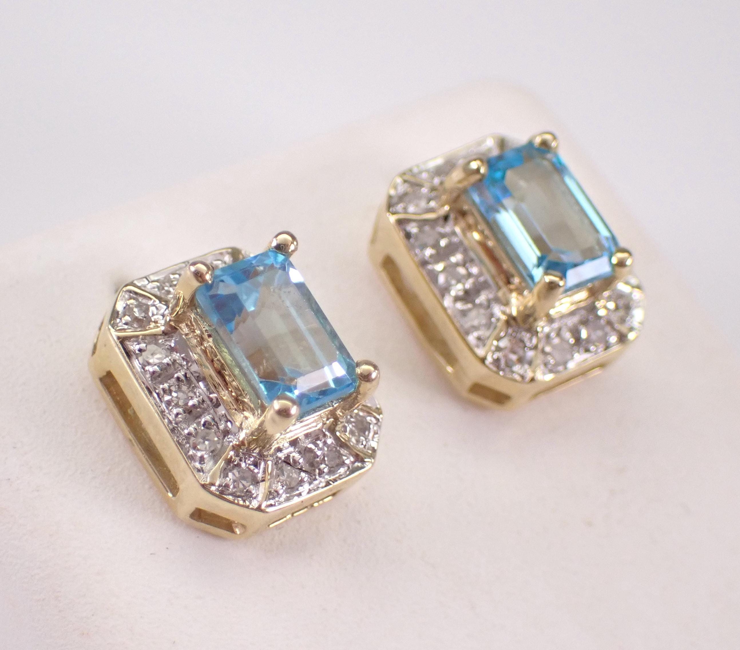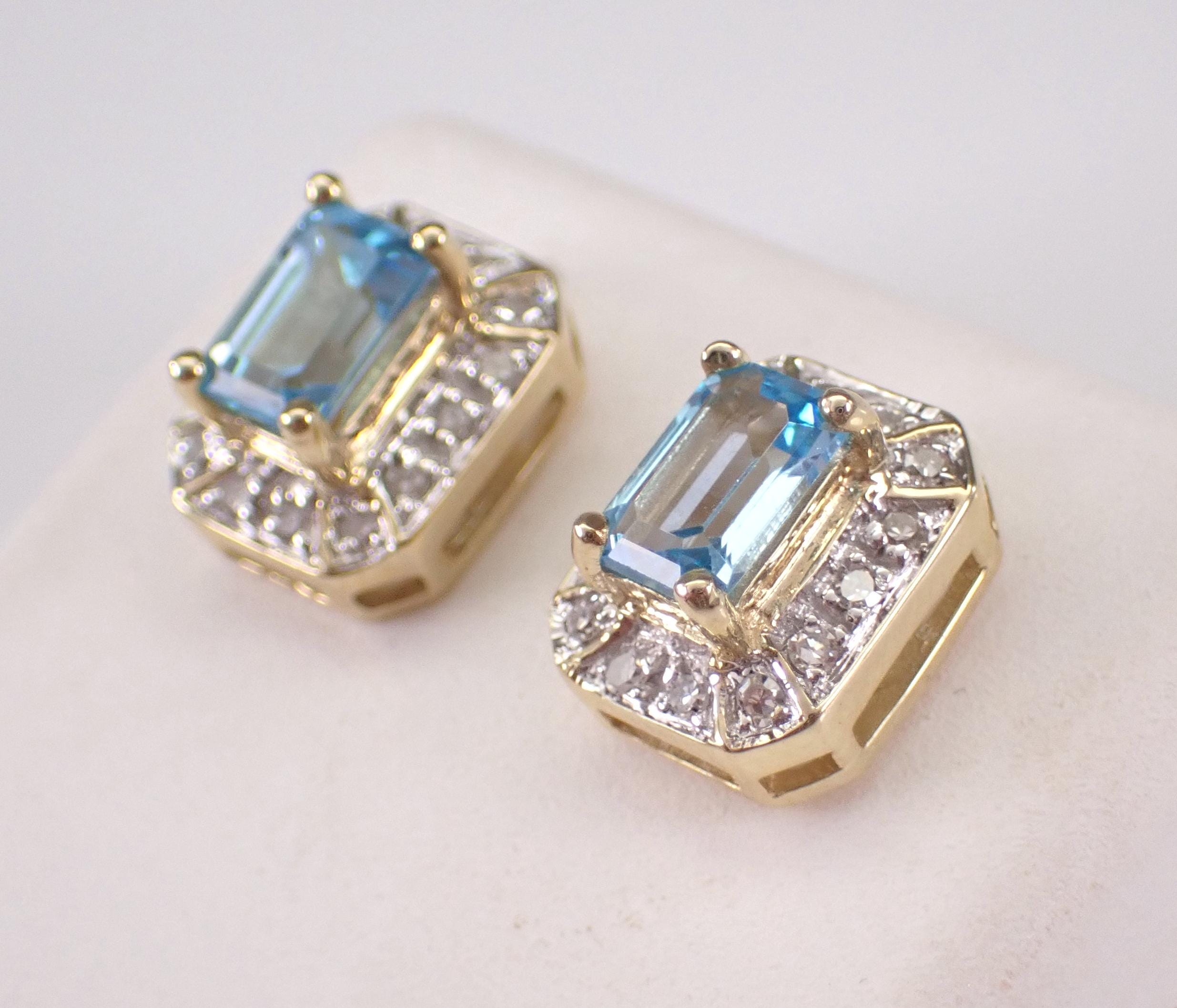 Vintage Yellow Gold Diamond and Blue Topaz Stud Earrings. These earrings are set with a genuine Emerald Cut Blue Topaz in each earring. These Blue Topaz measure 6 X 4 mm each and weigh a total of 1 carat. There are fourteen natural Round Diamonds set in EACH earring. These Diamonds are H color, SI clarity and amount to a total weight of 1/4 carat. These earrings are 10K Yellow Gold, weigh 3.2 grams and measure 10 X 8 mm each. These earrings are for pierced ears and the earrings have friction post backs. These earrings will be accompanied by an appraisal written by a GIA Certified Diamond Grader with the retail replacement value of $1,495.00. I will ship these earrings promptly in a gift box.