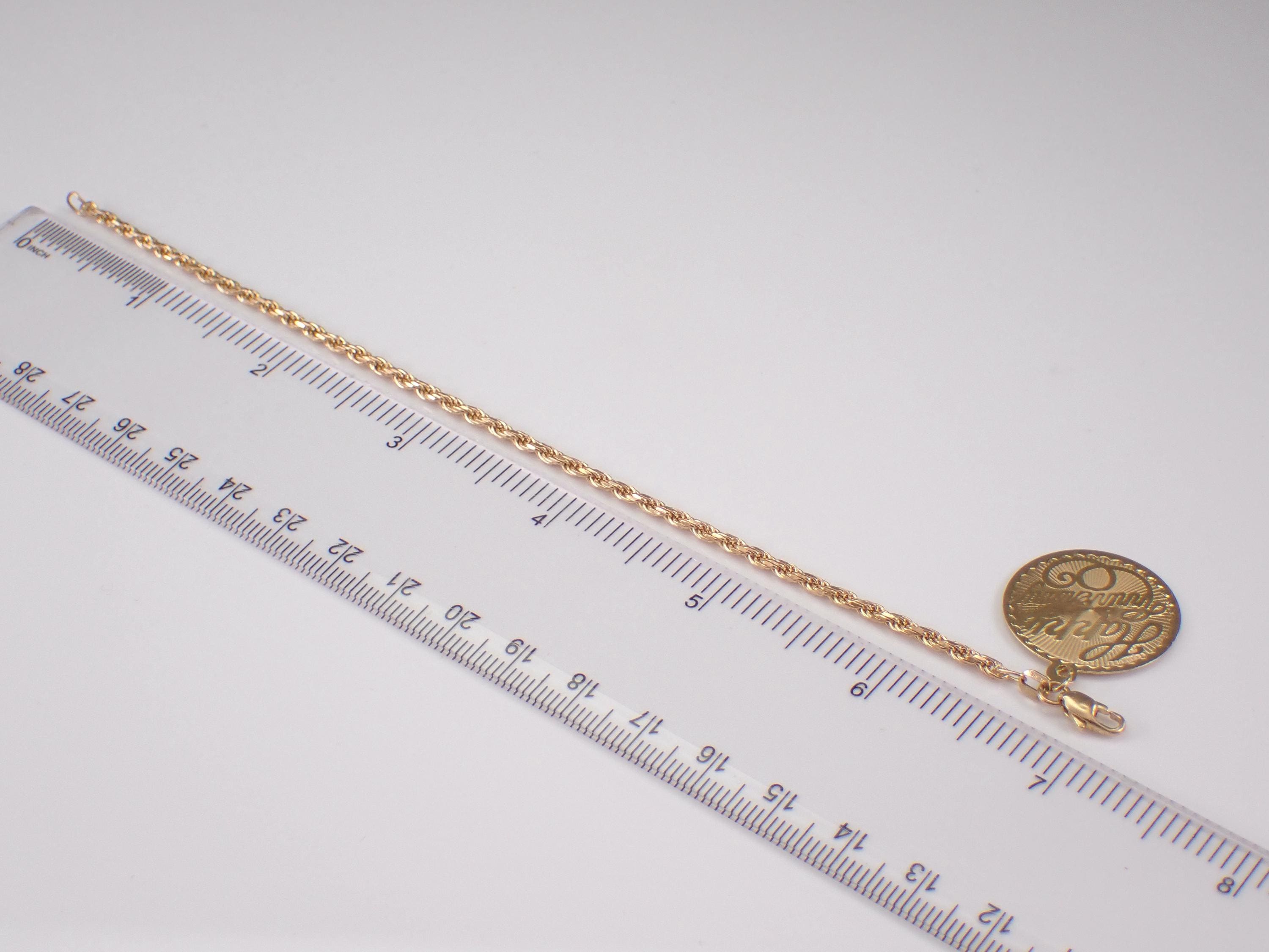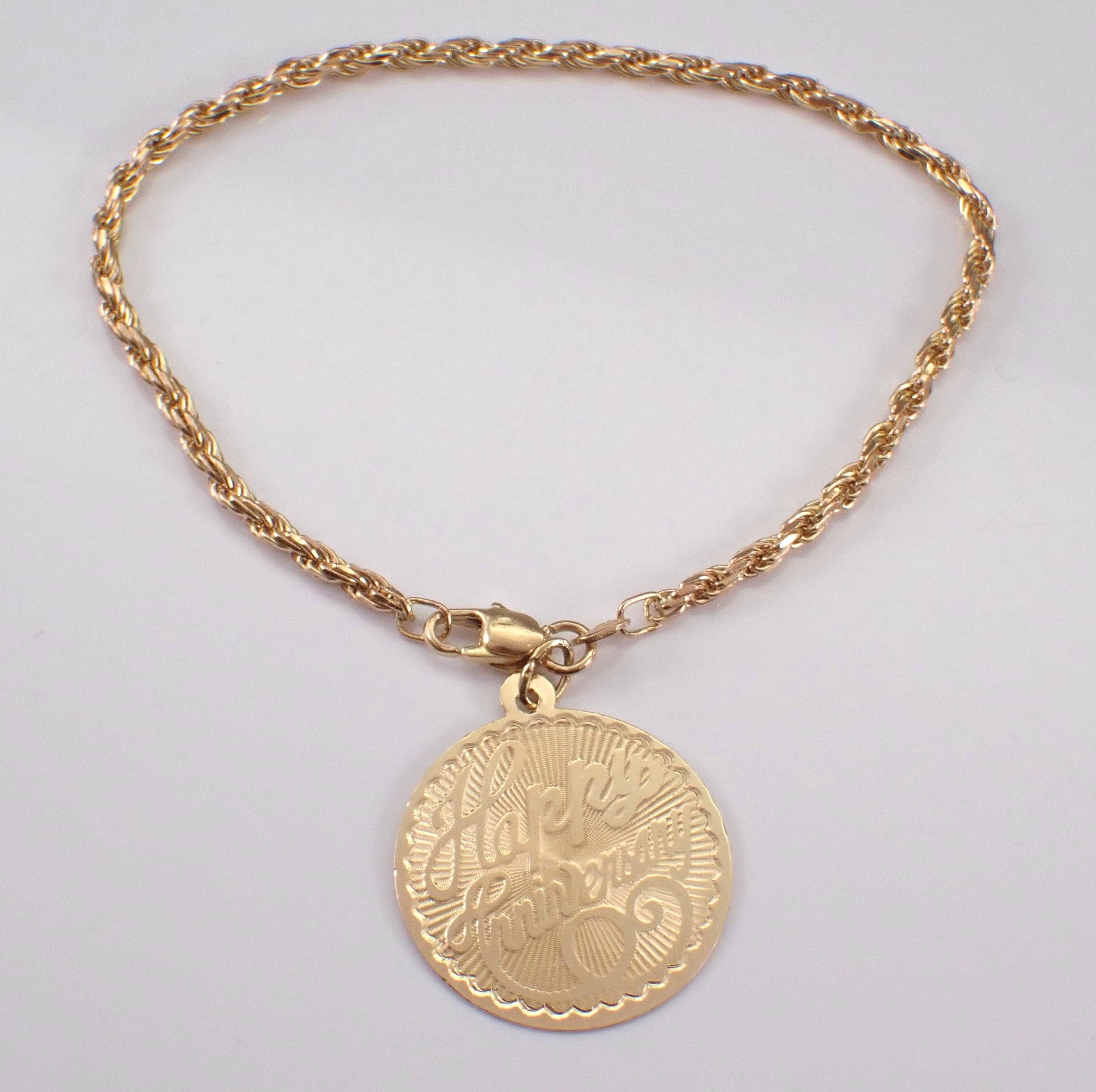 Vintage 14K Yellow Gold Charm Bracelet. This bracelet is made of 14K Yellow Gold and comes accompanied by one round disc charm "HAPPY ANNIVERSARY". This charm measures 22mm in diameter. This bracelet weighs 5.3 grams (with the charm) and measures 7" in length. I will ship this bracelet promptly in a gift box accompanied by an appraisal for insurance and authentication purposes.