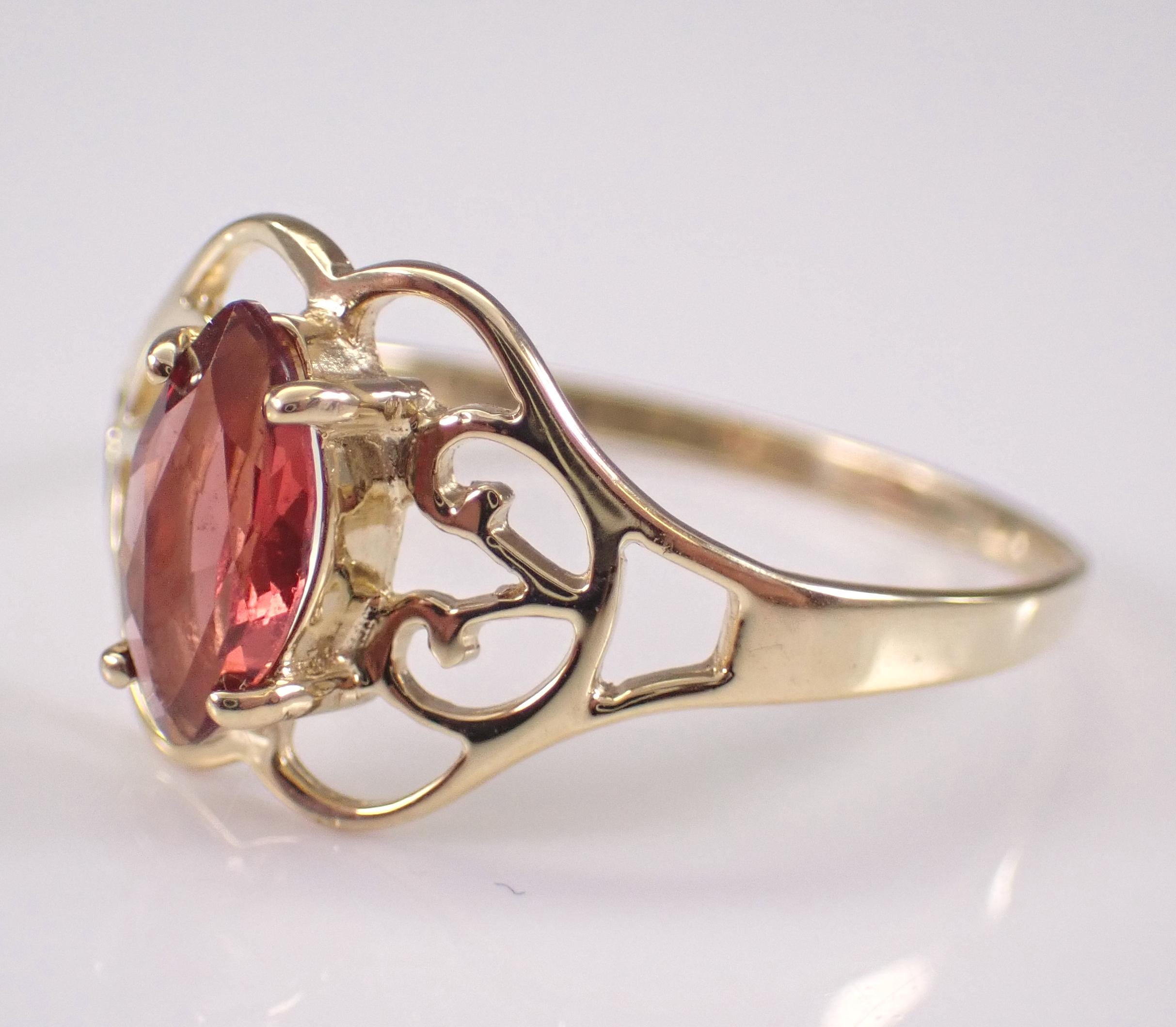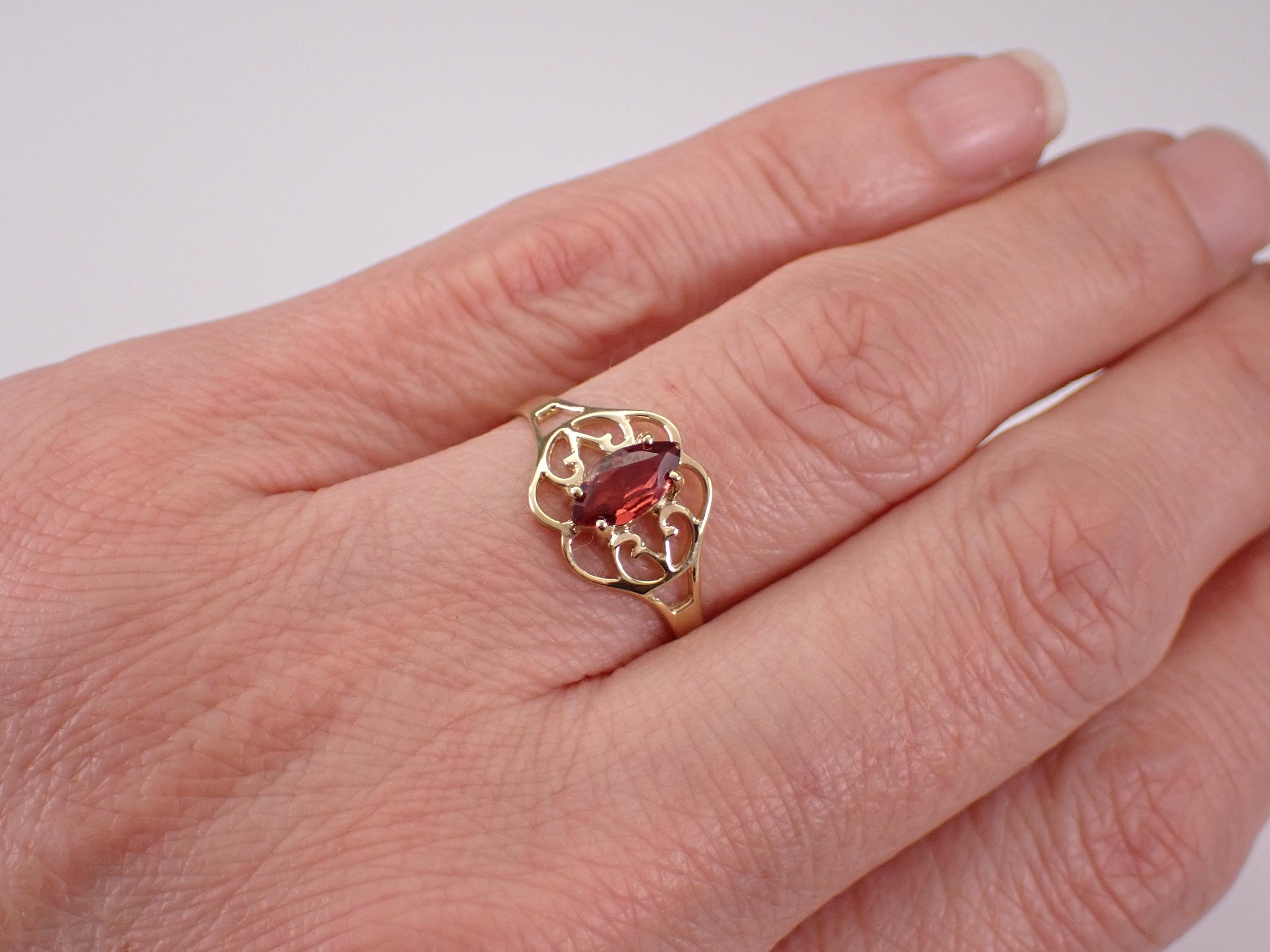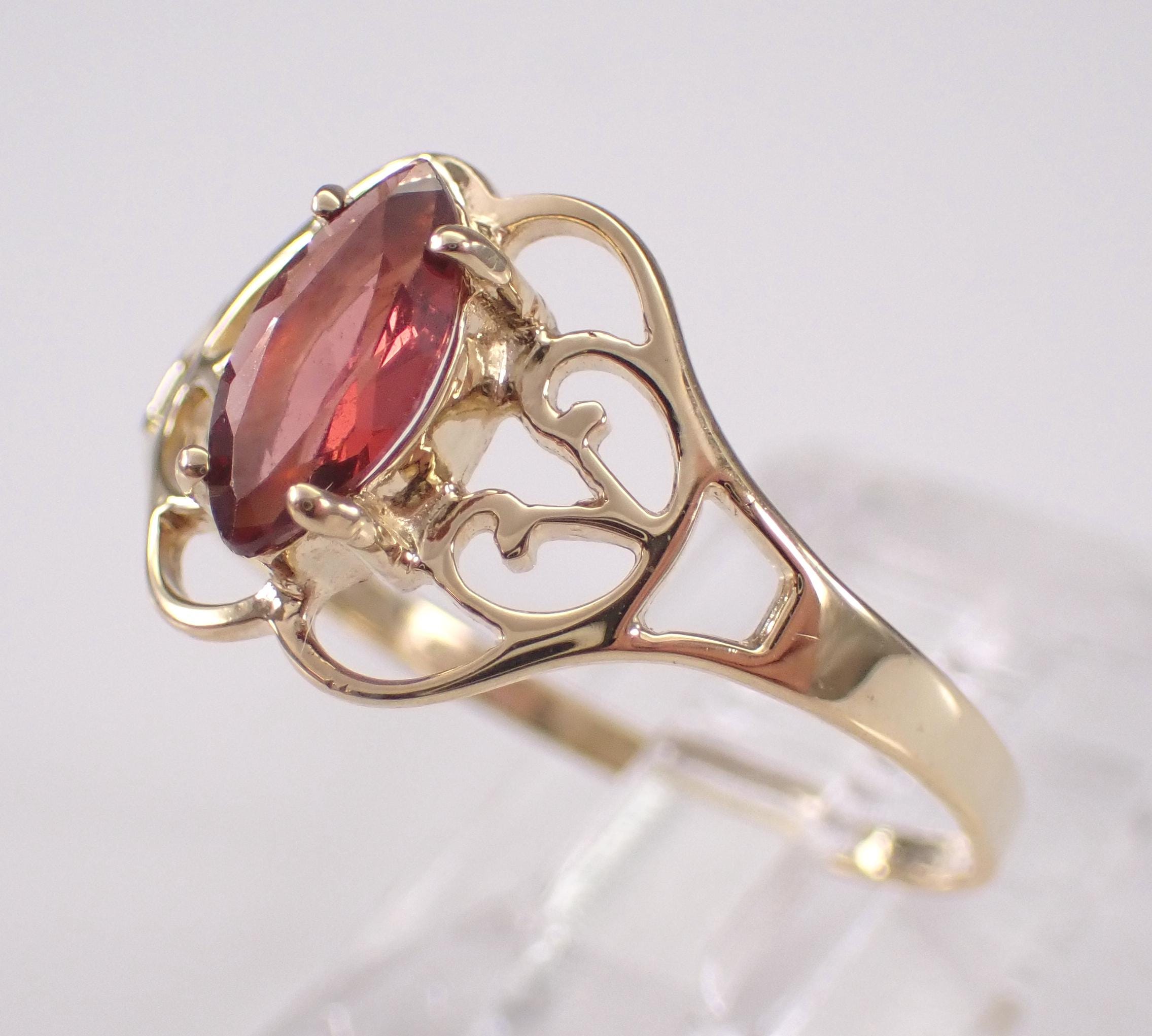 Vintage Yellow Gold Garnet Solitaire Ring. This ring is set with one Marquise Garnet in the center. This Garnet measures 8 X 4 mm. This ring is solid 10KT Yellow Gold, weighs 1.3 grams and is a finger size 8, which can be resized (please inquire about sizing with the finger size you need). The top of this ring measures 10 mm along the finger. I will ship this ring promptly in a beautiful gift box.