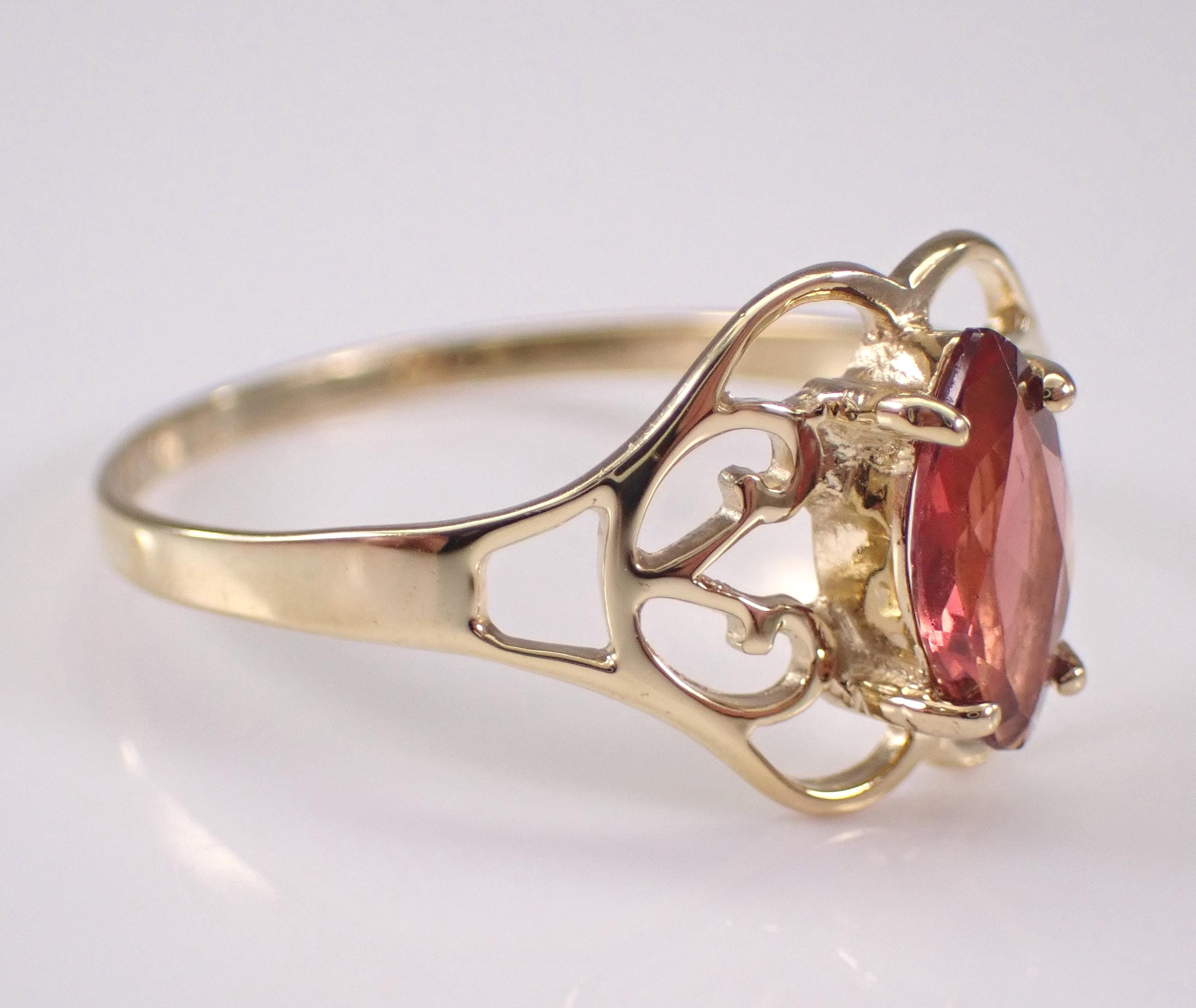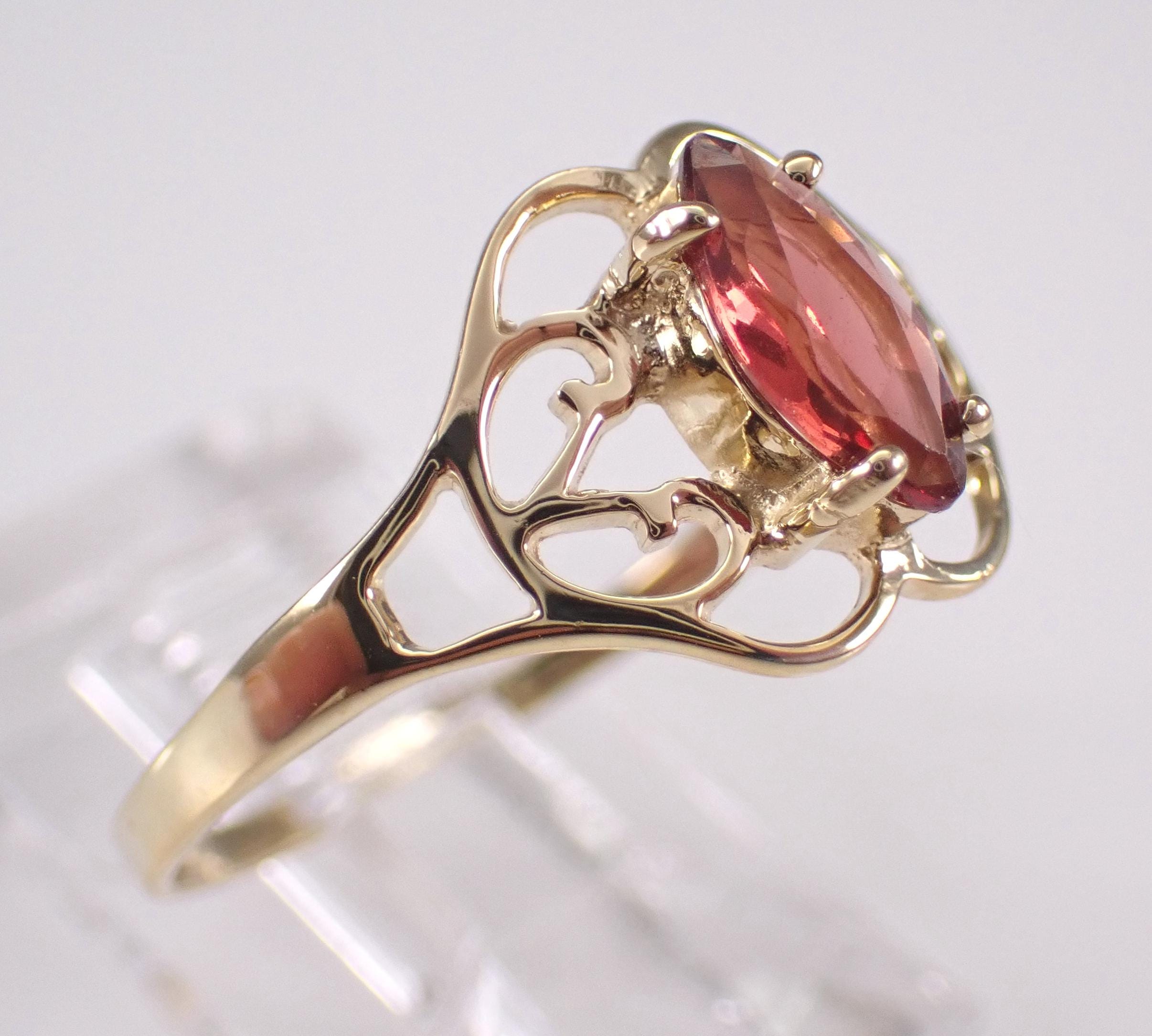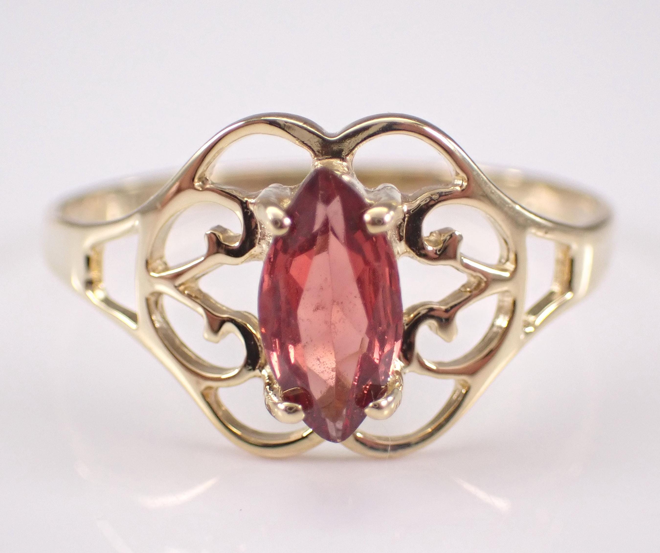 Vintage Yellow Gold Garnet Solitaire Ring. This ring is set with one Marquise Garnet in the center. This Garnet measures 8 X 4 mm. This ring is solid 10KT Yellow Gold, weighs 1.3 grams and is a finger size 8, which can be resized (please inquire about sizing with the finger size you need). The top of this ring measures 10 mm along the finger. I will ship this ring promptly in a beautiful gift box.