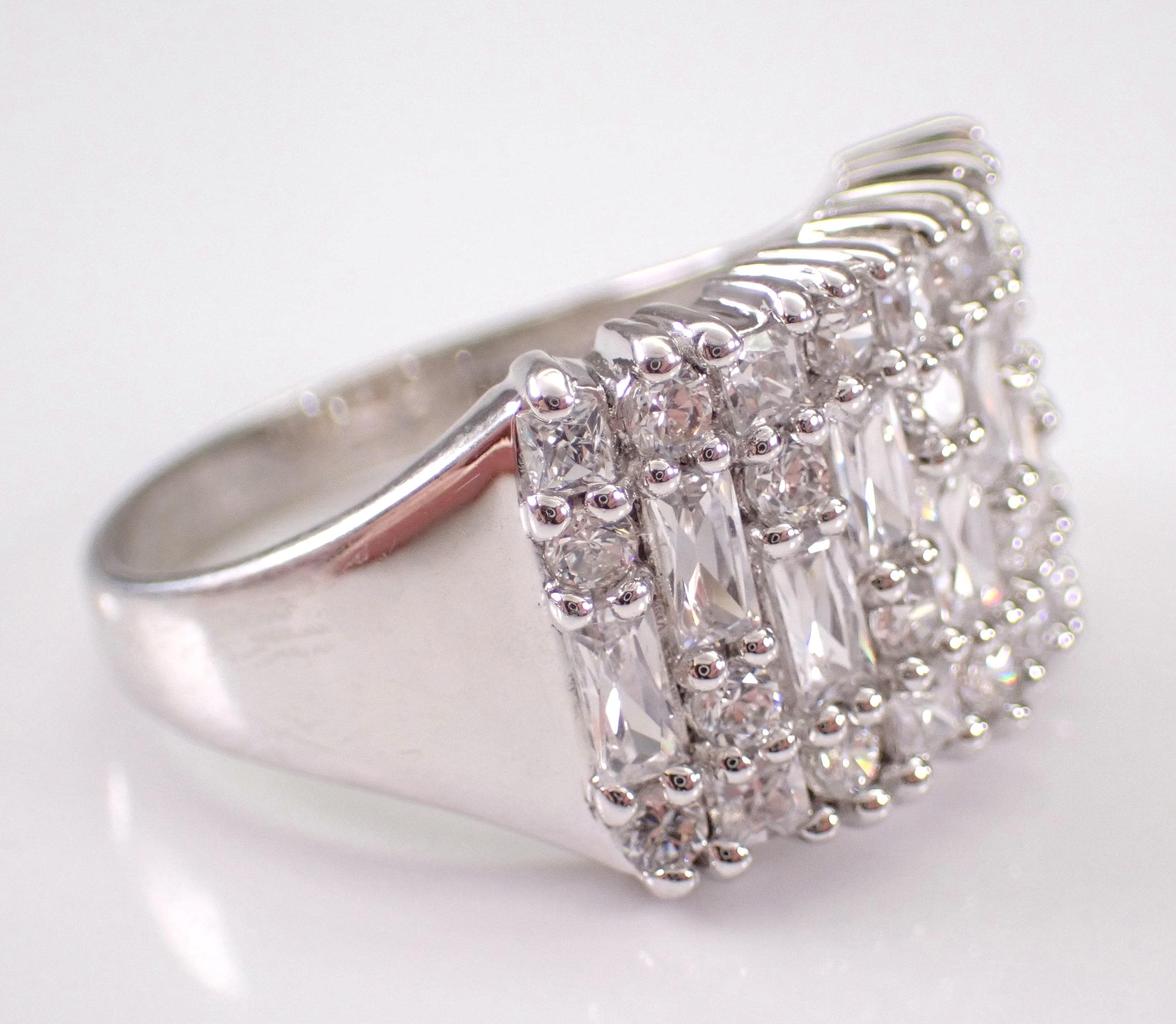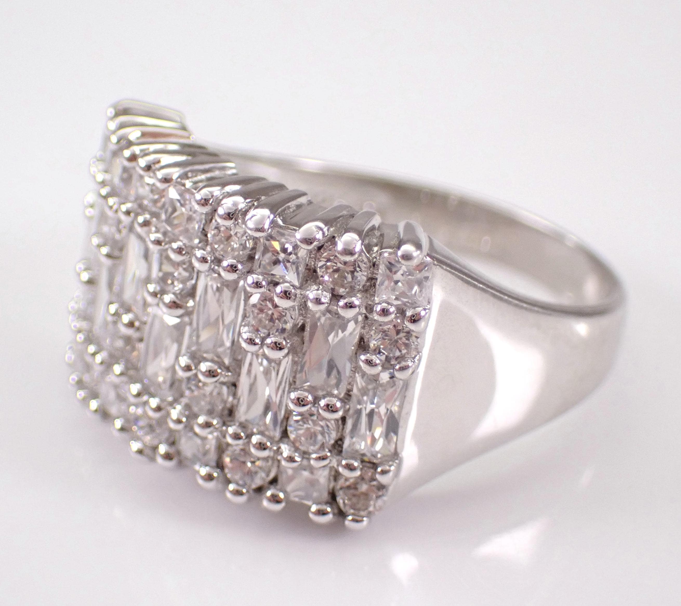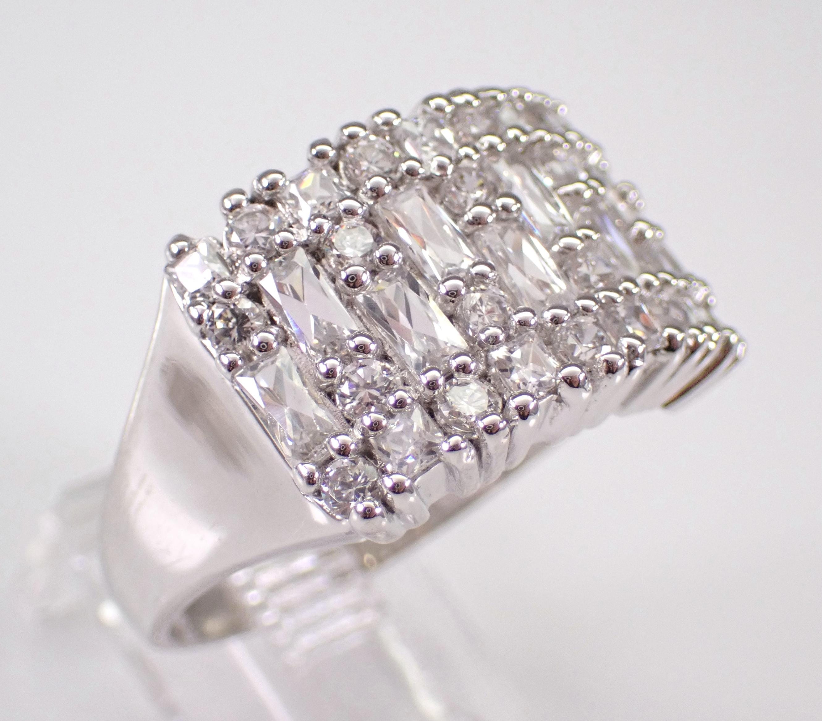 Vintage Sterling Silver Cubic Zirconia Ring. This ring is set with Round and Baguette Cubic Zirconia. This ring is in excellent condition, is finger size 9 3/4, weighs 5.4 grams and measures 13 mm in width. This ring will be shipped promptly in a gift pouch.