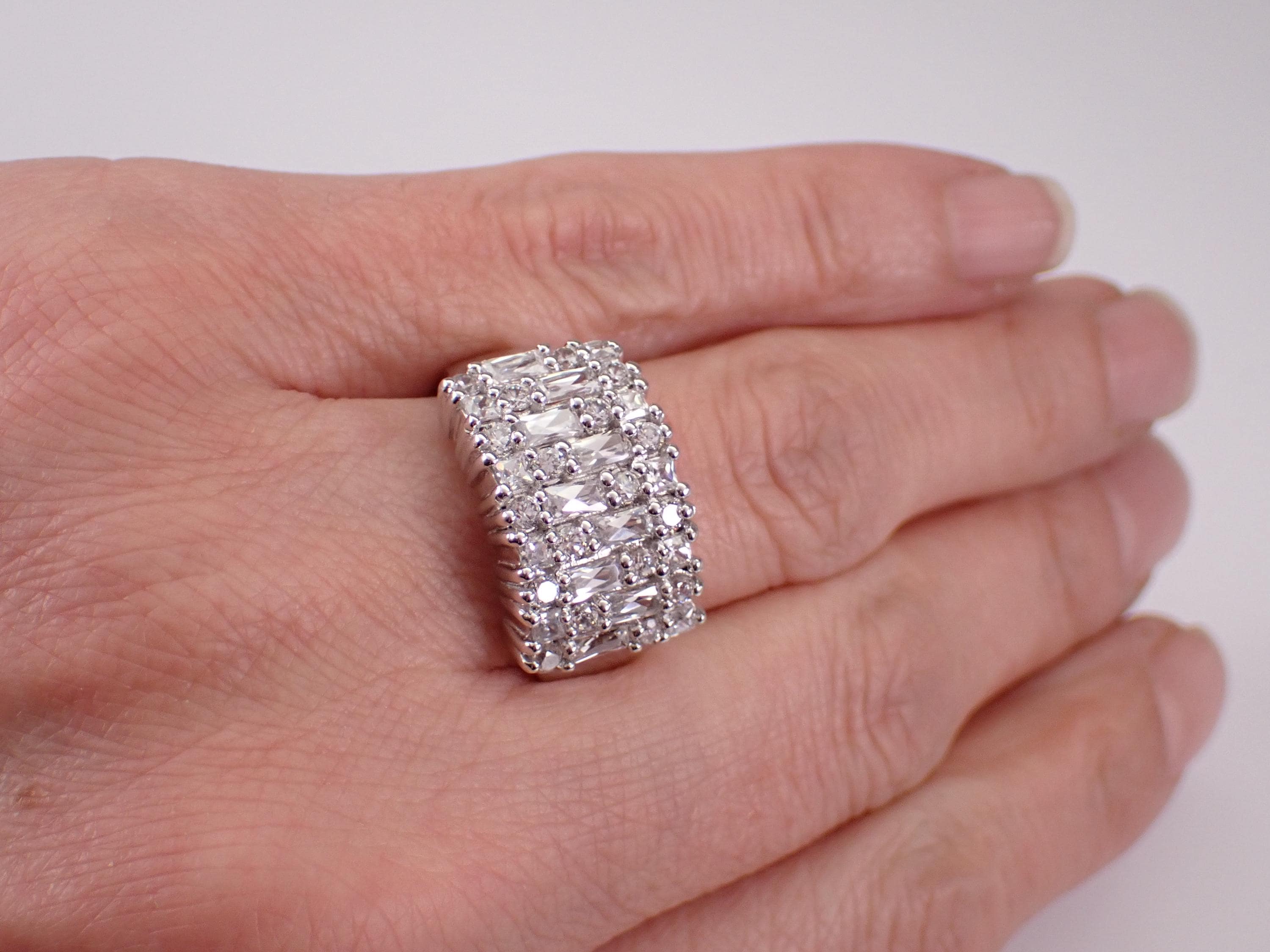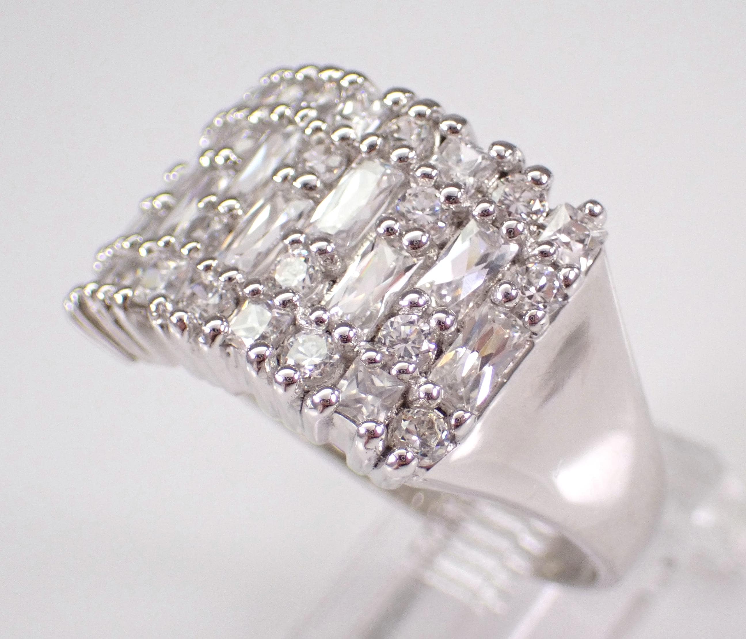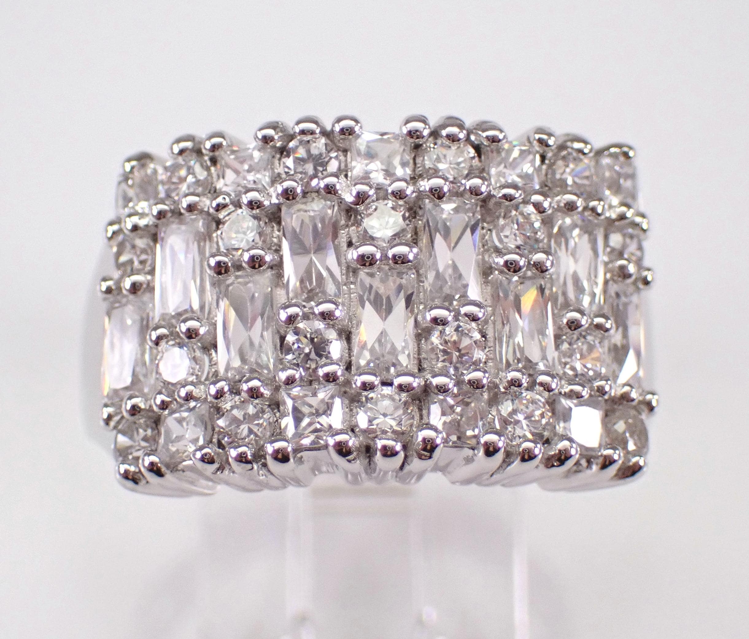 Vintage Sterling Silver Cubic Zirconia Ring. This ring is set with Round and Baguette Cubic Zirconia. This ring is in excellent condition, is finger size 9 3/4, weighs 5.4 grams and measures 13 mm in width. This ring will be shipped promptly in a gift pouch.