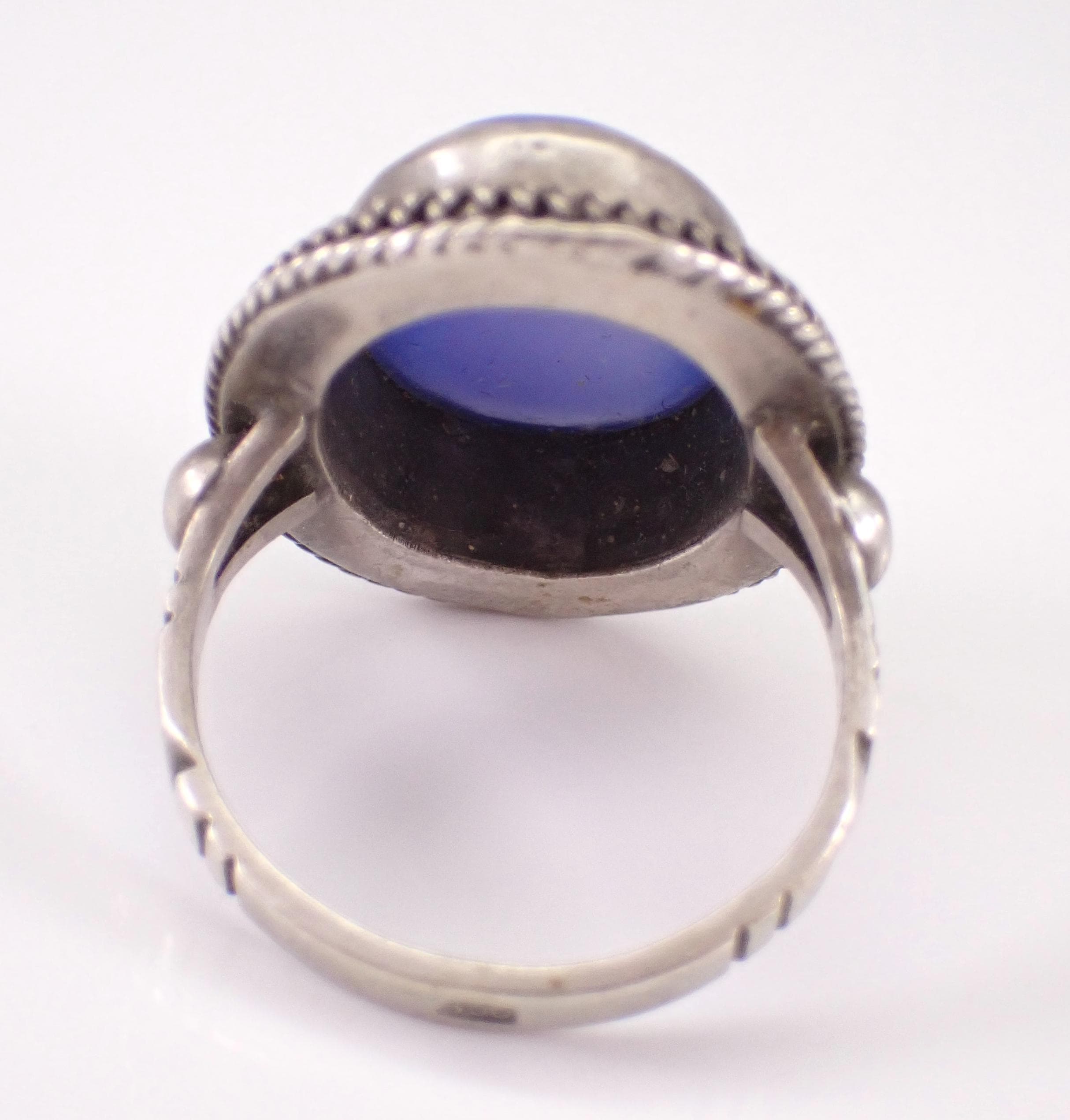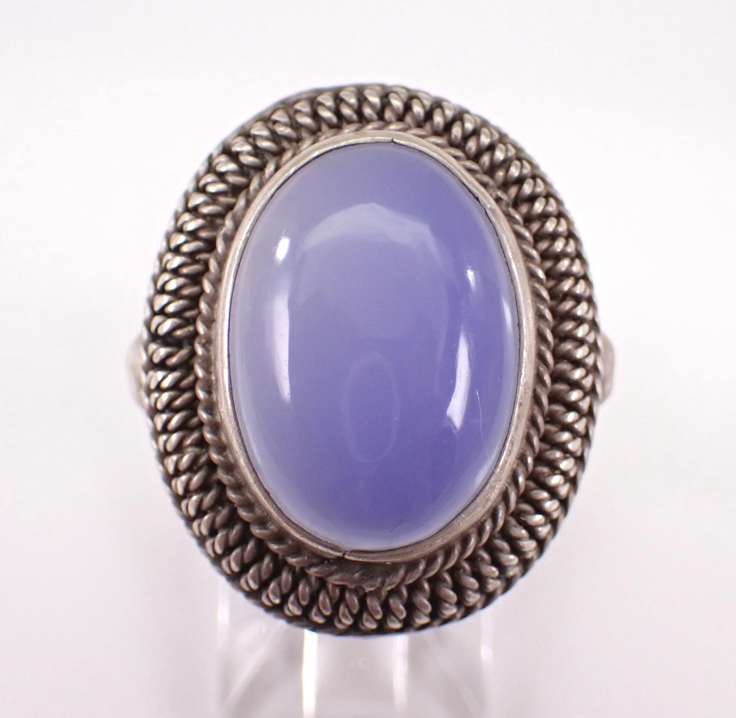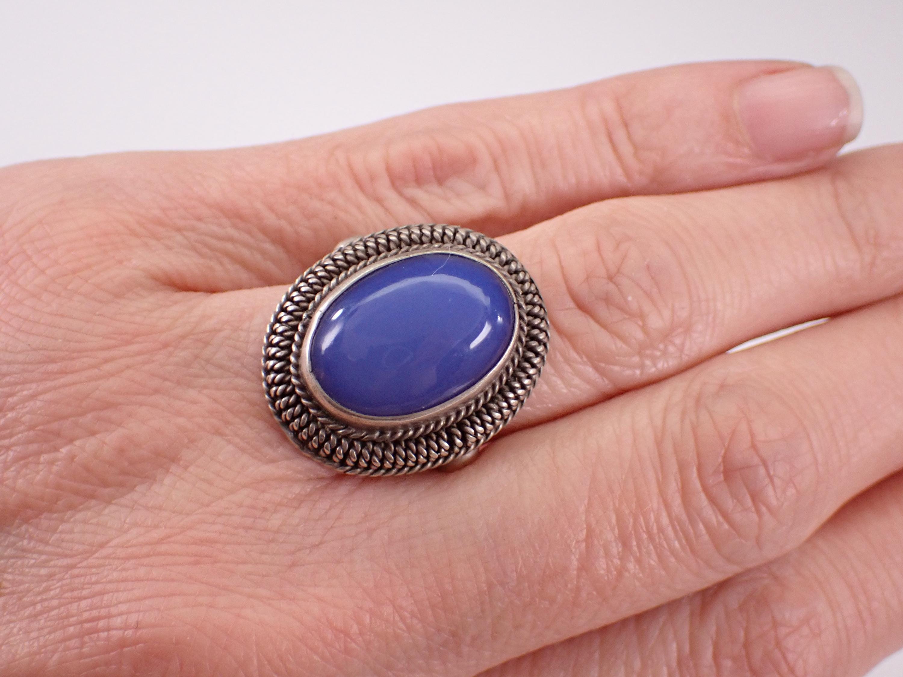 Vintage Silver Chalcedony ring. This ring is set with an Oval Cabochon Chalcedony Gemstone in the center. This gem measures 18 X 12 mm. This ring is marked 800 for silver, is a finger size 8 1/2 and weighs 7.5 grams. The top of this ring measures 1" along the finger. This ring will be shipped promptly in a gift pouch.