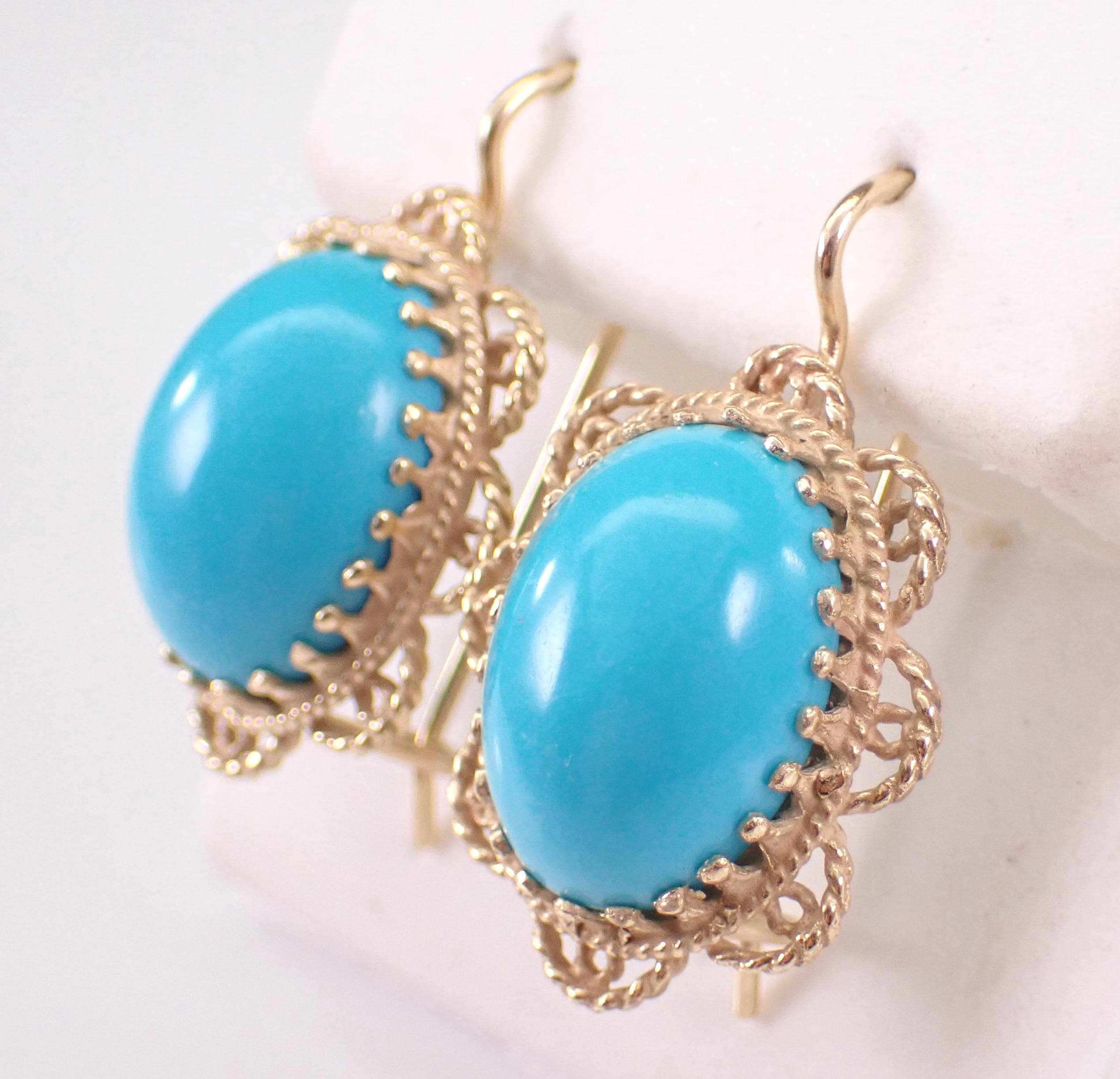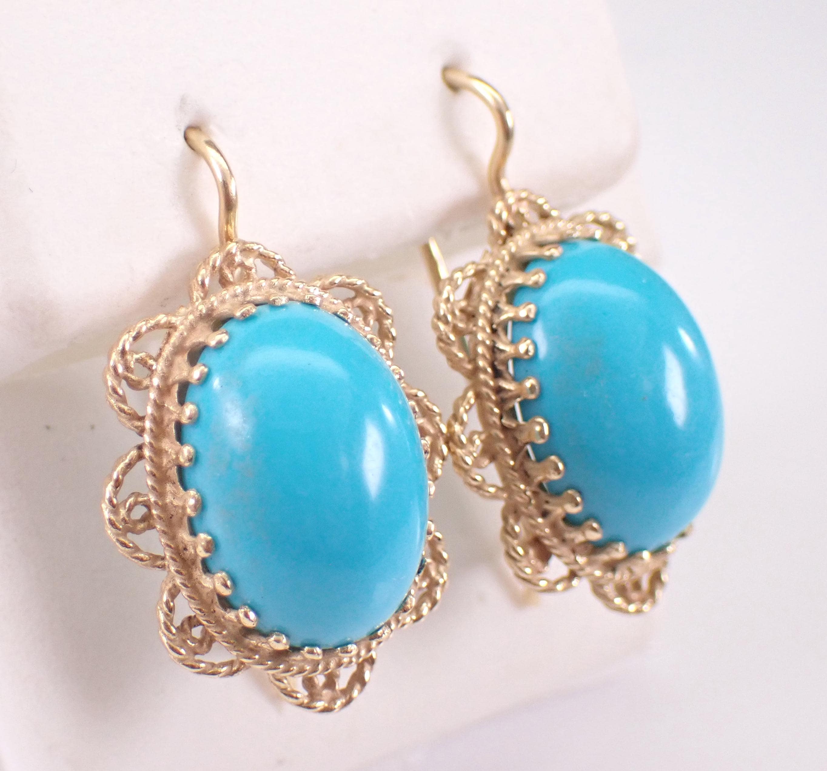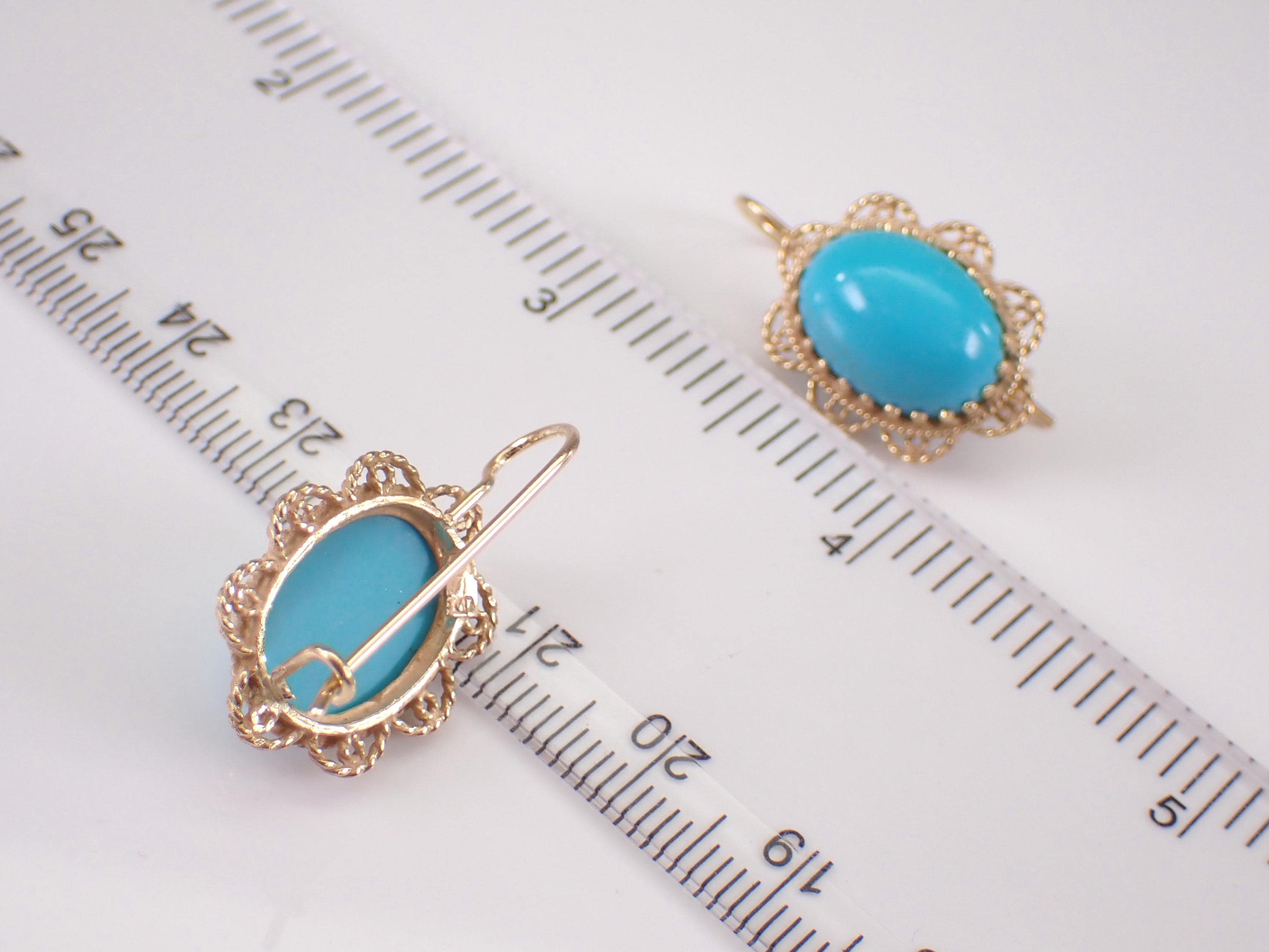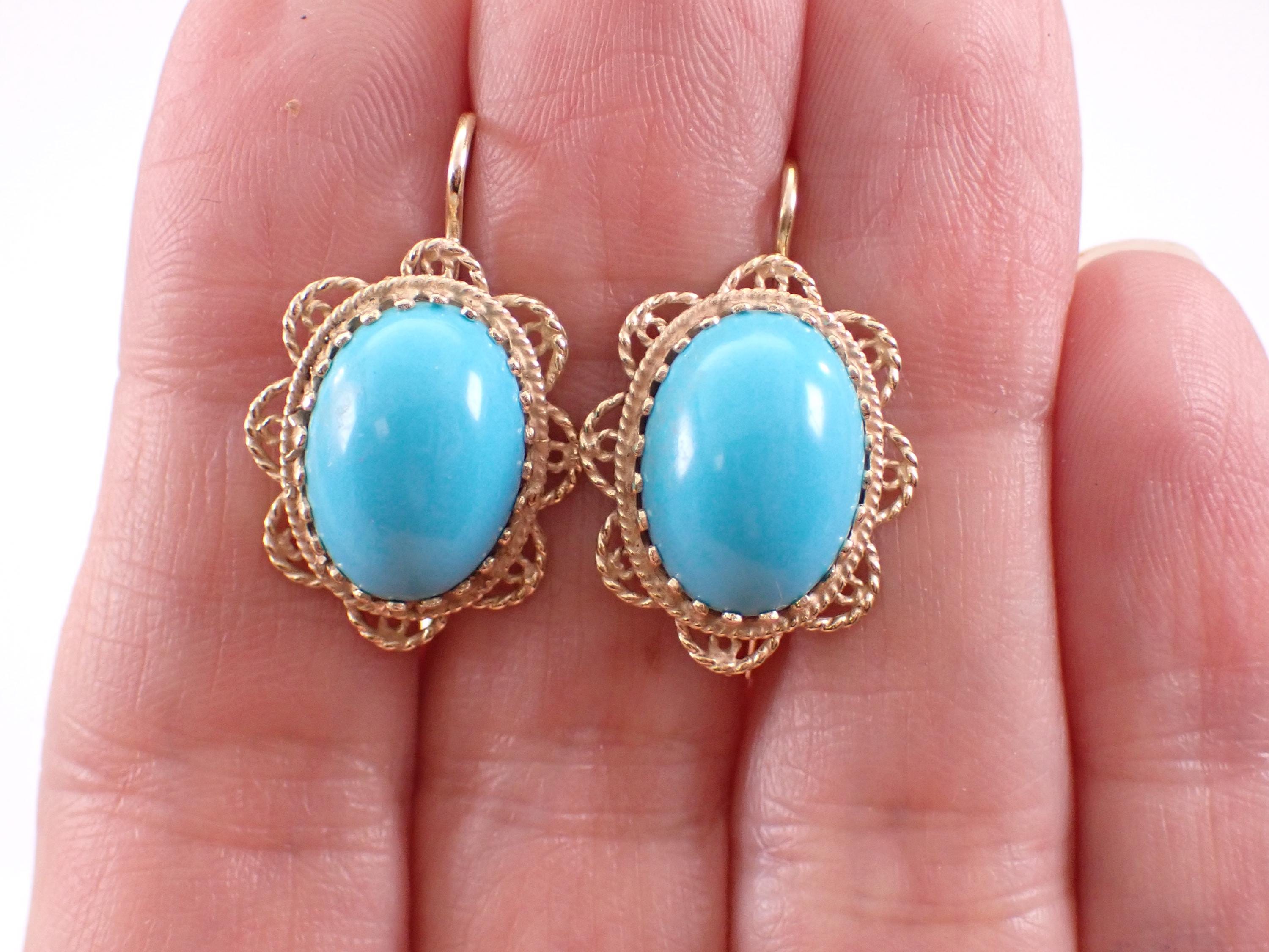 Vintage 14K Yellow Gold Turquoise Earrings. These earrings are set with one Turquoise in each earring. The Turquoise is a beautiful color and measure 13.5 X 10 mm each. These earrings are 14KT Yellow Gold and weigh a total of 4.8 grams. These earrings are for pierced ears, measure 25 X 16 mm and have very secure kidney wire clasps. These earrings will be accompanied by an appraisal written for insurance and authentication purposes. I will ship these earrings promptly in a gift box.
