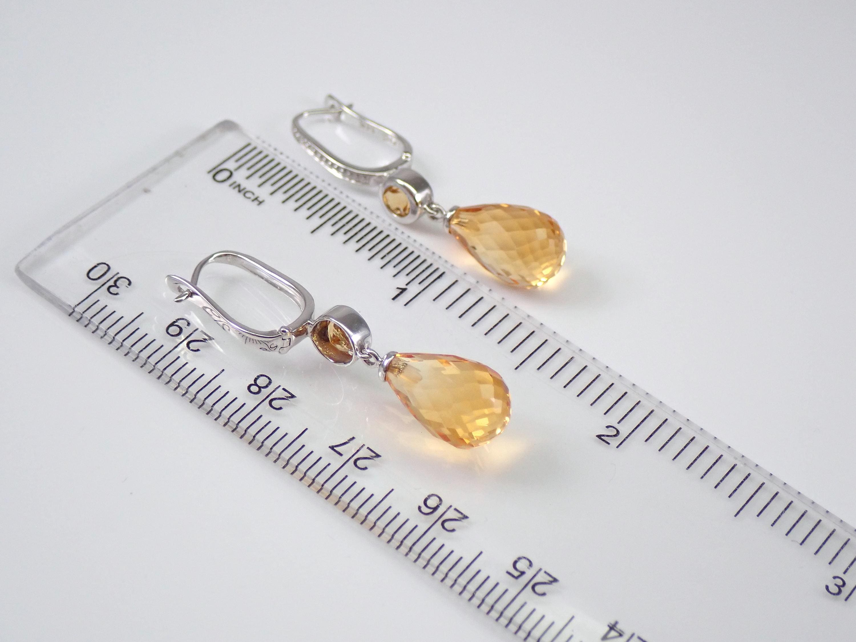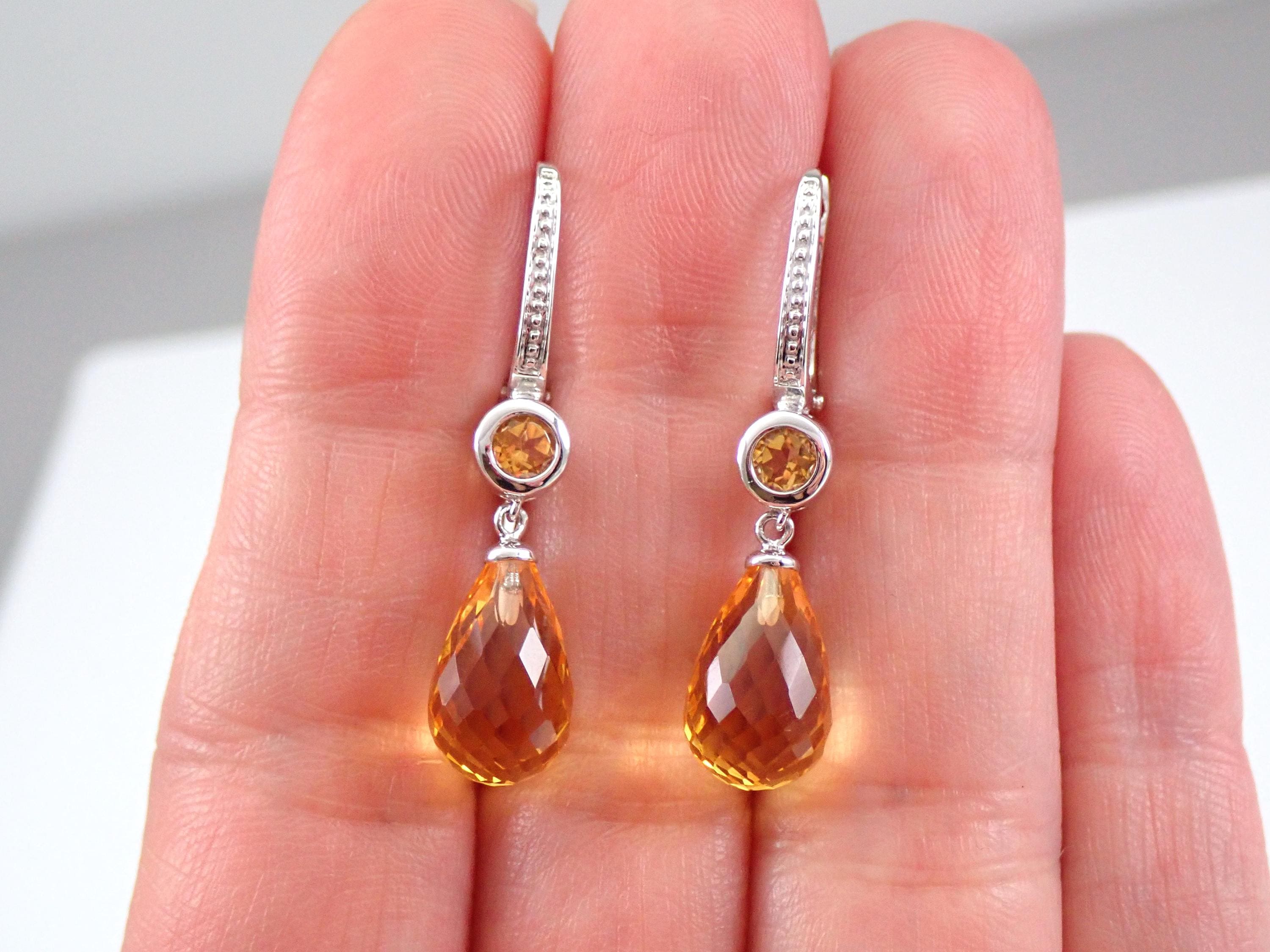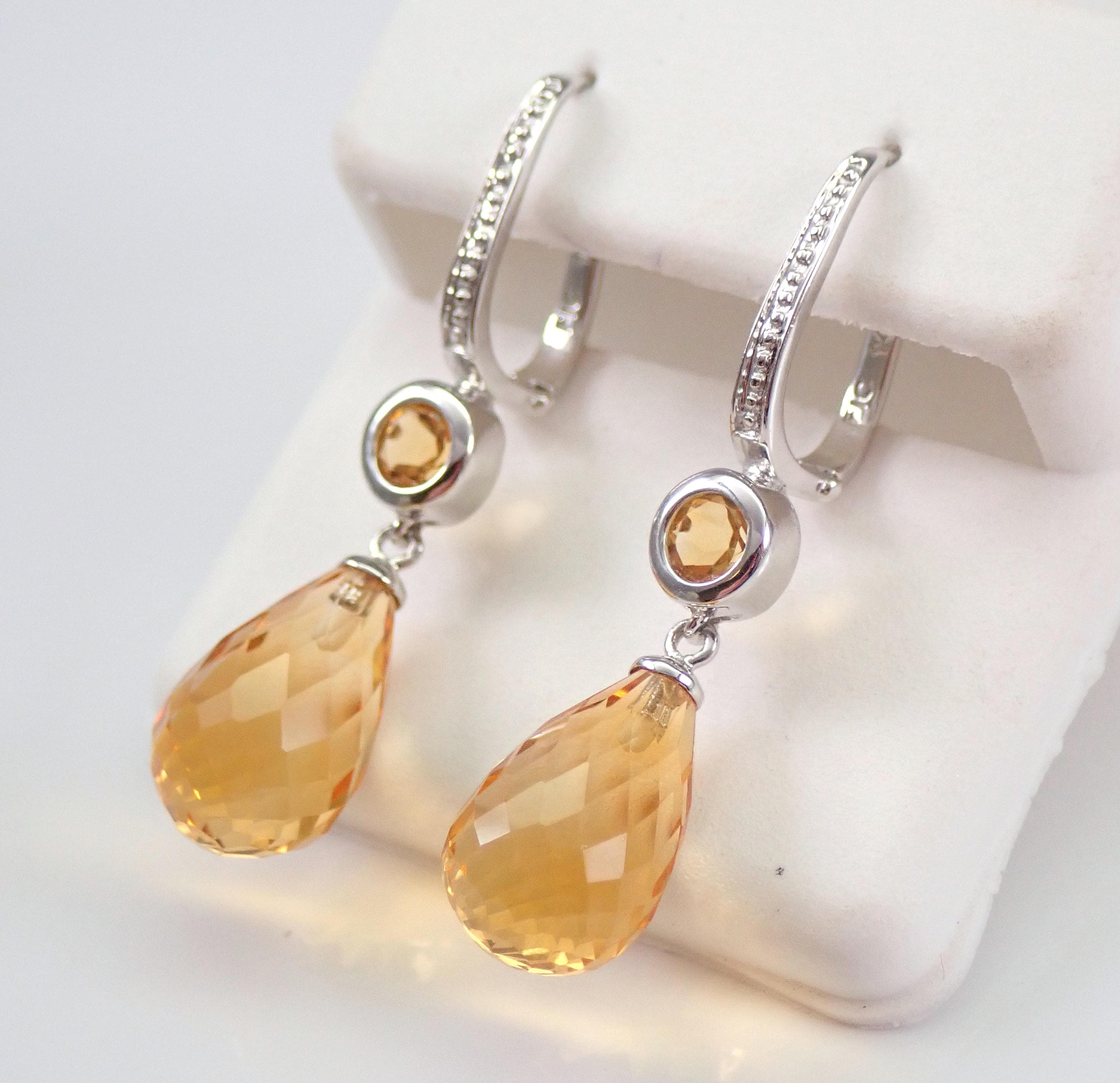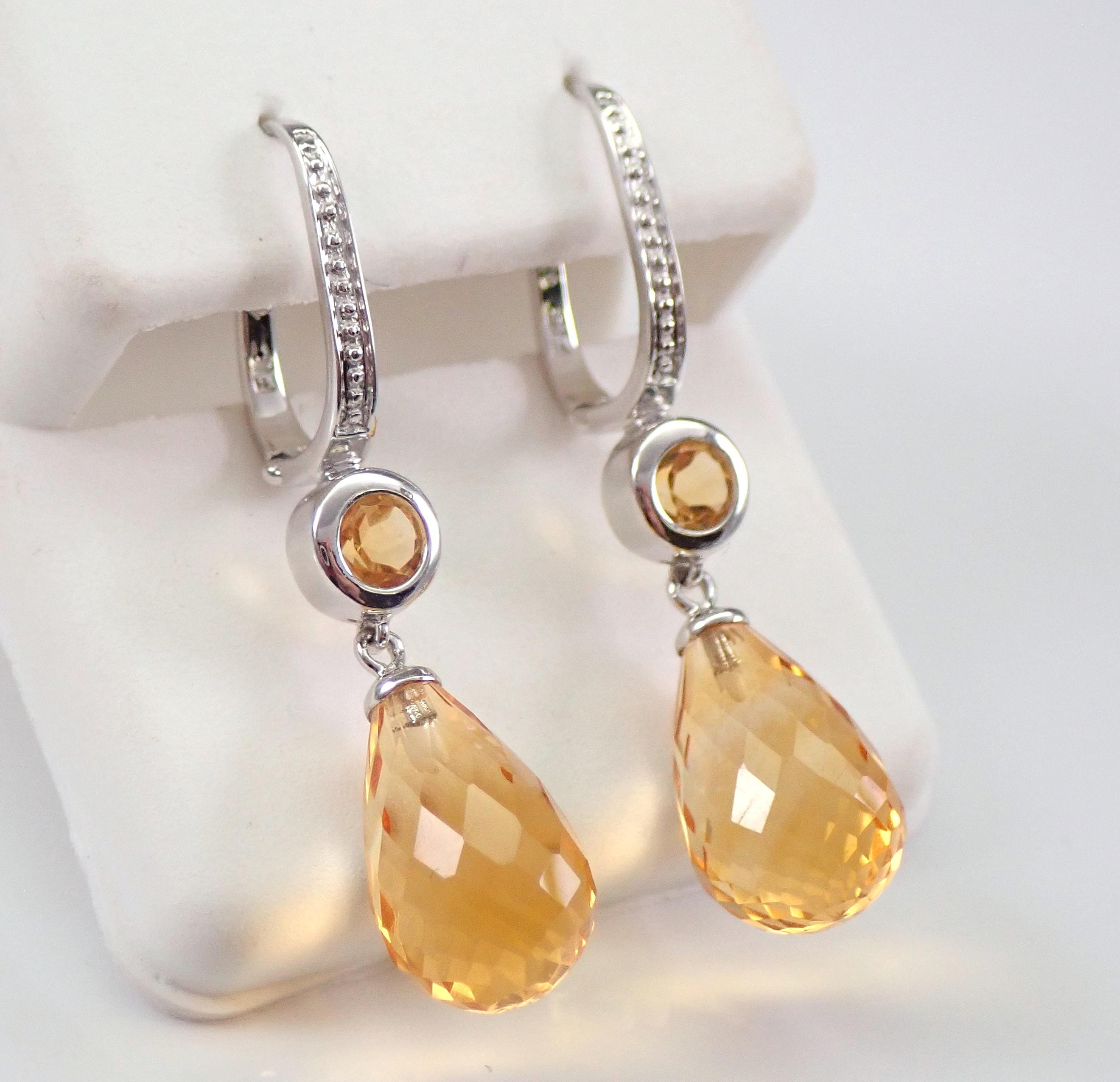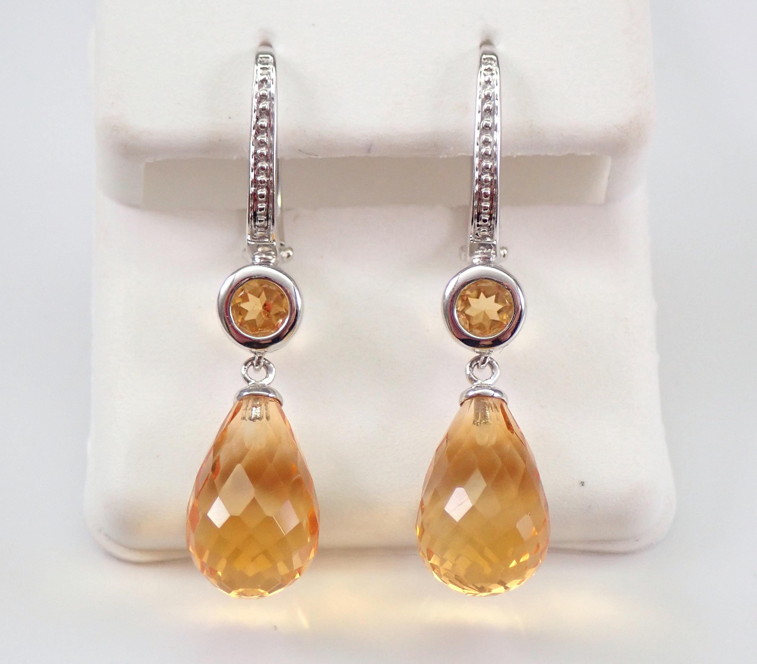 14K White Gold Briolette Citrine Dangle Drop Earrings. There are two Bezel set Round Citrine and two Citrine Briolette set in these earrings. These teardrop Citrine measure 13 X 8 mm each and the round gems measure 3.5 mm in diameter each. These earrings are 14KT White Gold, measure 34 mm in length and weigh a total of 3.8 grams. These earrings are for pierced ears and have latch back closures. These earrings will be accompanied by an appraisal written by a GIA Certified Diamond Grader with the retail replacement value of $1,295.00. I will ship these earrings promptly in a gift box.