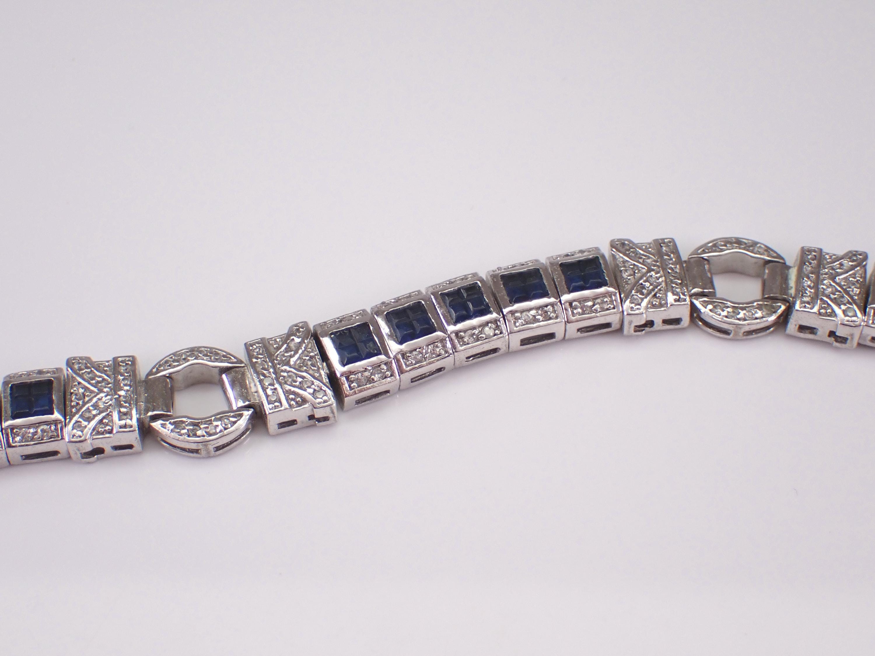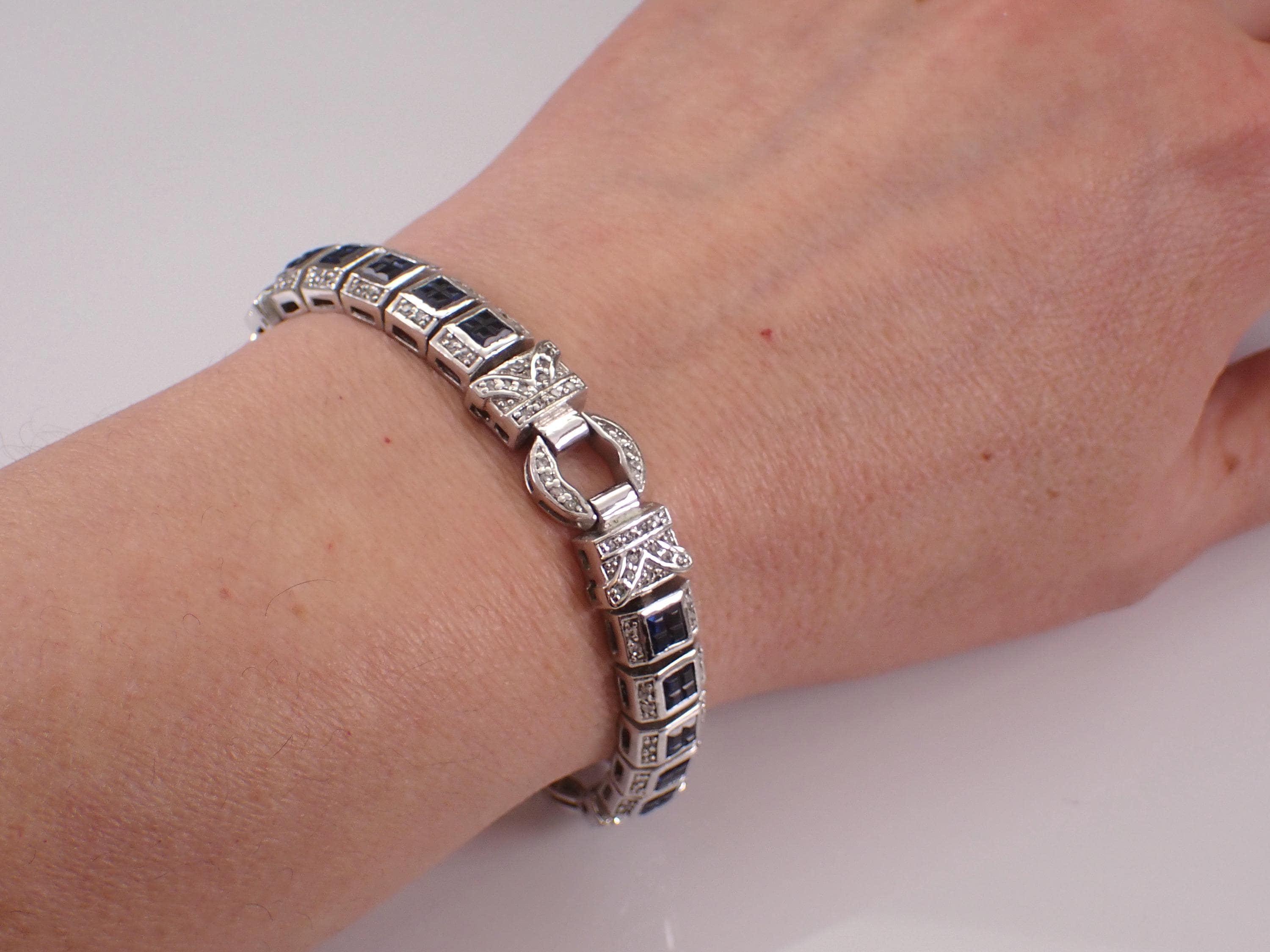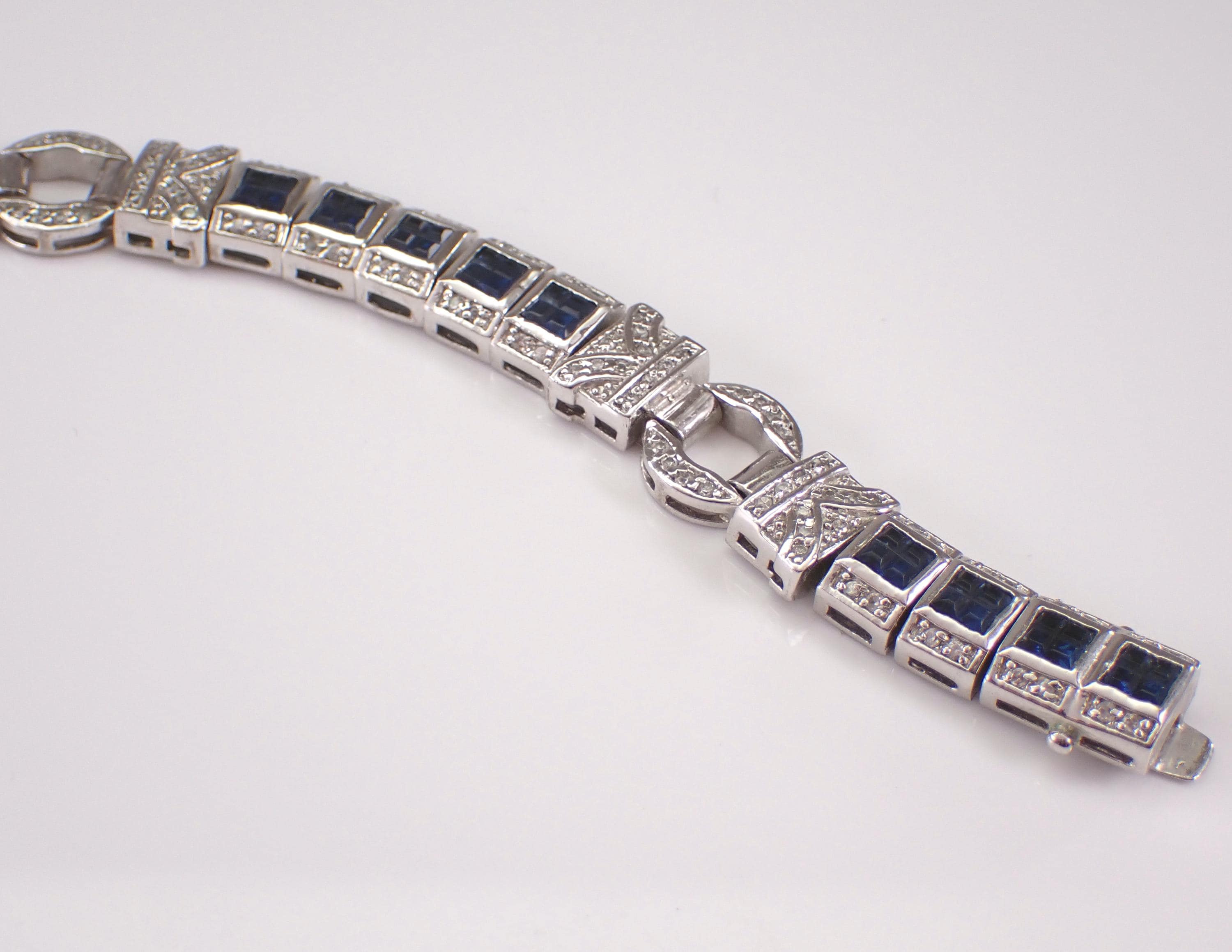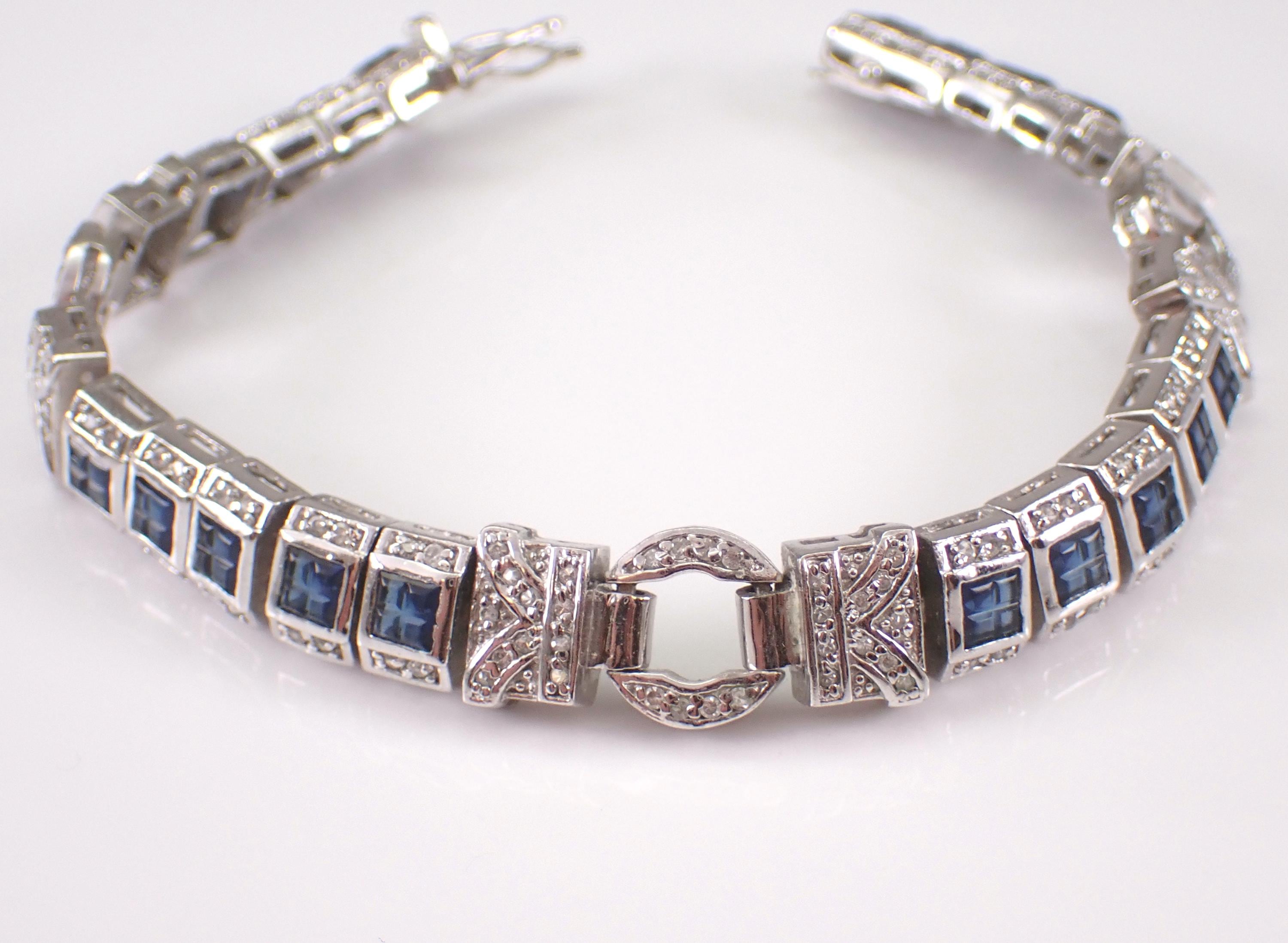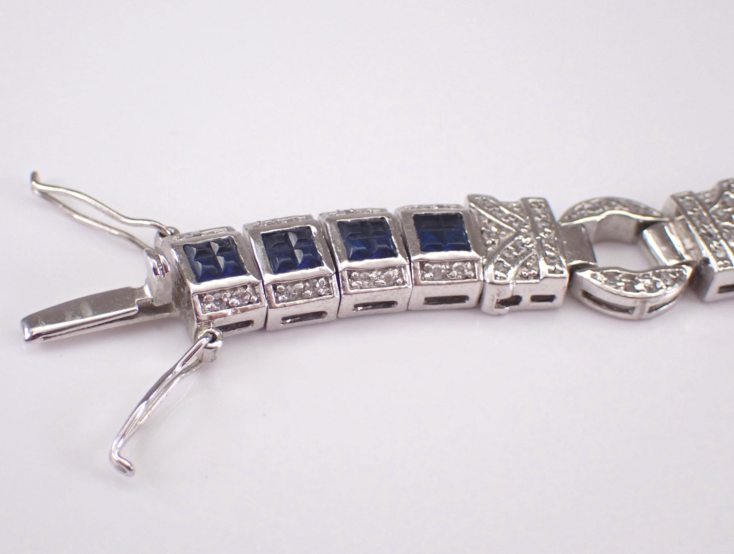 Vintage Sterling Silver Cubic Zirconia and Lab Grown Sapphire Art Deco Inspired Tennis Bracelet. The bracelet is set with fourteen round CZ's and princess cut Lab grown sapphires. This bracelet weighs 29.2 grams, measures 10mm in width and 7 1/4" in length. This bracelet is in good condition, perfect for everyday wear or any special occasion, like Mothers Day, Birthday, Anniversary, Graduation, etc. The Bracelet will be shipped promptly in a gift pouch.