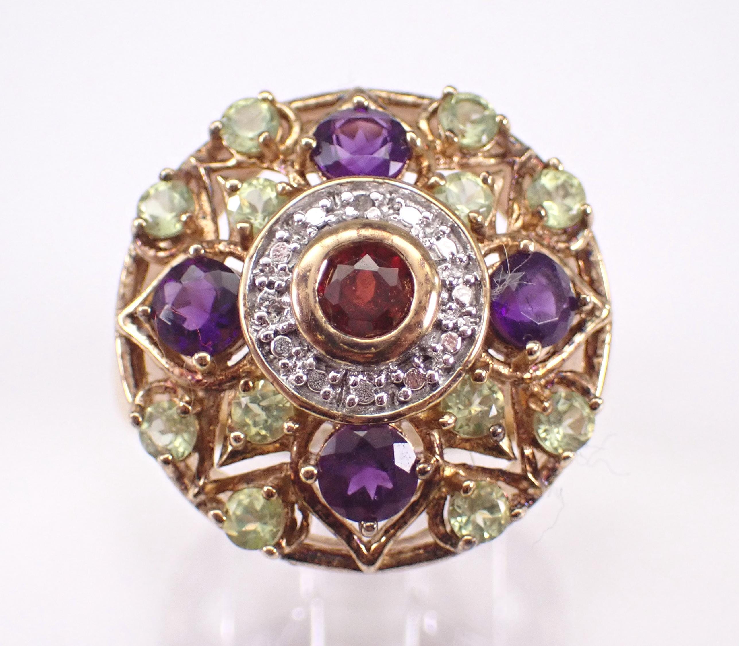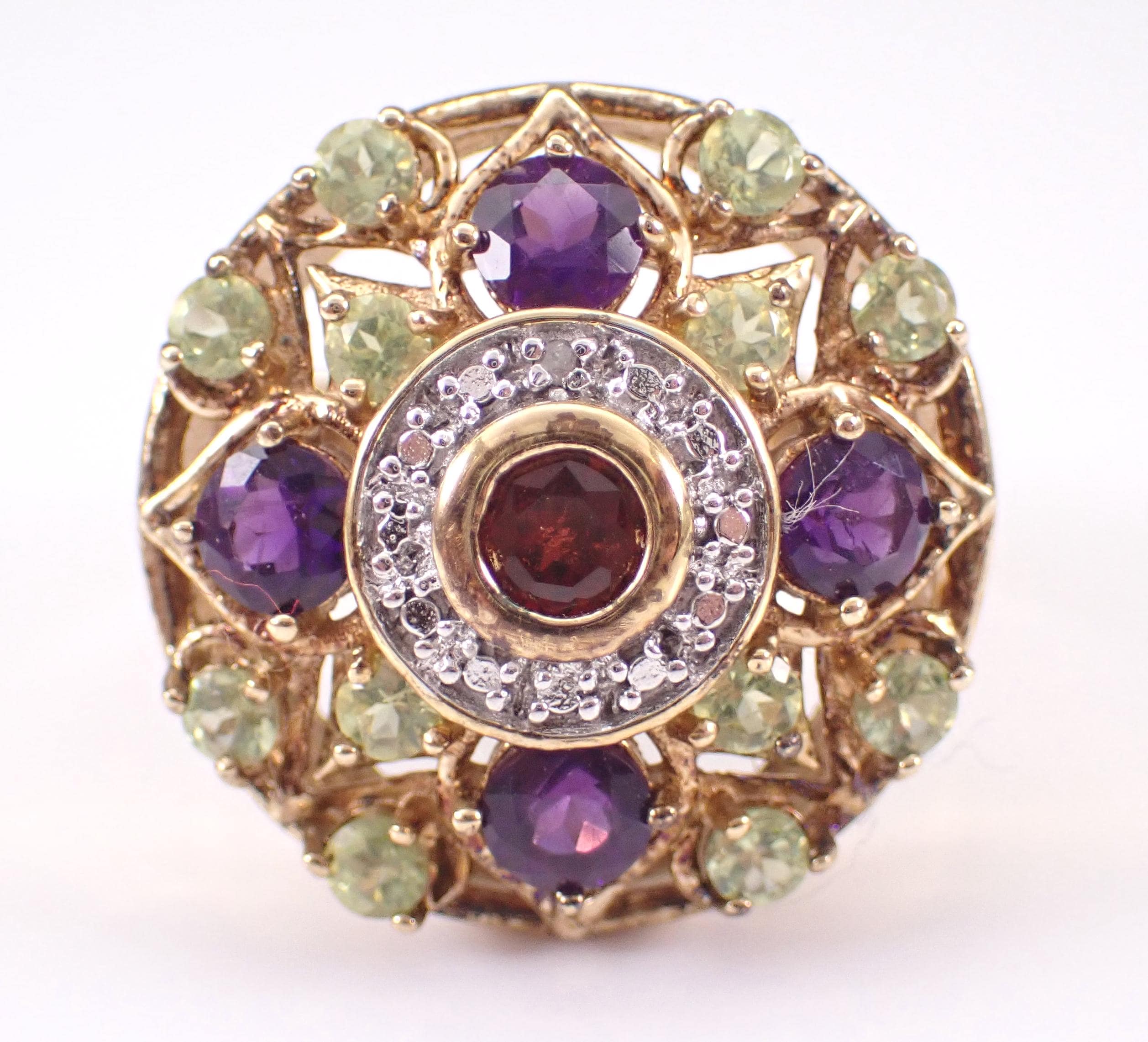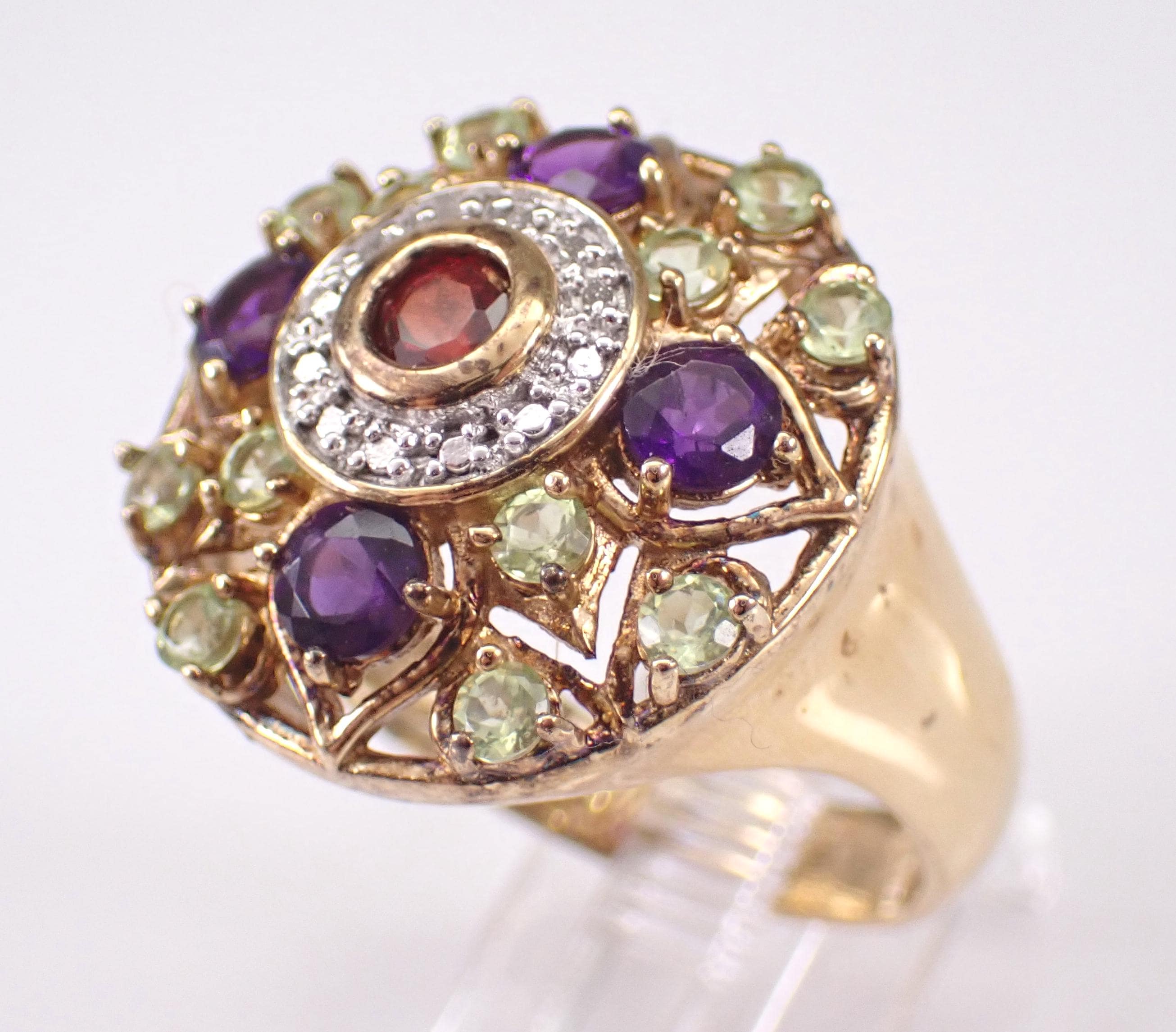 Vintage Sterling Silver (Gold Plated/Vermeil) Garnet, Amethyst and Peridot Cocktail ring. This ring is set with all genuine gemstones. The ring itself is made of Sterling Silver and marked 925. This ring is in excellent condition, is finger size 10 and weighs 8.2 grams. The top of this ring measures 21 mm in diameter. This ring will be shipped promptly in a gift pouch.