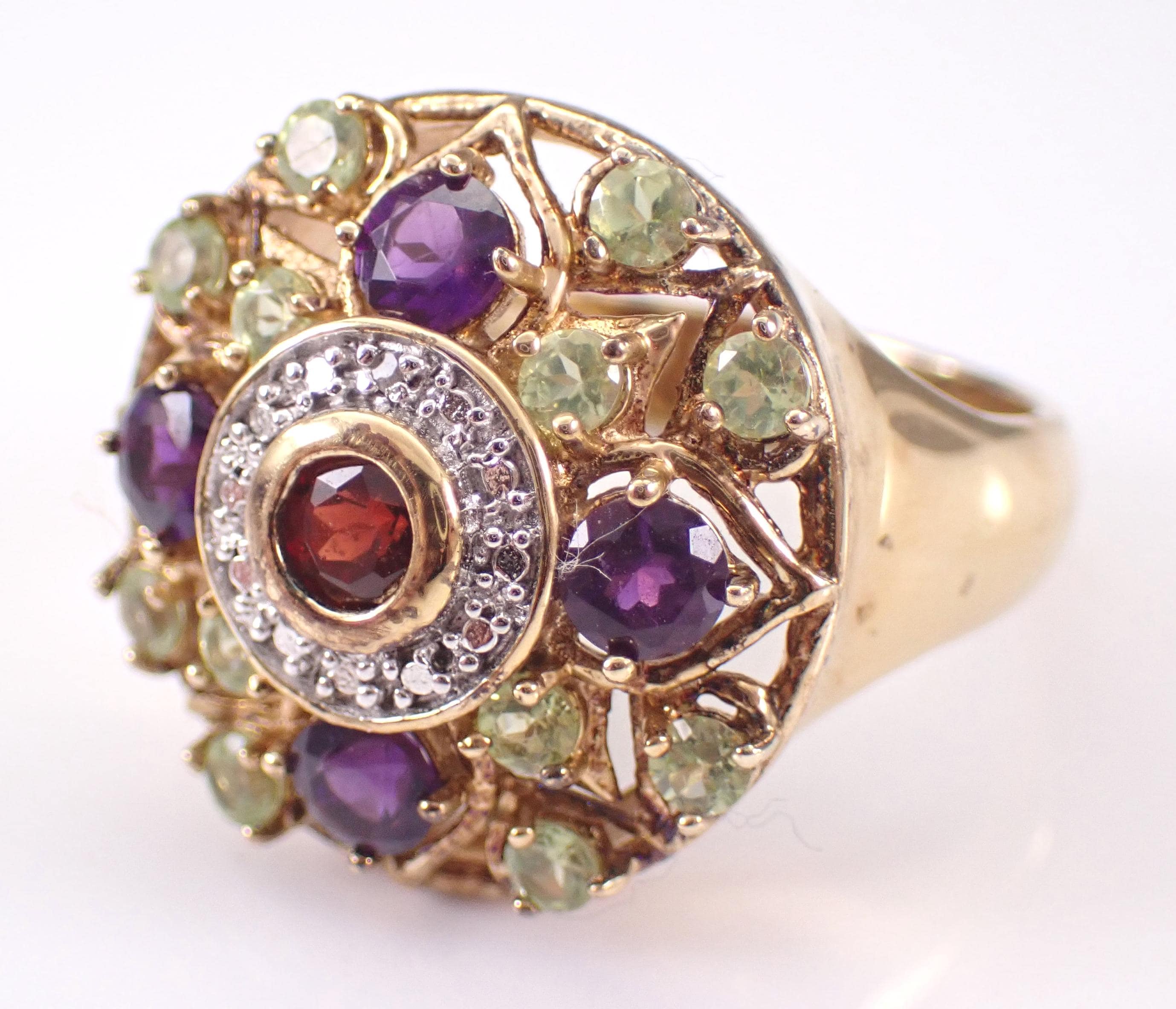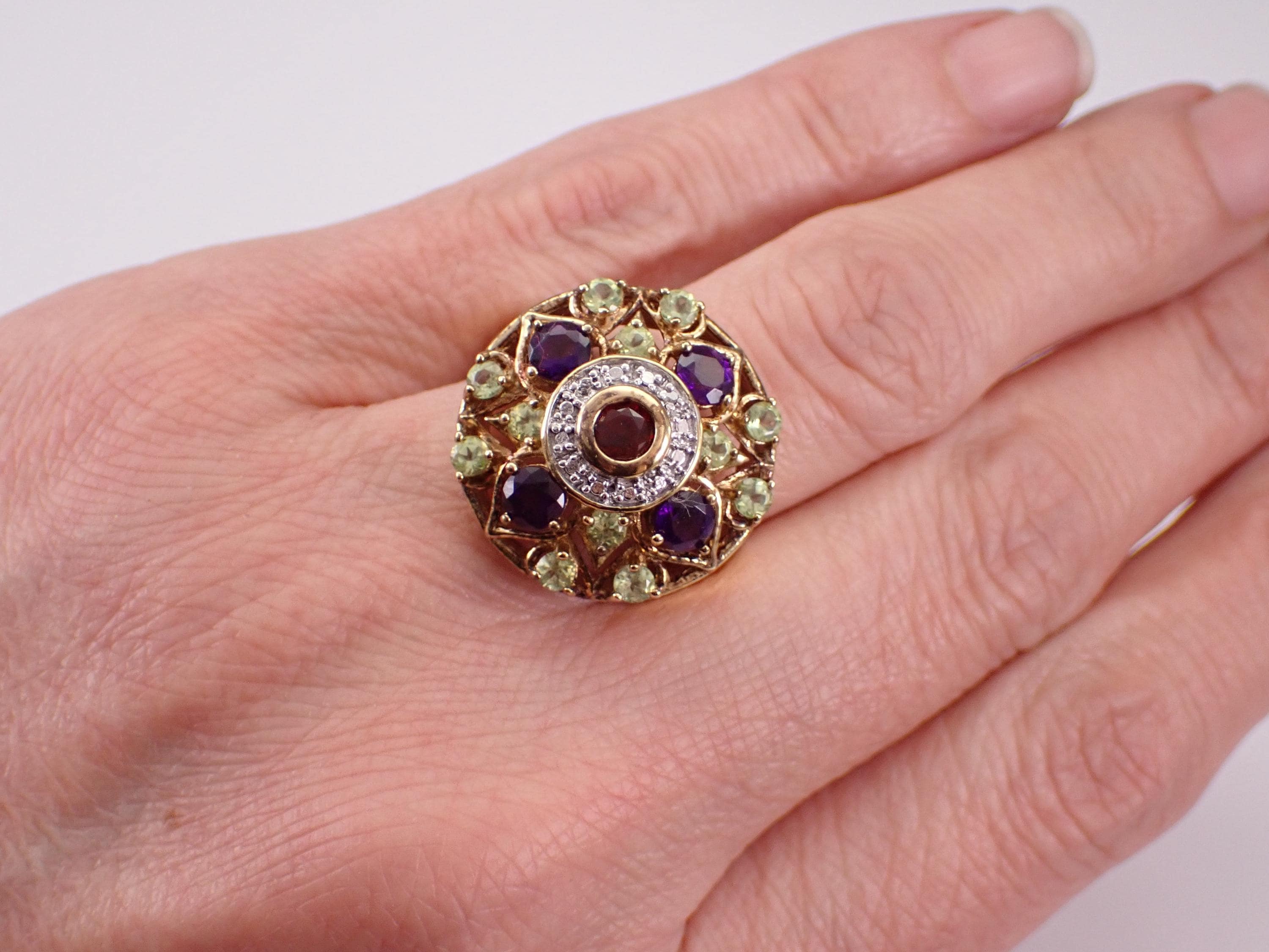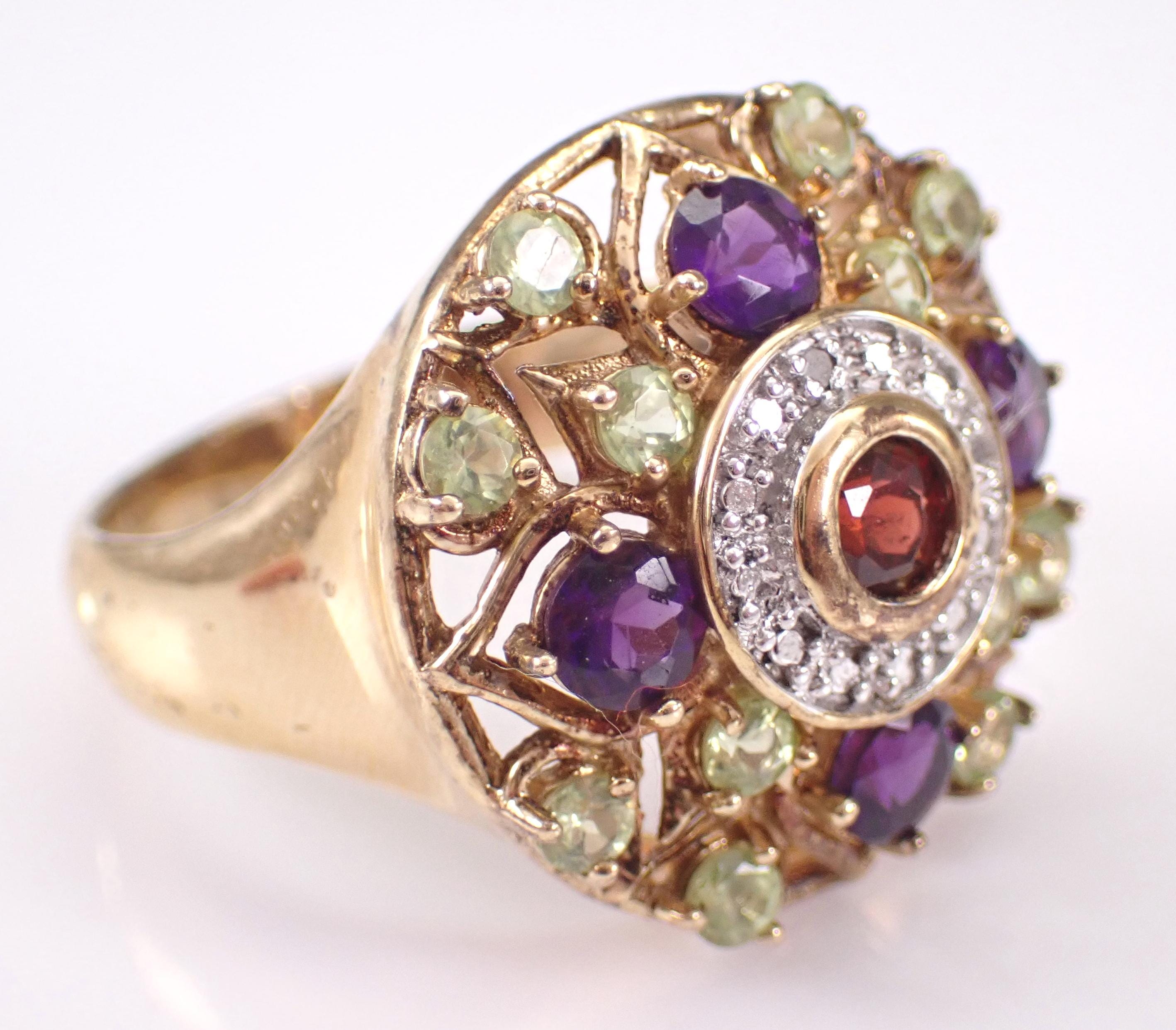 Vintage Sterling Silver (Gold Plated/Vermeil) Garnet, Amethyst and Peridot Cocktail ring. This ring is set with all genuine gemstones. The ring itself is made of Sterling Silver and marked 925. This ring is in excellent condition, is finger size 10 and weighs 8.2 grams. The top of this ring measures 21 mm in diameter. This ring will be shipped promptly in a gift pouch.