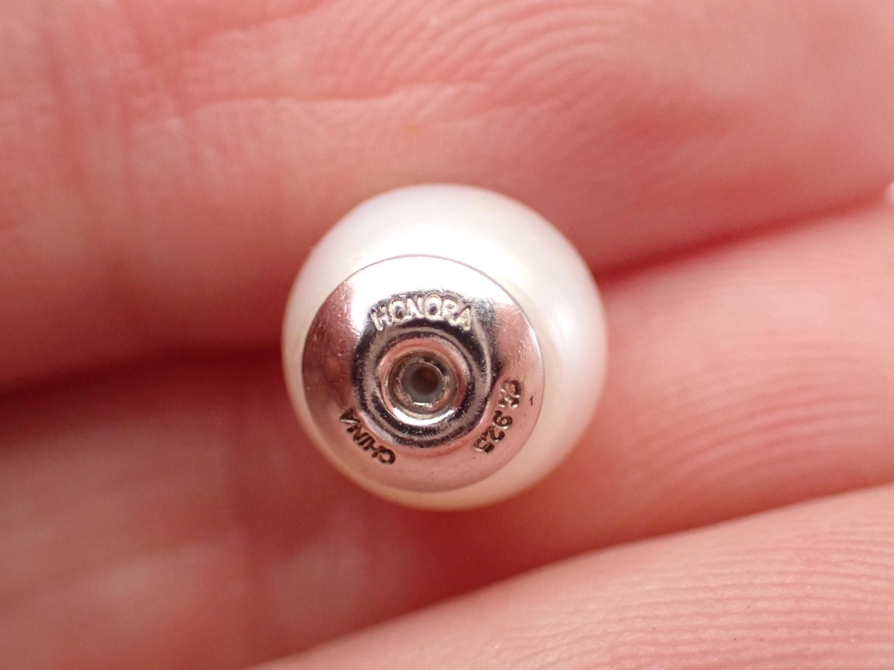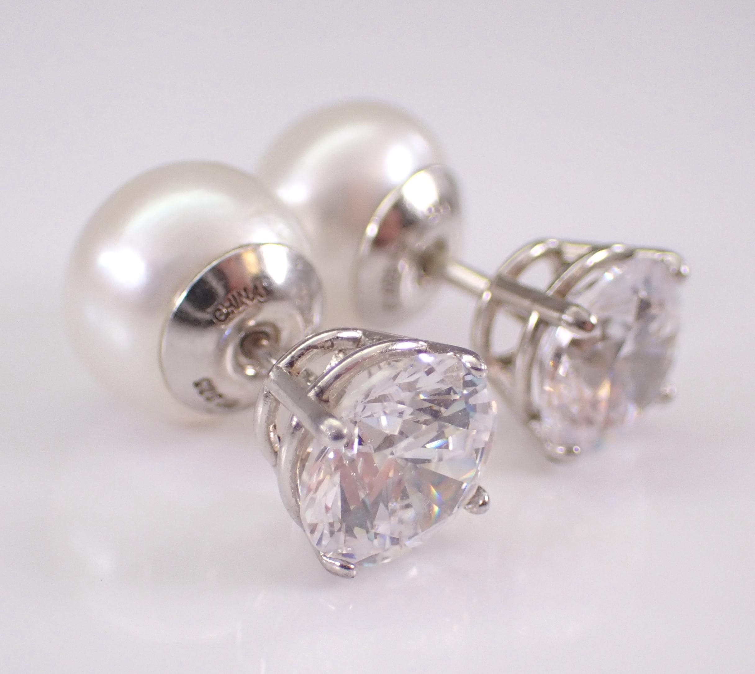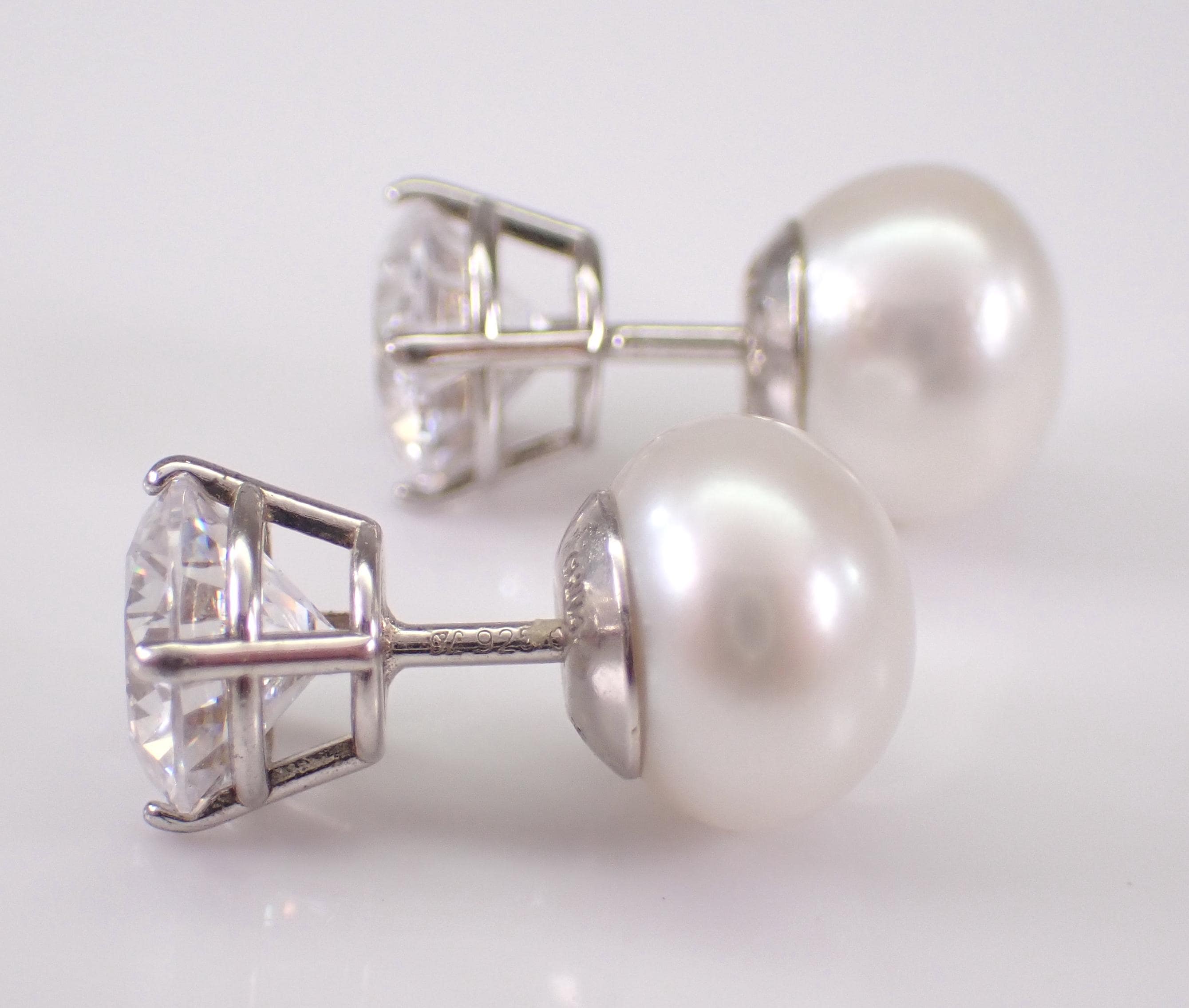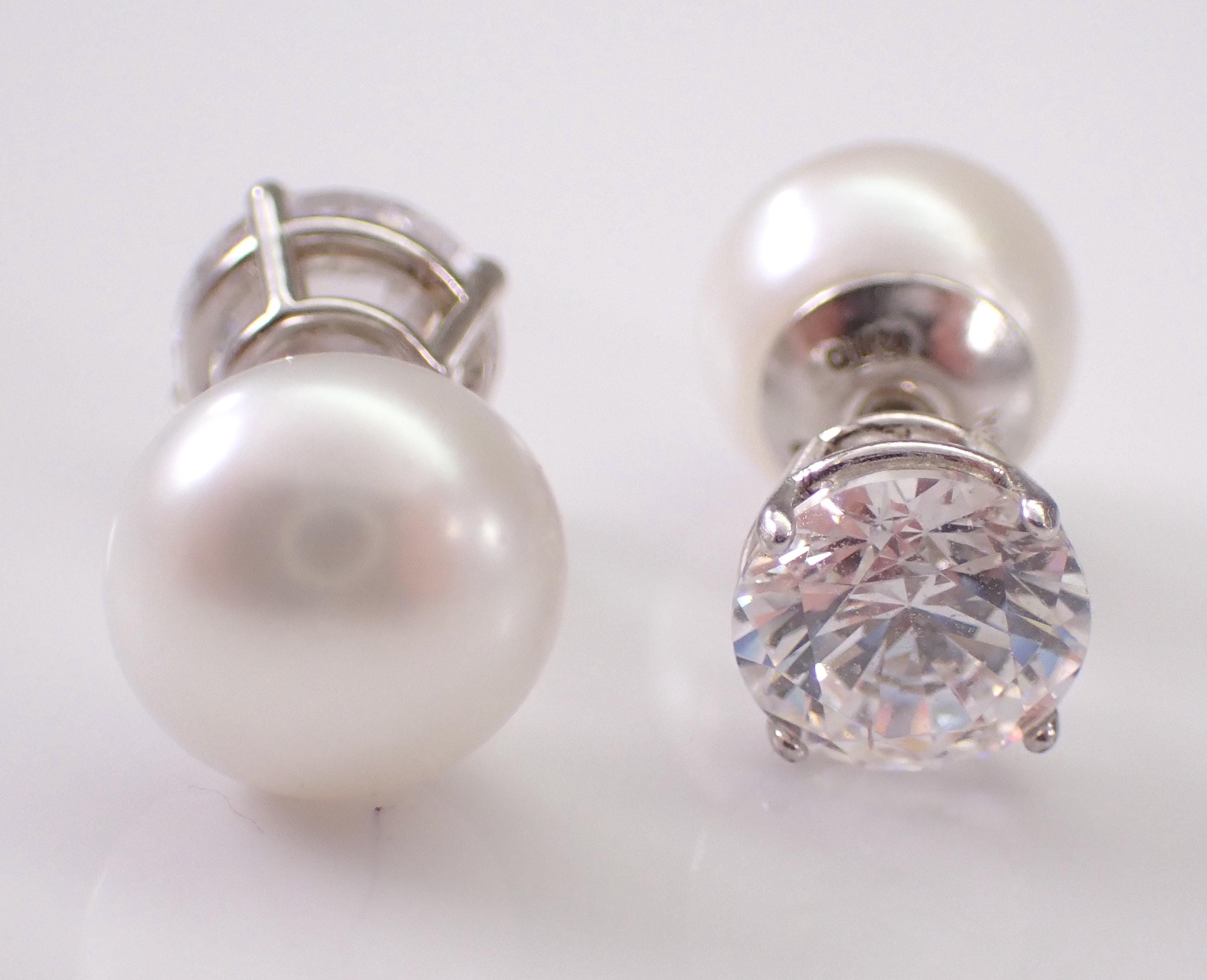 Beautiful and unique Pearl and Cubic Zirconia Stud earrings are crafted of 925 Sterling Silver by Honora. The studs are set with a white Pearl on one side measuring 9 mm in diameter and a round Brilliant Cubic Zirconia on the other side measuring 7 mm in diameter. These earrings weigh a total of 3.2 grams and are for pierced ears. These earrings will be shipped promptly in a gift pouch.