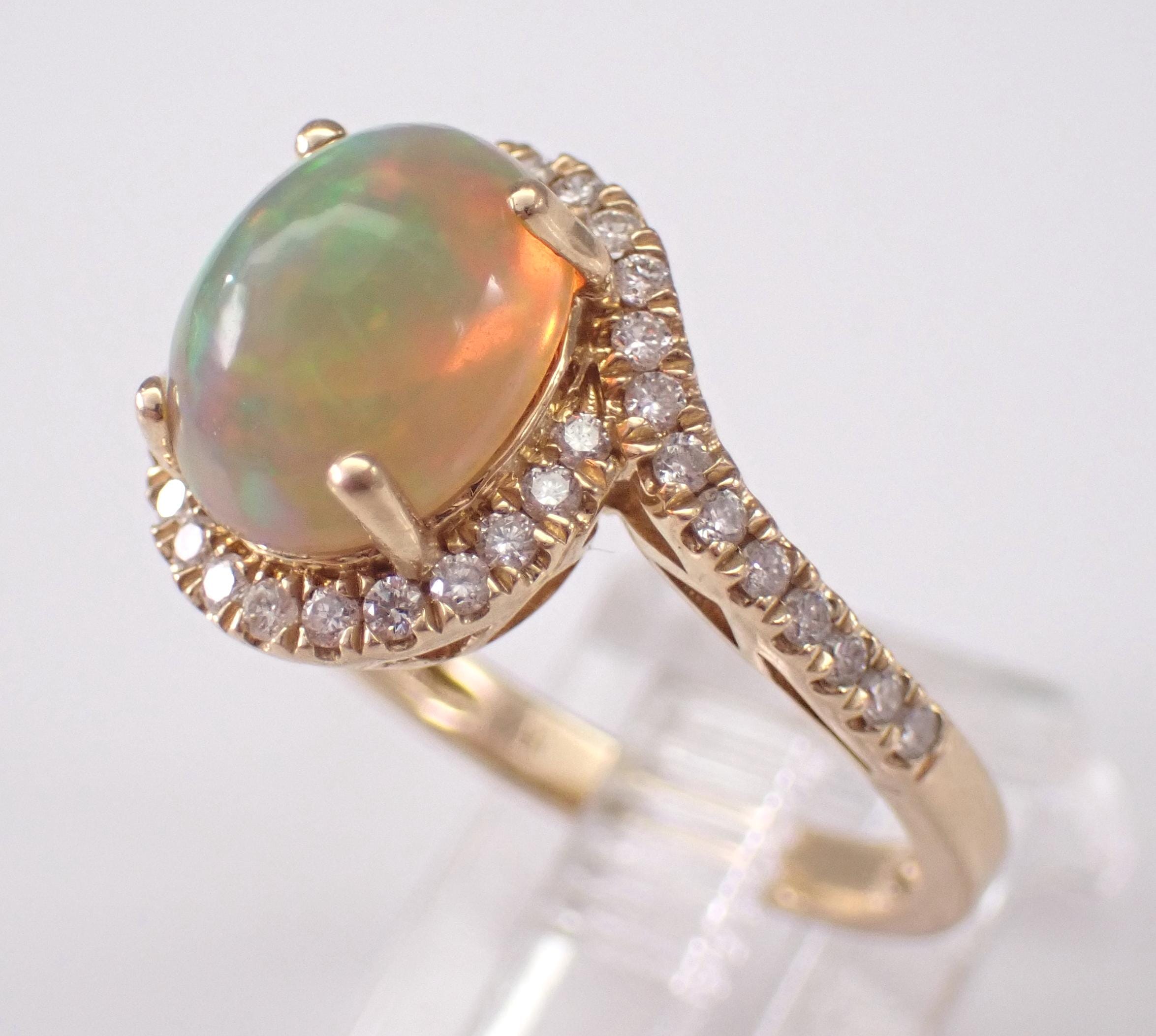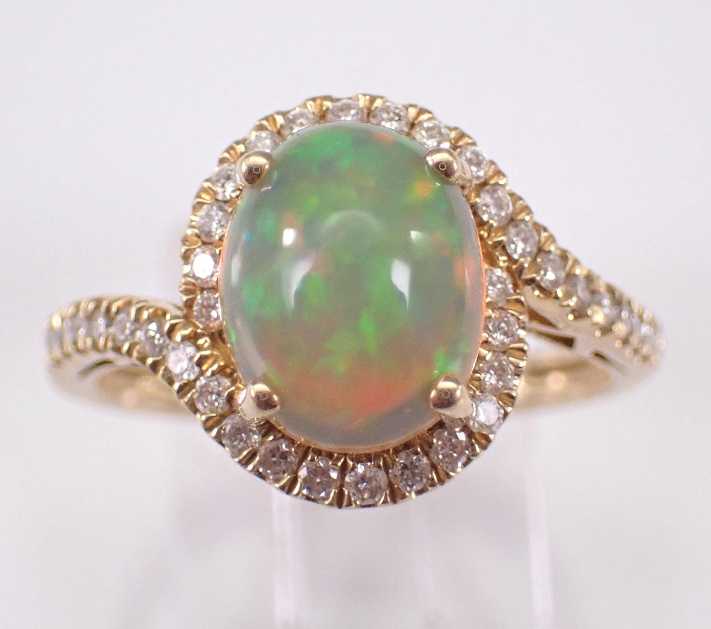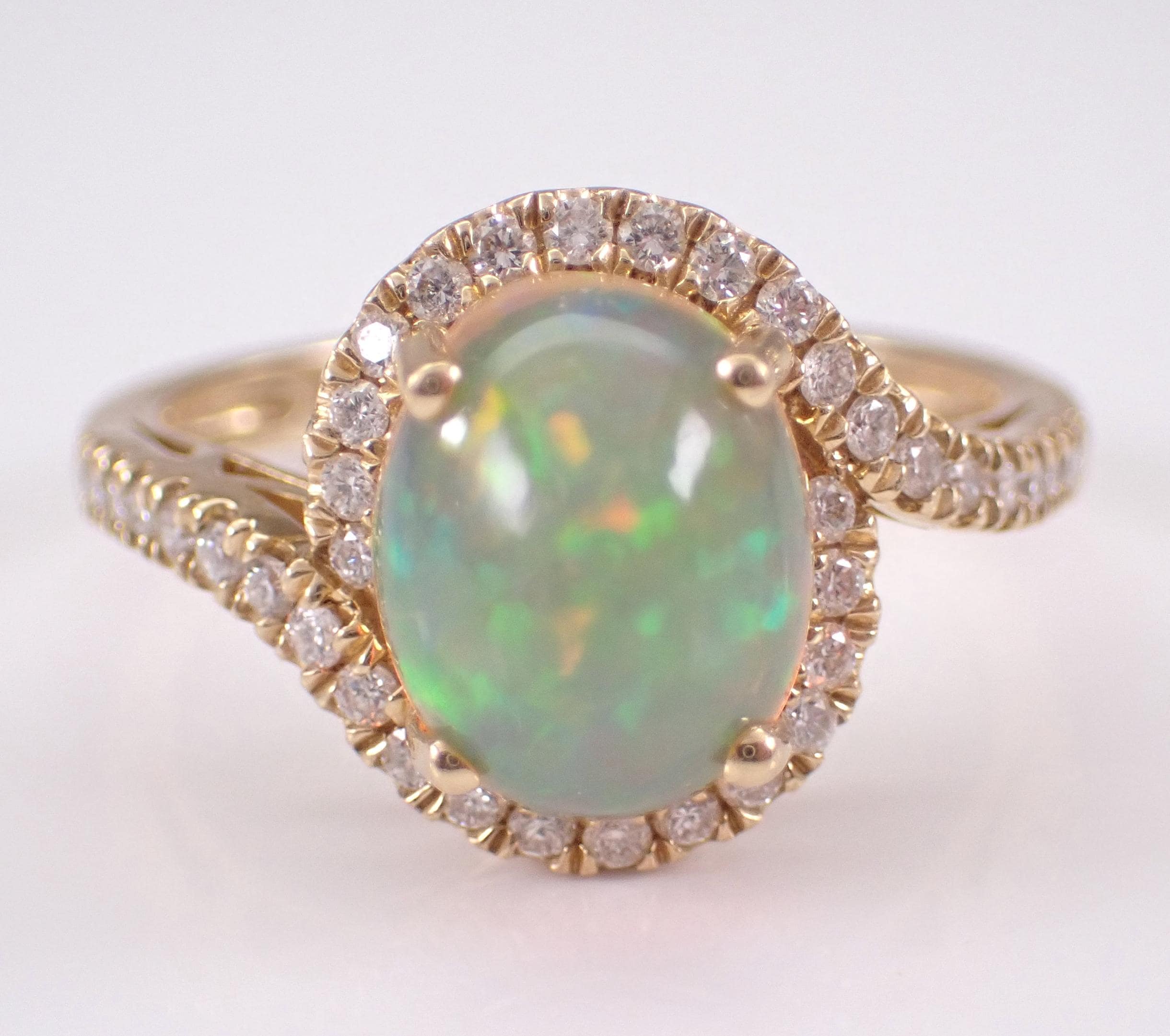 14K Yellow Gold Diamond and Opal Engagement Ring. This ring is set with one genuine Oval Opal in the center and thirty-eight genuine round brilliant diamonds. The Opal measures 9.9 X 7.8 mm and weighs 2.10 carats. The diamonds in this ring are G/H color, SI clarity and weigh a total of .34 carat. This ring is Solid 14KT Yellow Gold, weighs 3.8 grams and is a finger size 7 1/4, which can be resized free of charge (please inquire about sizing with the finger size you need). The top of this ring measures 12.5 mm along the finger and will be accompanied by an appraisal written by a GIA Certified Diamond Grader with the retail replacement value of $3,095.00. I will ship this ring promptly in a beautiful gift box.