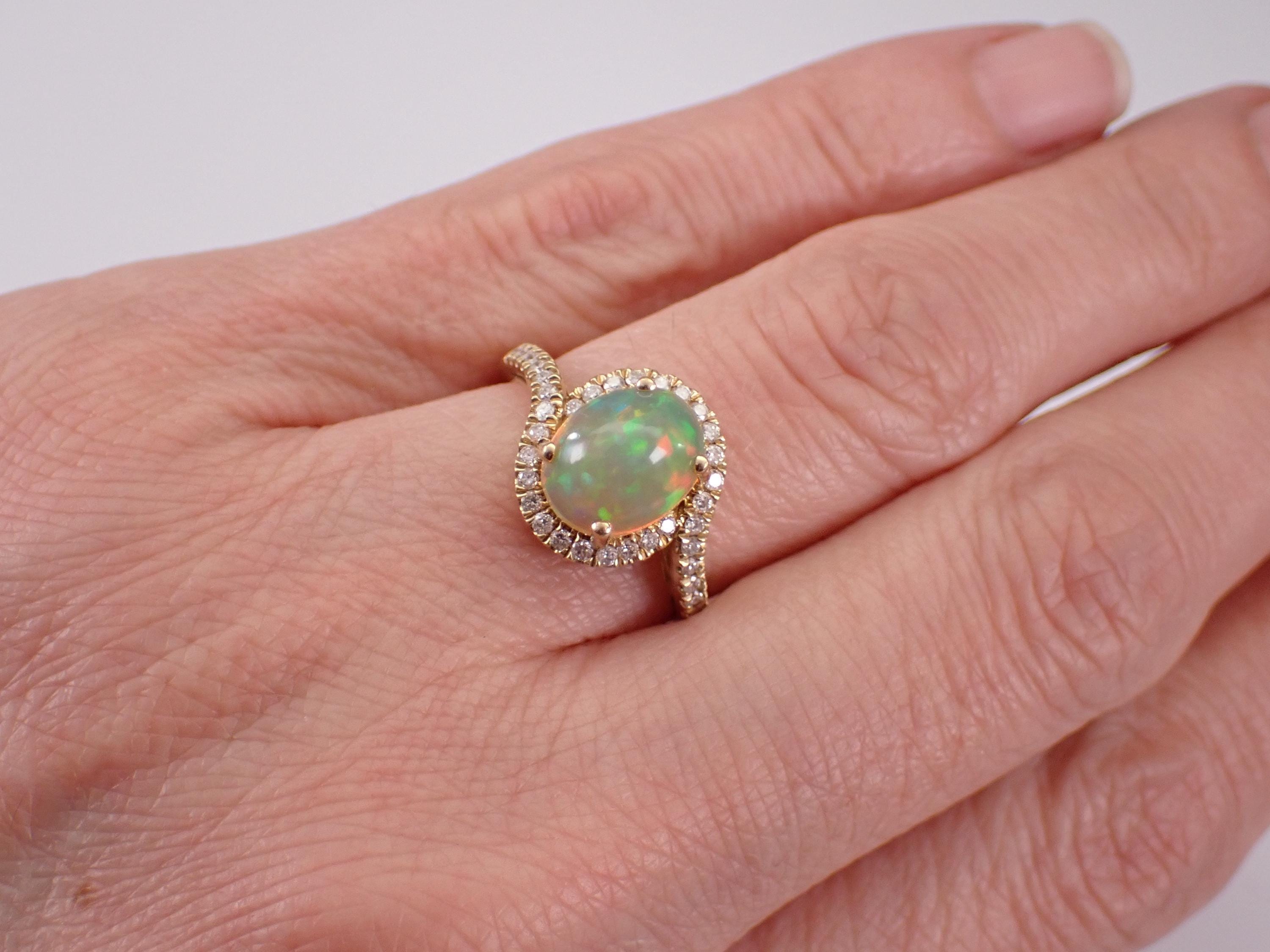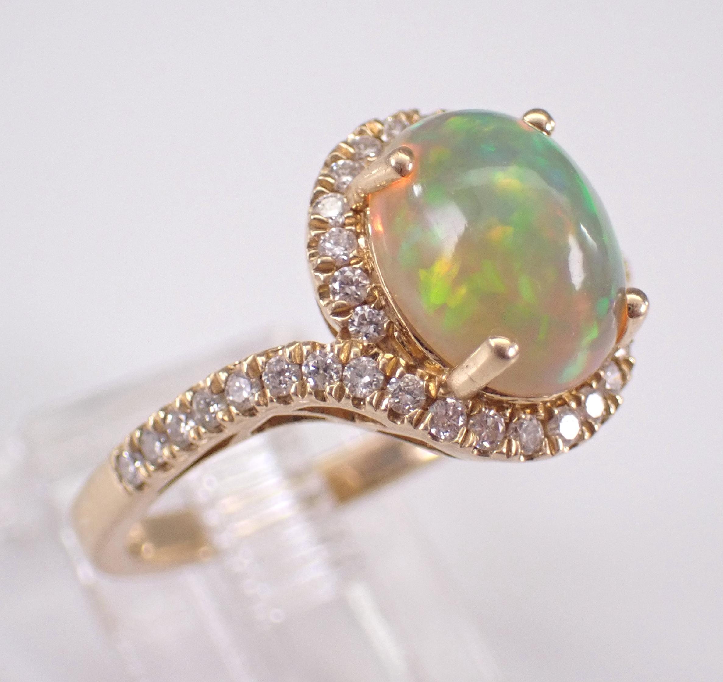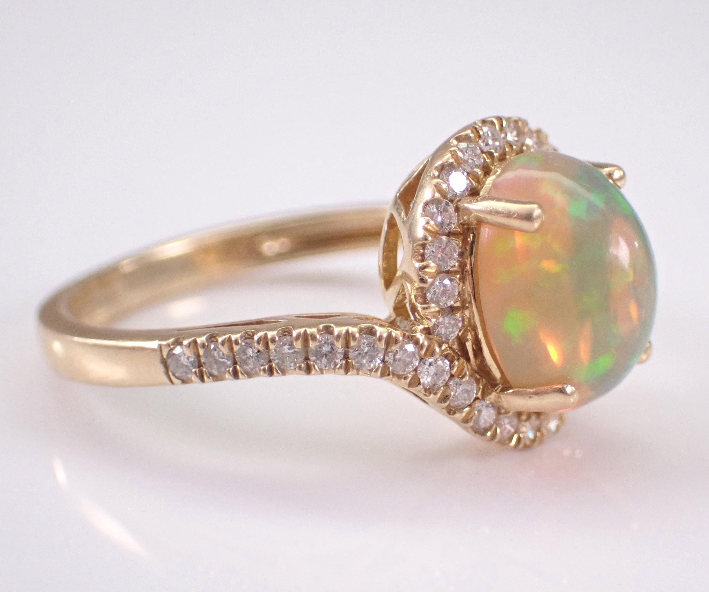 14K Yellow Gold Diamond and Opal Engagement Ring. This ring is set with one genuine Oval Opal in the center and thirty-eight genuine round brilliant diamonds. The Opal measures 9.9 X 7.8 mm and weighs 2.10 carats. The diamonds in this ring are G/H color, SI clarity and weigh a total of .34 carat. This ring is Solid 14KT Yellow Gold, weighs 3.8 grams and is a finger size 7 1/4, which can be resized free of charge (please inquire about sizing with the finger size you need). The top of this ring measures 12.5 mm along the finger and will be accompanied by an appraisal written by a GIA Certified Diamond Grader with the retail replacement value of $3,095.00. I will ship this ring promptly in a beautiful gift box.
