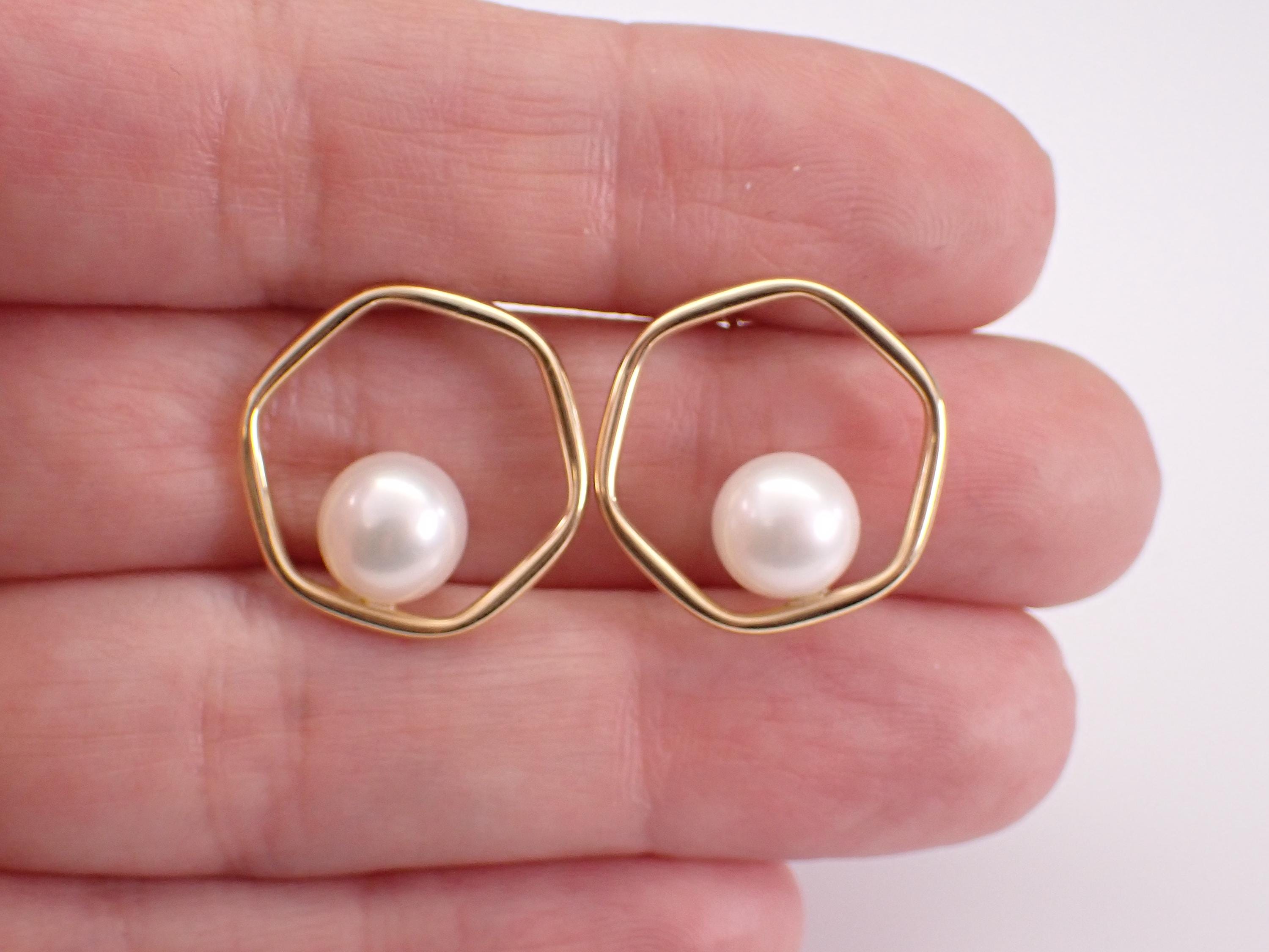 14K Yellow Gold Pearl Stud Earrings. These earrings are set with two Round White Pearls that measure 8 mm in diameter each. These earrings are 14KT Yellow Gold and weigh a total of 2.8 grams. These earrings are for pierced ears, measure 18.5 X 19.5 mm and the earrings have friction post backings. I will ship these earrings promptly in a gift box.