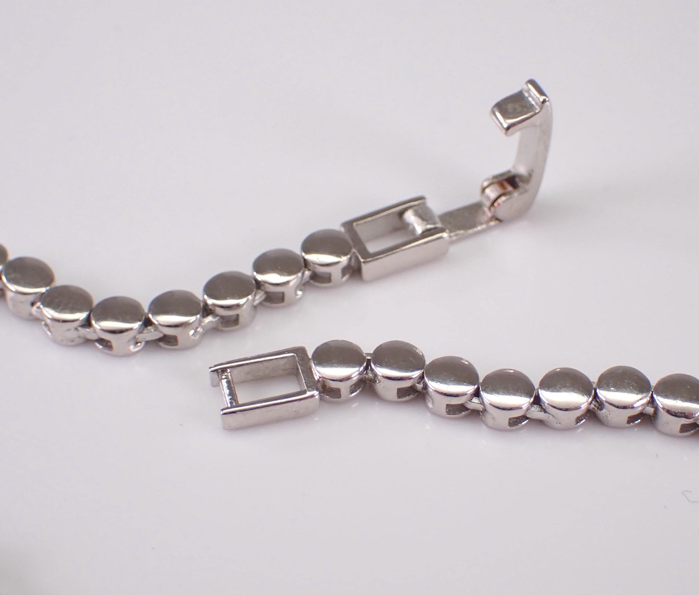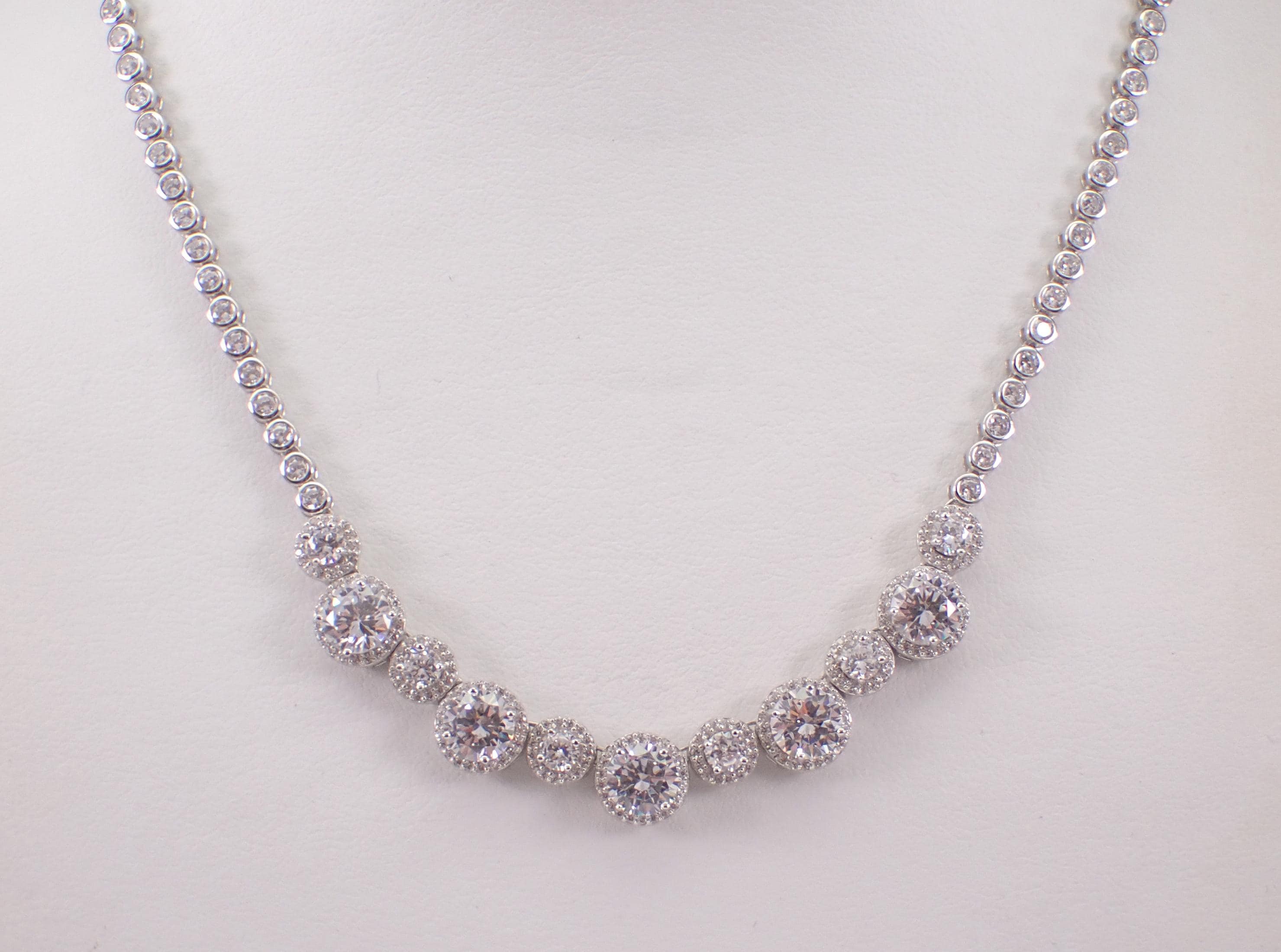 This necklace is Sterling Silver and measures 18" in length. This necklace is set with Round Cubic Zirconia throughout (has the appearance of a 20ct diamond necklace). This necklace weighs 25.2 grams. This necklace is perfect for any event, great gift for any occasion! Will be shipped promptly in a gift pouch.