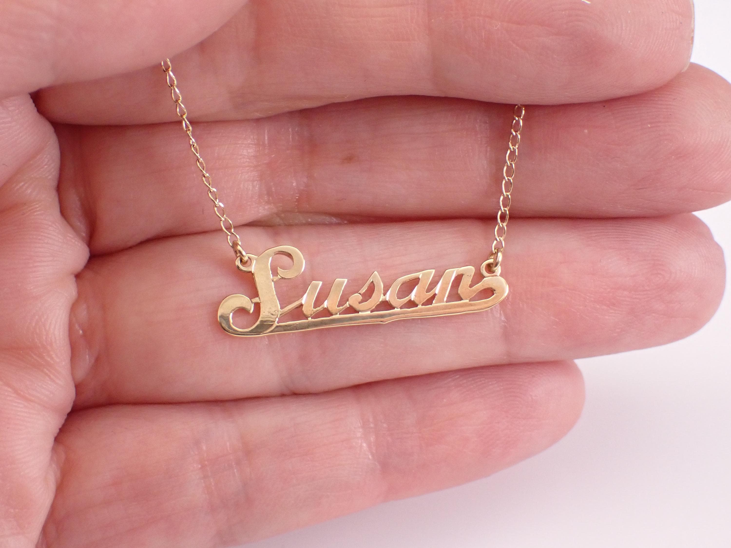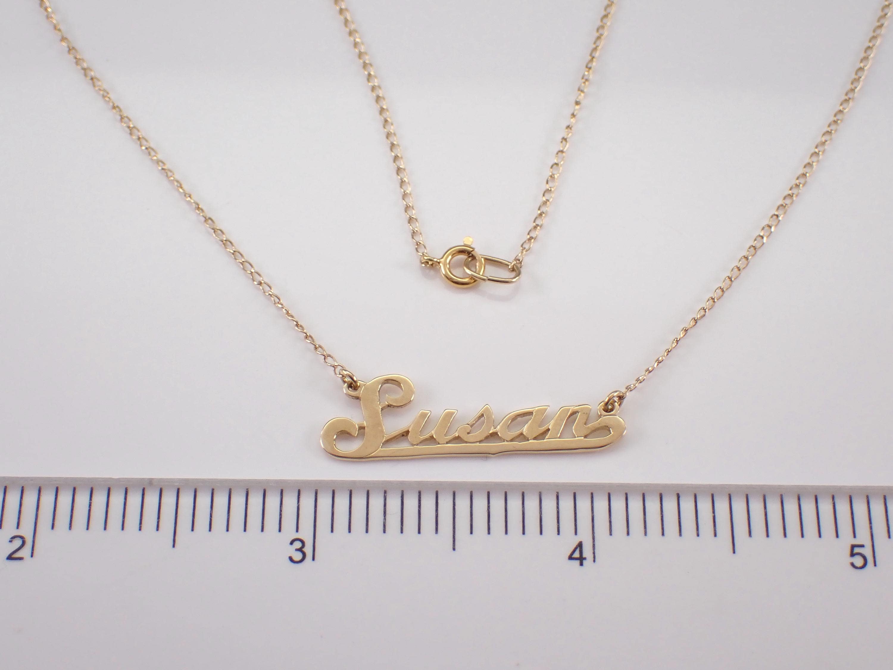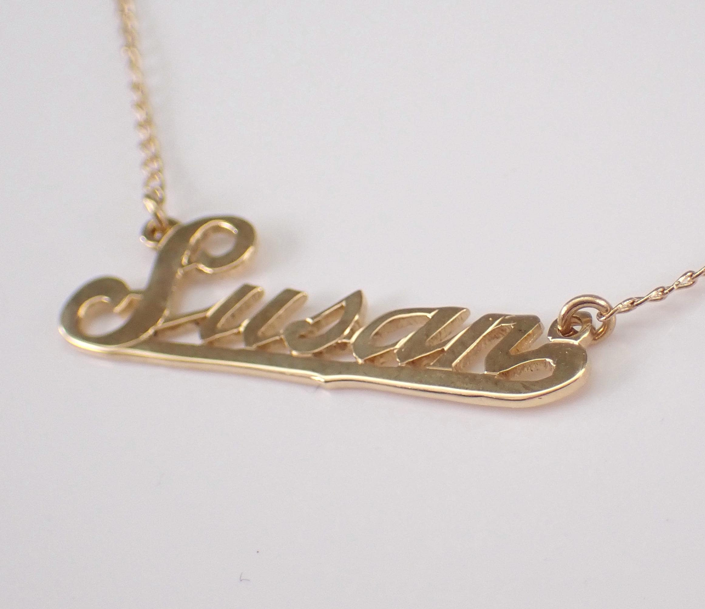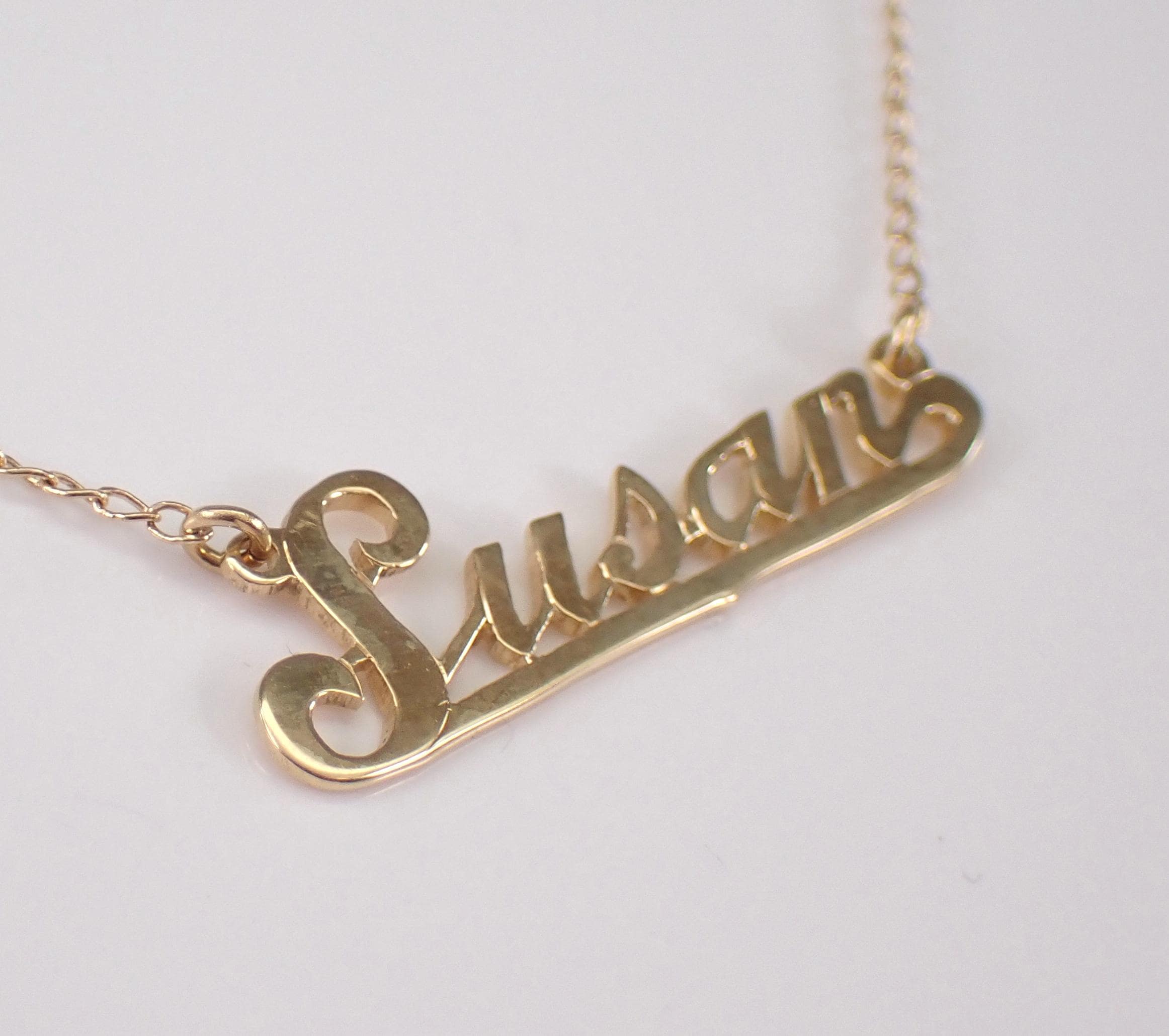 Vintage 14K Yellow Gold SUSAN name pendant charm. This estate necklace weighs 1.8 grams and the pendant measures 28 mm in length. The chain is attached to the name pendant and measures 17" in length. I will ship this pendant promptly in a beautiful gift box.