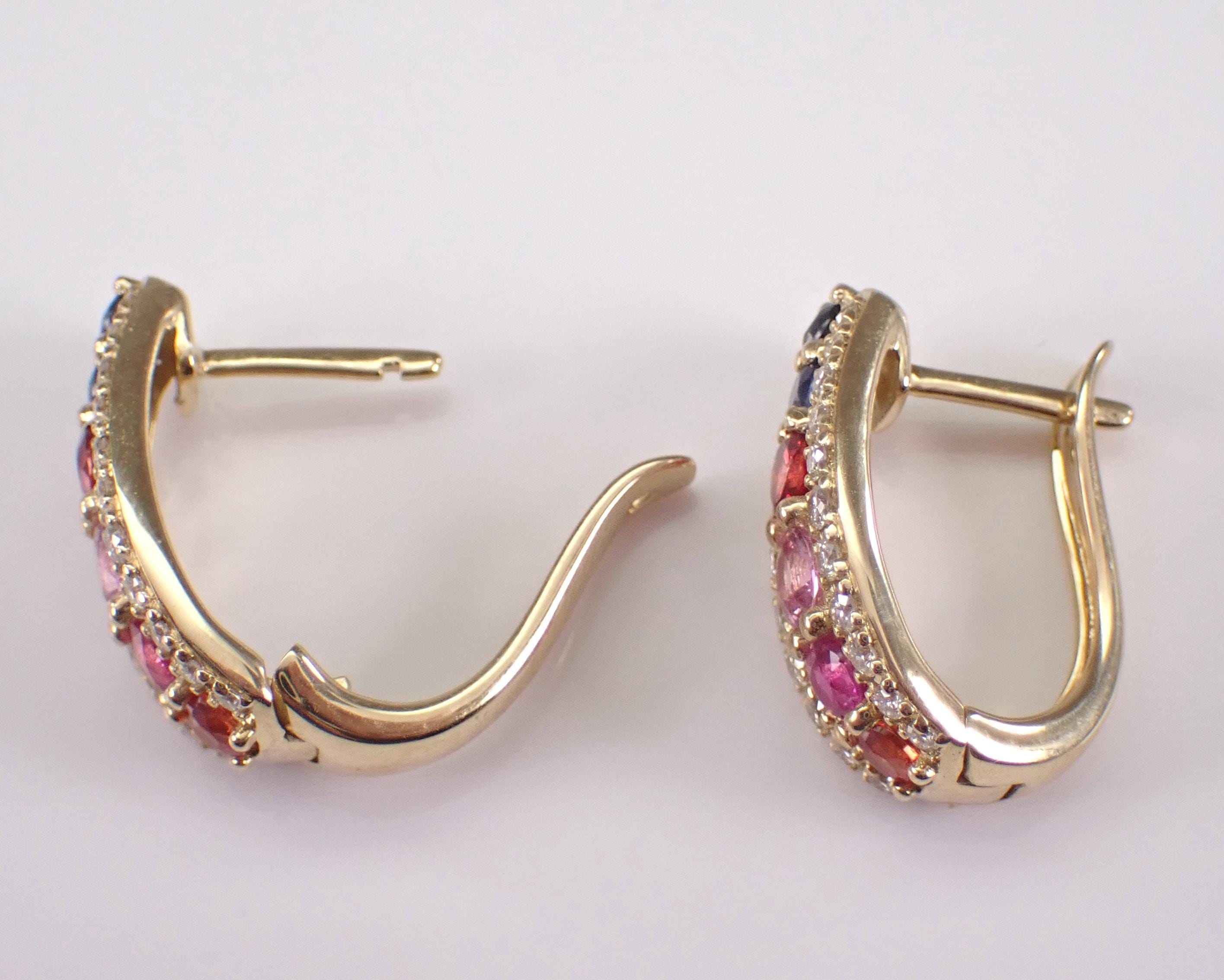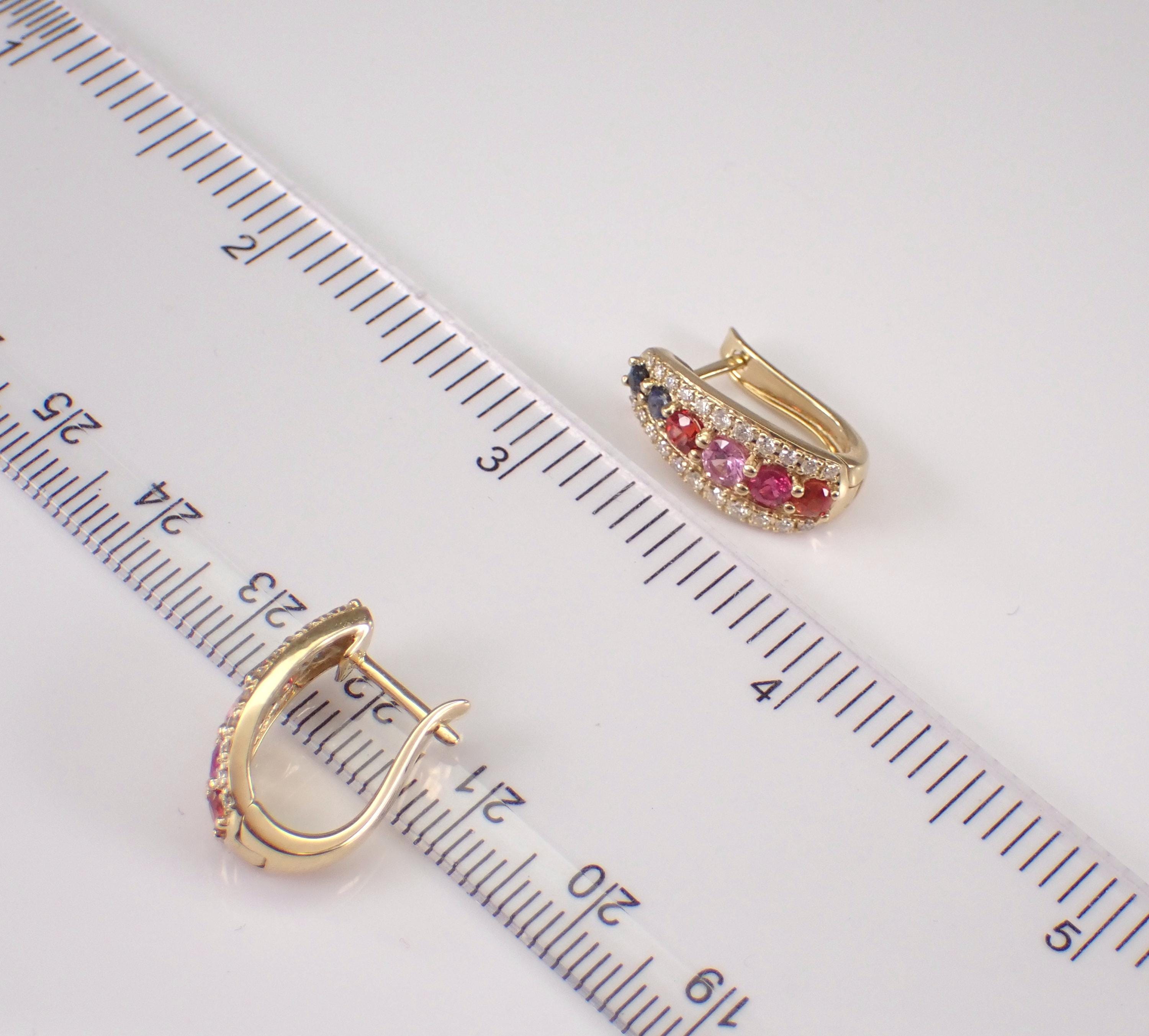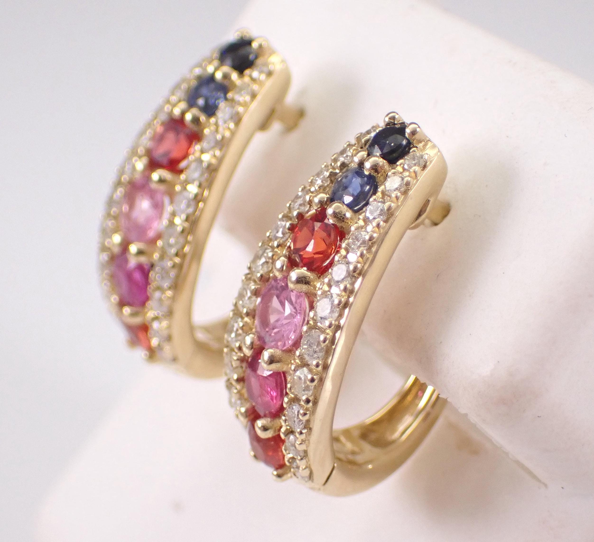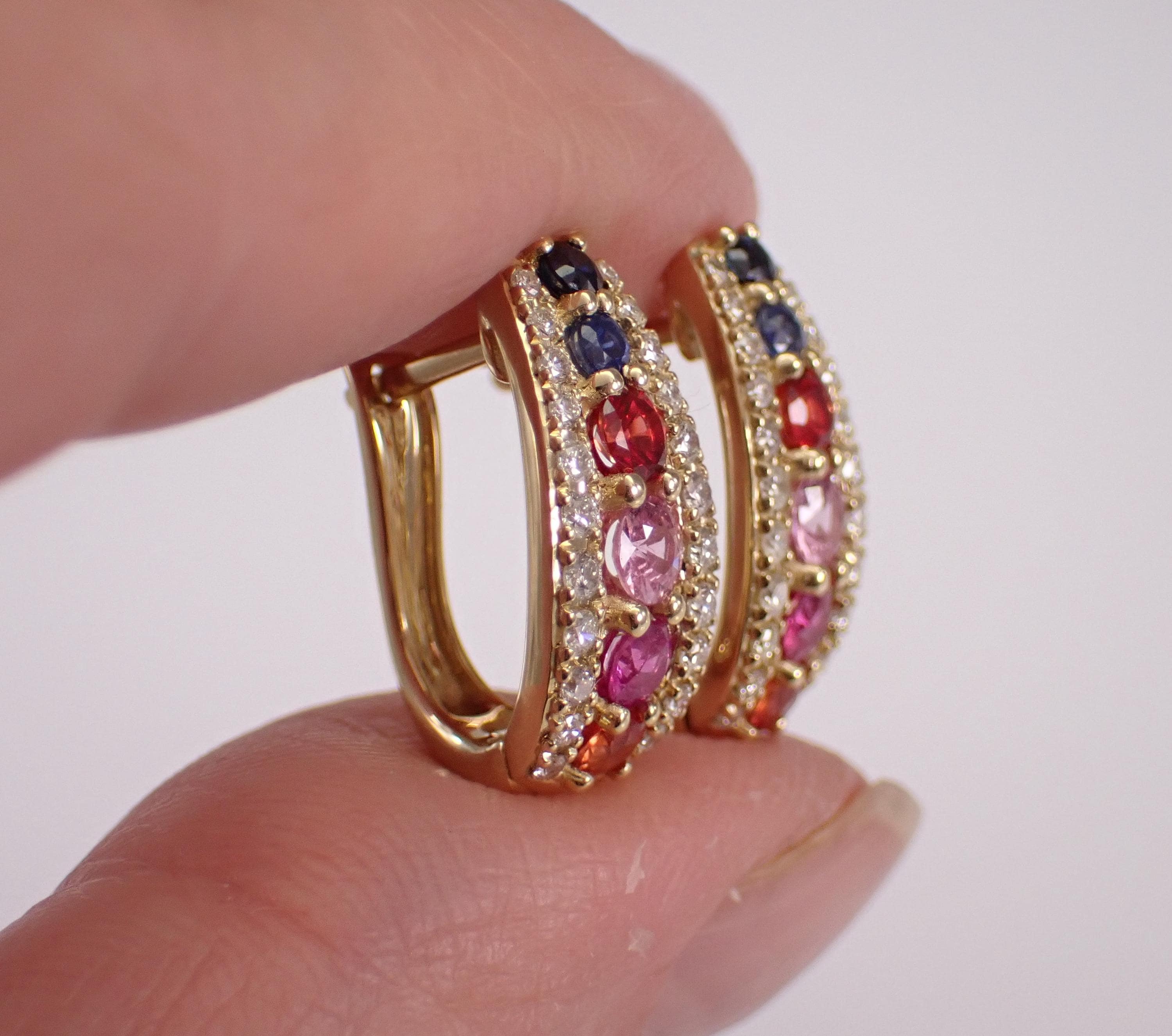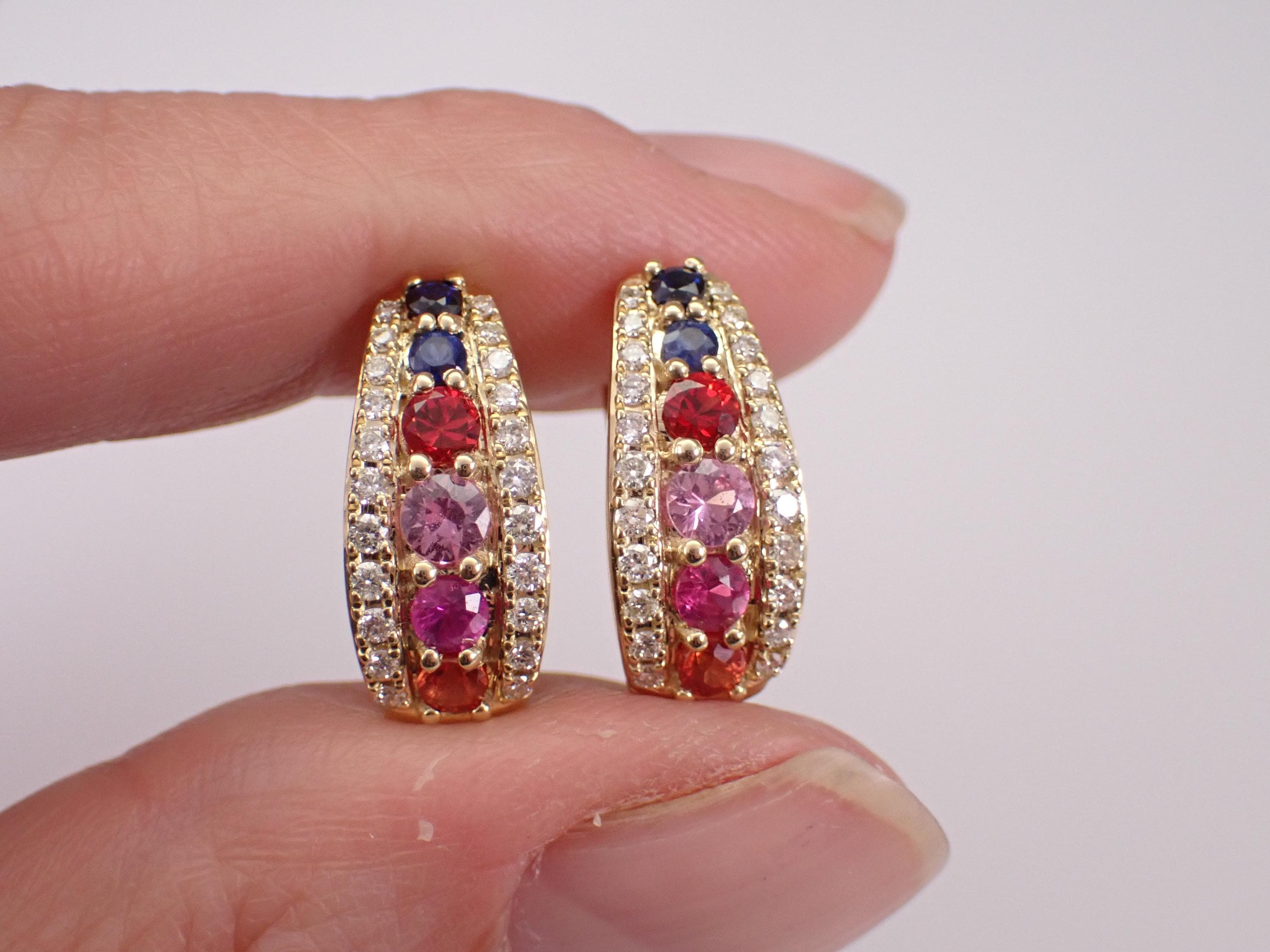 14K Yellow Gold Multi Color Sapphire and Diamond Hoop Earrings. These earrings are set with six natural round Colorful Sapphires in EACH earring. The Sapphires range in color from Orange, Pink, Red and Blue and amount to a total weight of 1 carat. There are twenty-two genuine Round Brilliant Diamonds set in EACH earring. These diamonds are H color, SI clarity and weigh a total of 1/2 carat. These earrings are 14K Yellow Gold and weigh a total of 5.6 grams. These earrings are for pierced ears and measure 18 mm in length. These earrings will be accompanied by an appraisal written by a GIA Certified Diamond Grader with the retail replacement value of $4,695.00. I will ship these earrings promptly in a gift box.