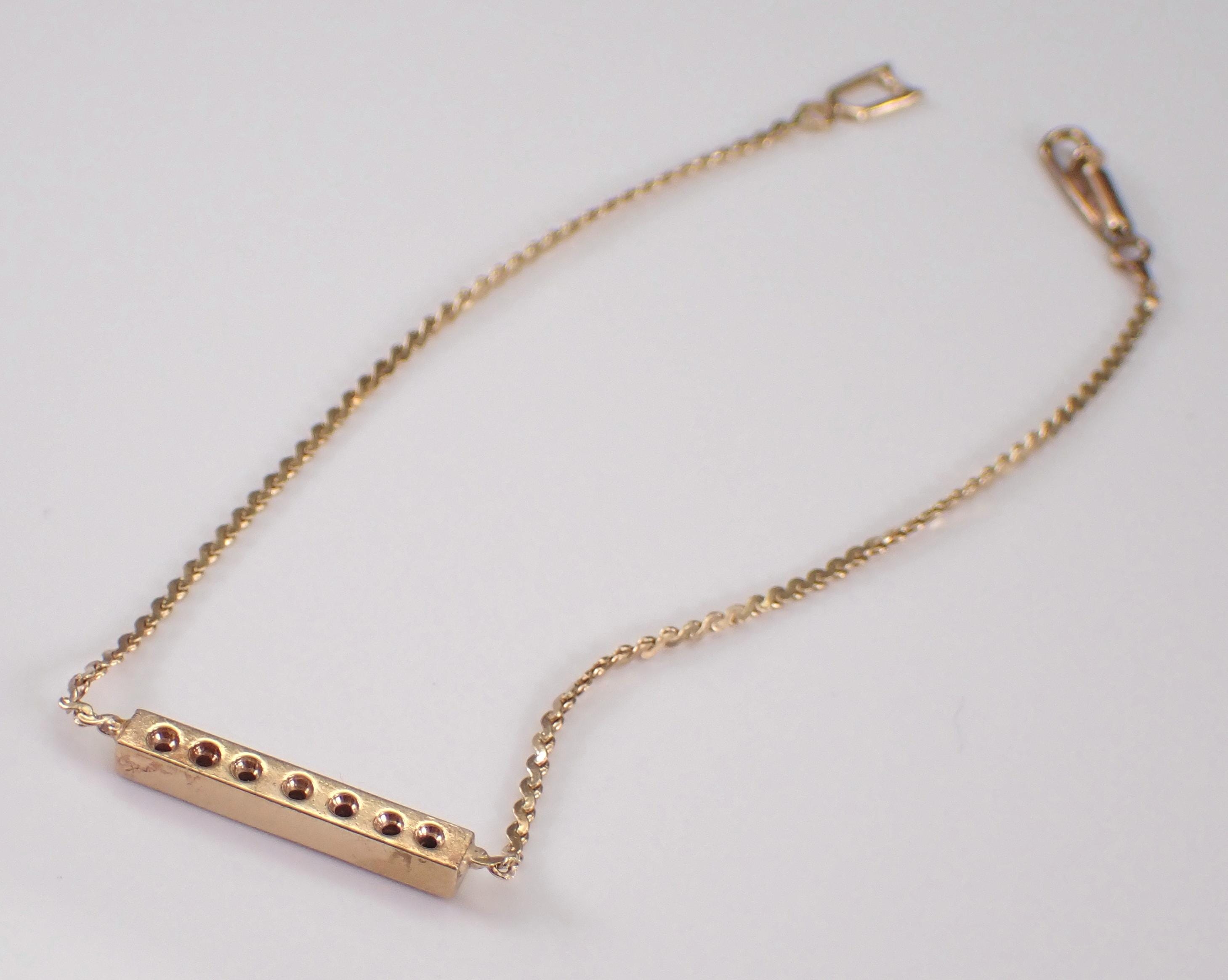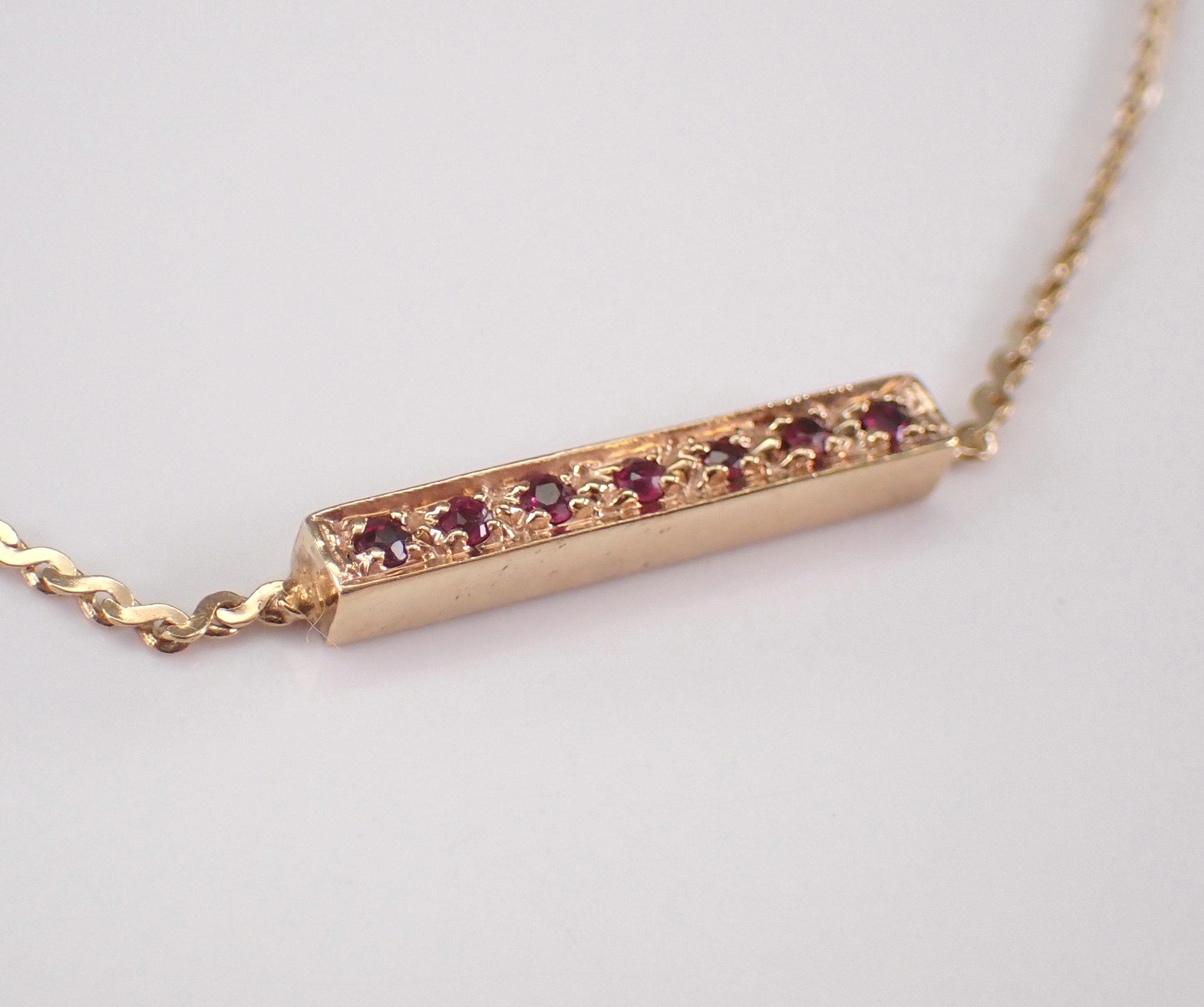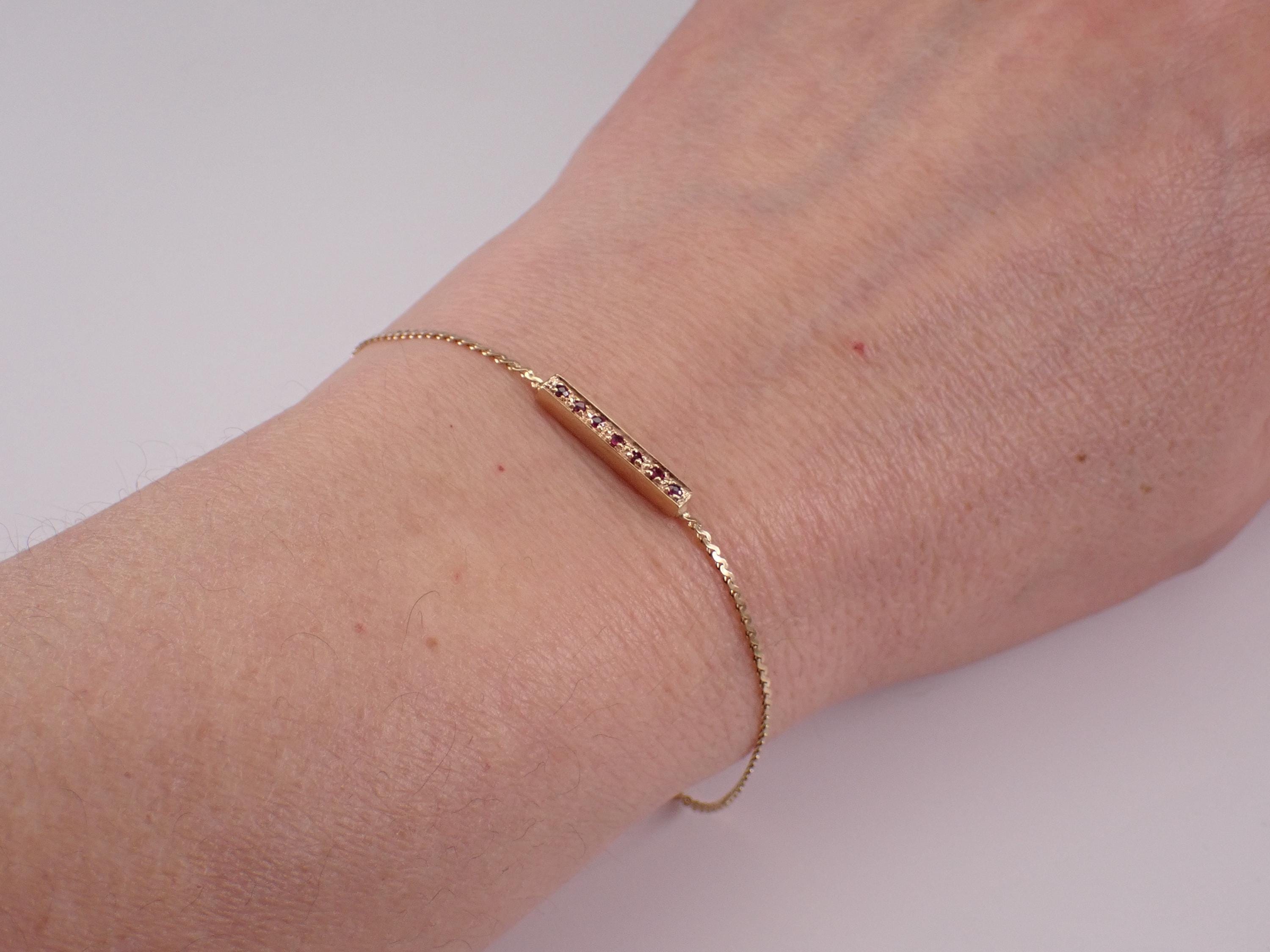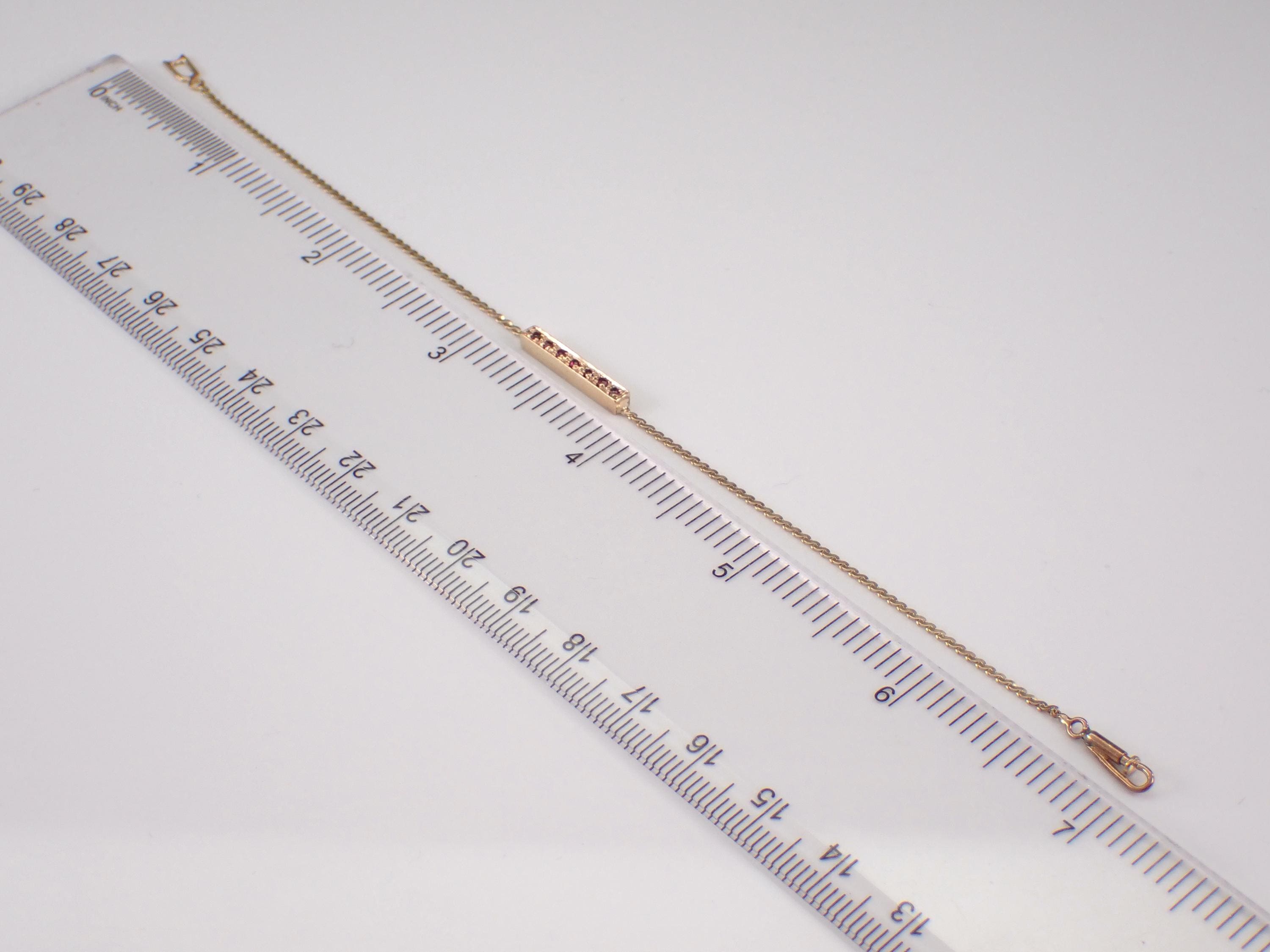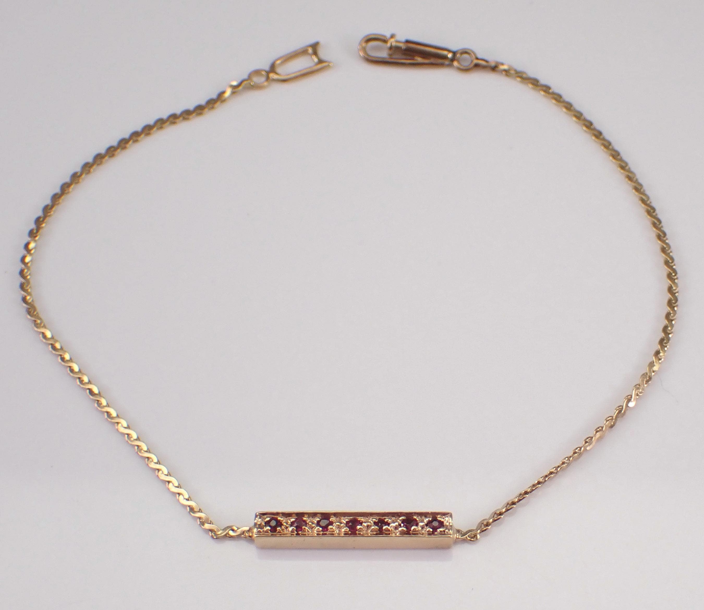 Vintage 14K Yellow Gold Ruby Bracelet. This bracelet is set with seven genuine Round Rubies. These rubies weigh a total of .10 carats. This bracelet is 14K Yellow Gold, weighs 2.1 grams and measures 7" in length. This bracelet has a unique secure Albert style clasp. I will ship this bracelet promptly in a gift box.