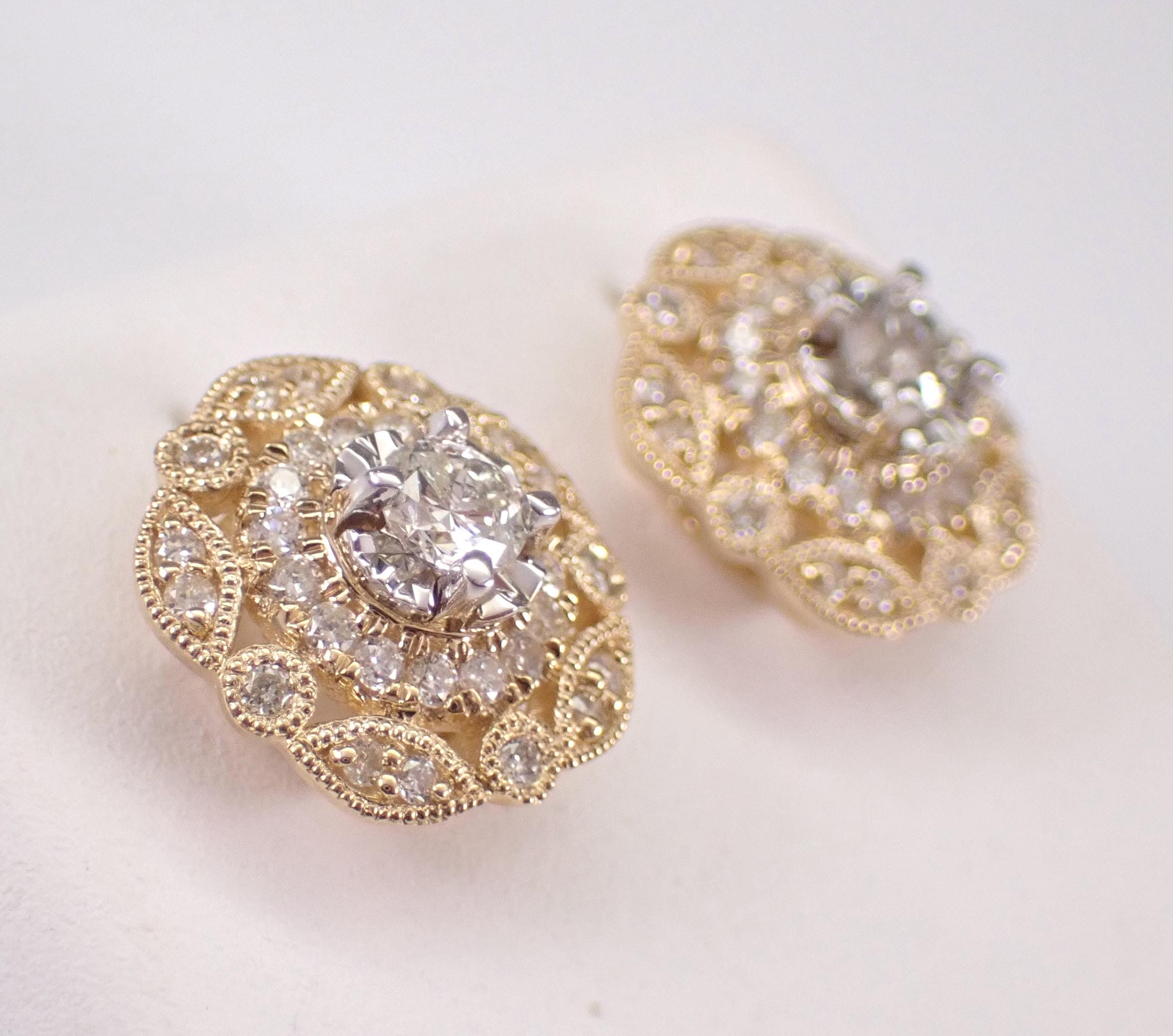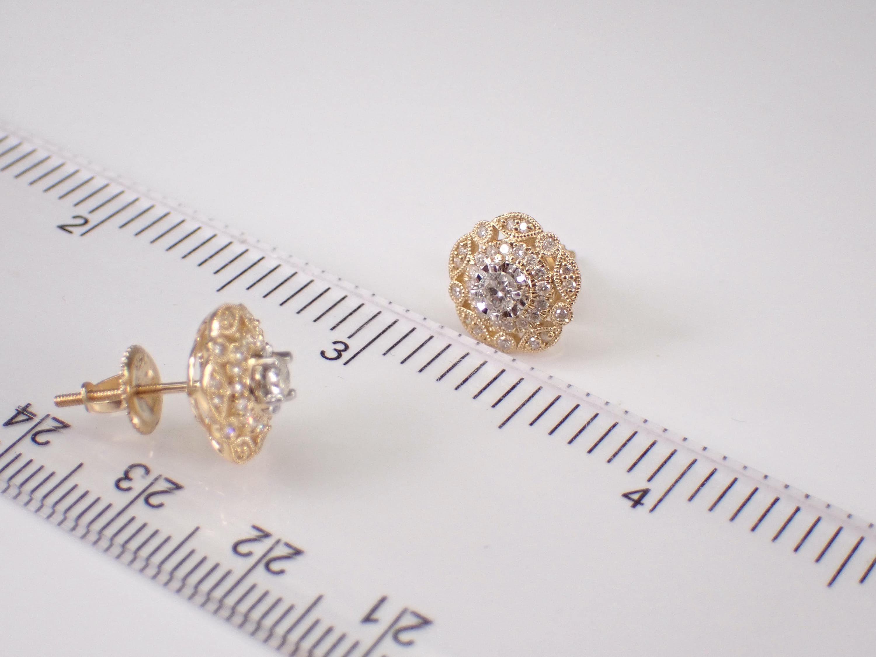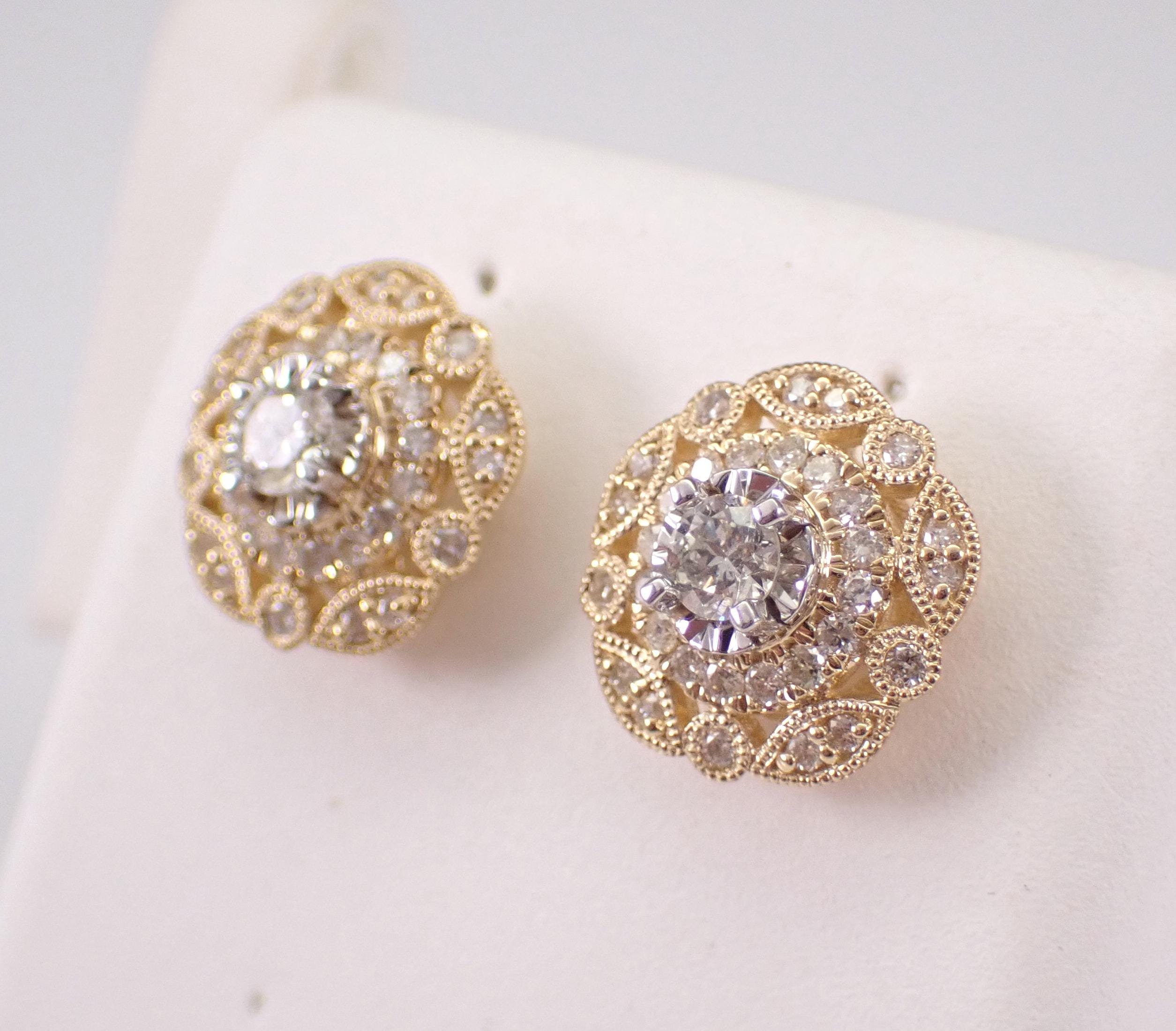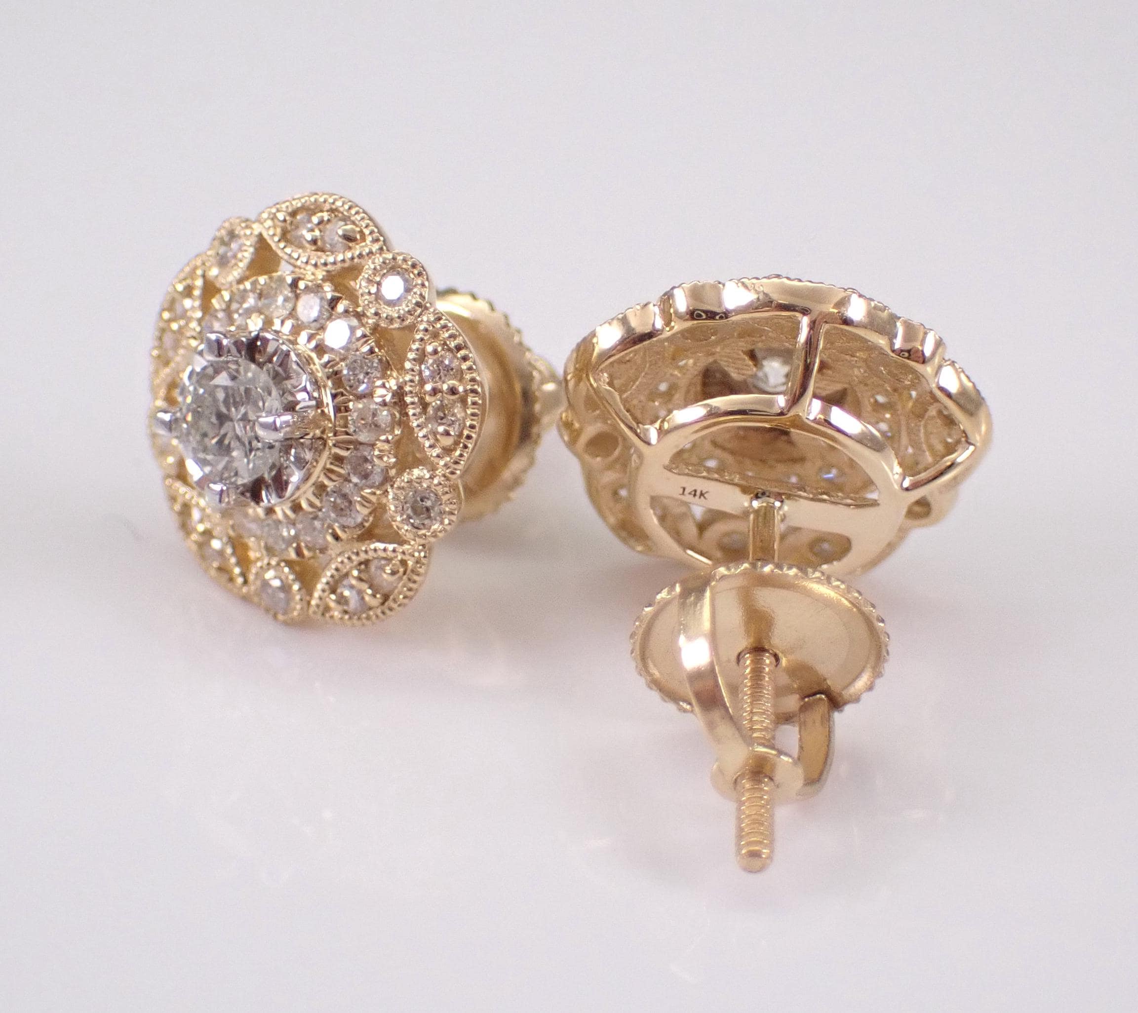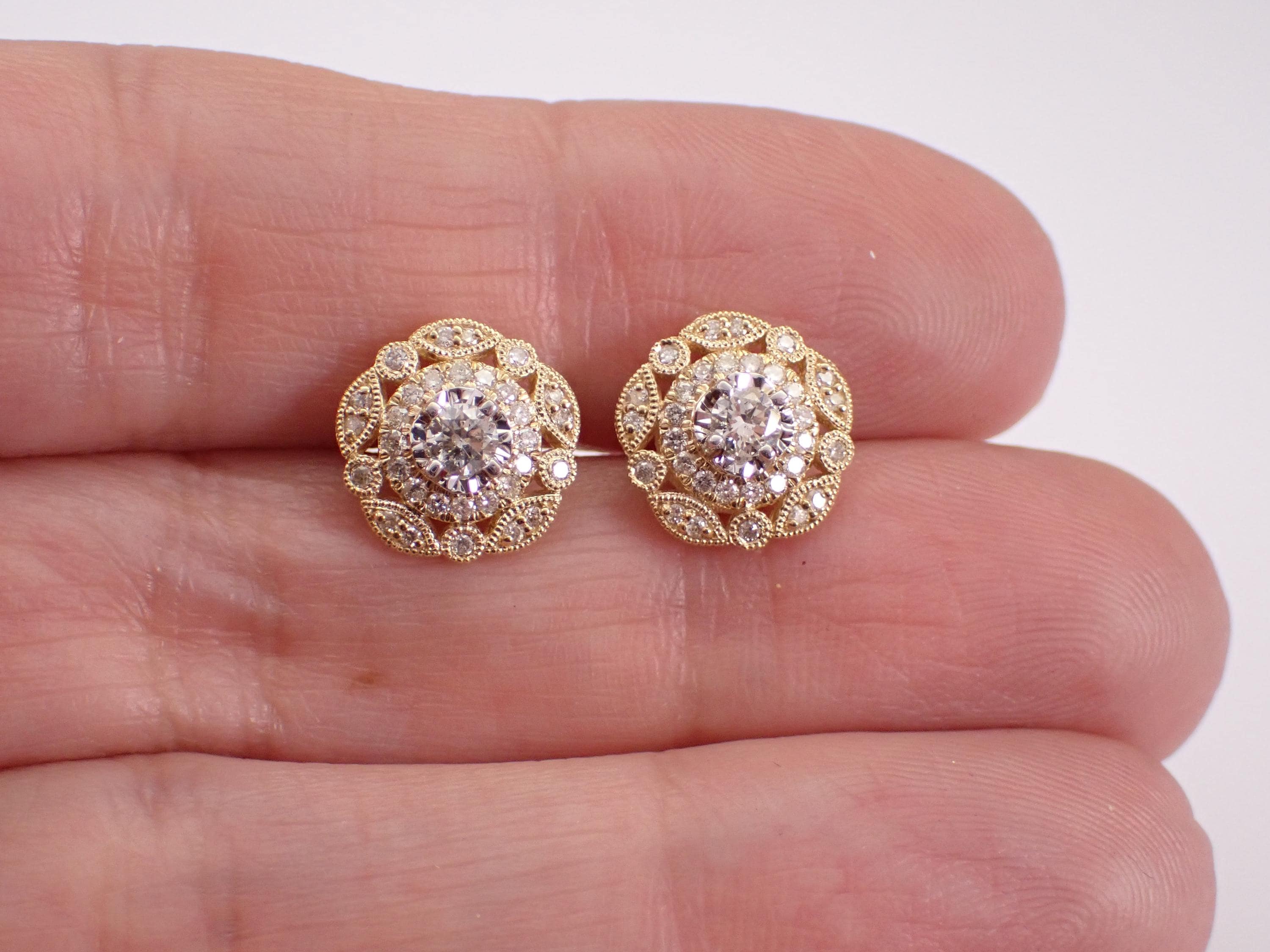 14K Yellow Gold Diamond Stud Earrings. There are thirty-two natural Round Brilliant Diamonds set in EACH earring. These diamonds are H color, SI clarity and weigh a total of .65 carat. These earrings are 14KT Yellow Gold and weigh a total of 2.4 grams. These earrings are for pierced ears, measure 10.5 mm in diameter and have secure screw back posts for pierced ears. These earrings will be accompanied by an appraisal written by a GIA Certified Diamond Grader with the retail replacement value of $2,985.00. I will ship these earrings promptly in a gift box.