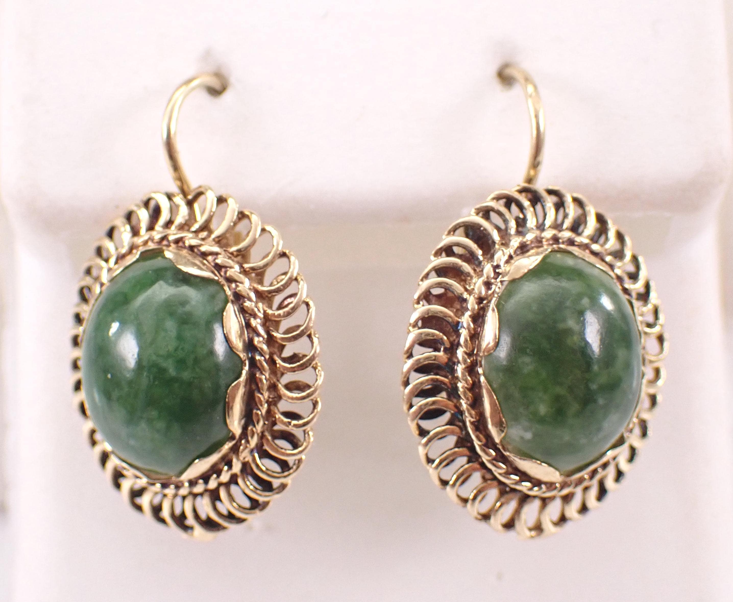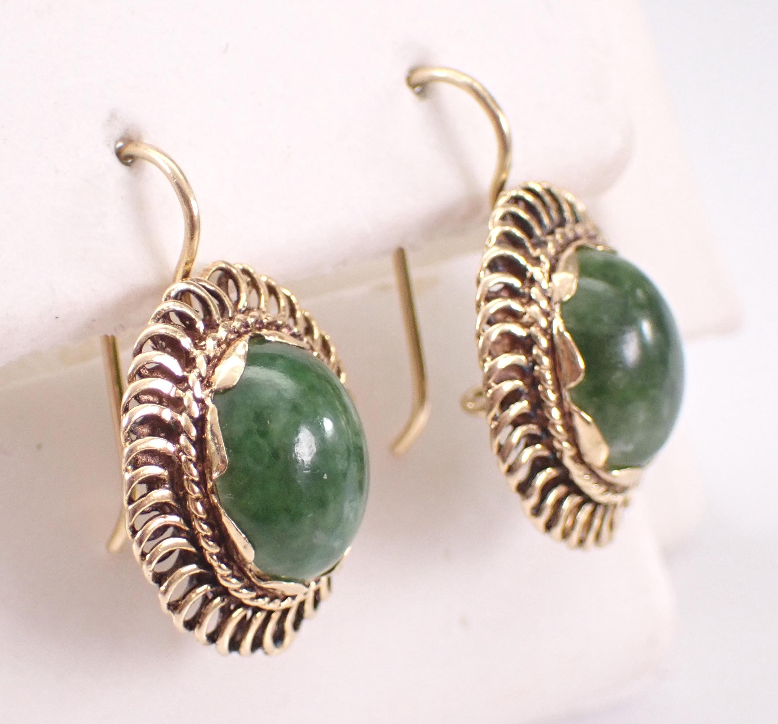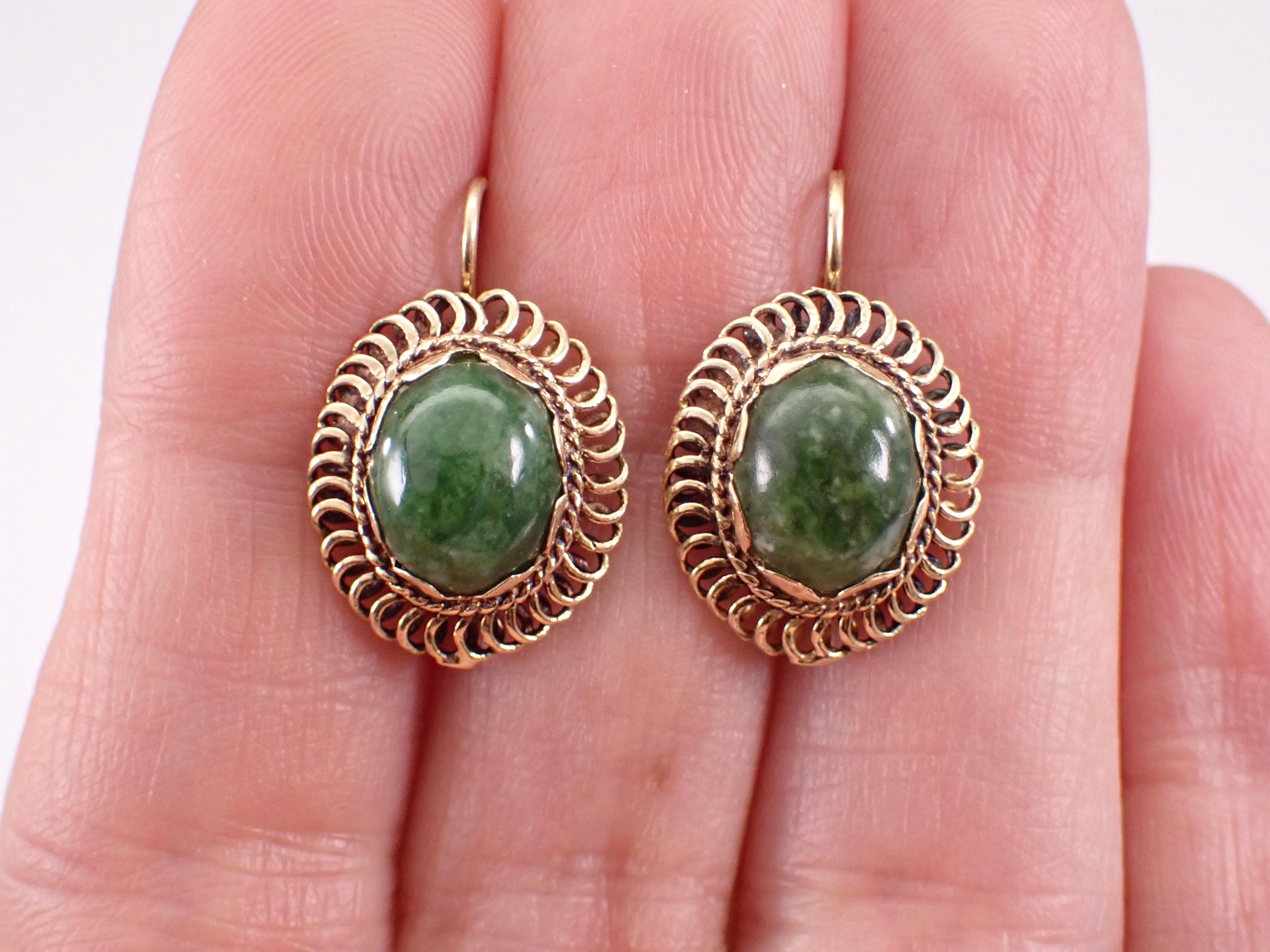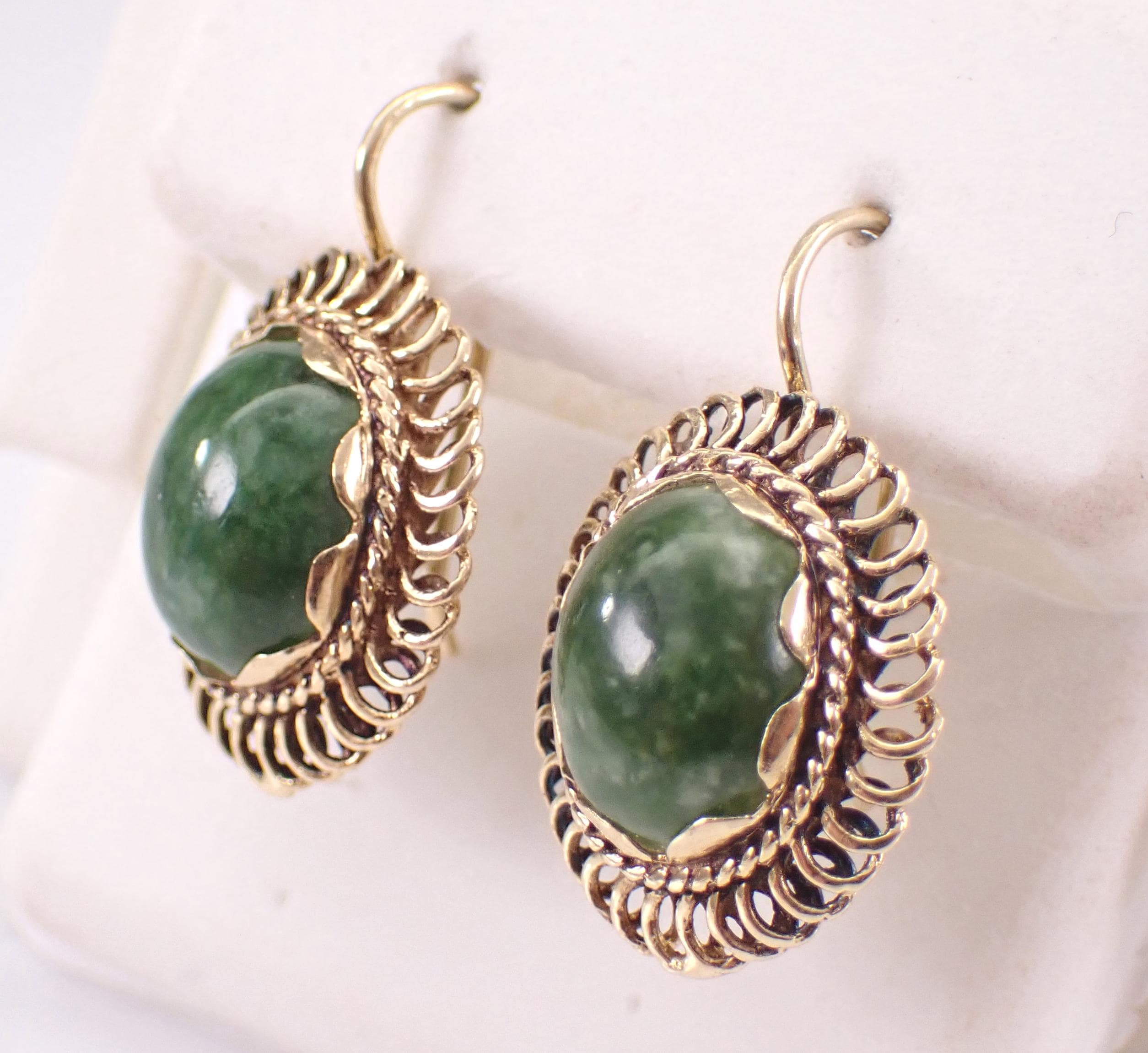 Vintage 14K Yellow Gold Jade Earrings. These earrings are set with one Oval Jade in each earring. The Jade is a beautiful green color and measure 10 X 7 mm each. These earrings are 14KT Yellow Gold and weigh a total of 4.2 grams. These earrings are for pierced ears, measure 16 X 14 mm without the kidney wire. These earrings will be accompanied by an appraisal written for insurance and authentication purposes. I will ship these earrings promptly in a gift box.