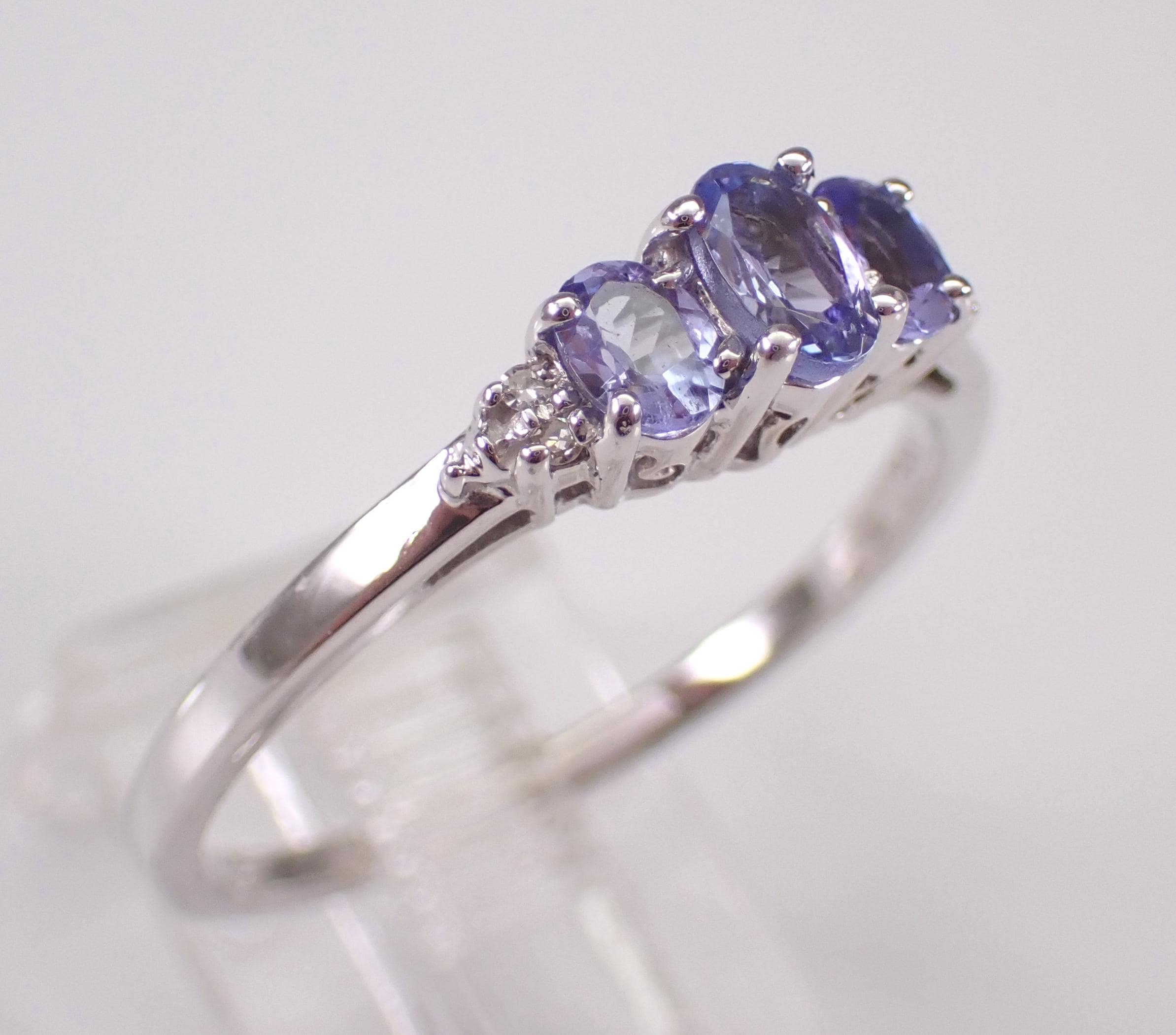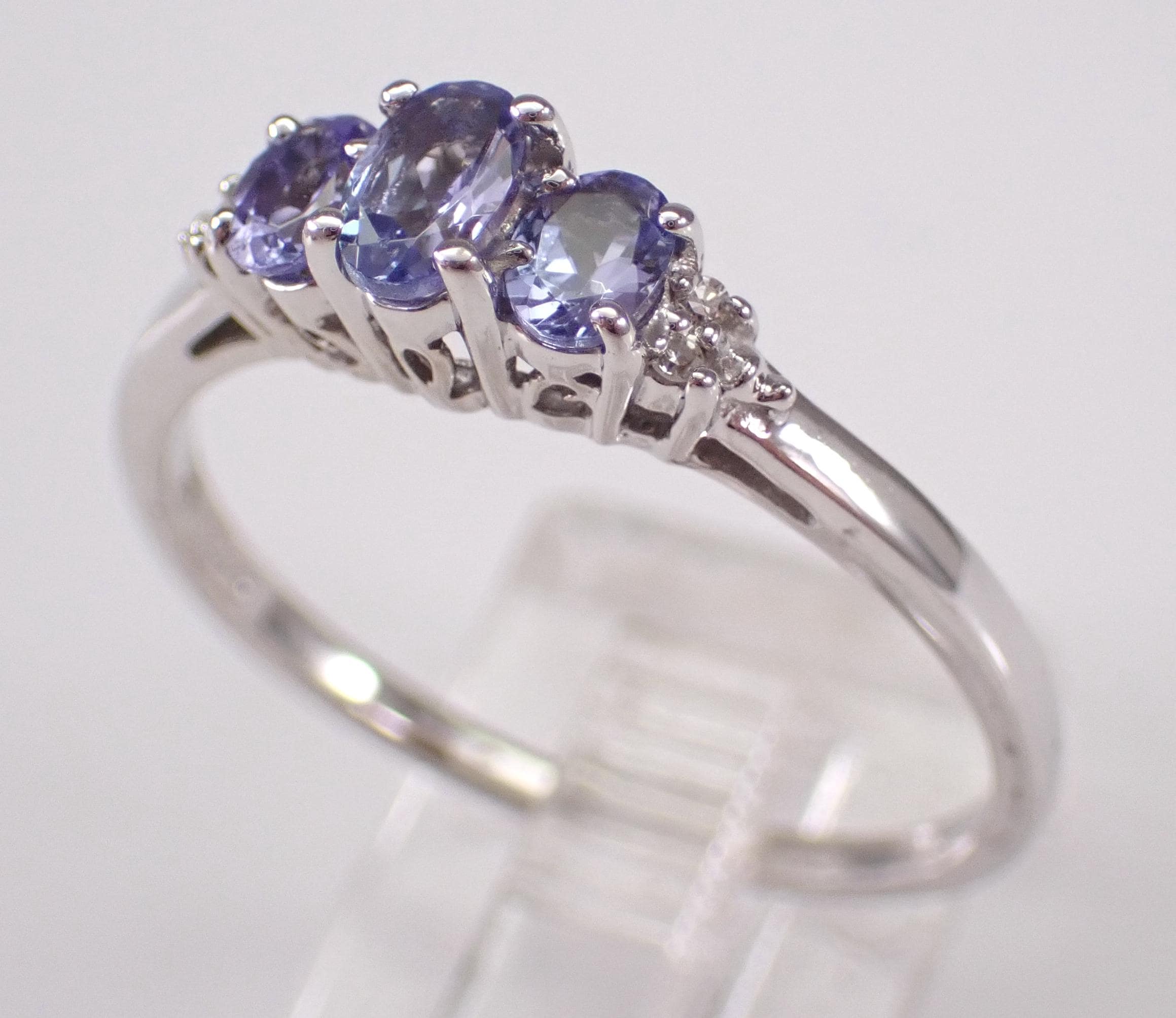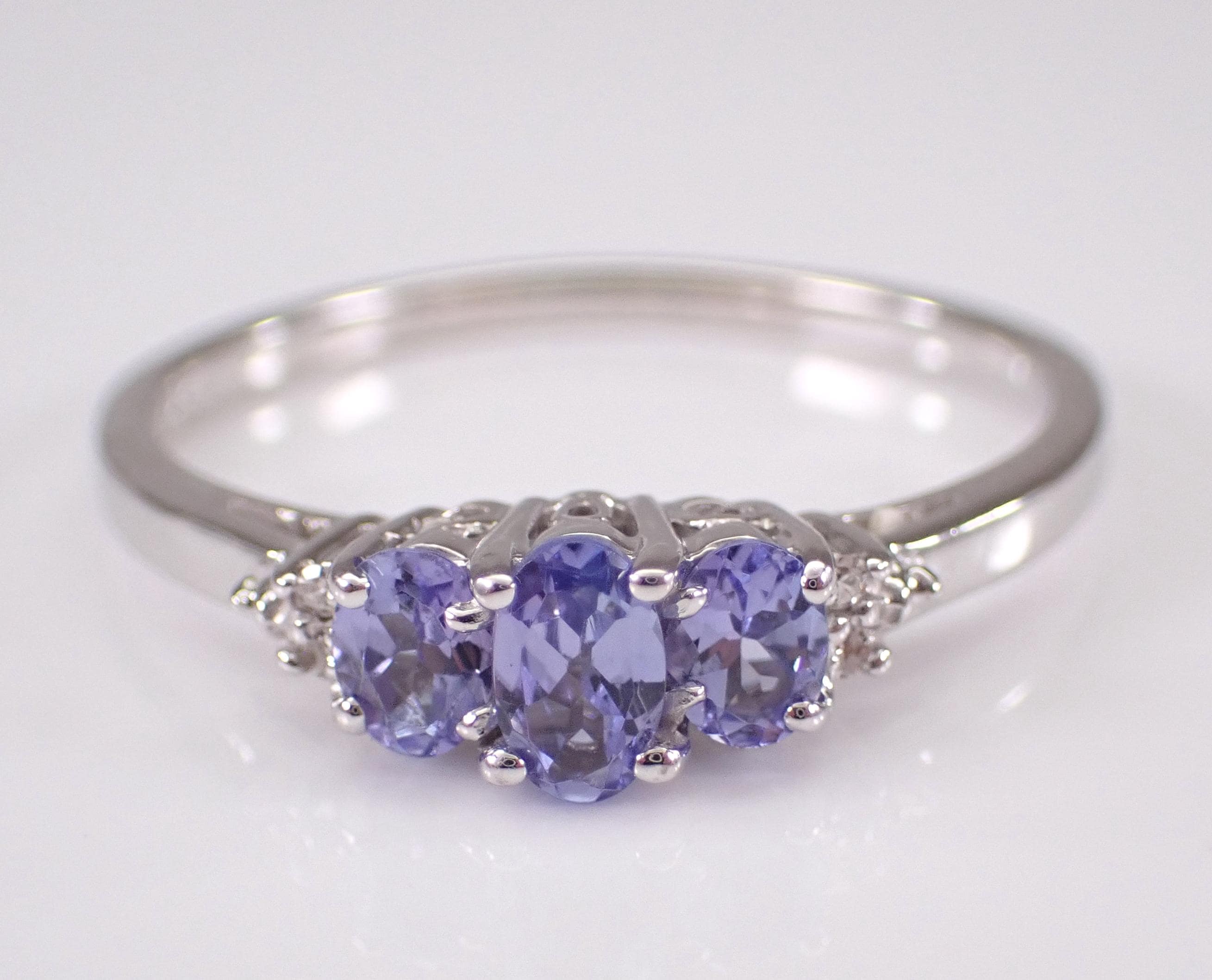 White Gold Diamond and Tanzanite three stone anniversary ring. This ring is set with three genuine Oval Tanzanite and four natural Round Diamonds. The diamonds in this ring are H color, SI1 clarity and weigh a total of .03 carat. The center Tanzanite measures 5 X 3 mm and the two side Tanzanite measure 4 X 3 mm each. These gemstones combine to a total weight of .65 carat. This ring is 10KT White Gold, weighs 2.1 grams and is a finger size 10, can be resized free of charge (please inquire about sizing with the finger size you need). I will ship this ring promptly in a beautiful gift box.