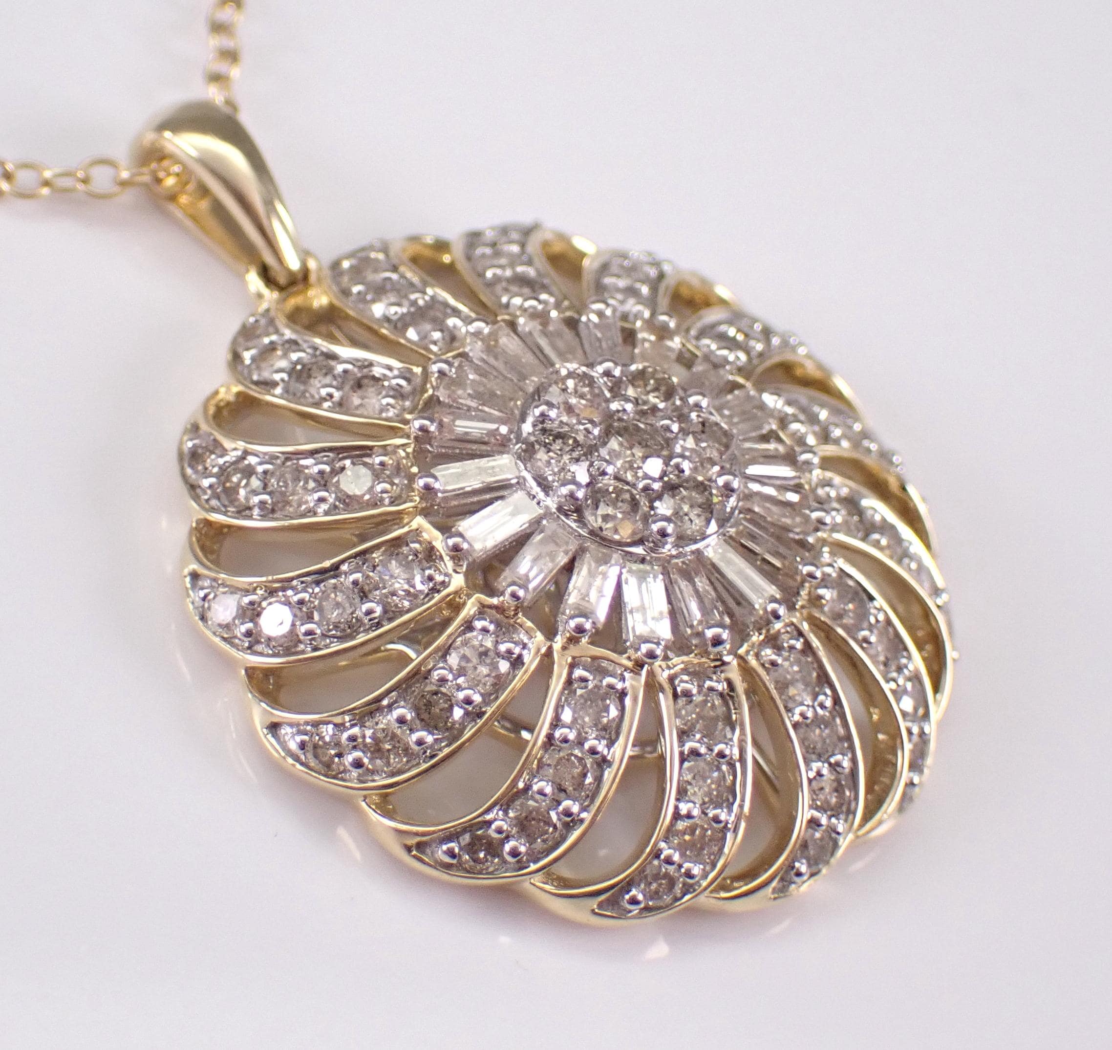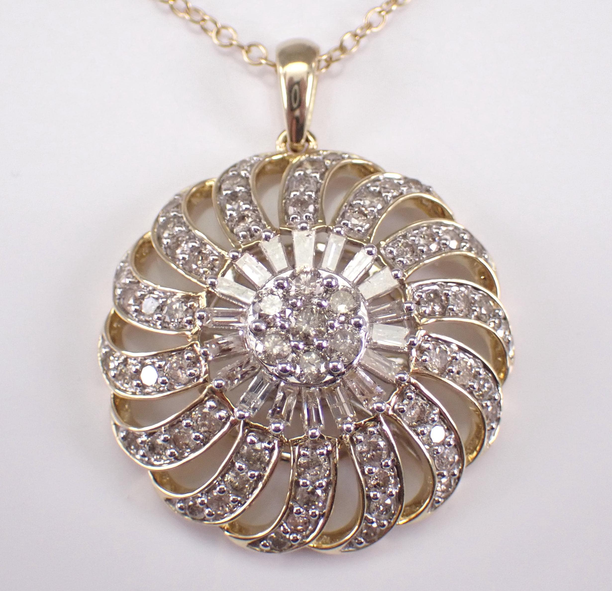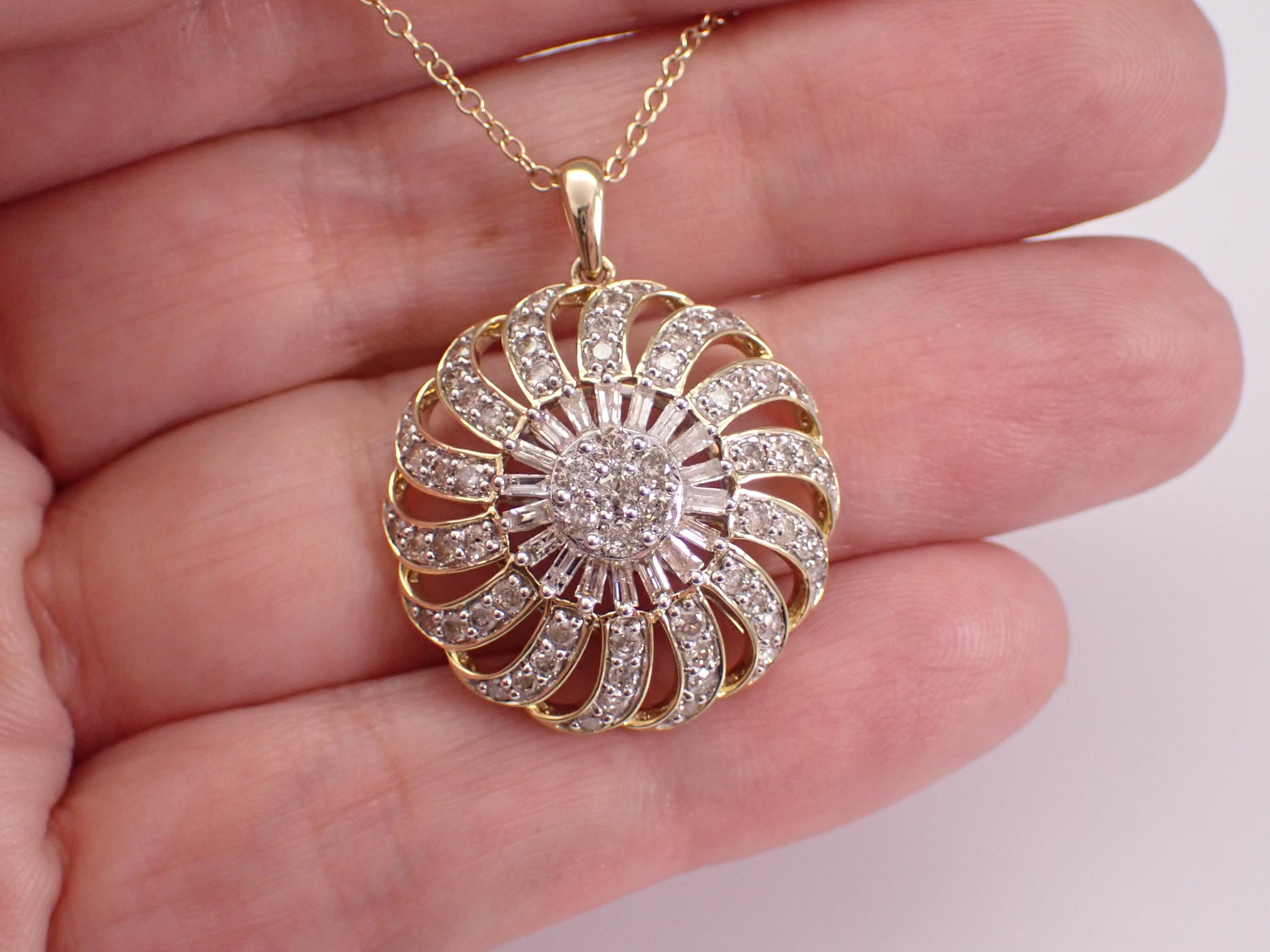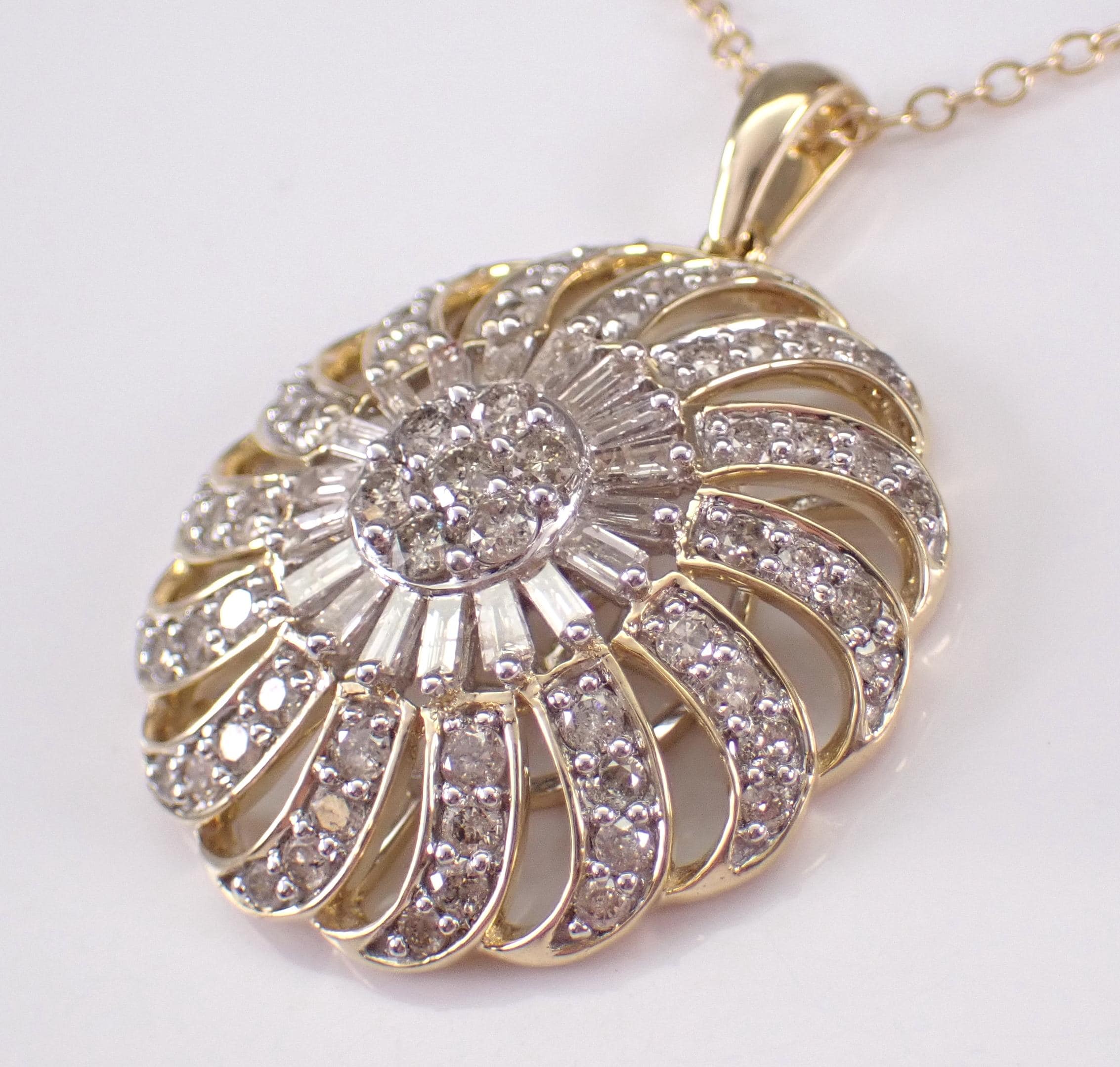 Yellow Gold Diamond Flower Pendant Necklace. This pendant is set with sixty-three genuine natural round brilliant diamonds and eighteen baguette diamonds. These diamonds are J color, I1 clarity and weigh a total of 1.53 carats. This pendant is 10KT Yellow Gold and comes with a 10KT Yellow Gold chain which measures 18" in length. Both the pendant and chain weigh a total of 5.8 grams and the pendant measures 23.5 mm in diameter. This necklace will be accompanied by an appraisal written by a GIA Certified Diamond Grader with the retail replacement value of $3,295.00. I will ship this necklace promptly in a beautiful gift box.