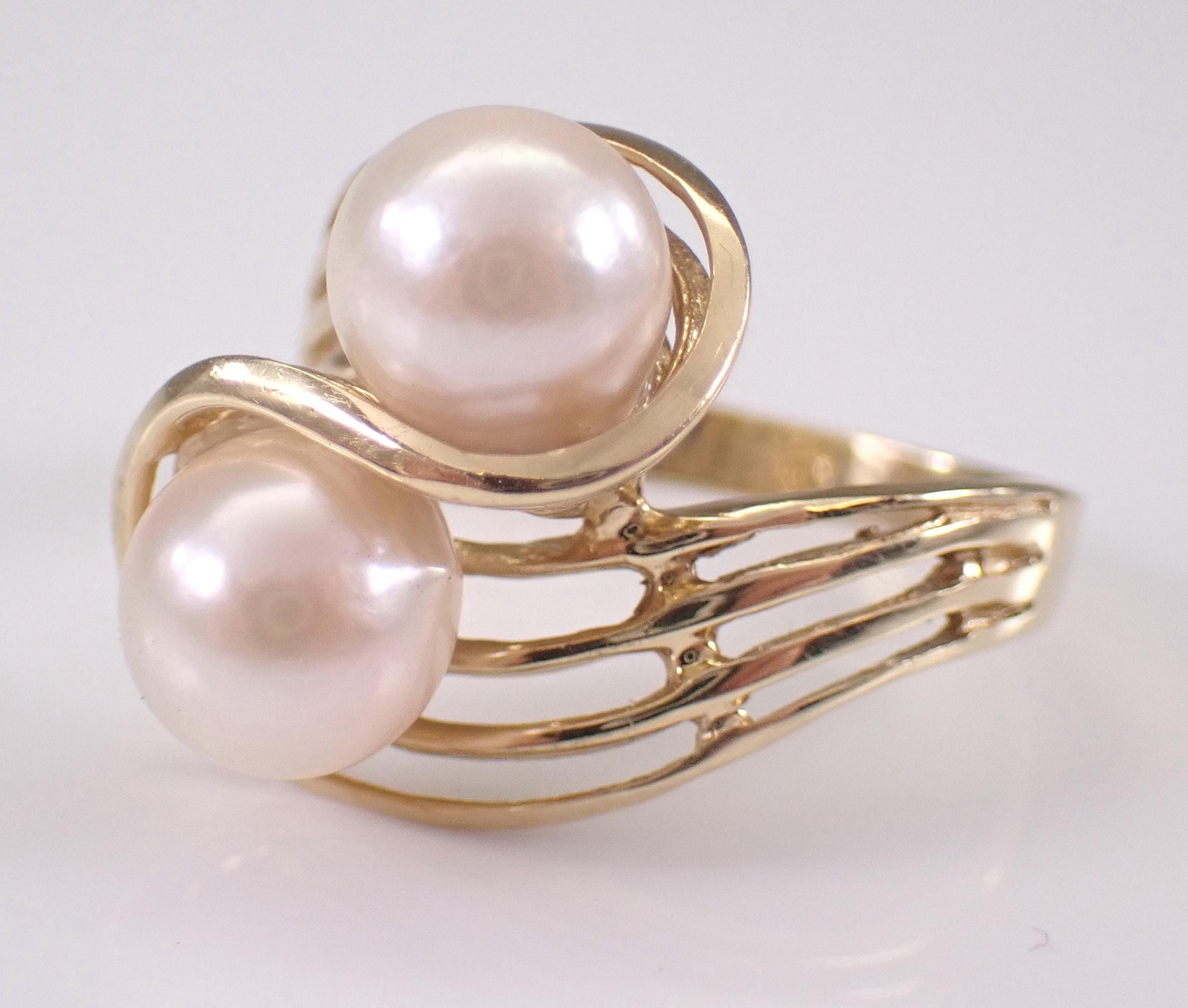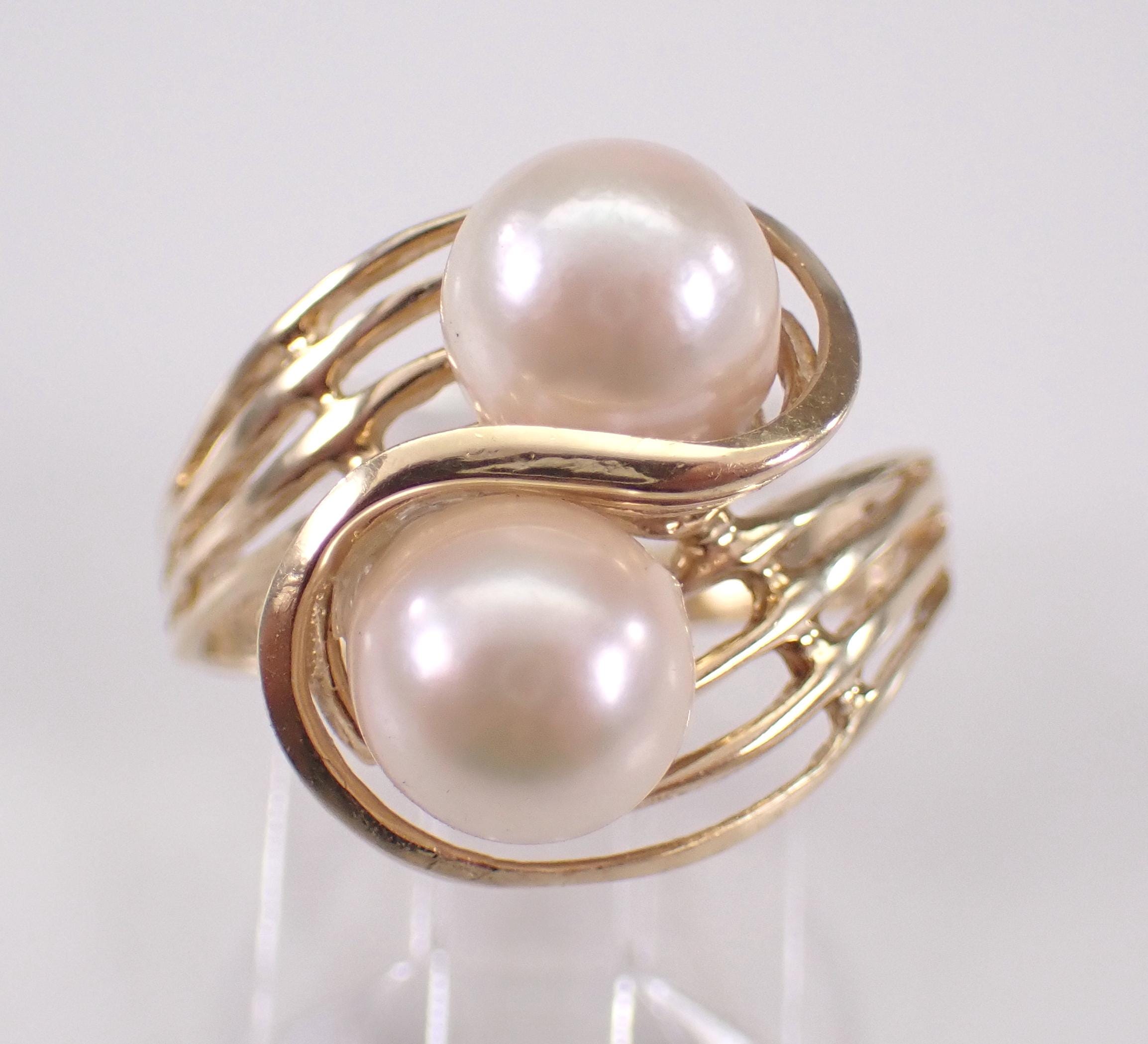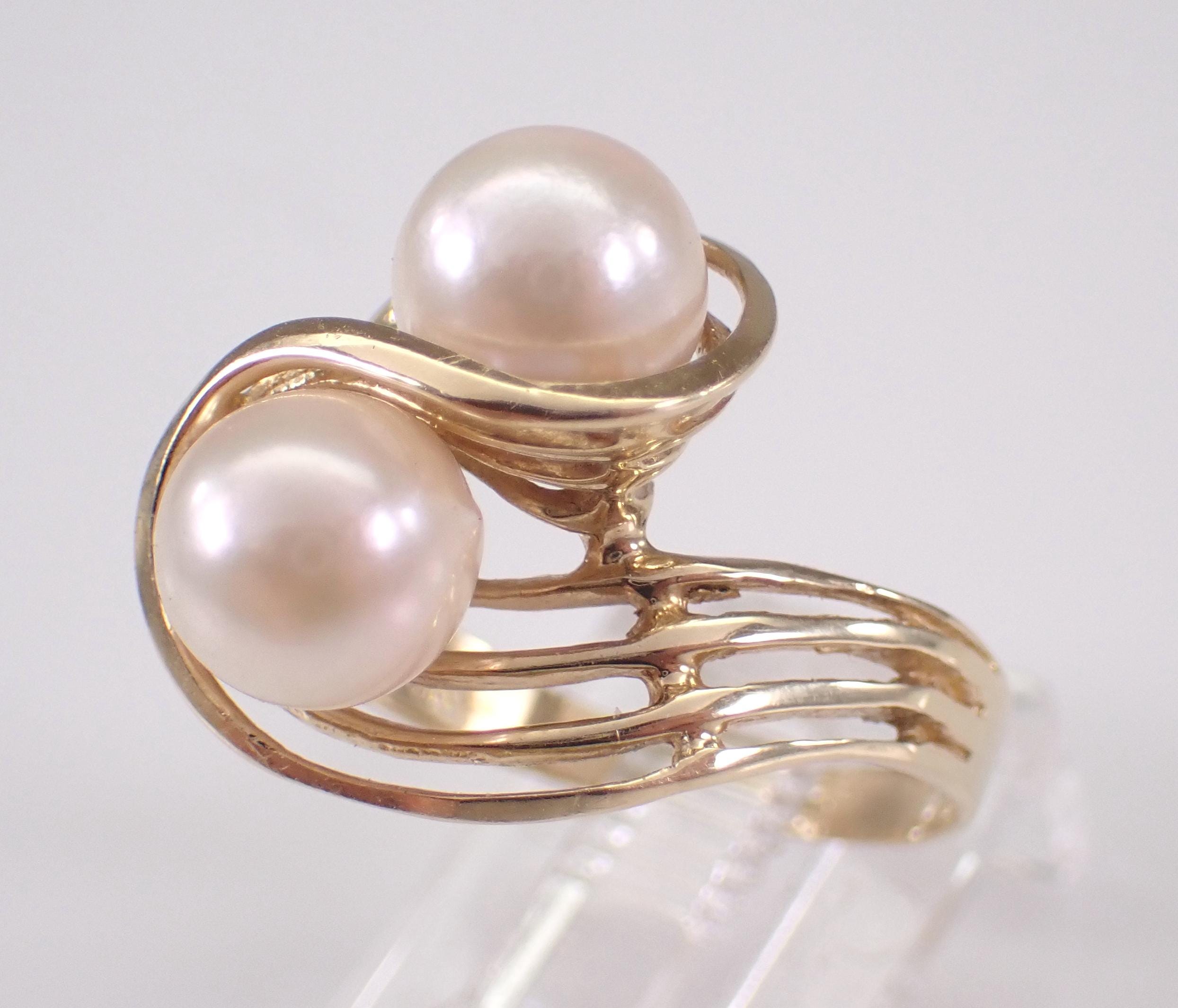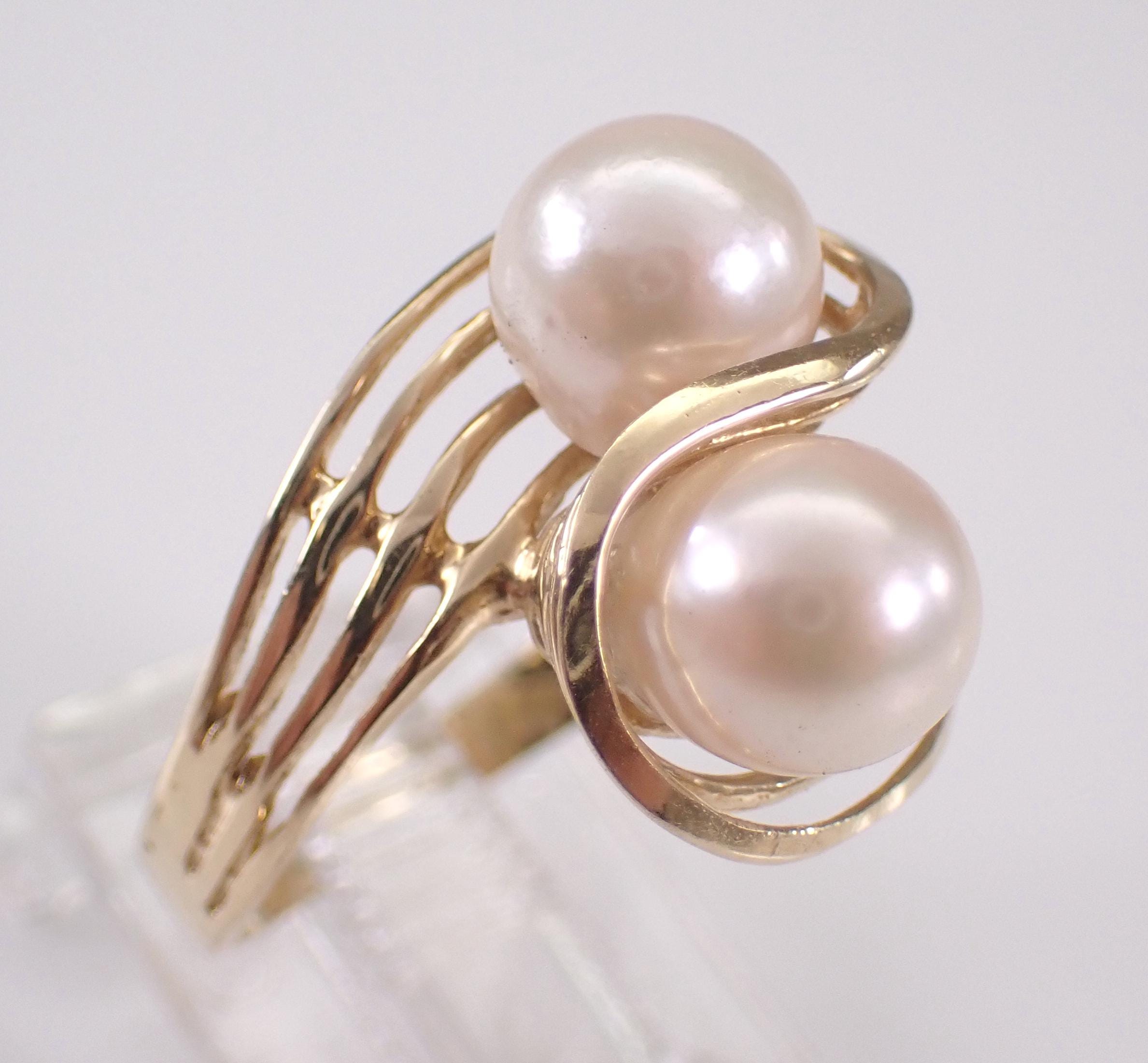 Vintage 14K Yellow Gold Pearl Ring. This ring is set with two Round White Cultured Pearls. The Pearls in this ring measure 7 mm in diameter each. This ring is 14KT Yellow gold, weighs 3.5 grams and is a finger size 7 1/4, can be resized (please inquire about sizing with the finger size that you need). I will ship this ring promptly in a beautiful gift box.