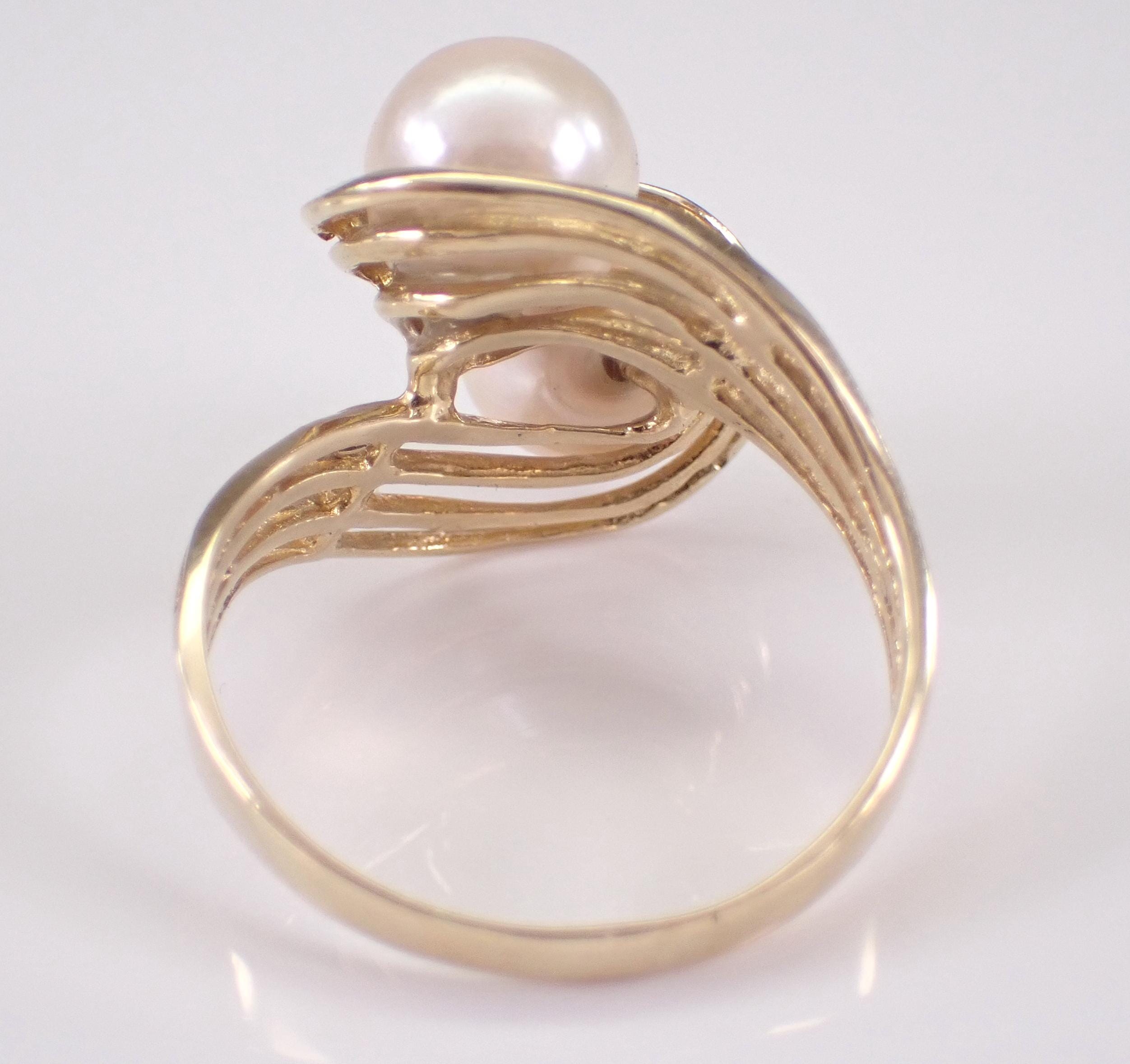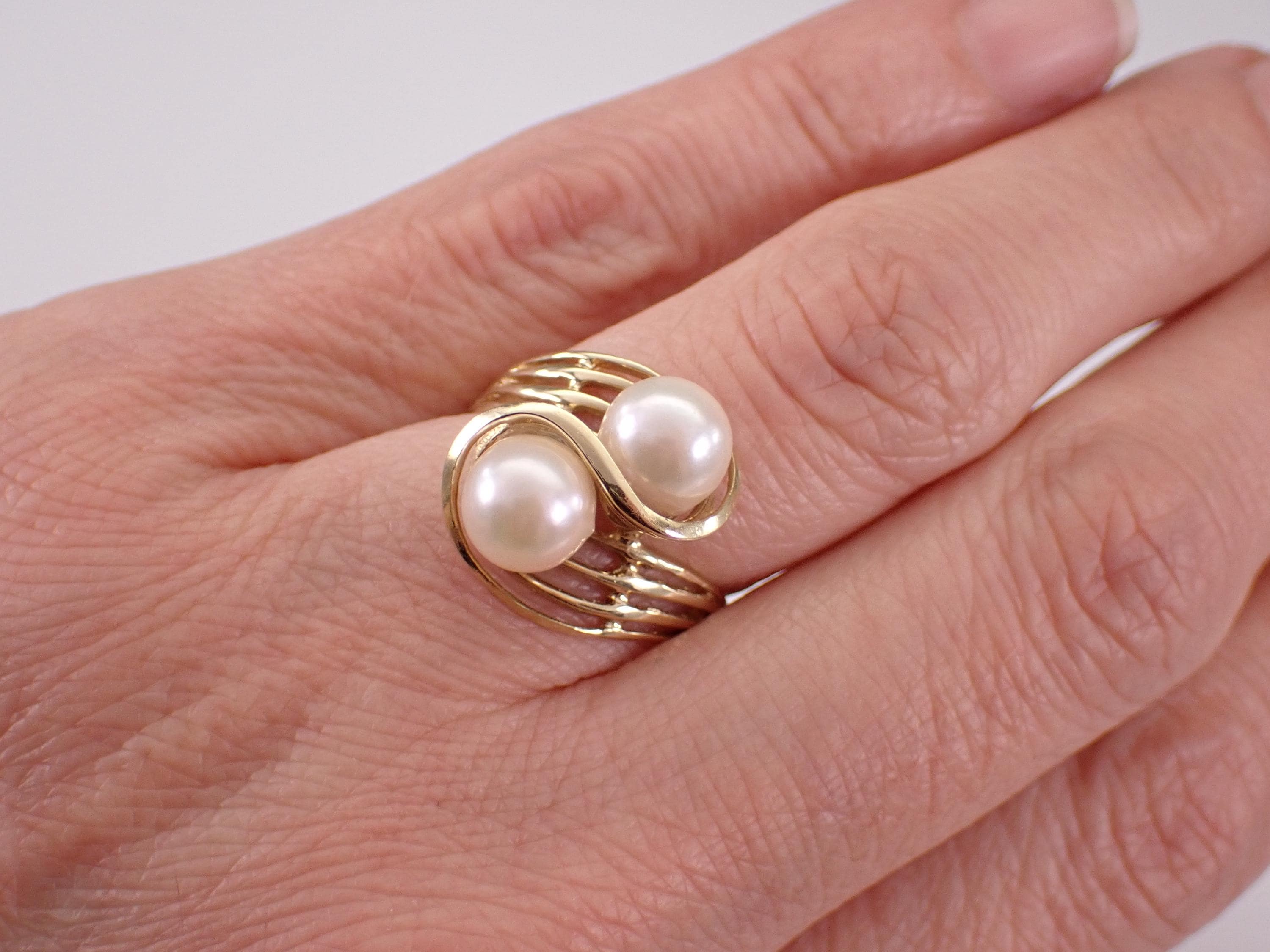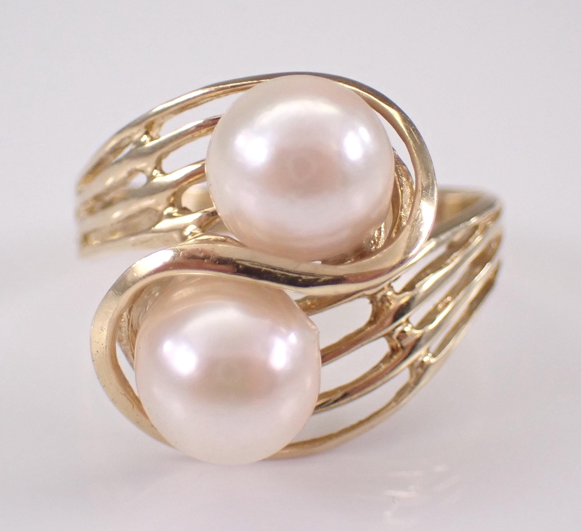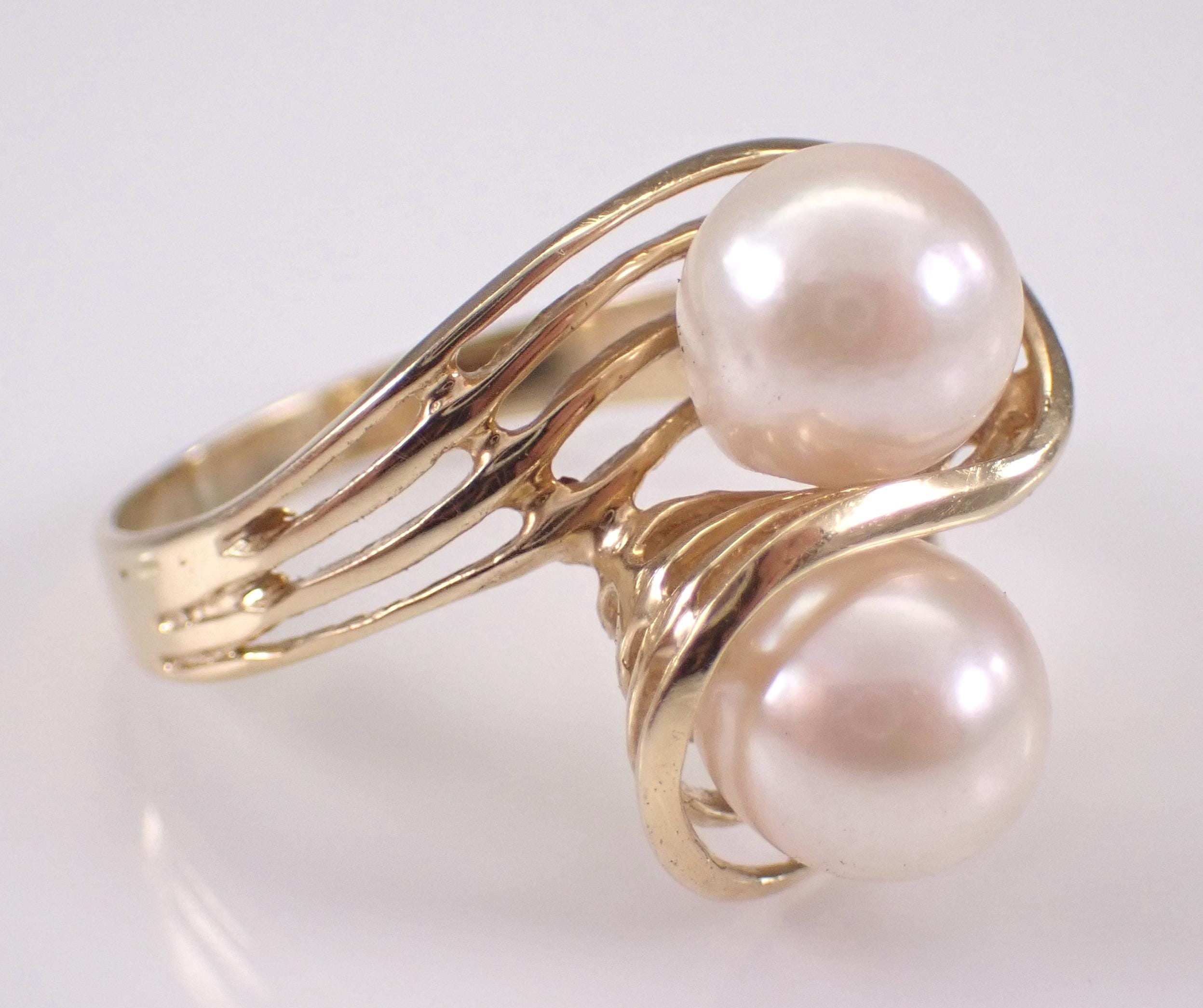 Vintage 14K Yellow Gold Pearl Ring. This ring is set with two Round White Cultured Pearls. The Pearls in this ring measure 7 mm in diameter each. This ring is 14KT Yellow gold, weighs 3.5 grams and is a finger size 7 1/4, can be resized (please inquire about sizing with the finger size that you need). I will ship this ring promptly in a beautiful gift box.