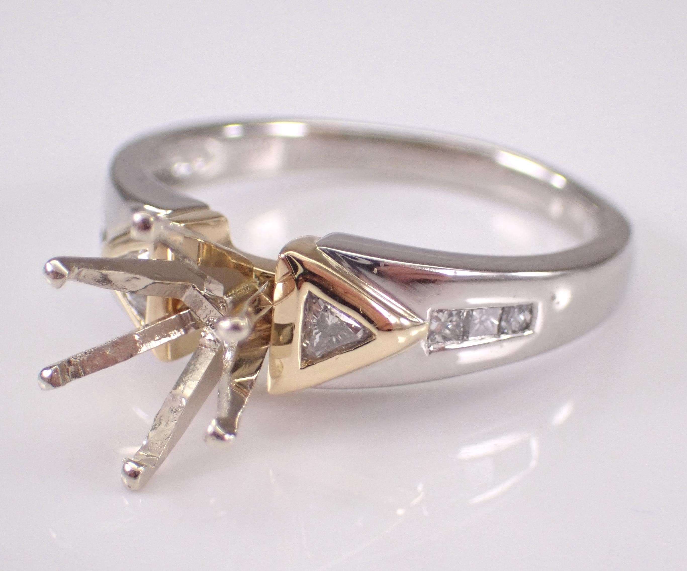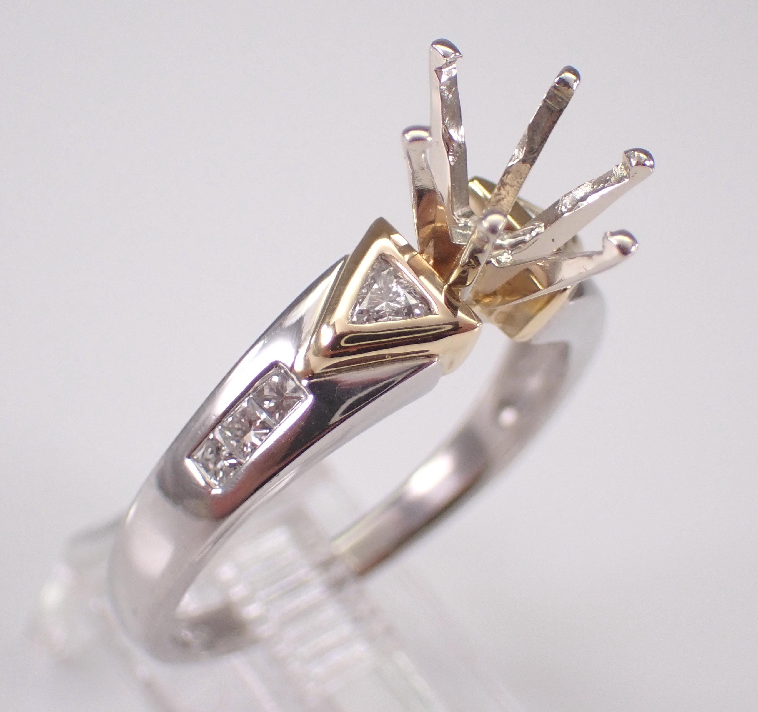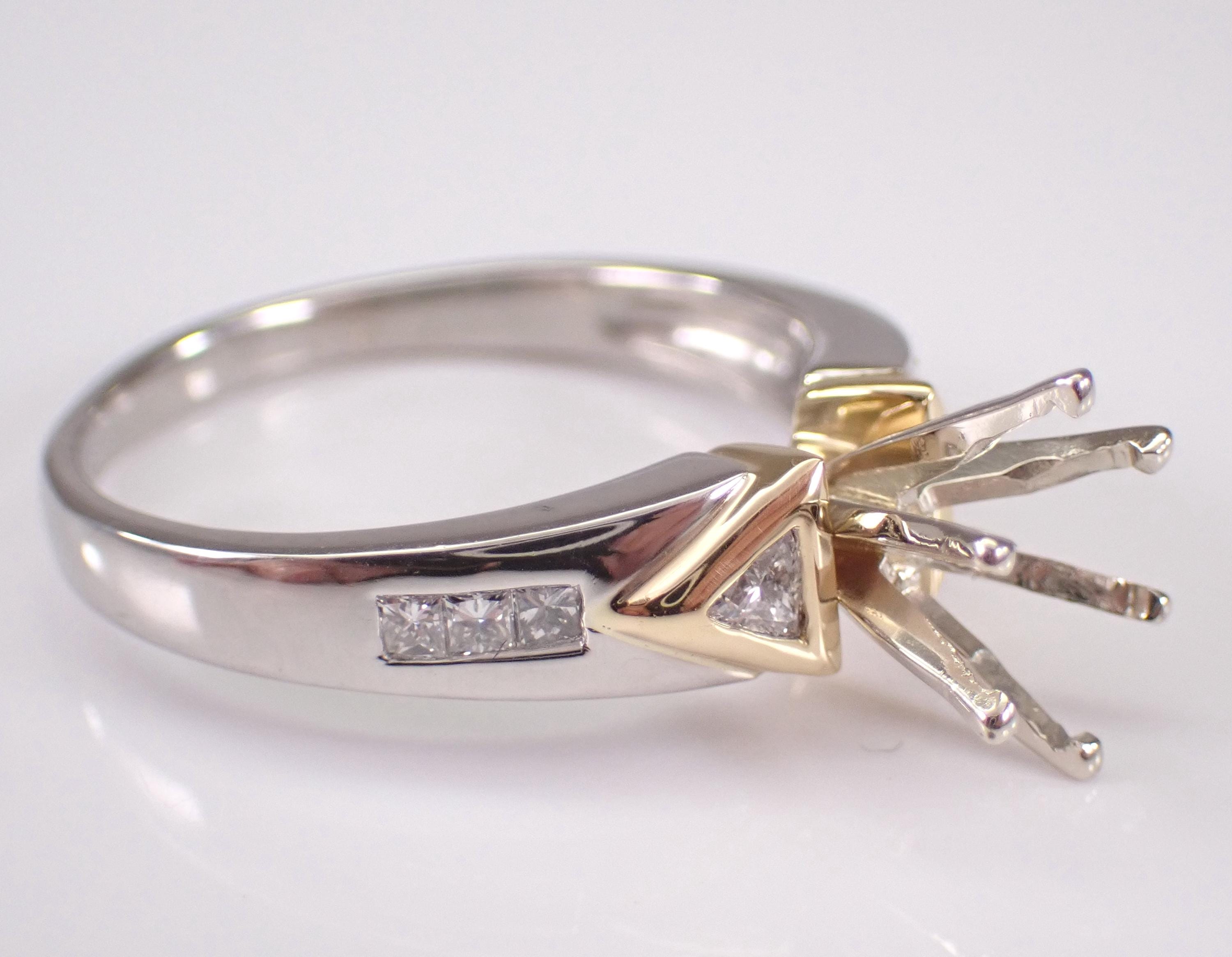Diamond Engagement Ring Semi Mount set in Platinum and 18K Gold. This engagement ring is set up to hold a Round Brilliant Diamond weighing approximately 1 1/2 carat, but the center crown can be changed to accommodate any size and shape stone. There are two genuine, natural trillion diamonds and six princess-cut diamonds set in this engagement ring setting. These diamonds are F/G color, VS2 clarity and weigh a total of .35 carat. This ring is Platinum and 18KT Yellow Gold, weighs 6.6 grams and is a finger size 8 3/4, can be resized free of charge (please inquire about sizing with the finger size you need). This ring will be shipped promptly accompanied by an appraisal by a GIA Certified Diamond Grader with the retail replacement value of $3,295.00. I will ship this ring in a beautiful gift box.