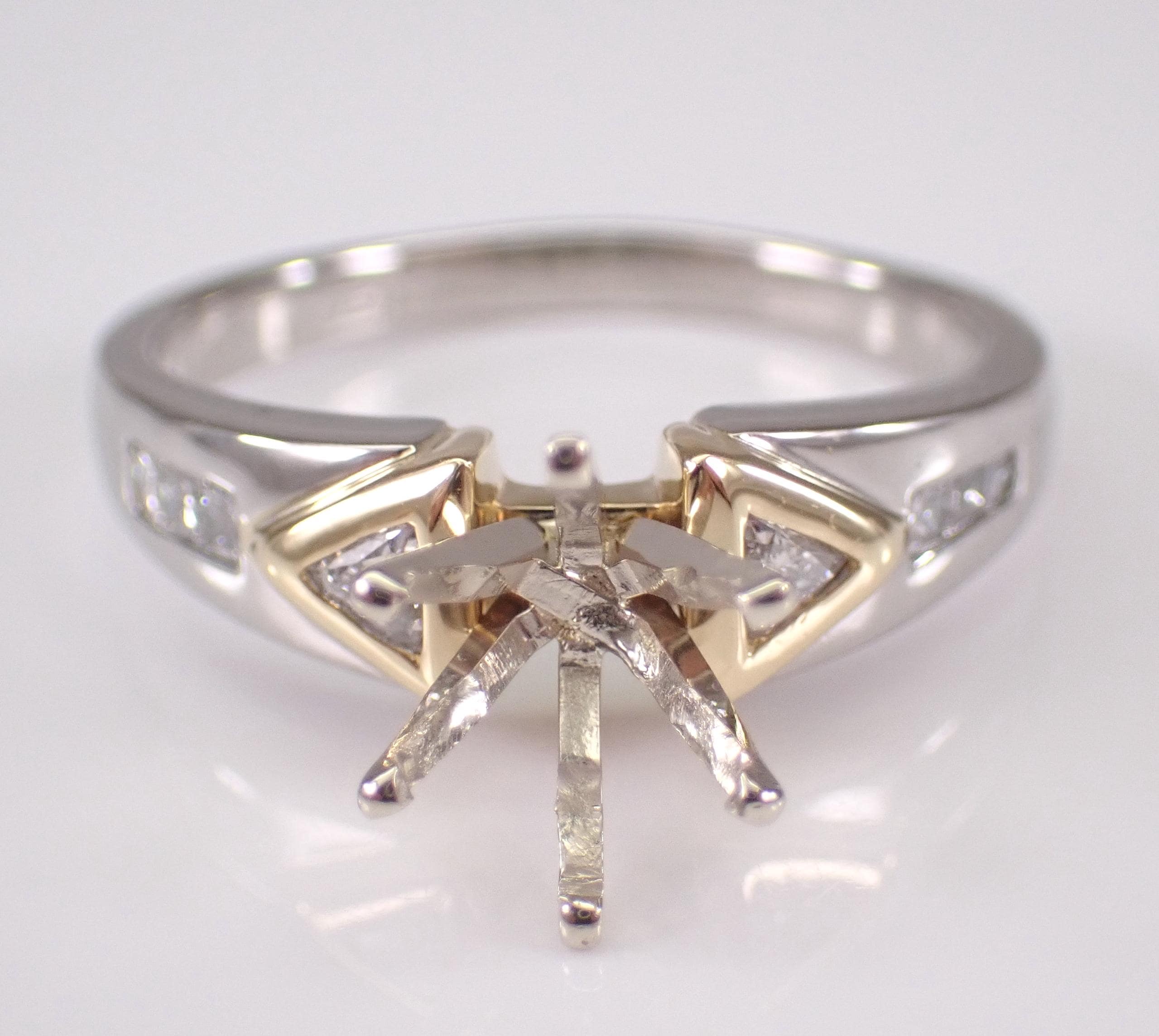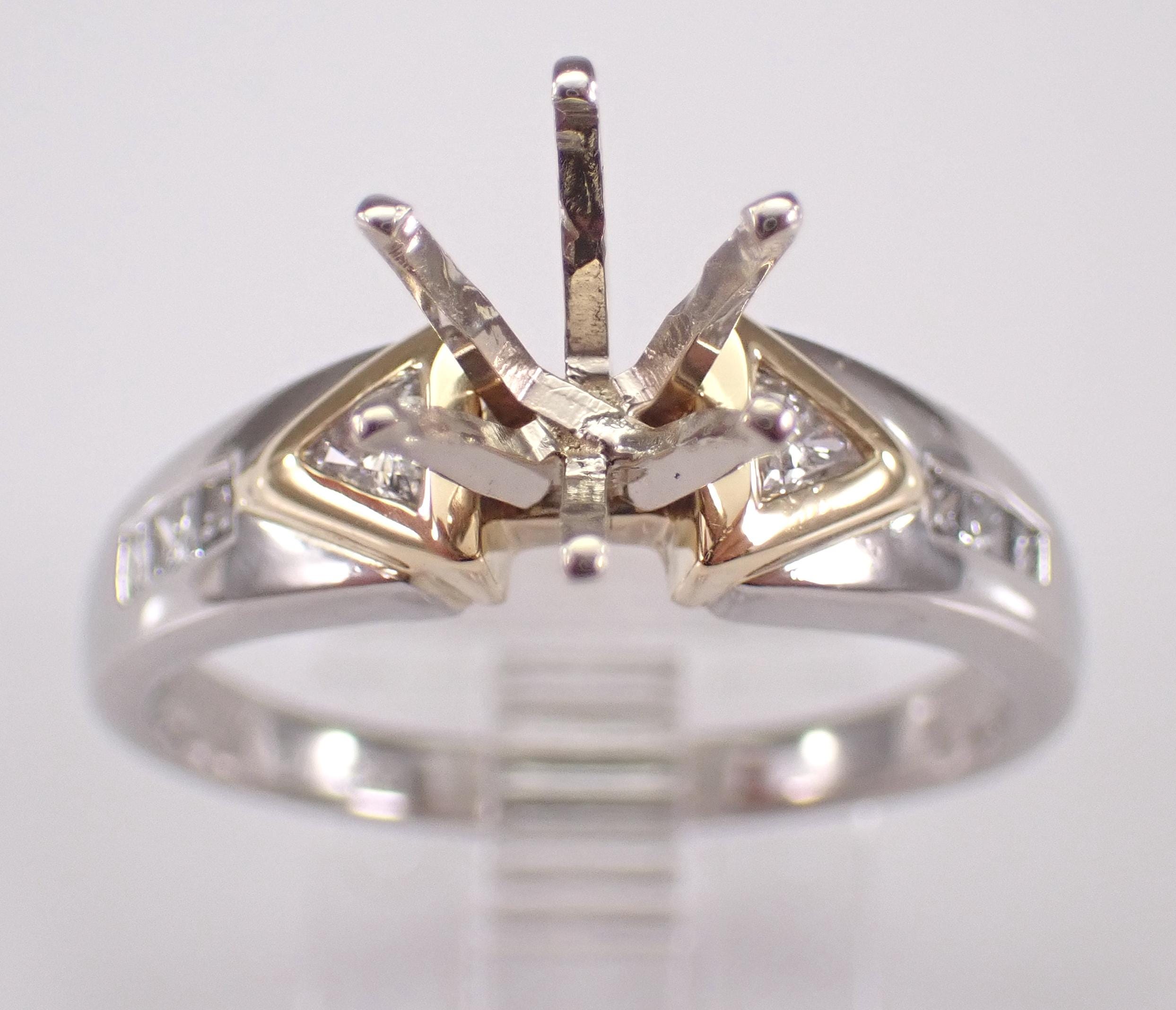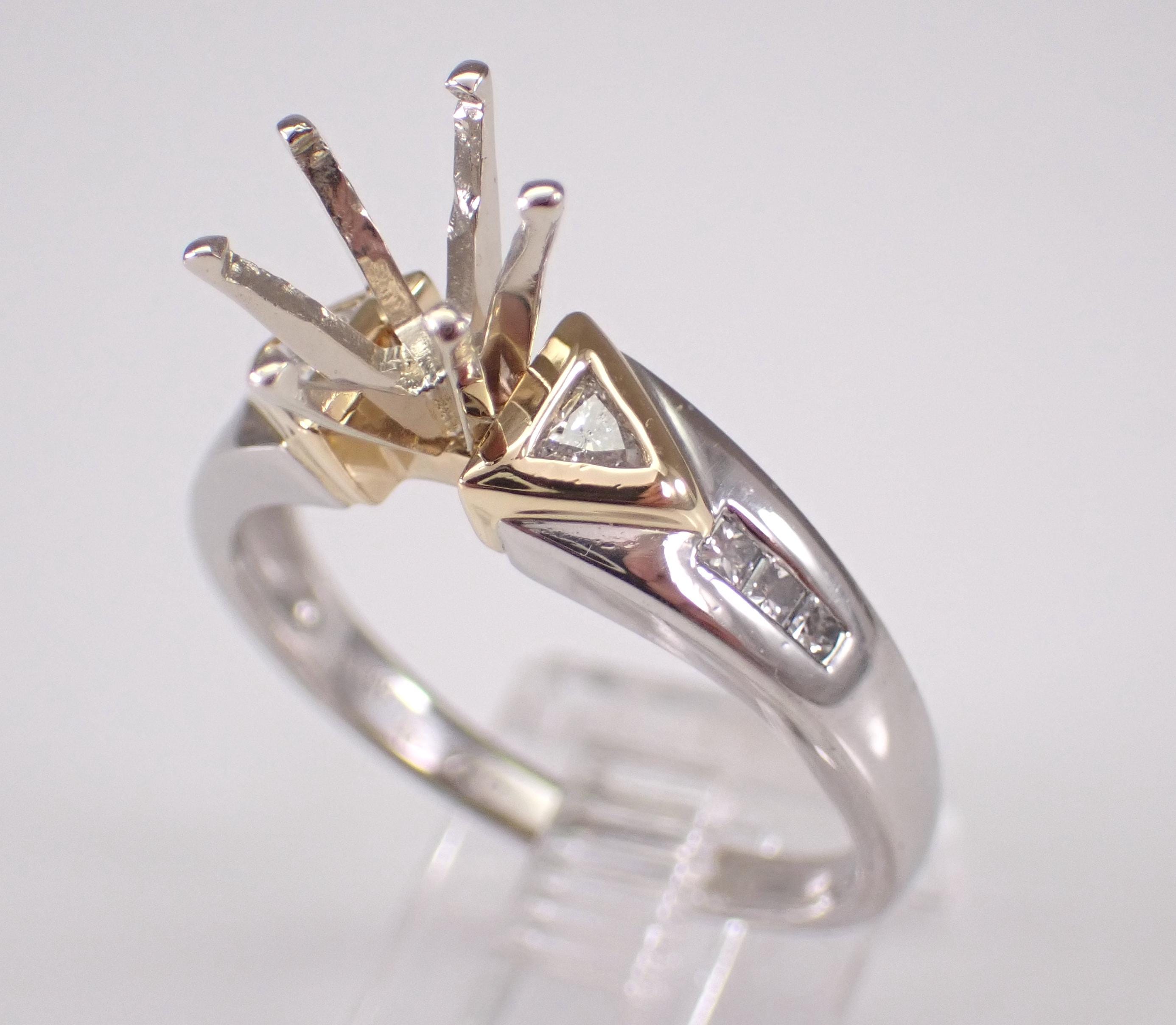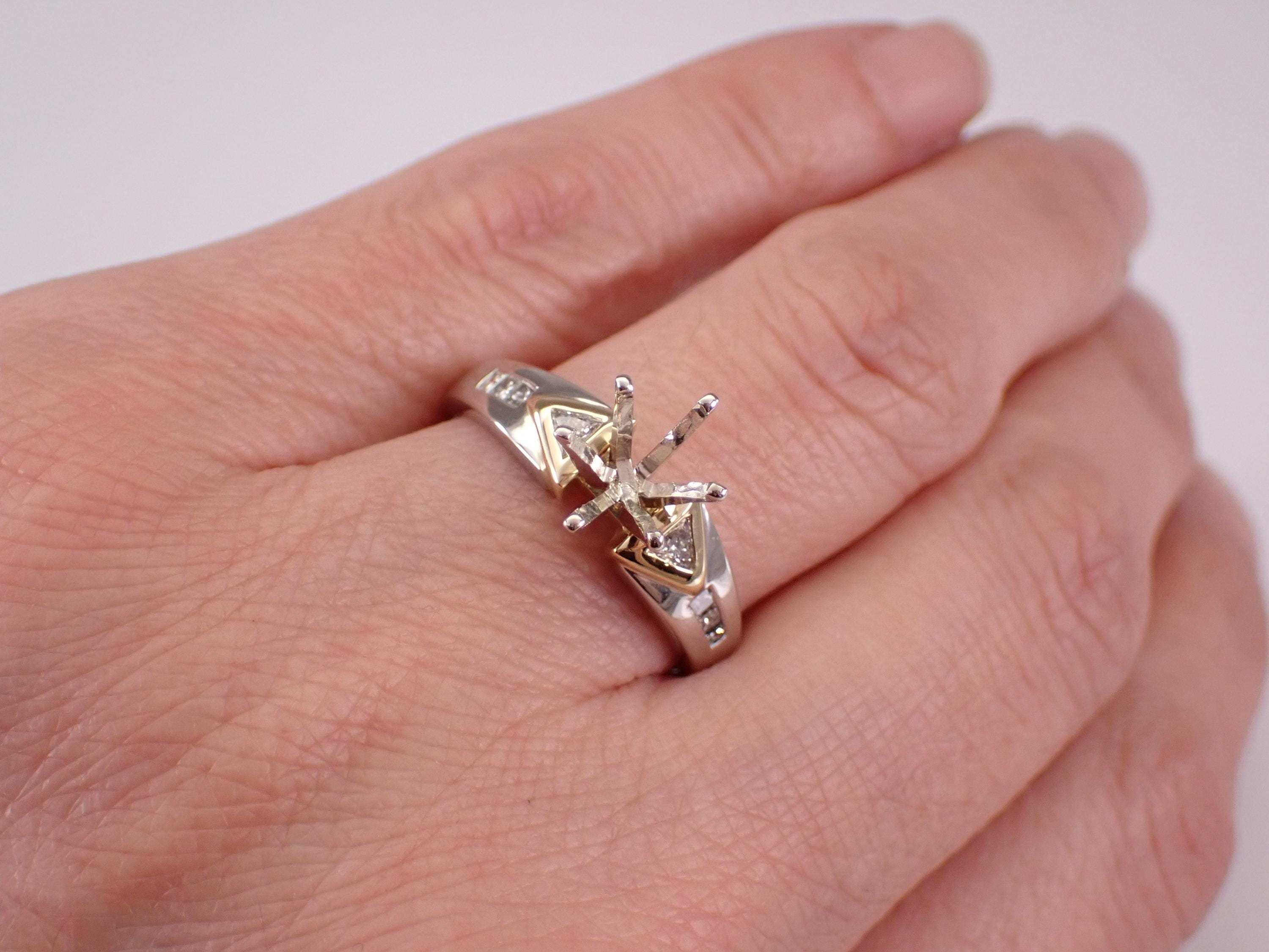 Diamond Engagement Ring Semi Mount set in Platinum and 18K Gold. This engagement ring is set up to hold a Round Brilliant Diamond weighing approximately 1 1/2 carat, but the center crown can be changed to accommodate any size and shape stone. There are two genuine, natural trillion diamonds and six princess-cut diamonds set in this engagement ring setting. These diamonds are F/G color, VS2 clarity and weigh a total of .35 carat. This ring is Platinum and 18KT Yellow Gold, weighs 6.6 grams and is a finger size 8 3/4, can be resized free of charge (please inquire about sizing with the finger size you need). This ring will be shipped promptly accompanied by an appraisal by a GIA Certified Diamond Grader with the retail replacement value of $3,295.00. I will ship this ring in a beautiful gift box.