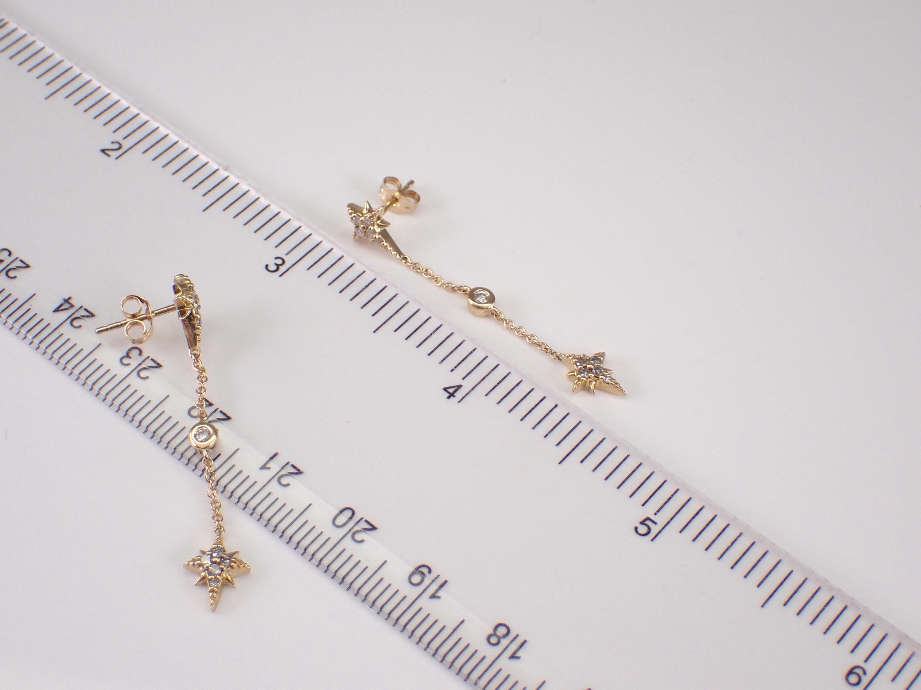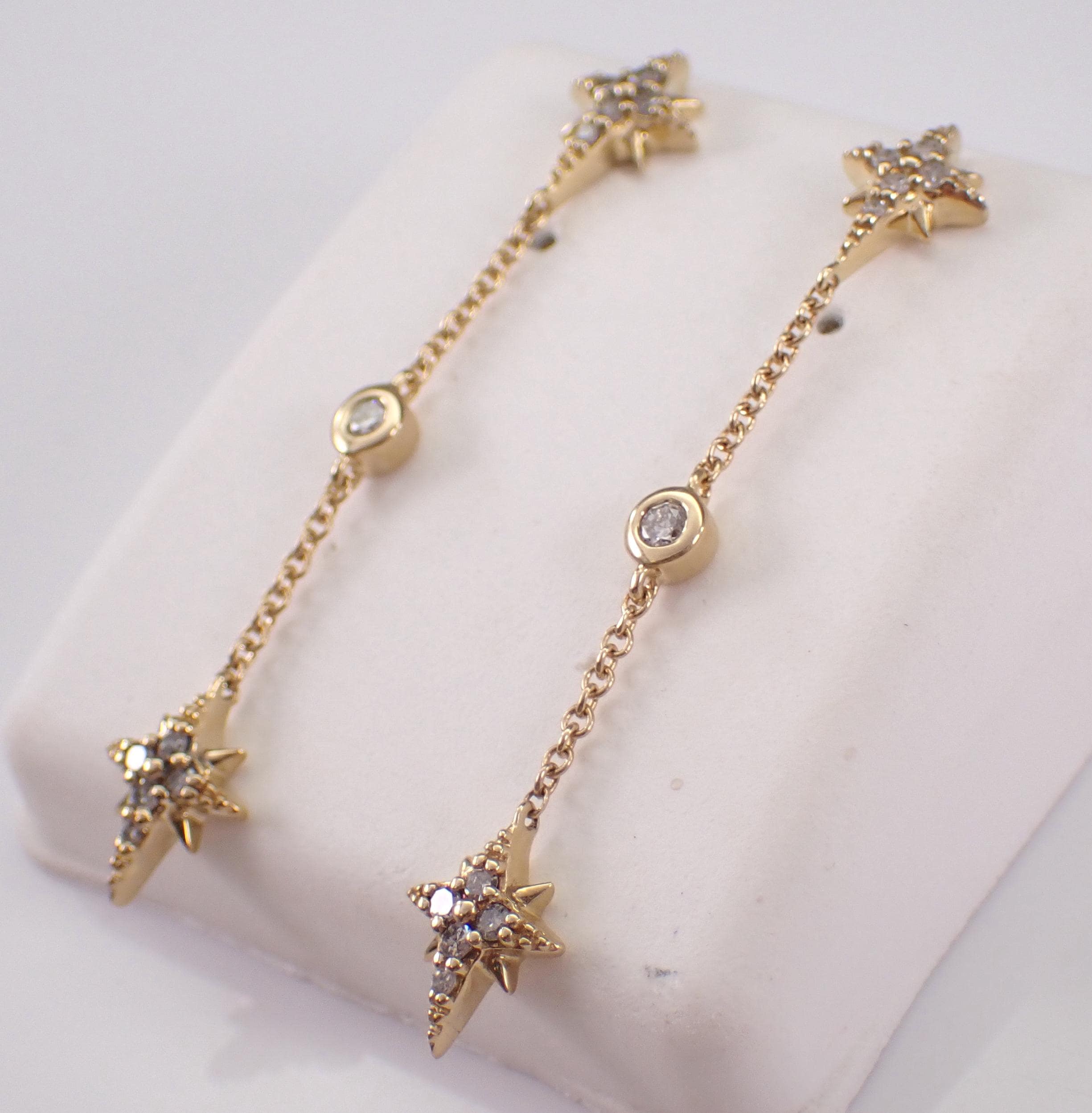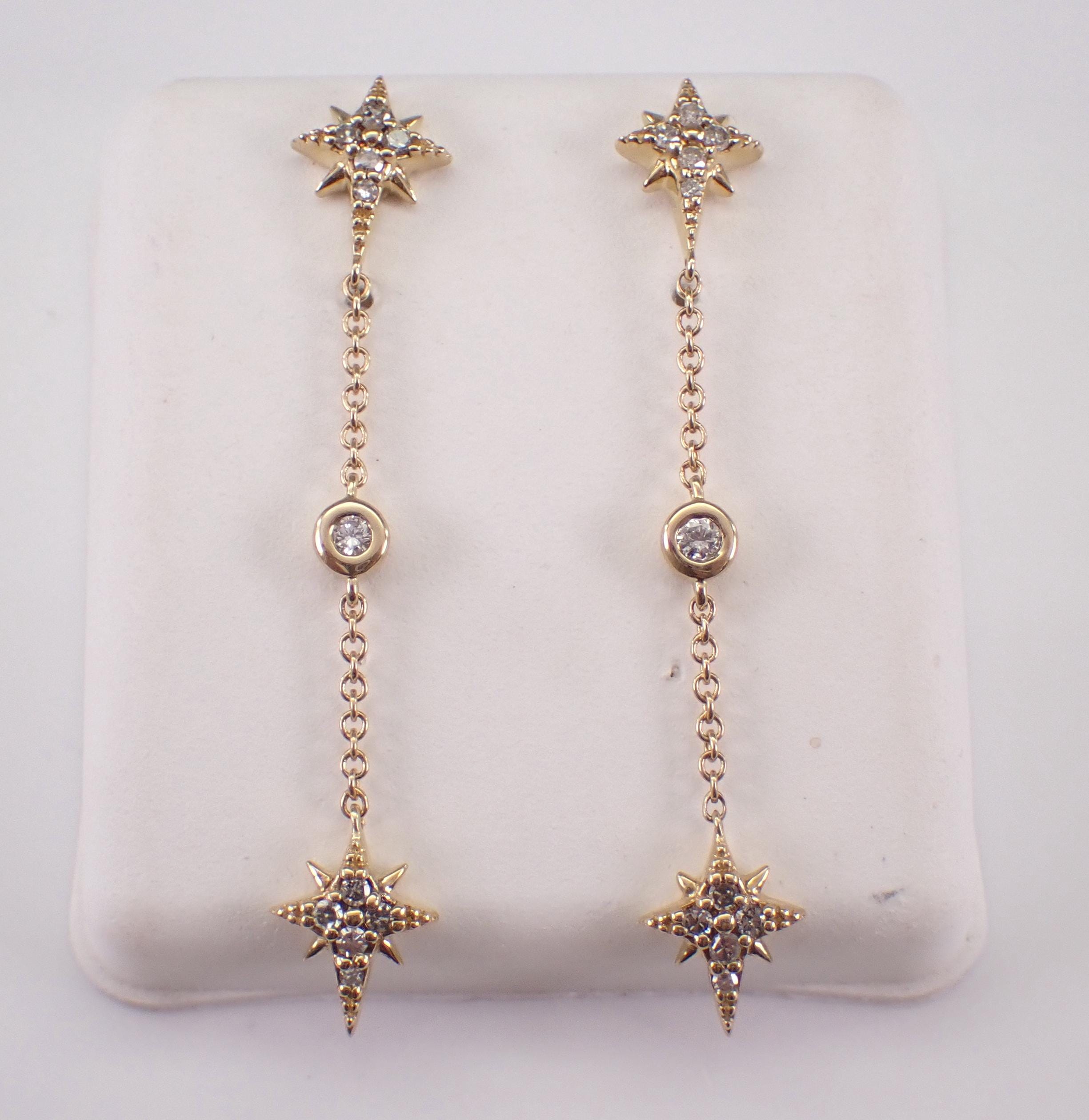 Yellow Gold Diamond Dangle Earrings. There are eleven natural Round Diamonds set in EACH earring. These diamonds are H color, I1 clarity and weigh a total of .20 carats. These earrings are 10KT Yellow Gold and weigh a total of 1.8 grams. These earrings are for pierced ears, measure 1 1/2" in length and have friction post backings for pierced ears. I will ship these earrings promptly in a gift box.