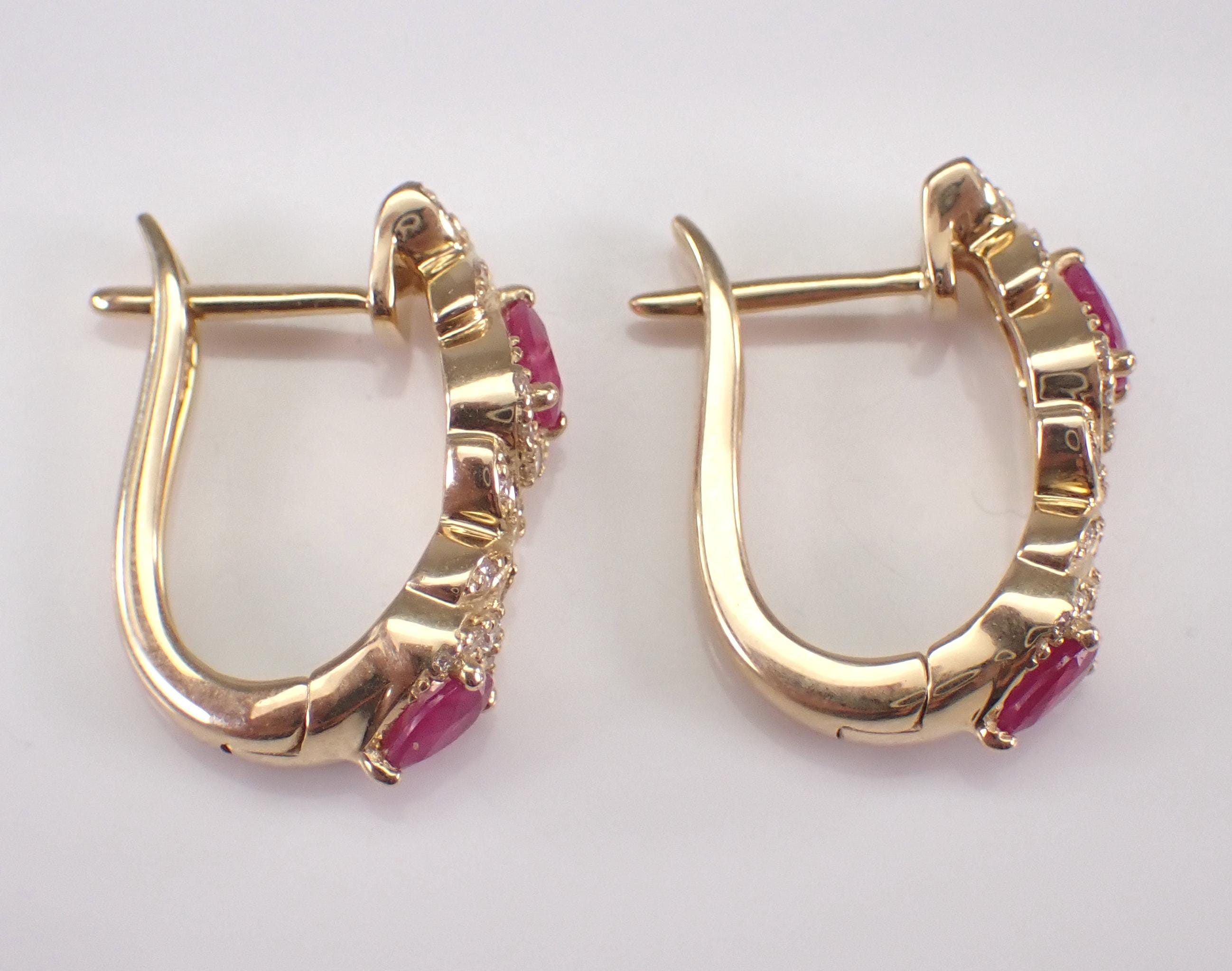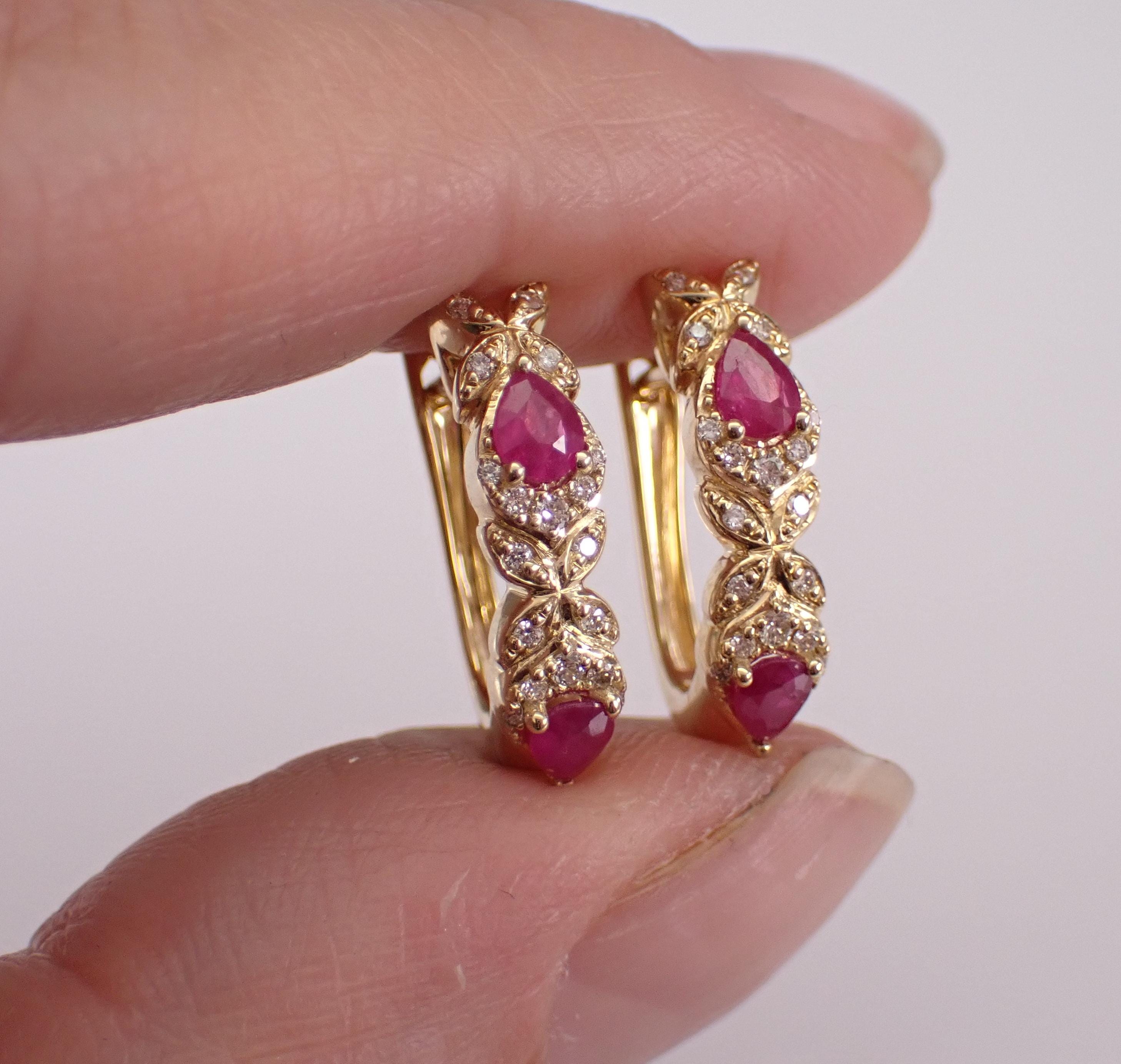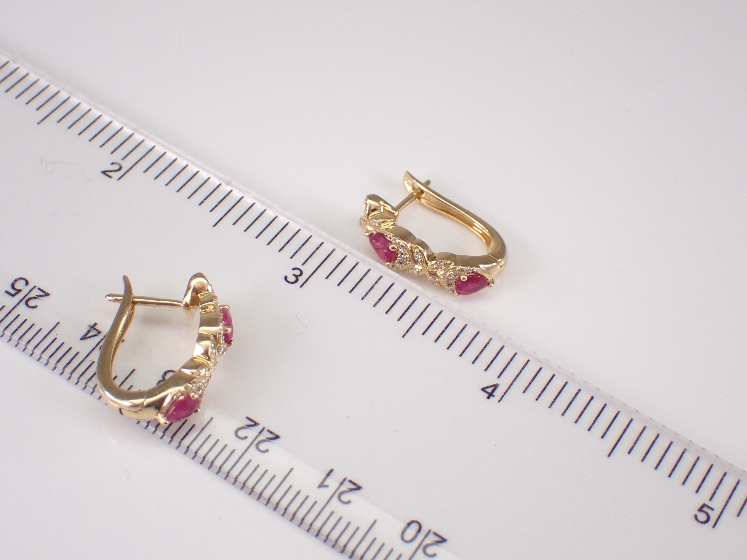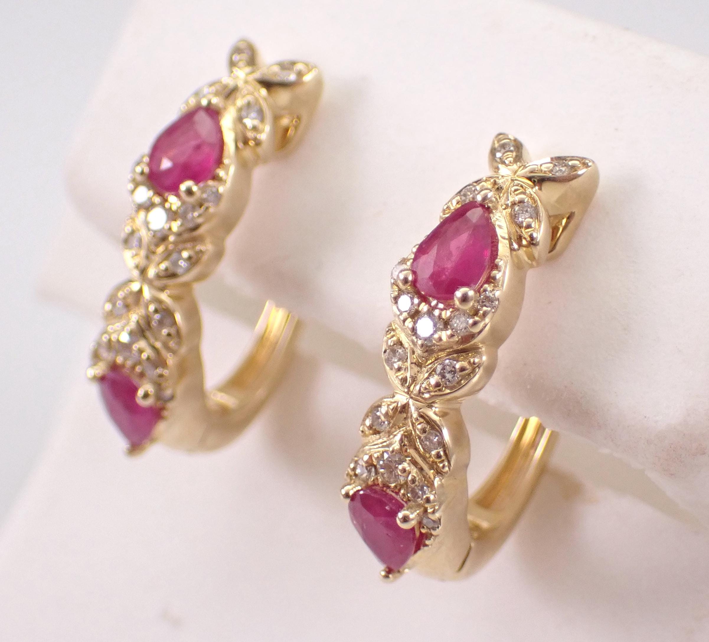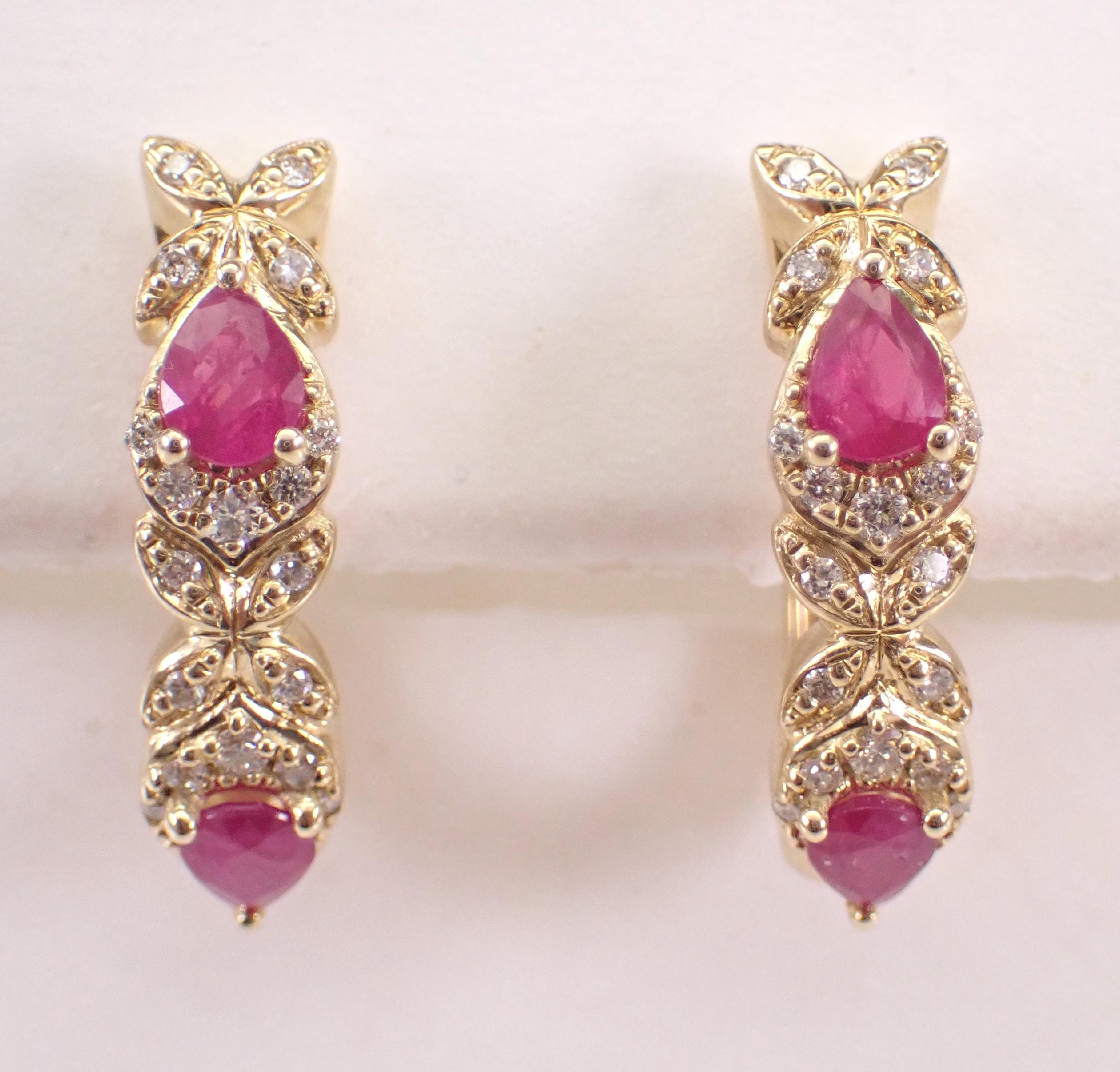 14K Yellow Gold Diamond and Ruby Hoop Earrings. These earrings are set with four genuine Pear shaped Rubies and thirty-six natural Round Brilliant Diamonds. The Rubies in these earrings measure 4 X 3 mm each and amount to a total weight of 3/4 carats. The diamonds are H color, I1 clarity and weigh a total of .35 carat. These earrings are 14K Yellow Gold and weigh a total of 4.4 grams. These earrings are for pierced ears and measure 17 X 12 X 4.5 mm. These earrings will be accompanied by an appraisal written by a GIA Certified Diamond Grader with the retail replacement value of $2,985.00. I will ship these earrings promptly in a gift box.