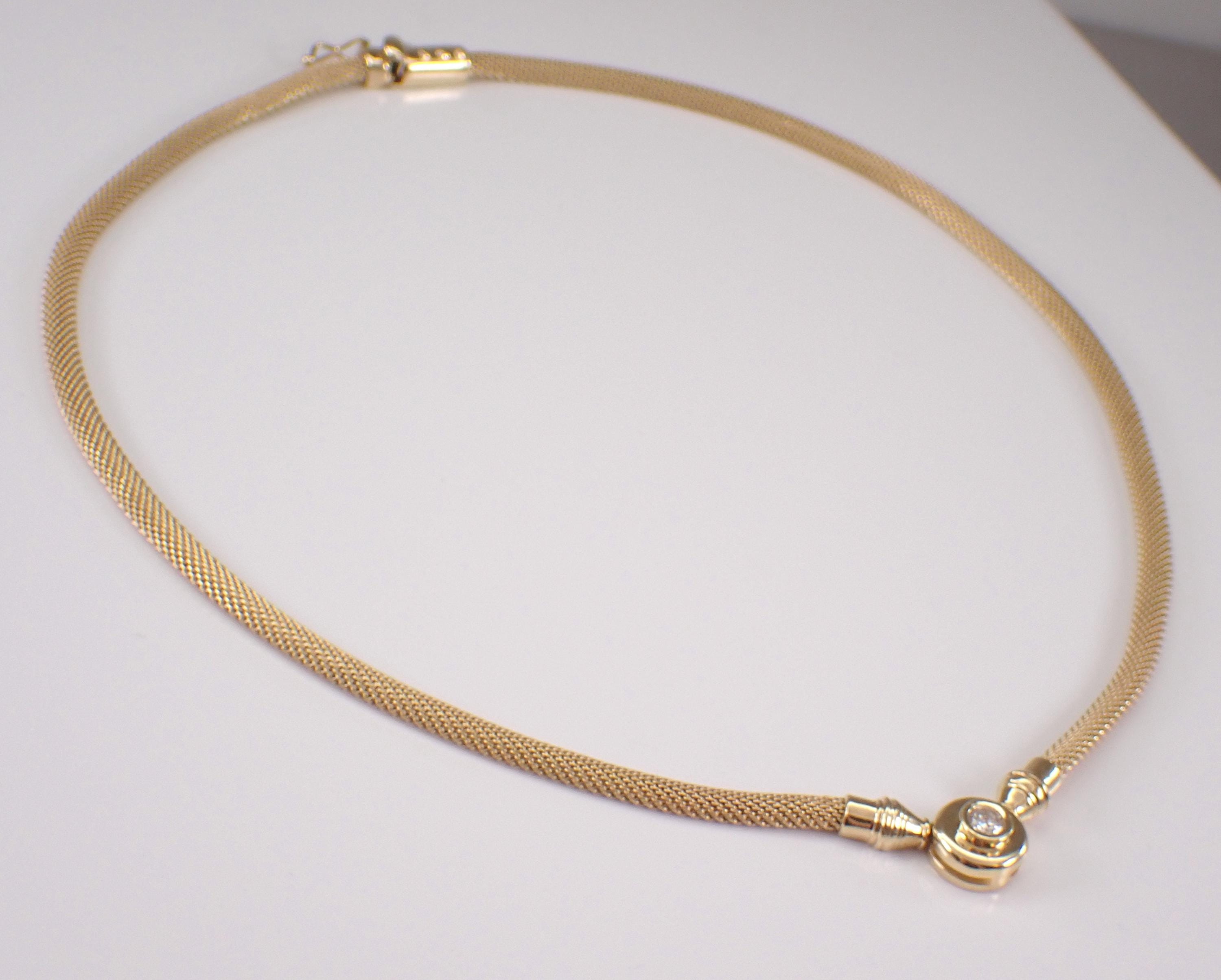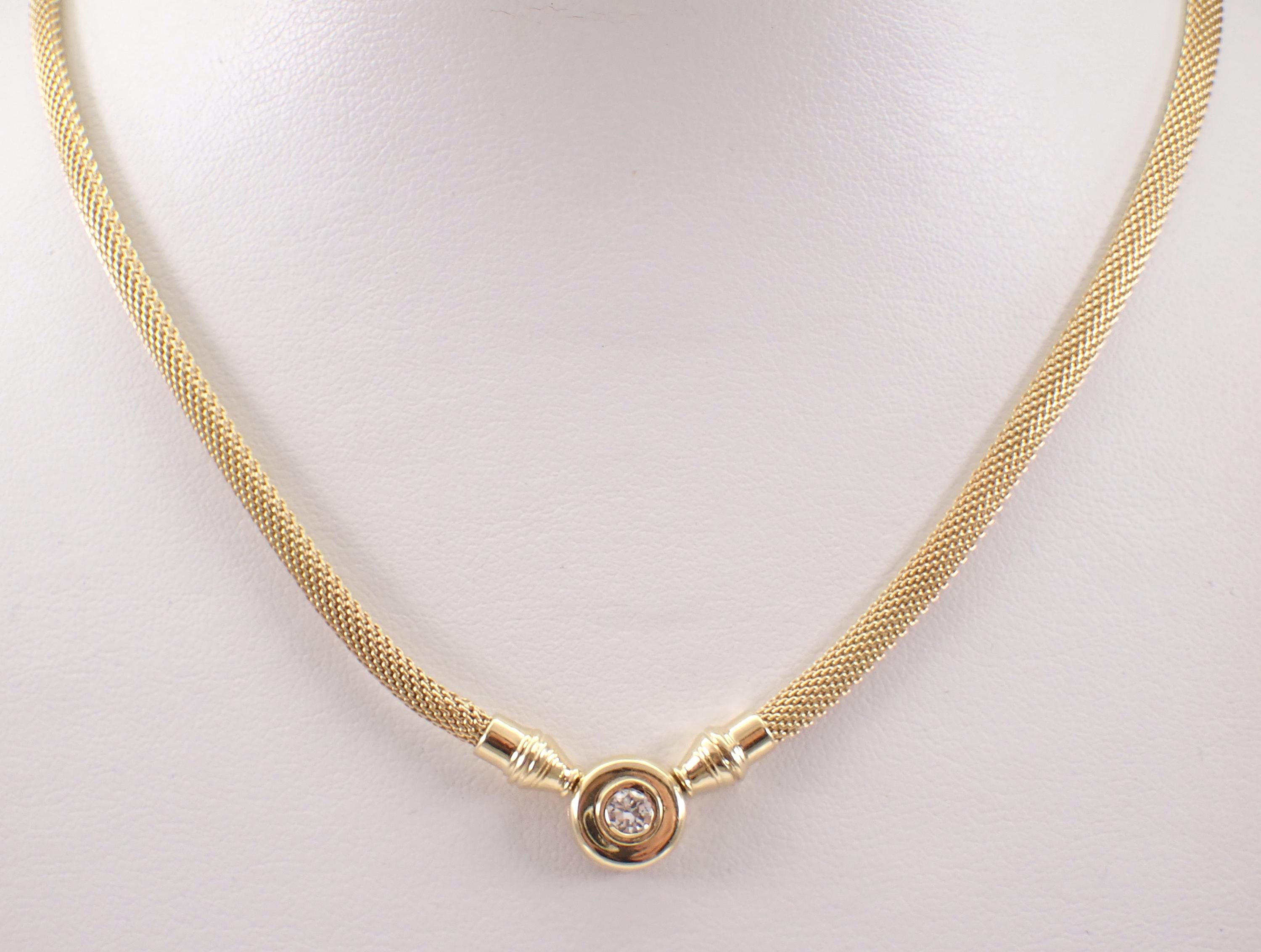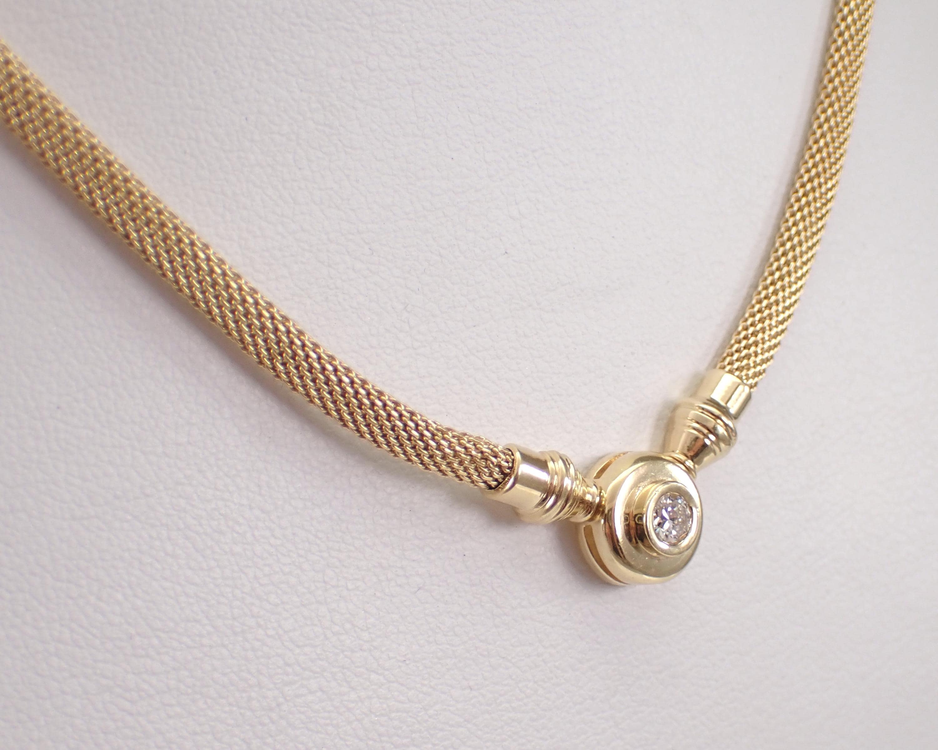 14K Yellow Gold Mesh Choker Necklace with Diamond Solitaire Pendant center. This necklace is set with one Round Brilliant Diamond in the center. This diamond is G color, SI1 clarity and weighs .25 carat. This necklace measures 17" in length and weighs 21.3 grams. This necklace will be accompanied by an appraisal for insurance and authentication purposes. I will ship this necklace promptly in a beautiful gift box.