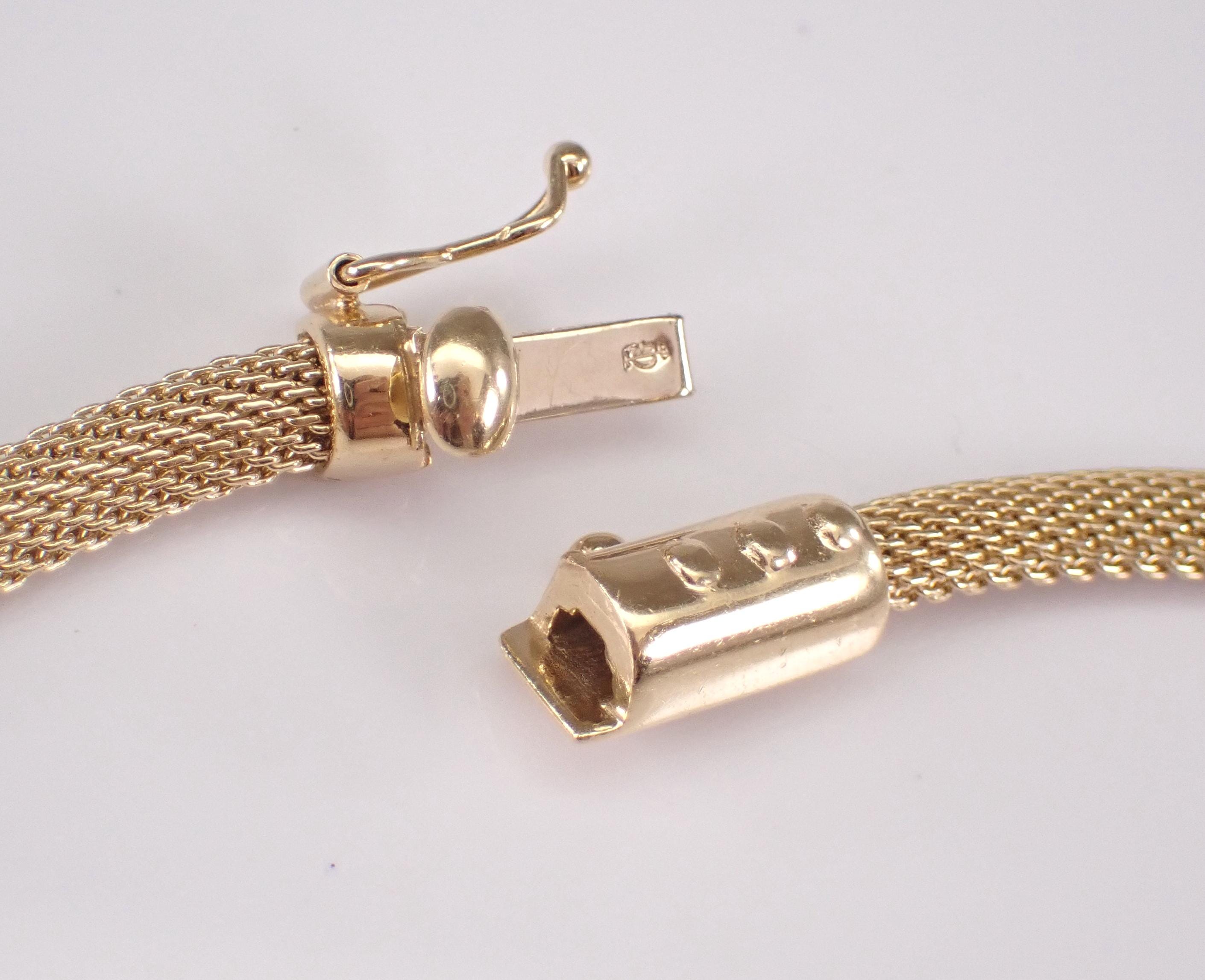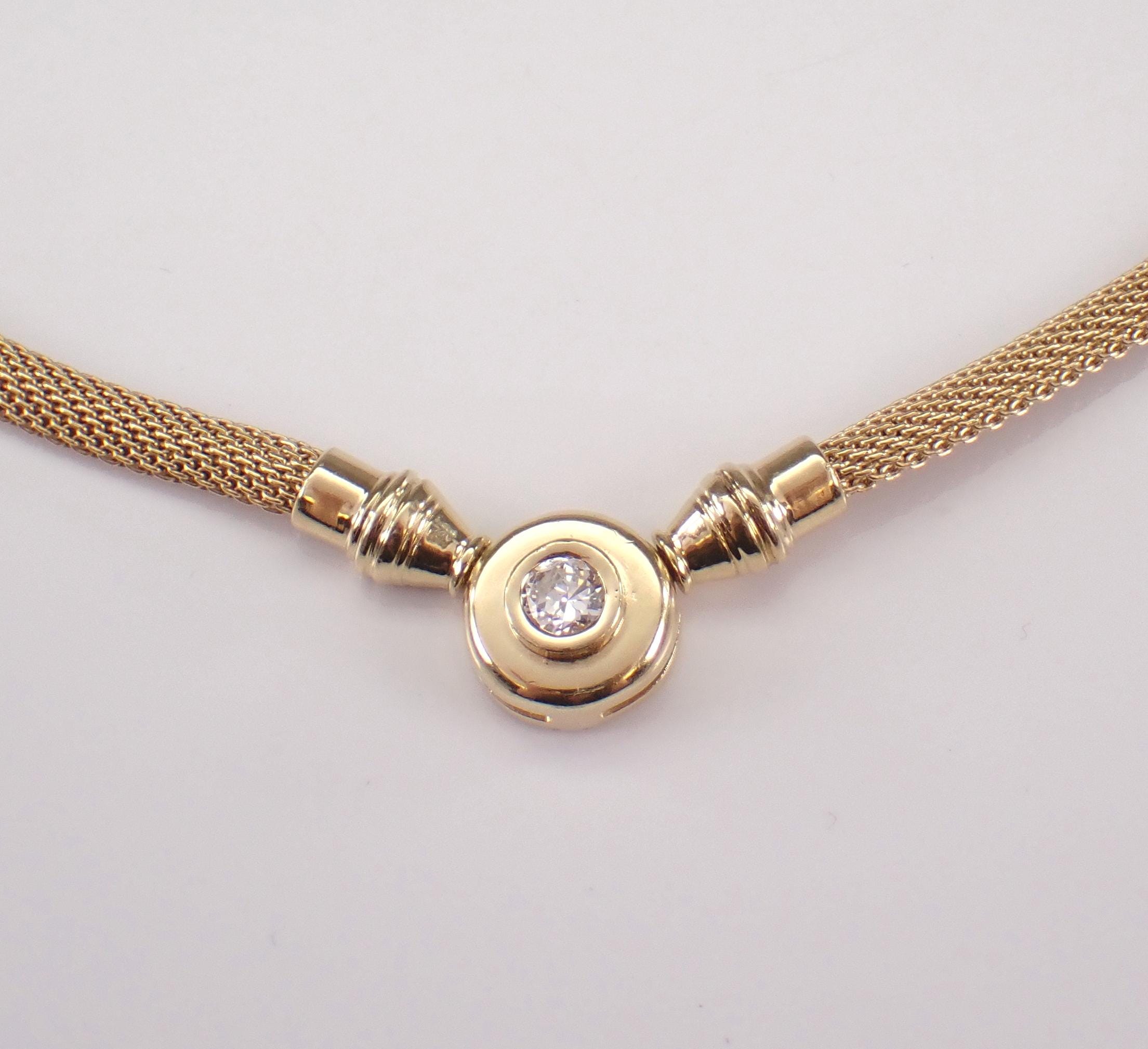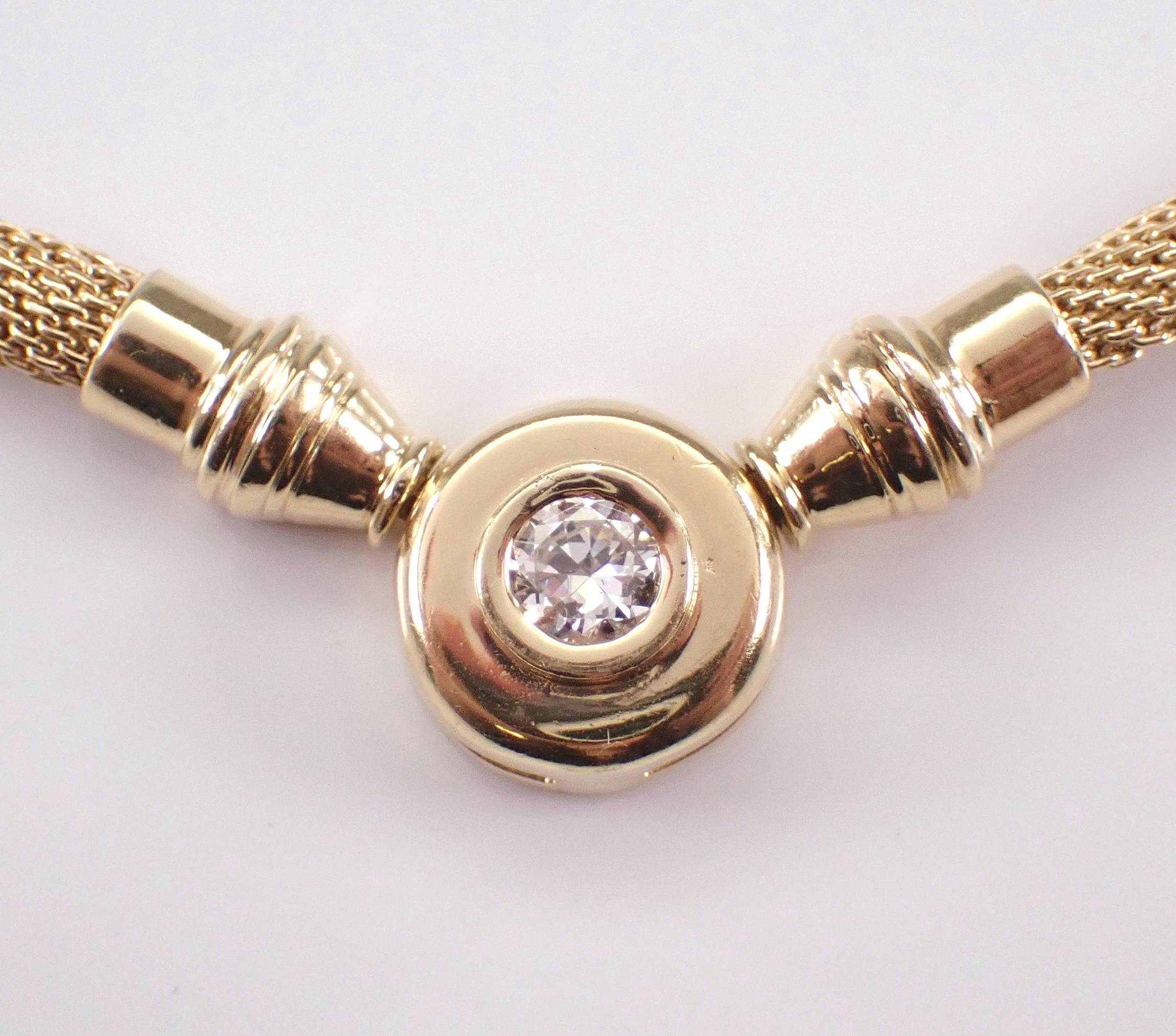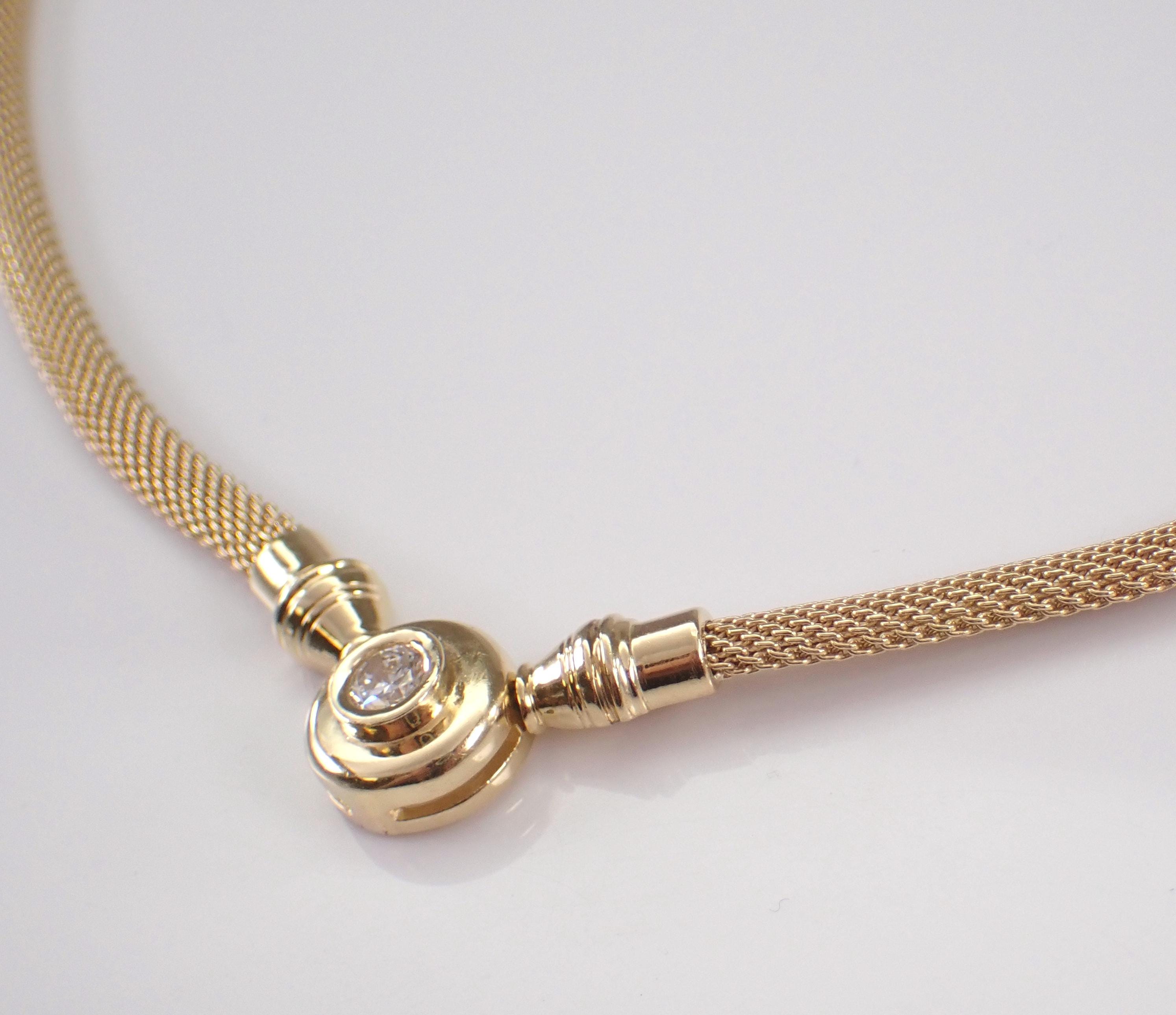14K Yellow Gold Mesh Choker Necklace with Diamond Solitaire Pendant center. This necklace is set with one Round Brilliant Diamond in the center. This diamond is G color, SI1 clarity and weighs .25 carat. This necklace measures 17" in length and weighs 21.3 grams. This necklace will be accompanied by an appraisal for insurance and authentication purposes. I will ship this necklace promptly in a beautiful gift box.