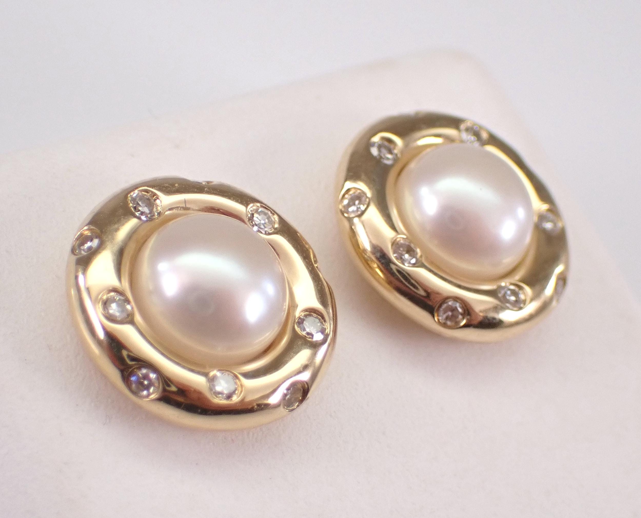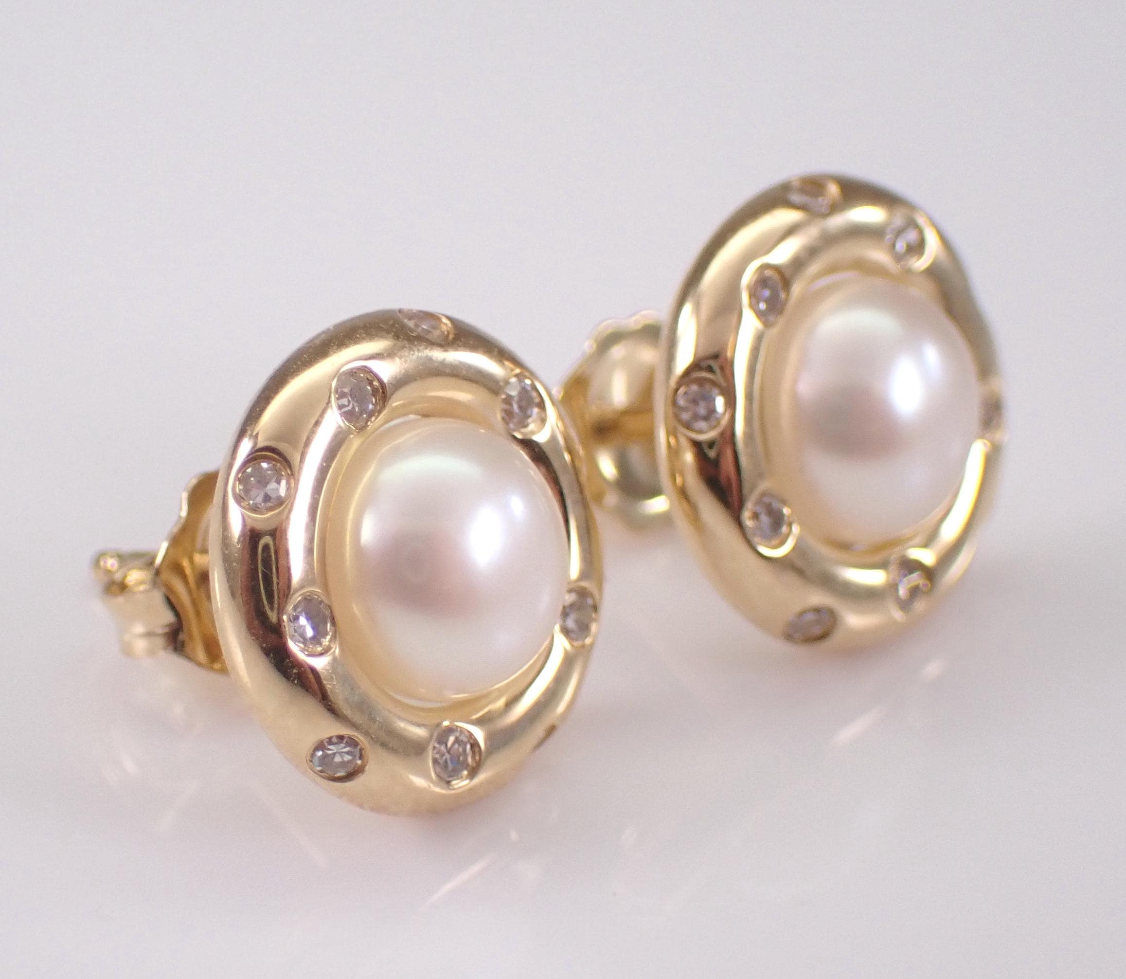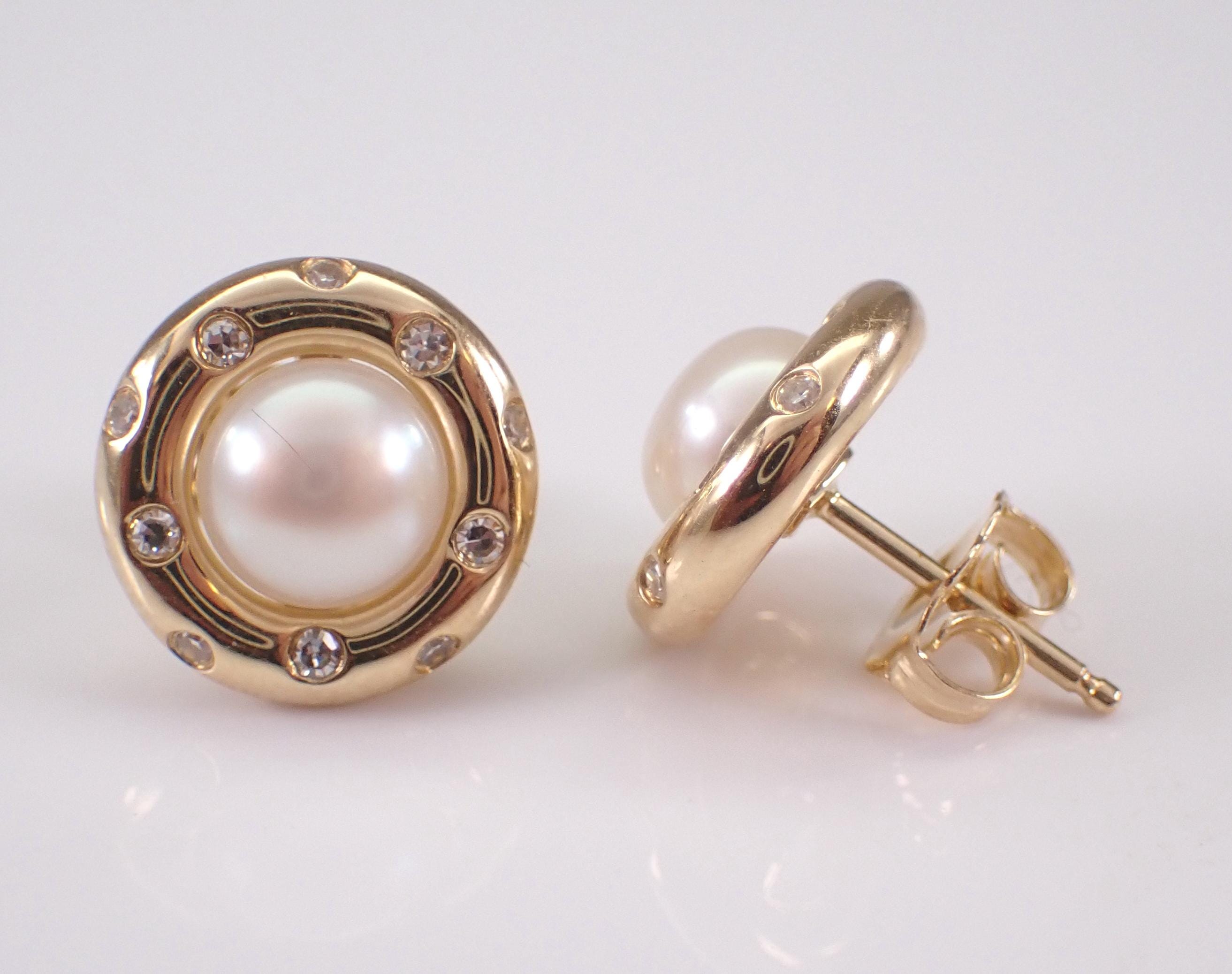 14K Yellow Gold Pearl and Diamond Halo Stud Earrings. These earrings are set with two Round White Pearls and twenty genuine Round Brilliant Diamonds. These Pearls measure 6 mm in diameter each. The Diamonds in these earrings are G color, SI1 clarity and weigh a total of .17 carat. These earrings are 14KT Yellow Gold and weigh a total of 3.2 grams. These earrings are for pierced ears, measure 11 mm in diameter and the earrings have friction post backings. These earrings will be accompanied by an appraisal written by a GIA Certified Diamond Grader with the retail replacement value of $1,495.00. I will ship these earrings promptly in a gift box.