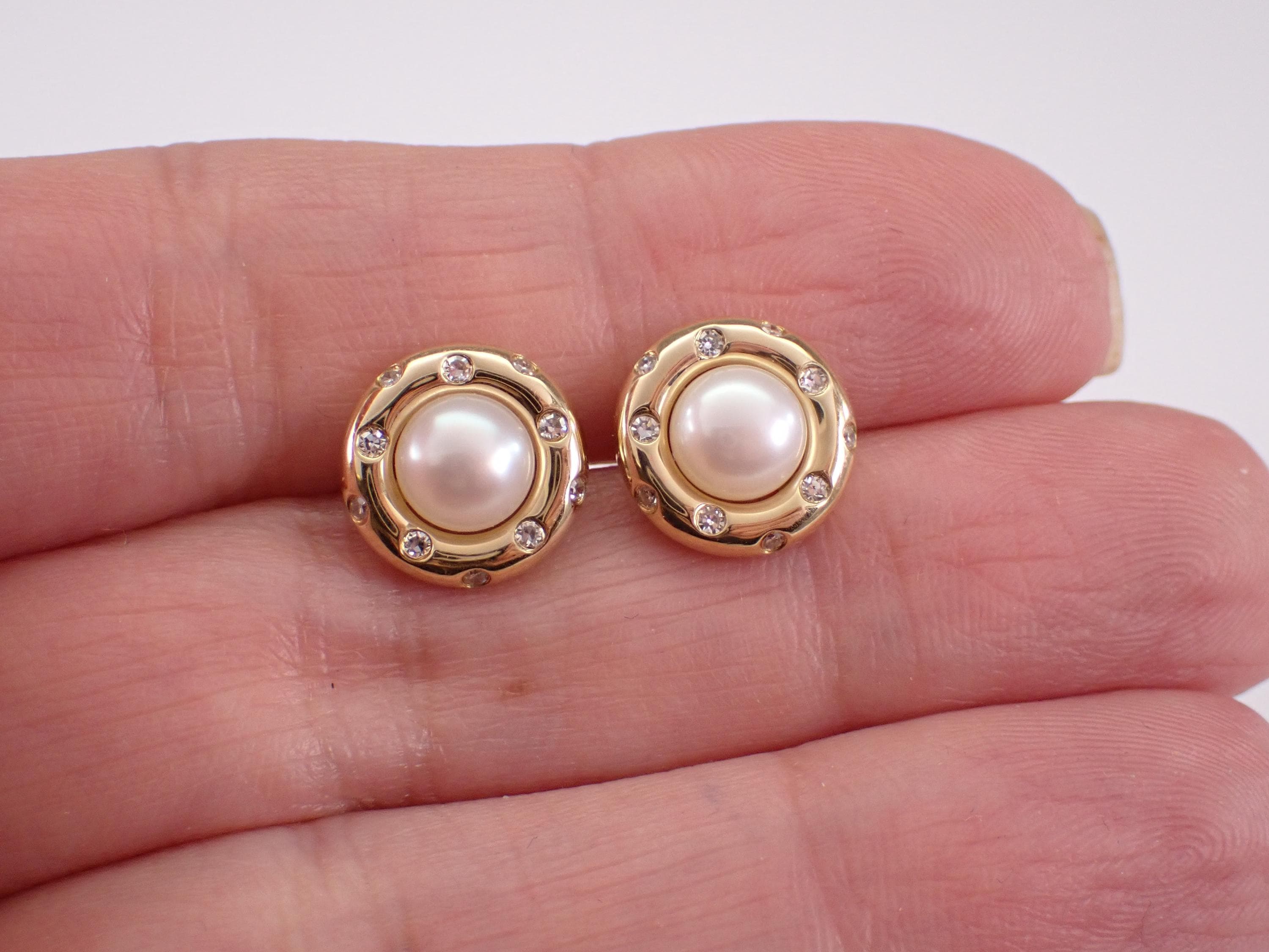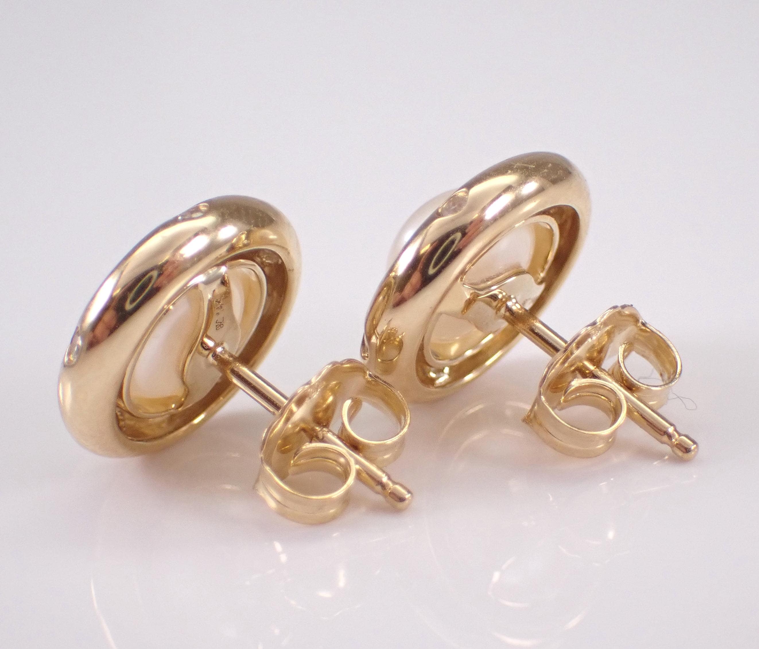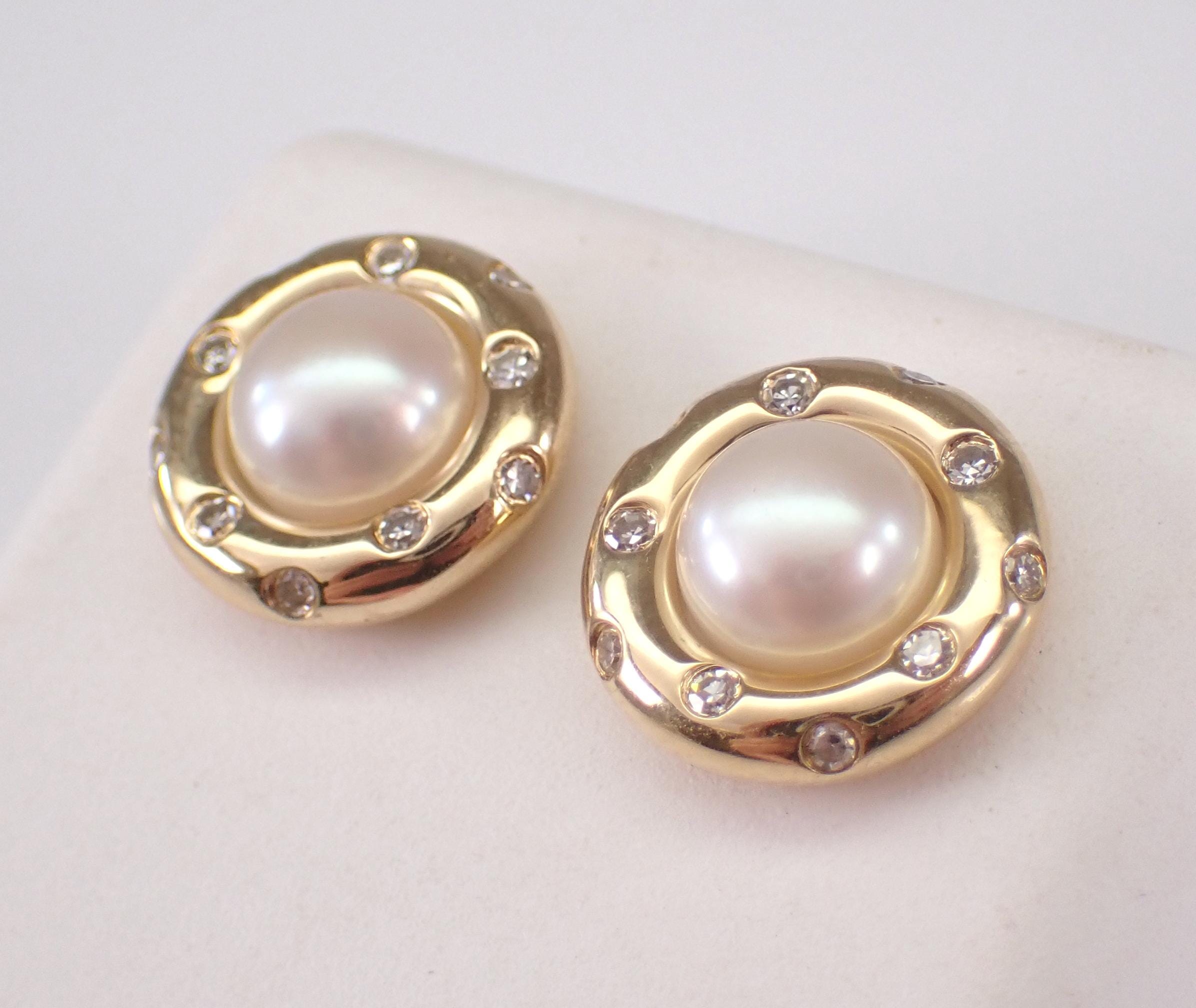 14K Yellow Gold Pearl and Diamond Halo Stud Earrings. These earrings are set with two Round White Pearls and twenty genuine Round Brilliant Diamonds. These Pearls measure 6 mm in diameter each. The Diamonds in these earrings are G color, SI1 clarity and weigh a total of .17 carat. These earrings are 14KT Yellow Gold and weigh a total of 3.2 grams. These earrings are for pierced ears, measure 11 mm in diameter and the earrings have friction post backings. These earrings will be accompanied by an appraisal written by a GIA Certified Diamond Grader with the retail replacement value of $1,495.00. I will ship these earrings promptly in a gift box.