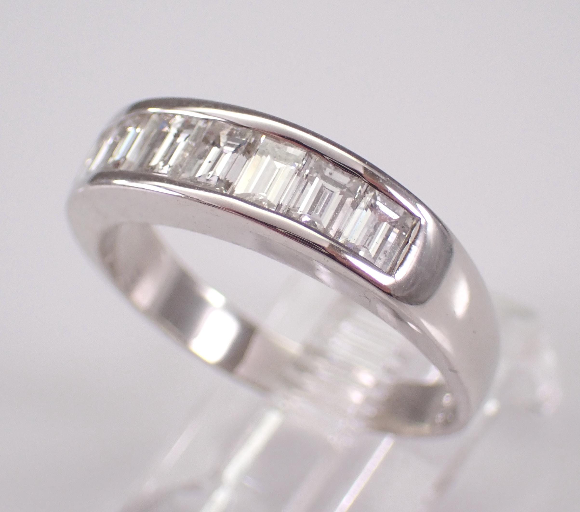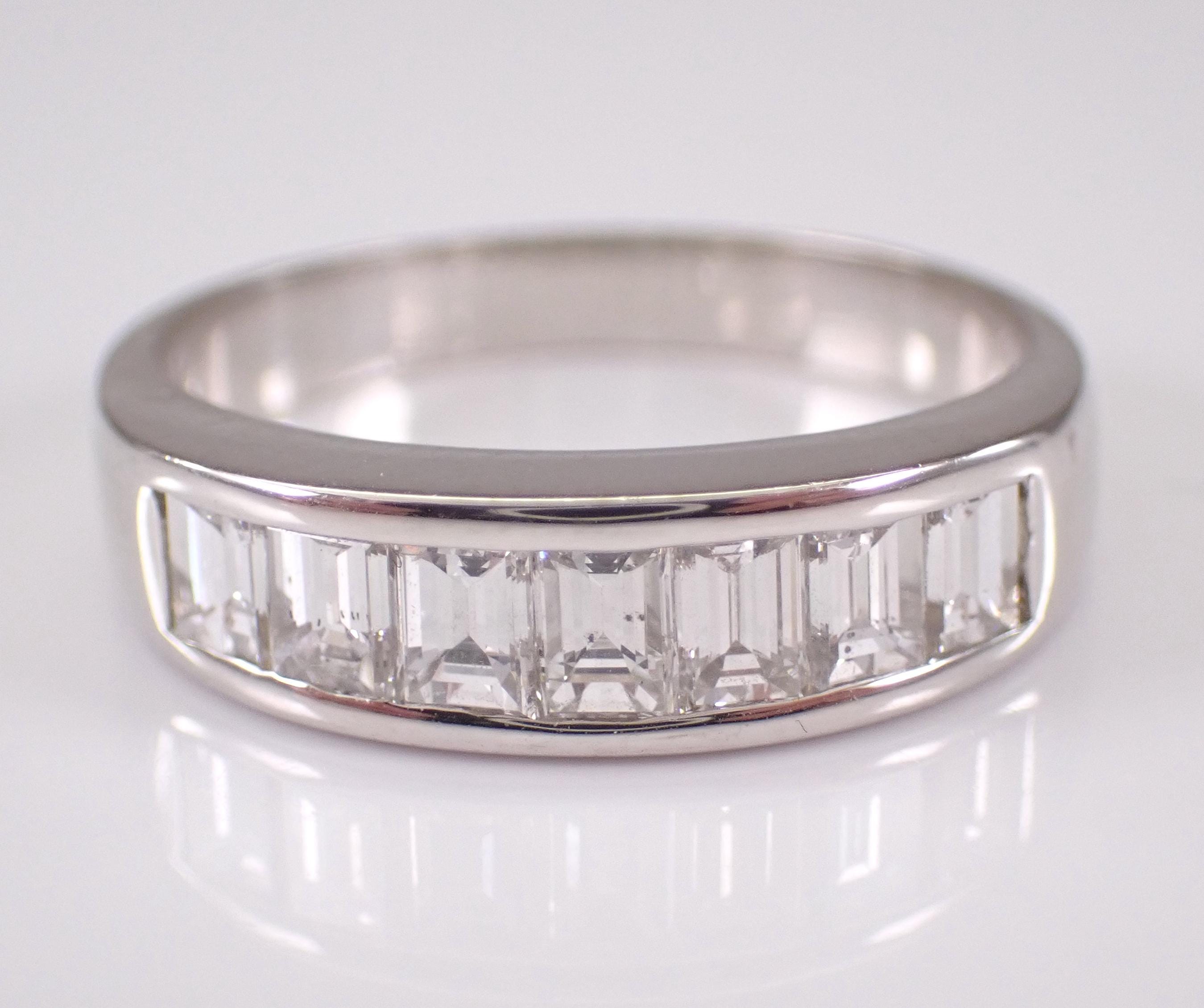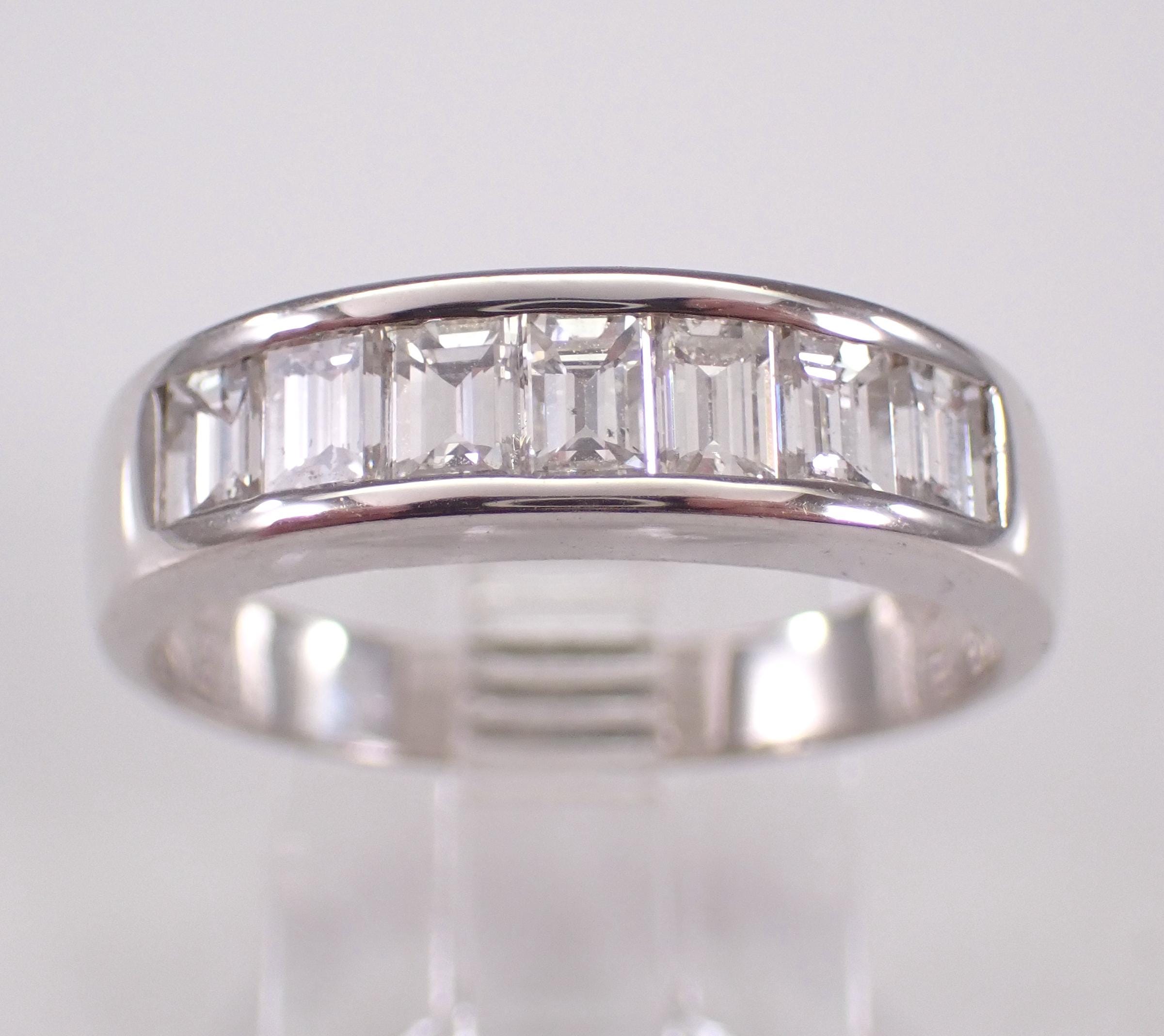 18K White diamond wedding band anniversary ring. This is a very beautiful ring set with seven Baguette Diamonds. These diamonds are G color, VS clarity and weigh a total of 3/4 carat. The ring is 18KT White Gold, weighs 4.7 grams, measures 5 mm in width and is a finger size 7 3/4, can be resized free of charge (please inquire about sizing with the finger size you need). This ring will be accompanied by an appraisal by a GIA Certified Diamond Grader with the retail replacement value of $3,895.00. I will ship this ring promptly in a gift box.