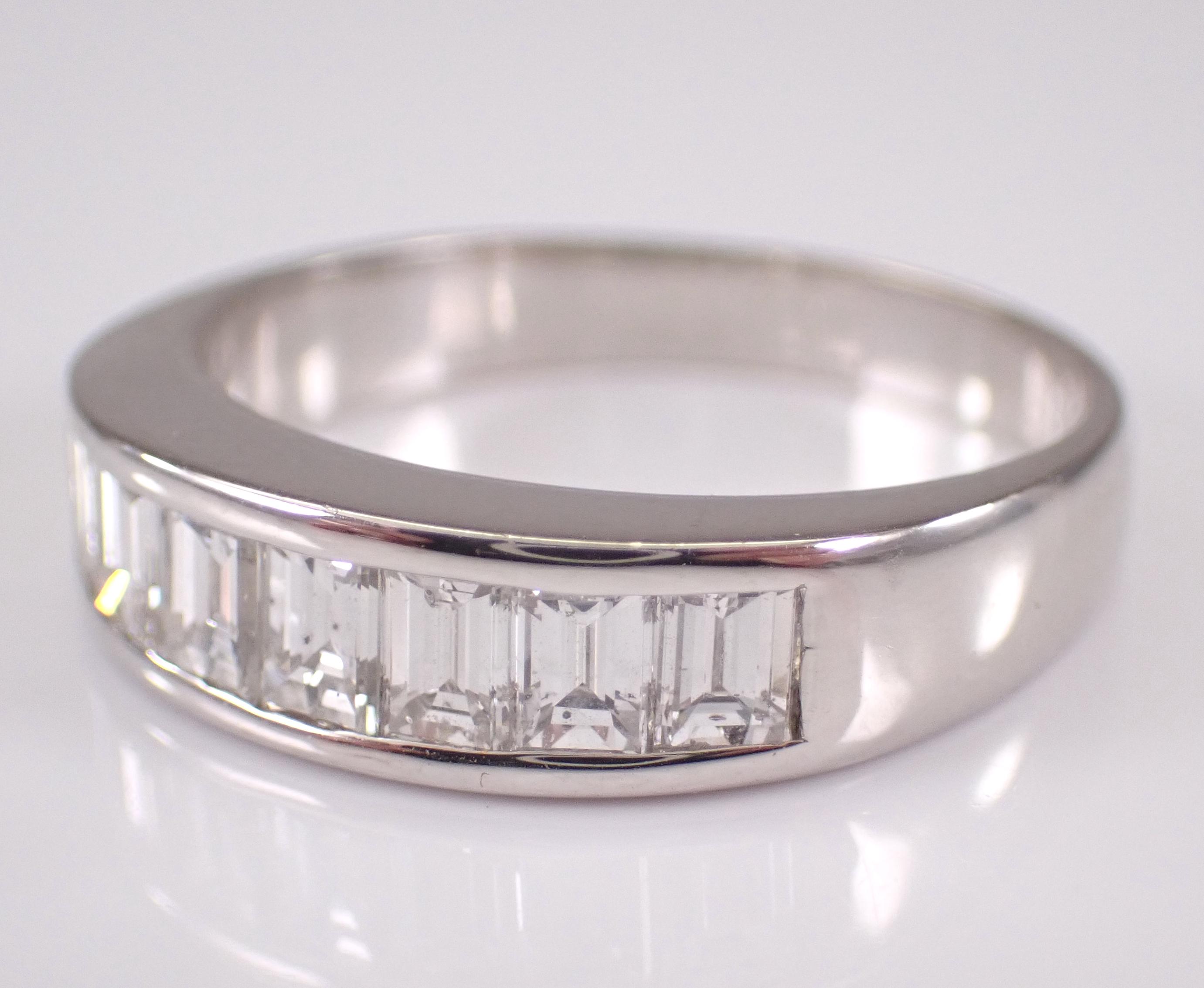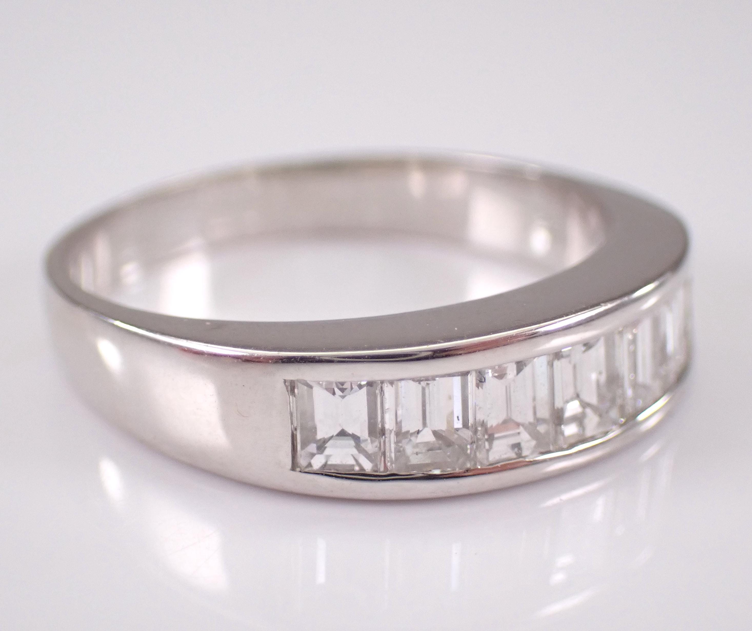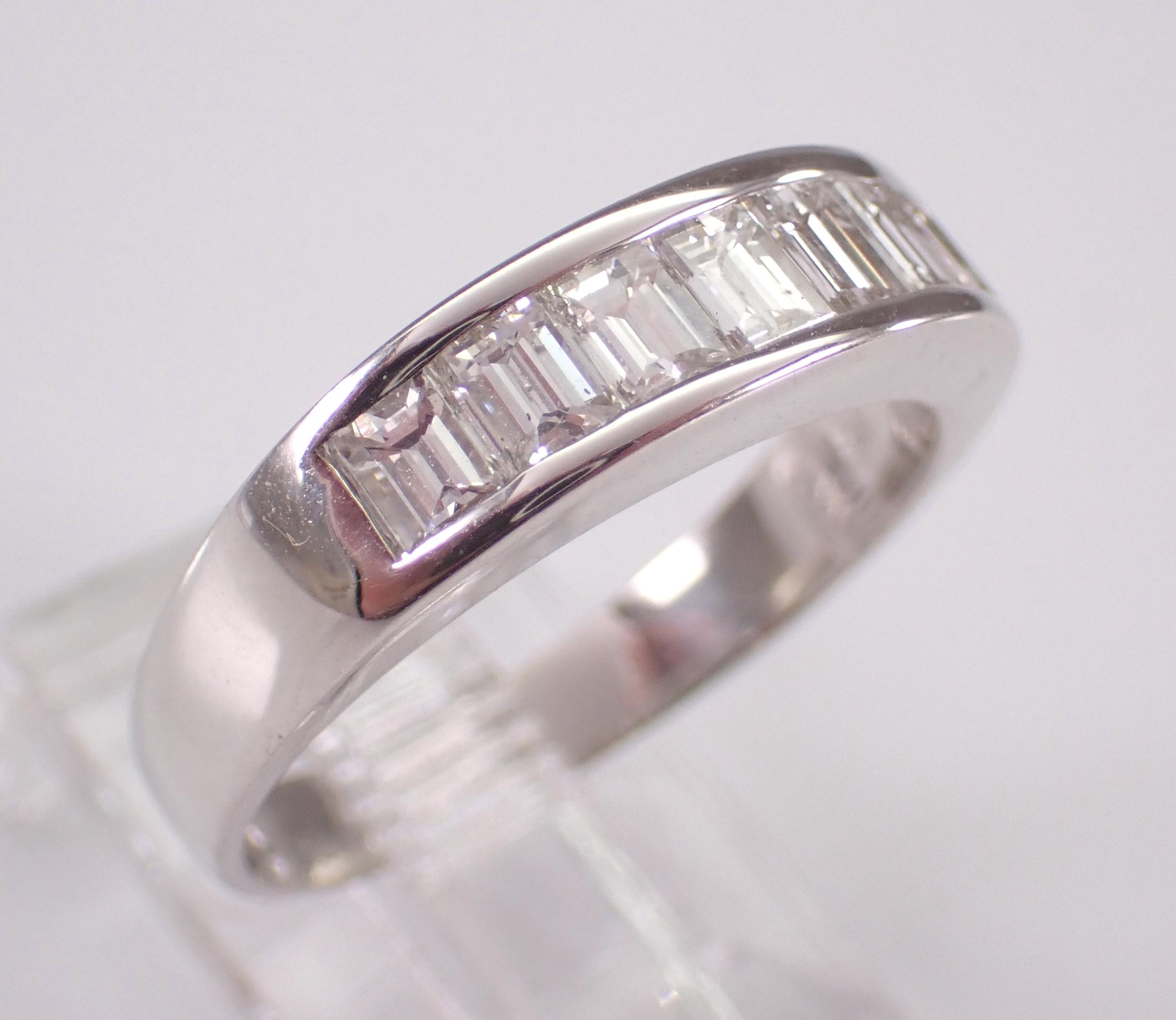 18K White diamond wedding band anniversary ring. This is a very beautiful ring set with seven Baguette Diamonds. These diamonds are G color, VS clarity and weigh a total of 3/4 carat. The ring is 18KT White Gold, weighs 4.7 grams, measures 5 mm in width and is a finger size 7 3/4, can be resized free of charge (please inquire about sizing with the finger size you need). This ring will be accompanied by an appraisal by a GIA Certified Diamond Grader with the retail replacement value of $3,895.00. I will ship this ring promptly in a gift box.