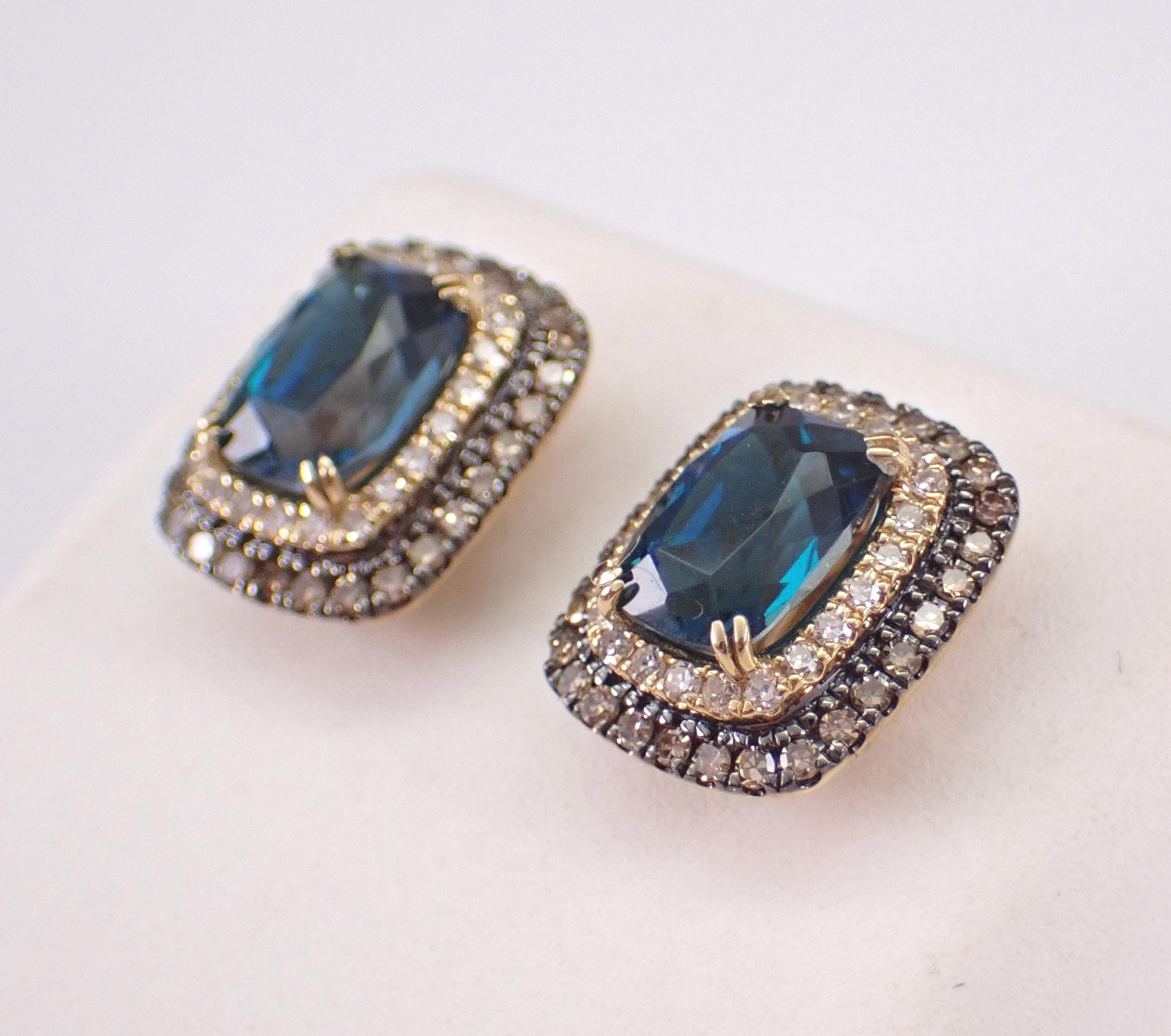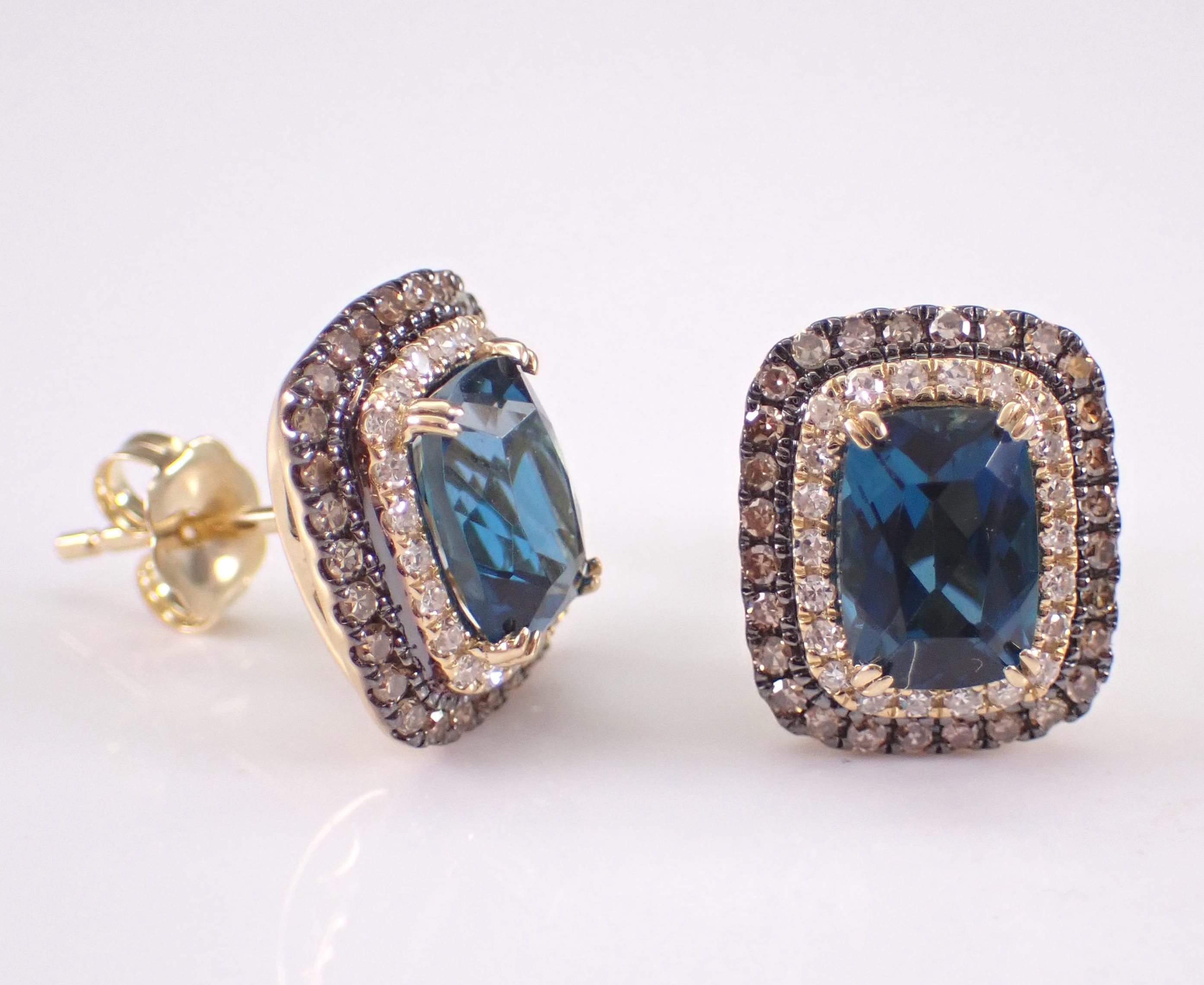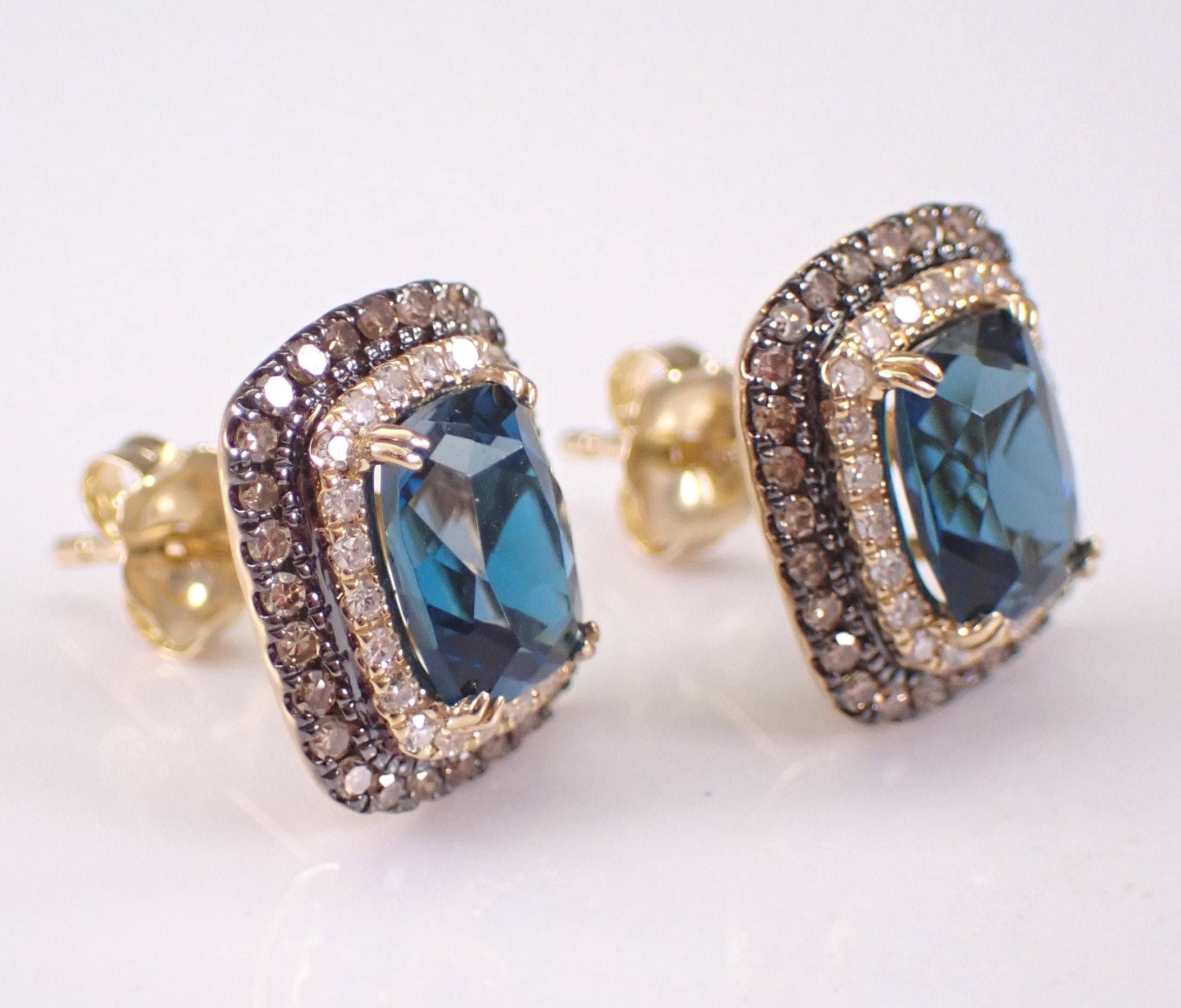 14K Yellow Gold Diamond and London Blue Topaz Halo Stud Earrings. There are two genuine Cushion Cut Blue Topaz, fifty-six Round Cognac color Brilliant Diamonds and forty-four natural Round Brilliant colorless Diamonds set in these earrings. The Blue Topaz is a darker London color, measure 7 X 5 mm each and weigh a total of 1 3/4 carat. The diamonds in these earrings are G color (white), SI1 clarity and weigh a total of .35 carat. These earrings are 14KT Yellow Gold, measure 11 X 9 mm each and weigh a total of 2.2 grams. These earrings are for pierced ears and have a friction back posts. These earrings will be accompanied by an appraisal written by a GIA Certified Diamond Grader with the retail replacement value of $1,695.00. I will ship these earrings promptly in a gift box.