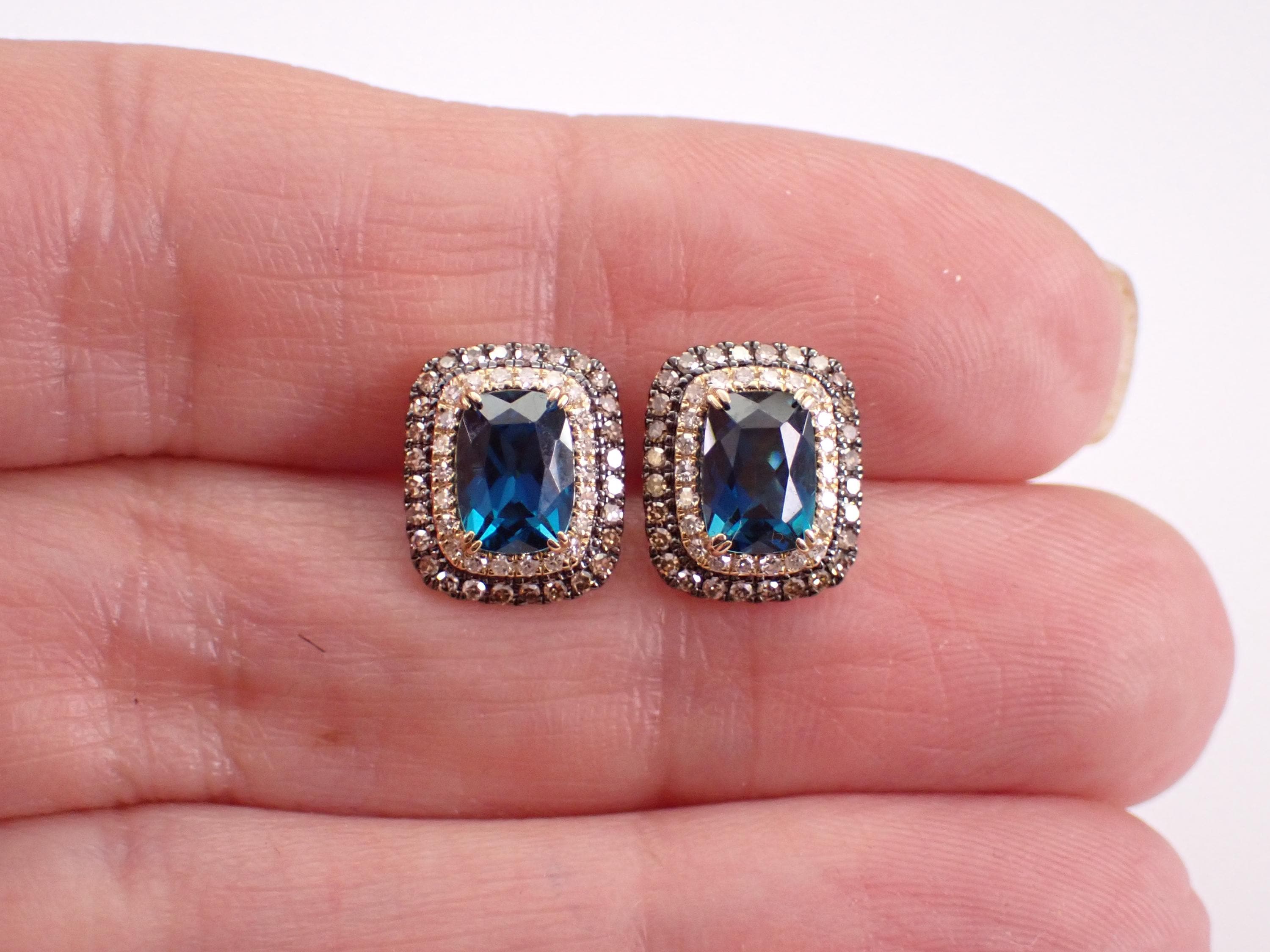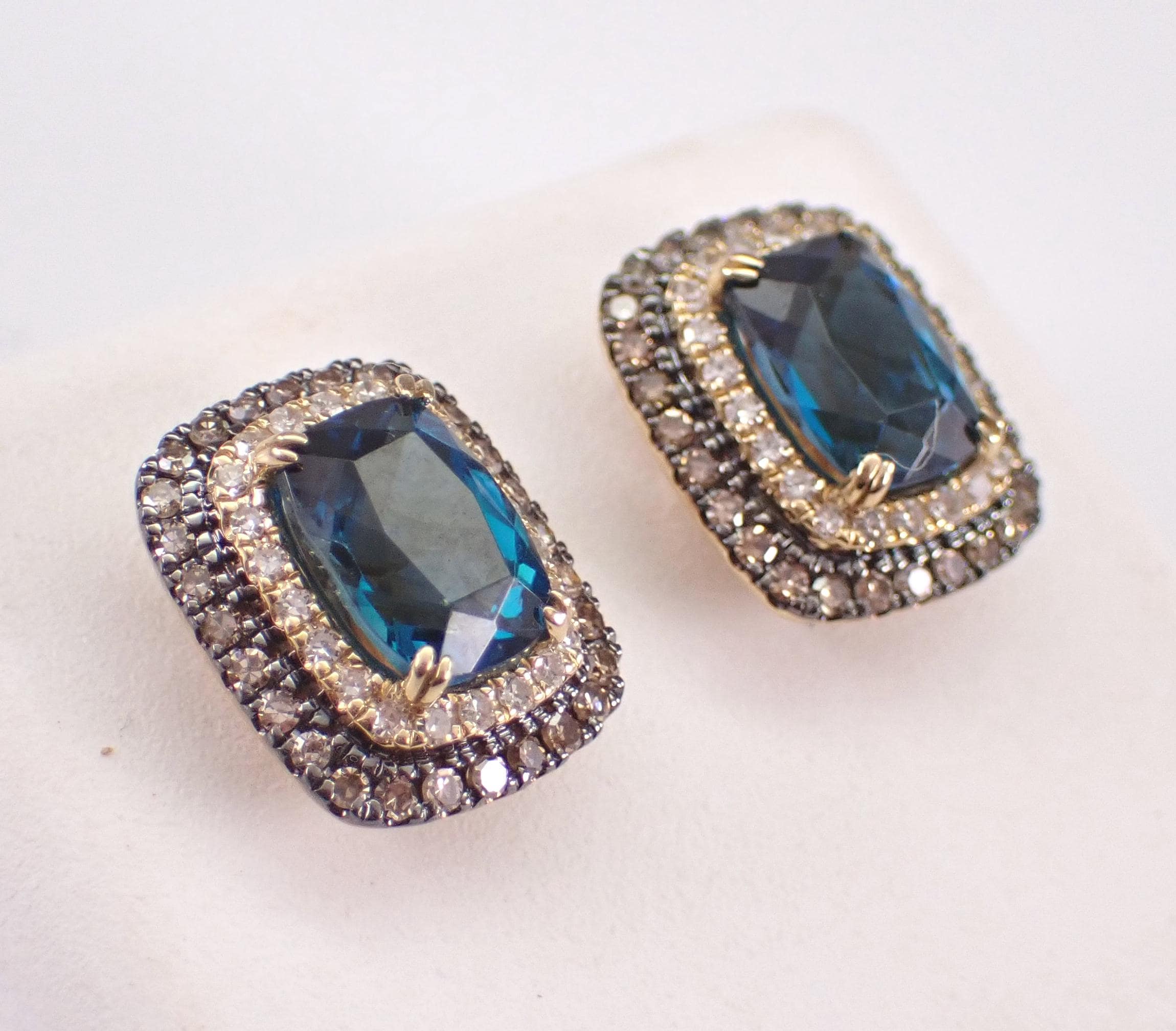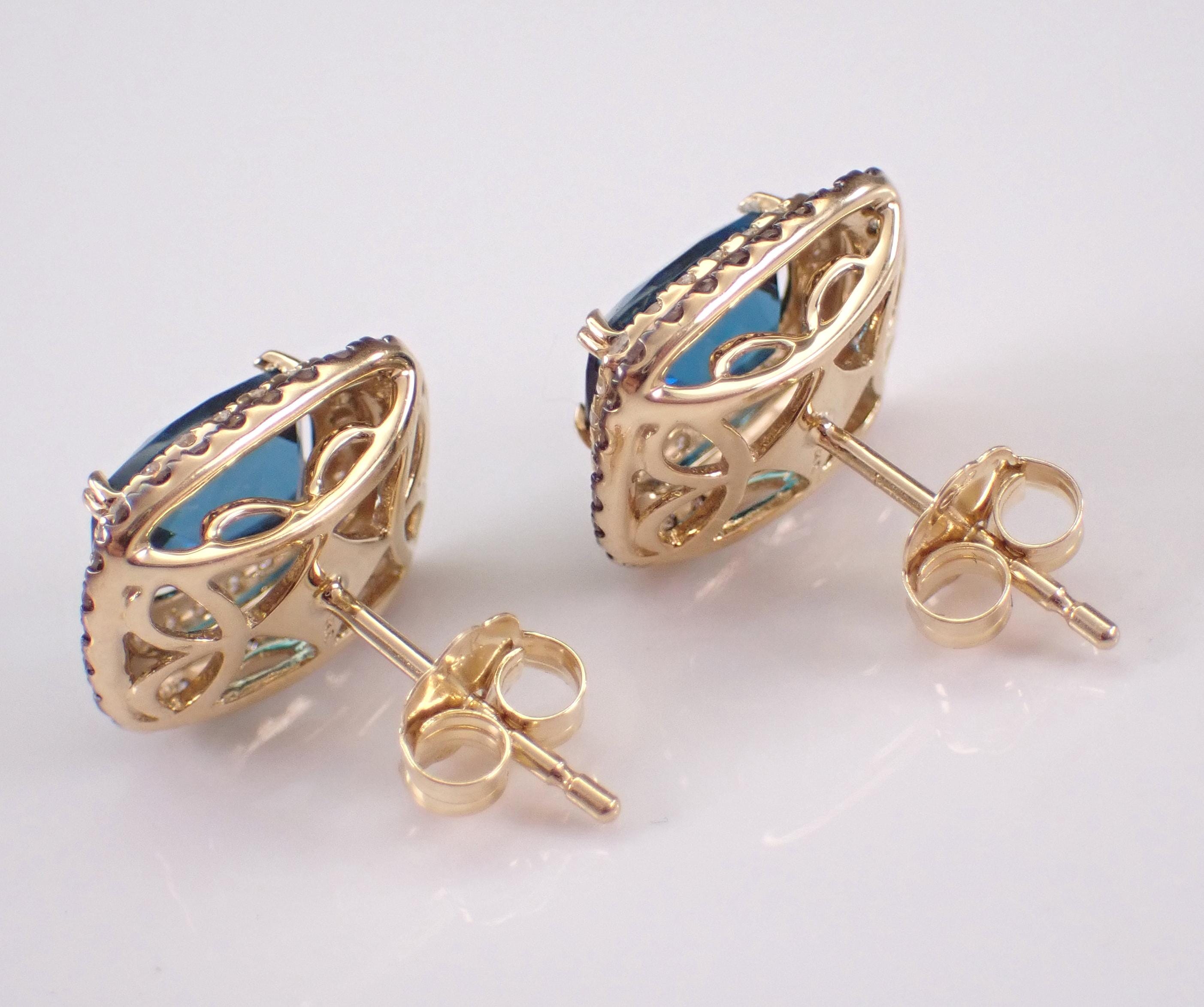 14K Yellow Gold Diamond and London Blue Topaz Halo Stud Earrings. There are two genuine Cushion Cut Blue Topaz, fifty-six Round Cognac color Brilliant Diamonds and forty-four natural Round Brilliant colorless Diamonds set in these earrings. The Blue Topaz is a darker London color, measure 7 X 5 mm each and weigh a total of 1 3/4 carat. The diamonds in these earrings are G color (white), SI1 clarity and weigh a total of .35 carat. These earrings are 14KT Yellow Gold, measure 11 X 9 mm each and weigh a total of 2.2 grams. These earrings are for pierced ears and have a friction back posts. These earrings will be accompanied by an appraisal written by a GIA Certified Diamond Grader with the retail replacement value of $1,695.00. I will ship these earrings promptly in a gift box.