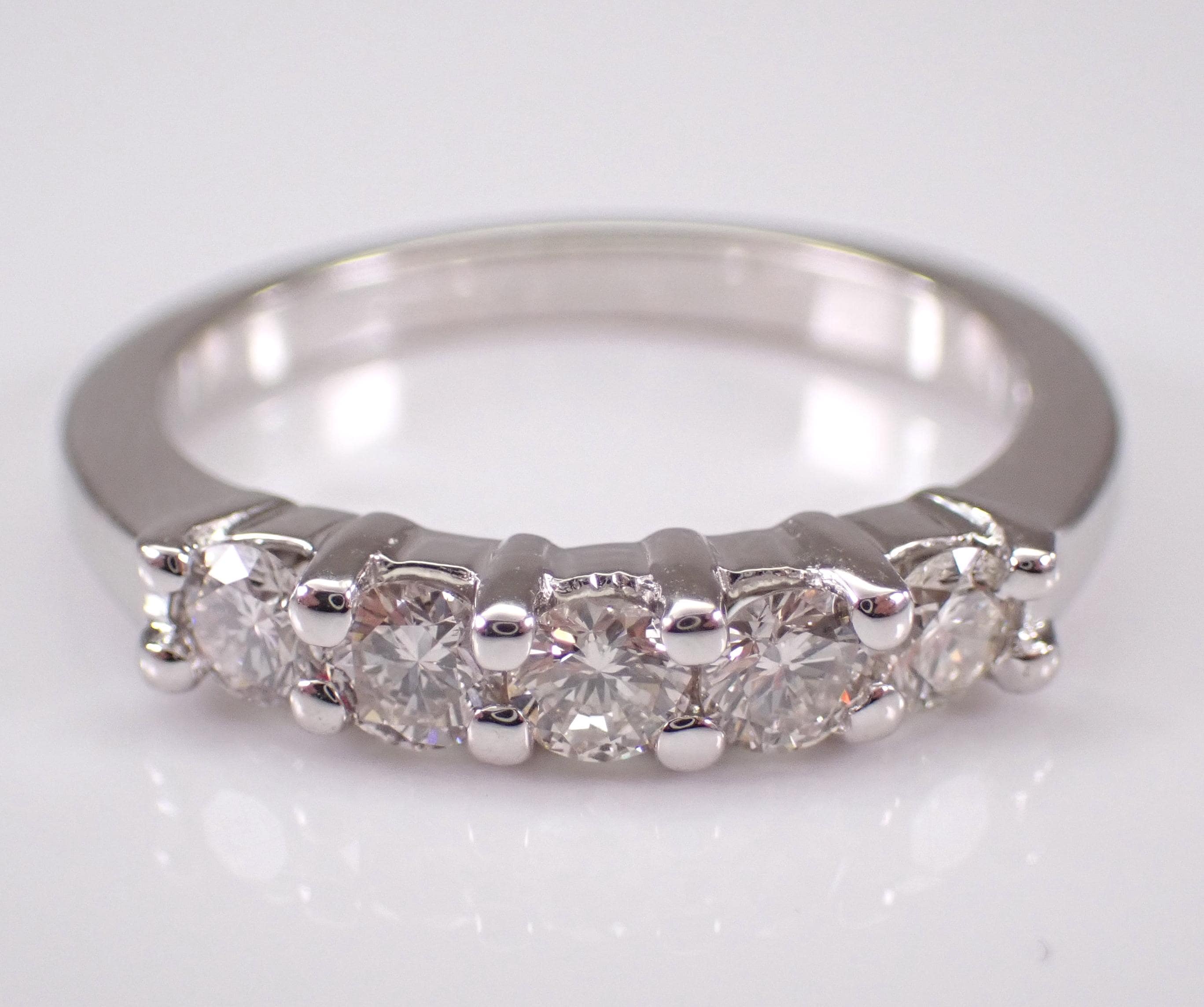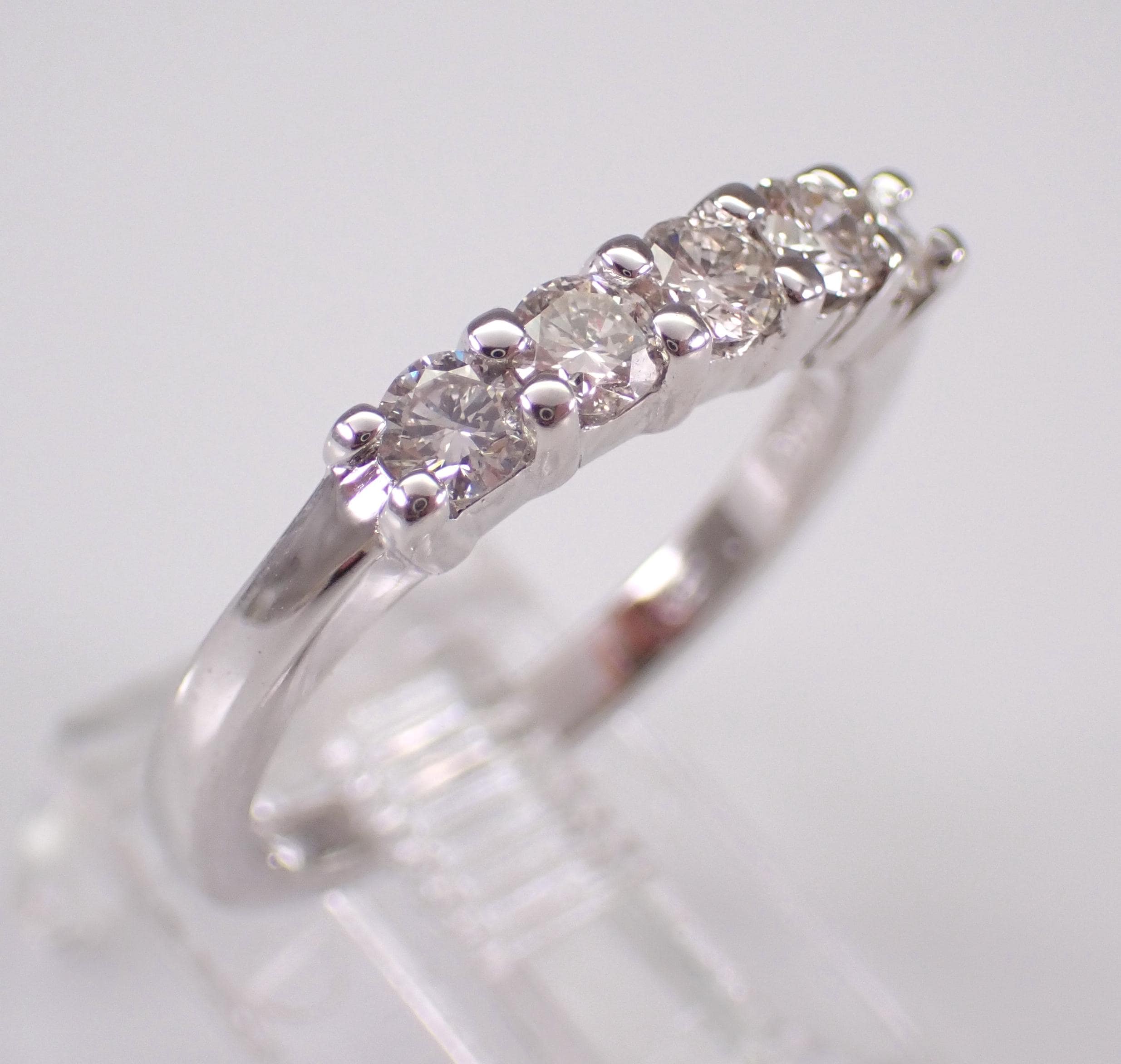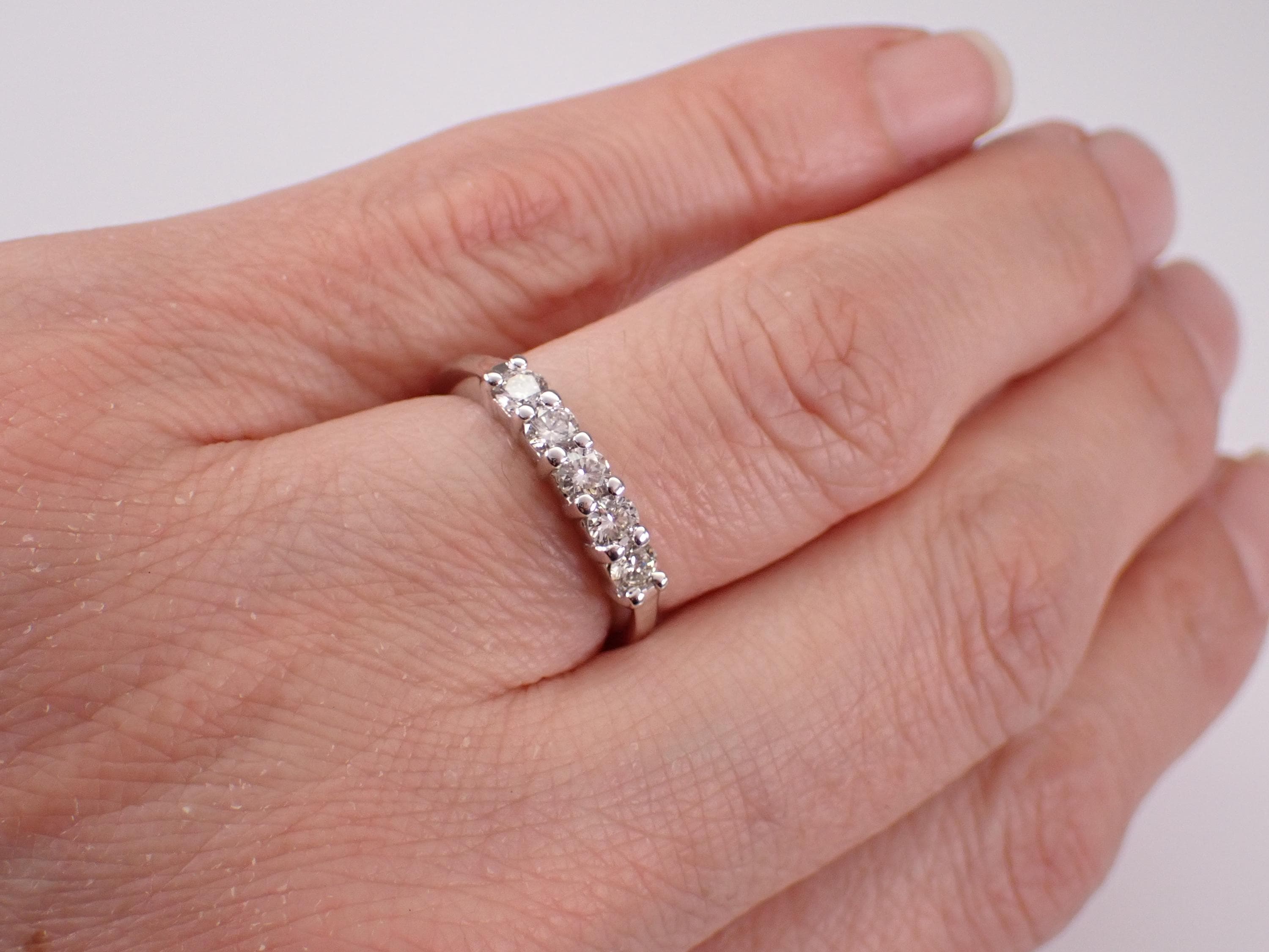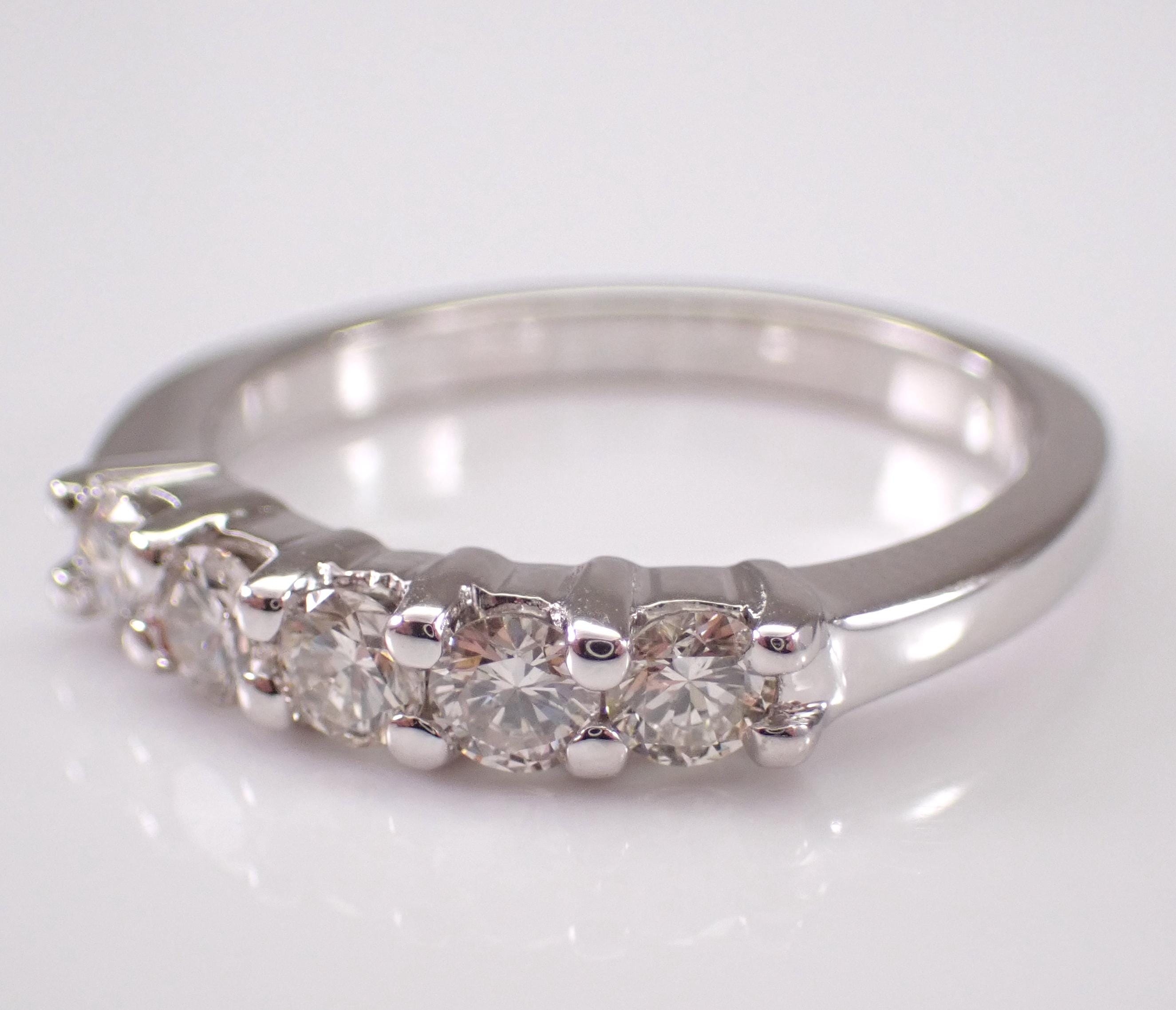 14K White Gold Diamond Wedding Ring Anniversary Band. This ring is set with five genuine round brilliant diamonds. These diamonds are I color, VS2 clarity and weigh a total of 1/2 carat. This ring is 14KT White Gold, weighs 3.1 grams and is a finger size 6, can be resized (please inquire about sizing with the finger size you need). This ring will be accompanied by an appraisal written by a GIA Certified Diamond Grader with the retail replacement value of $1,895.00. I will ship this ring promptly in a beautiful gift box.