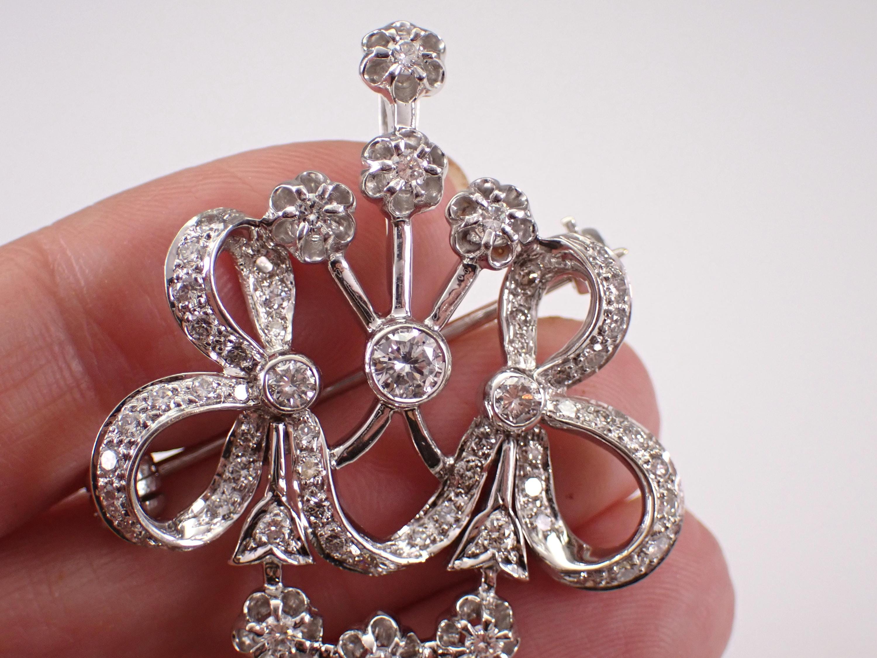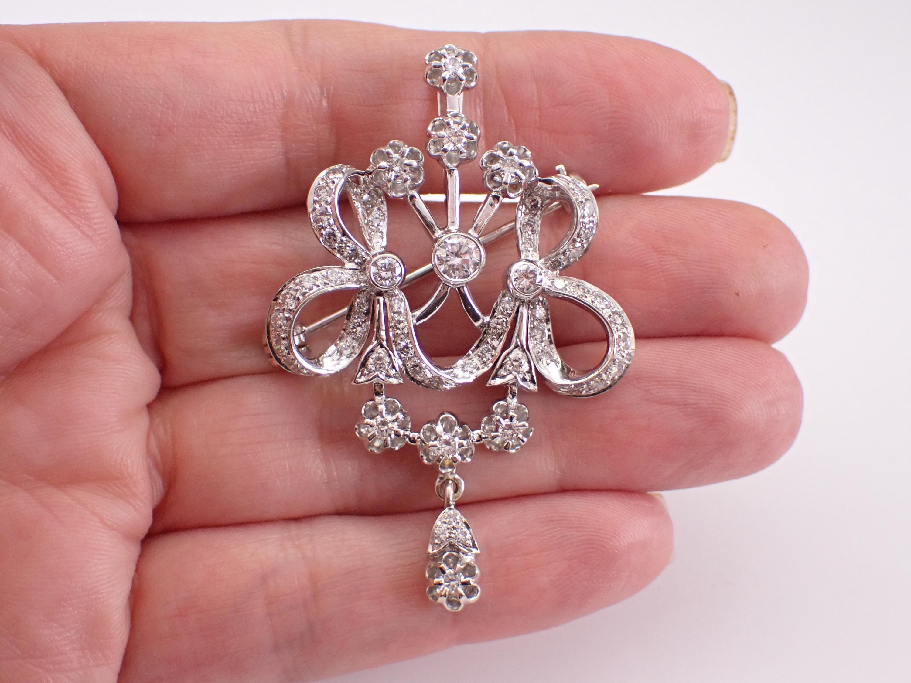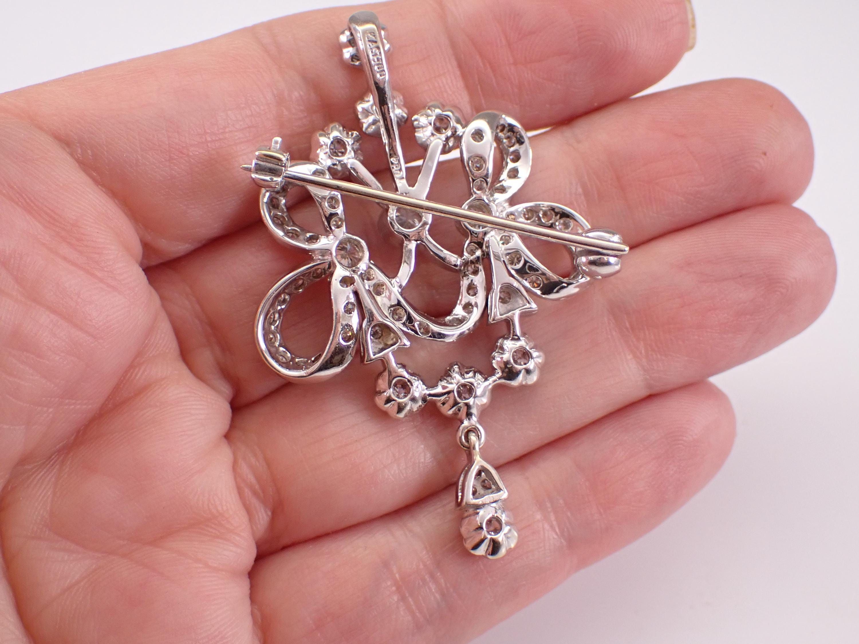 Antique 18K White Gold Diamond Brooch which can be work like a pendant. This pin is set with sixty-three Round Brilliant Diamonds. These diamonds are G color, SI clarity and combine to a total diamond weight of 2 carats. This brooch weighs 18.3 grams and measures 55 X 36 mm. This brooch will also be accompanied by an appraisal by a GIA Certified Diamond Grader with the replacement value of $11,895.00. I will ship this pin promptly in a beautiful gift box.