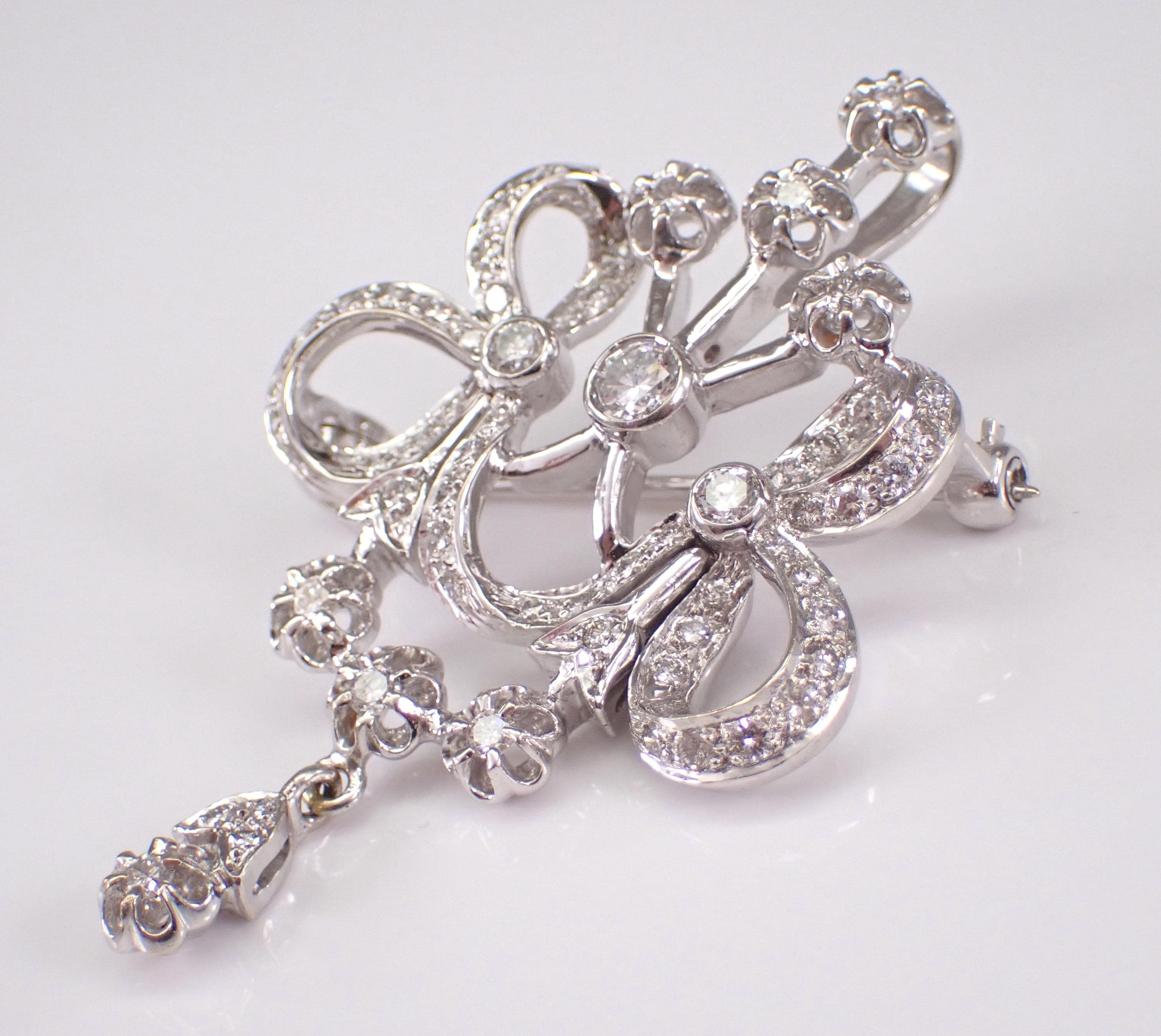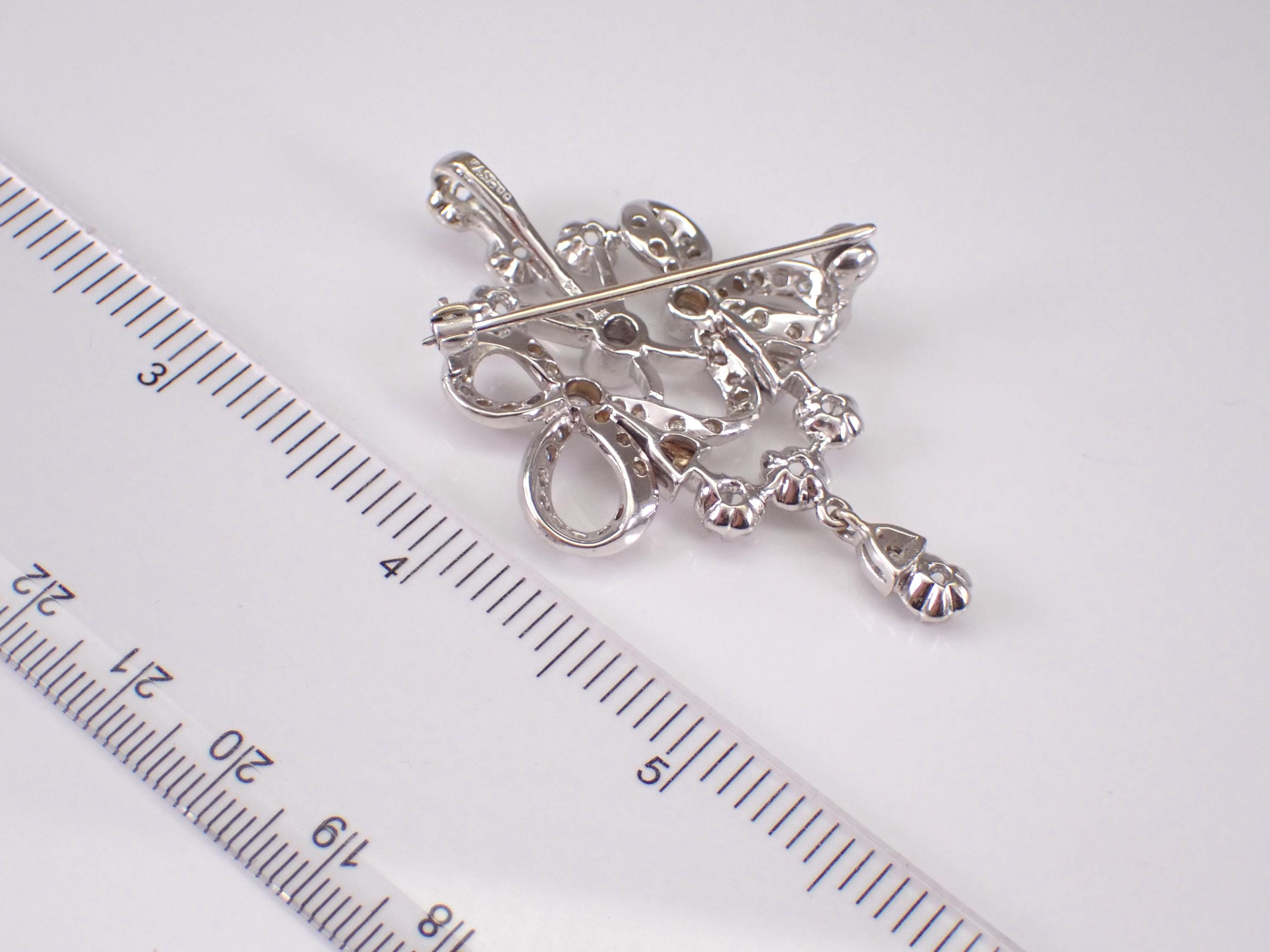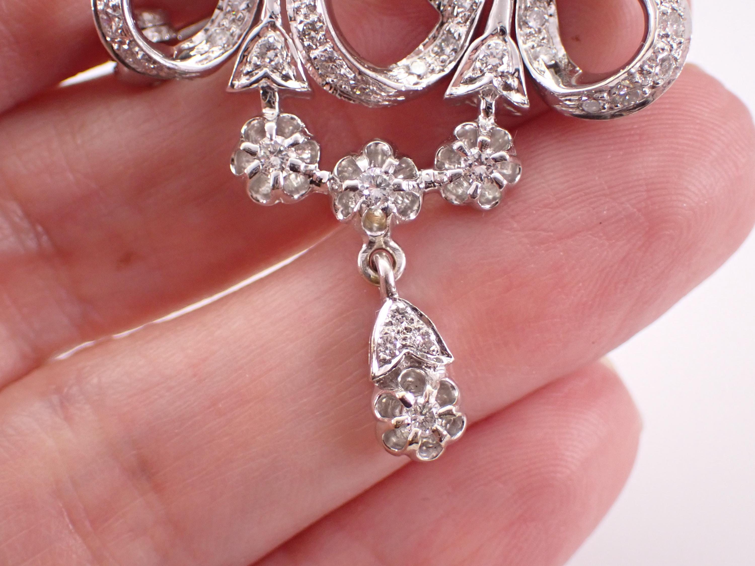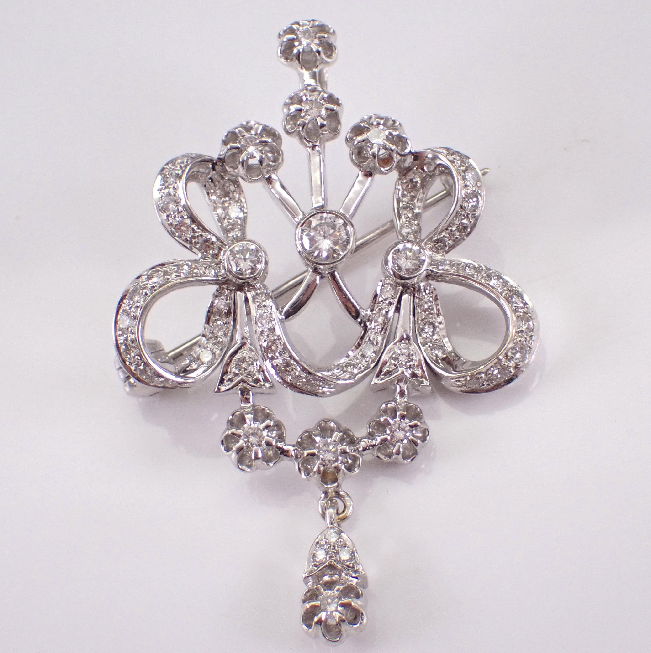 Antique 18K White Gold Diamond Brooch which can be work like a pendant. This pin is set with sixty-three Round Brilliant Diamonds. These diamonds are G color, SI clarity and combine to a total diamond weight of 2 carats. This brooch weighs 18.3 grams and measures 55 X 36 mm. This brooch will also be accompanied by an appraisal by a GIA Certified Diamond Grader with the replacement value of $11,895.00. I will ship this pin promptly in a beautiful gift box.