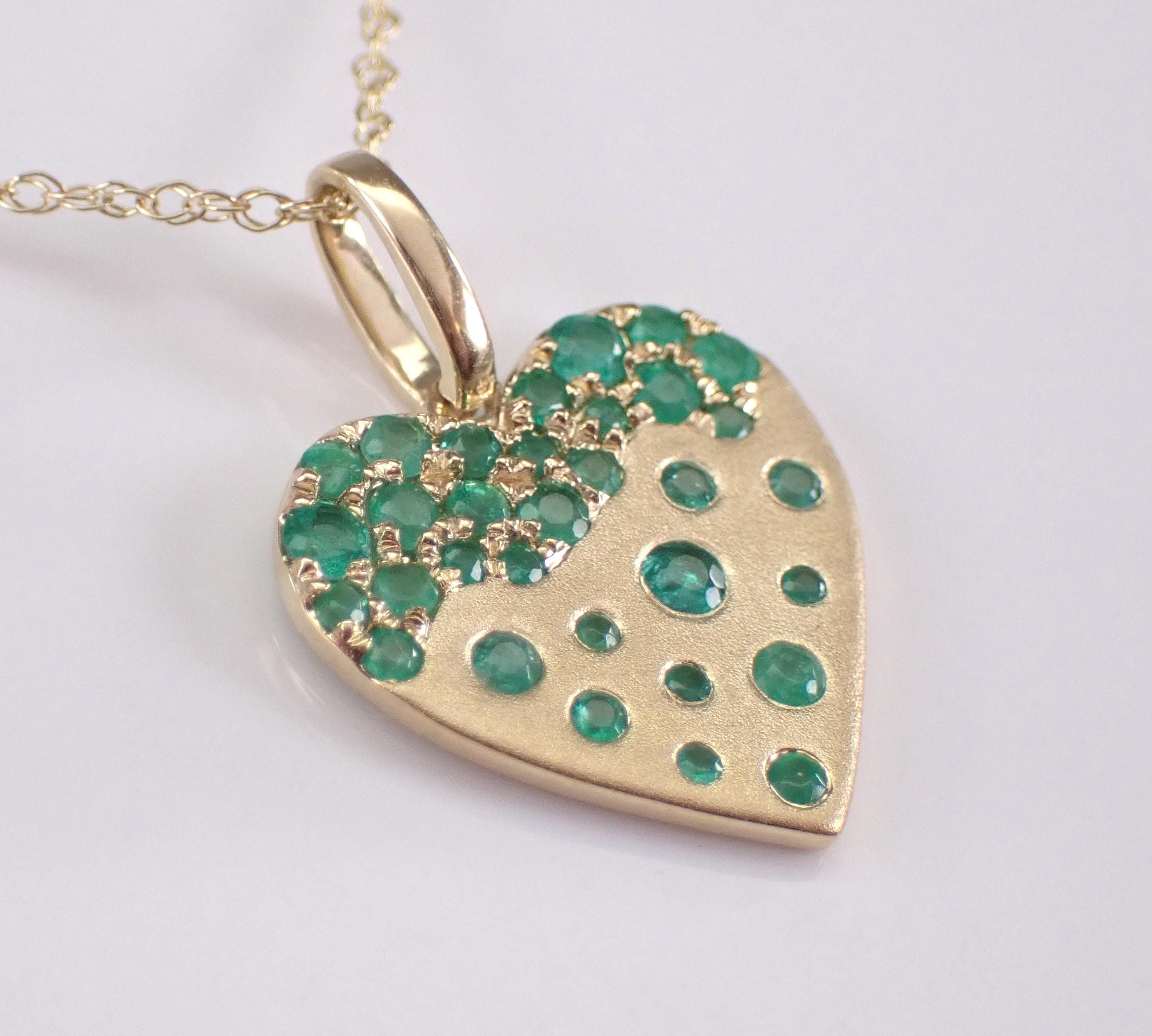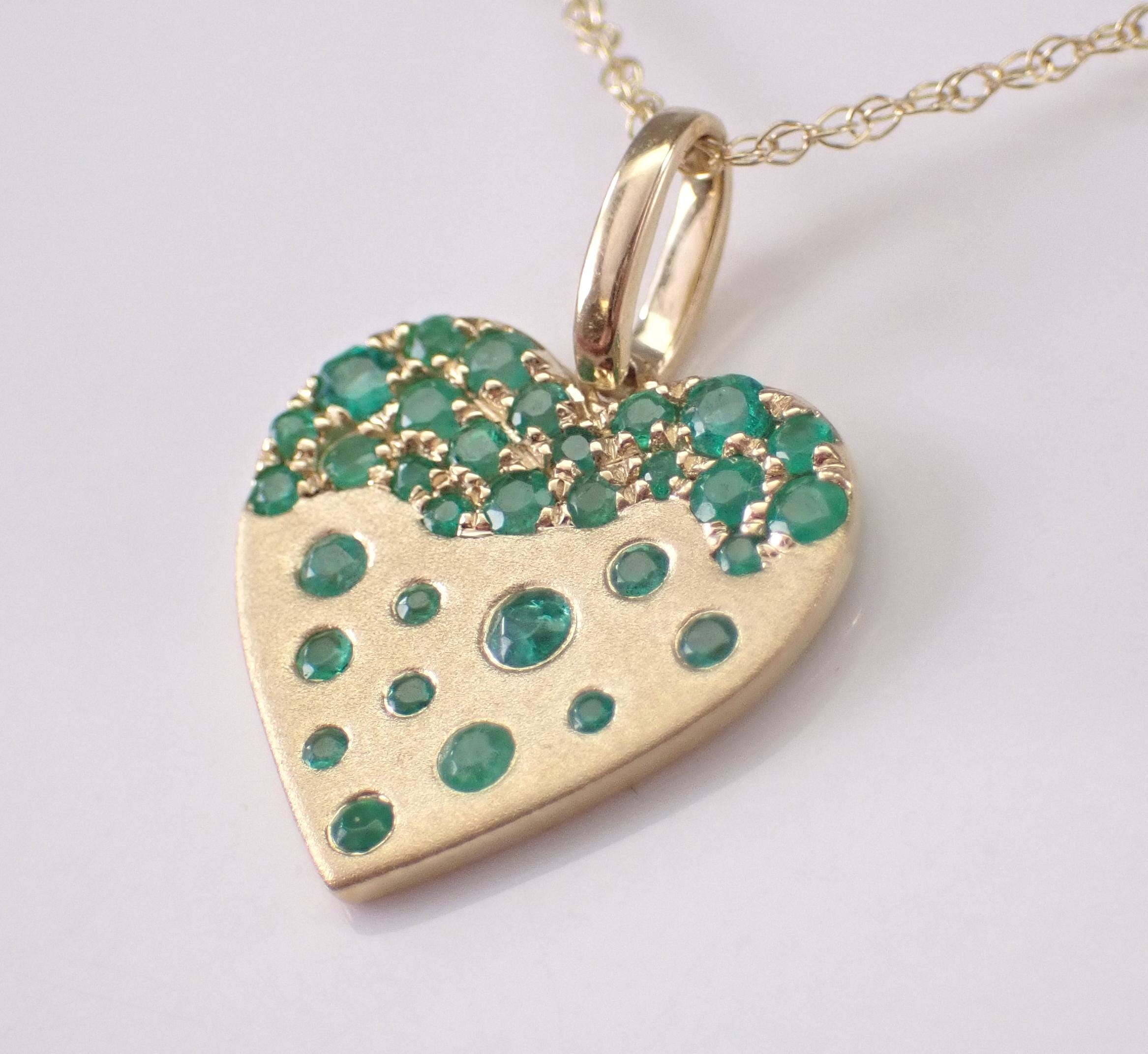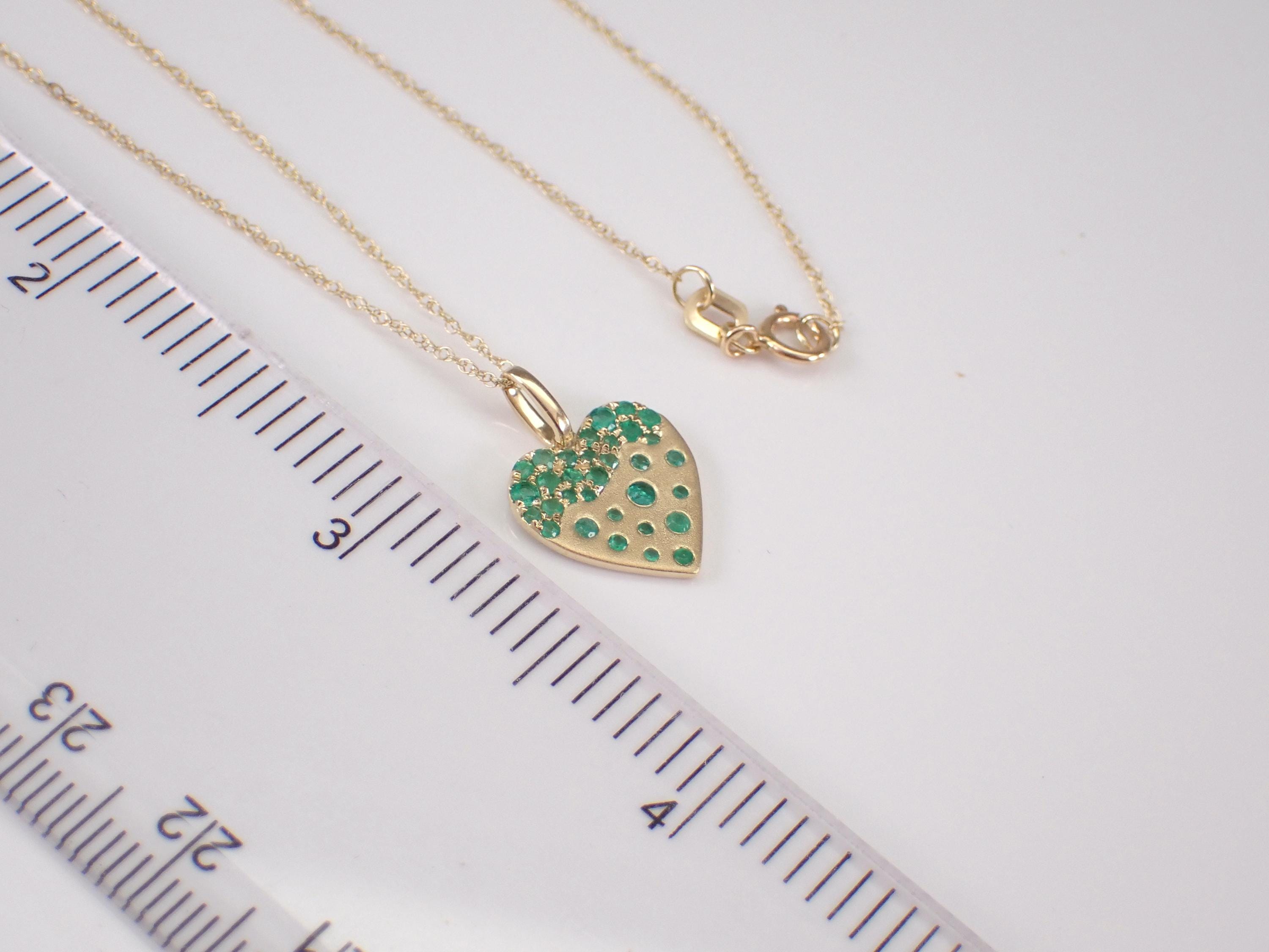 Yellow Gold Emerald Heart Charm Pendant with Chain. This pendant is set with thirty-two genuine natural round Emeralds. These Emeralds weigh a total of .40 carat. This pendant is 10KT Yellow Gold and comes with an 18" 10KT Yellow Gold chain. Both the pendant and chain weigh a total of 1.5 grams and the pendant measures 12.5 X 12.5 mm. This necklace will be accompanied by an appraisal written by a GIA Certified Diamond Grader with the retail replacement value of $1,395.00. I will ship this necklace promptly in a beautiful gift box.