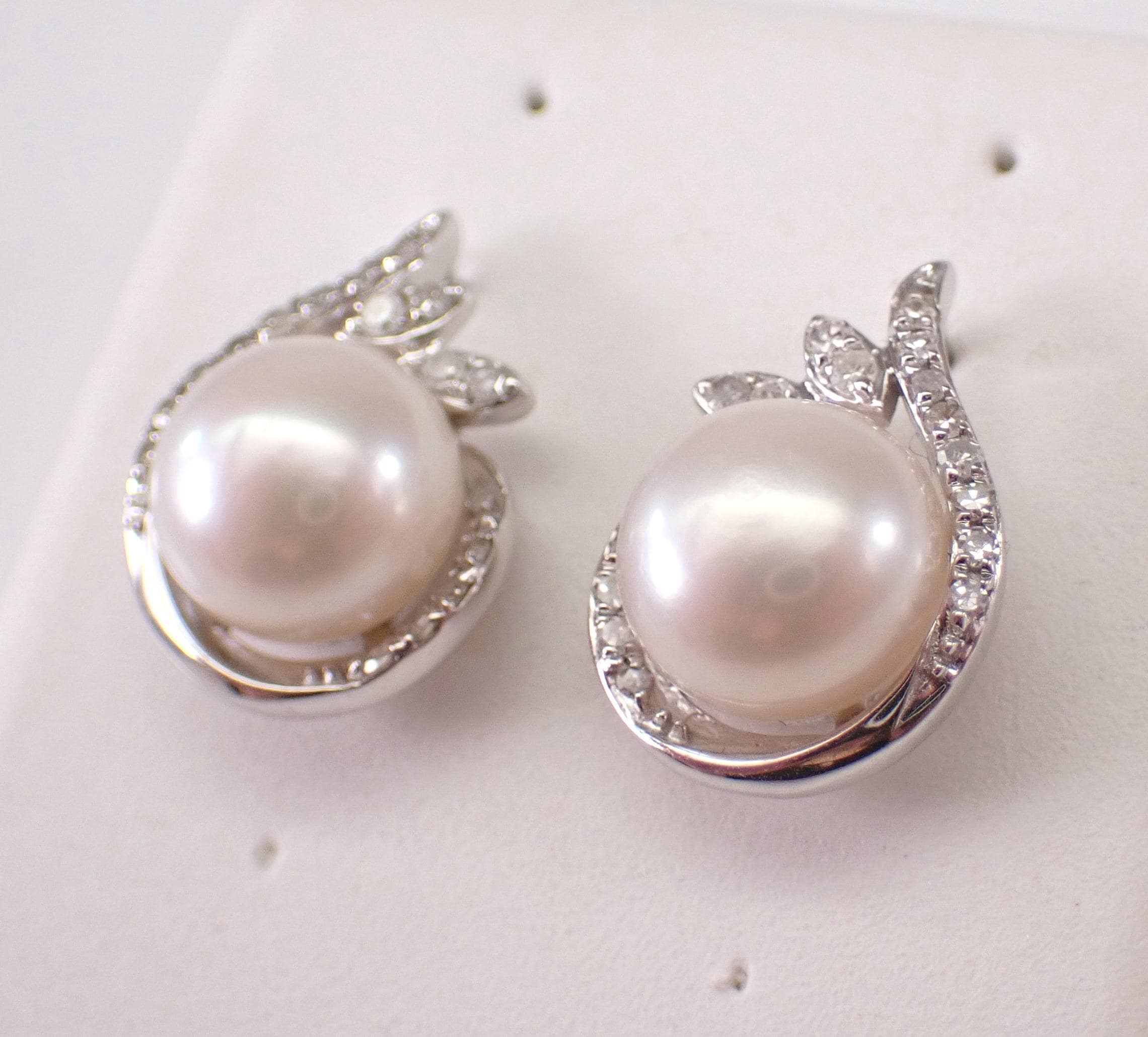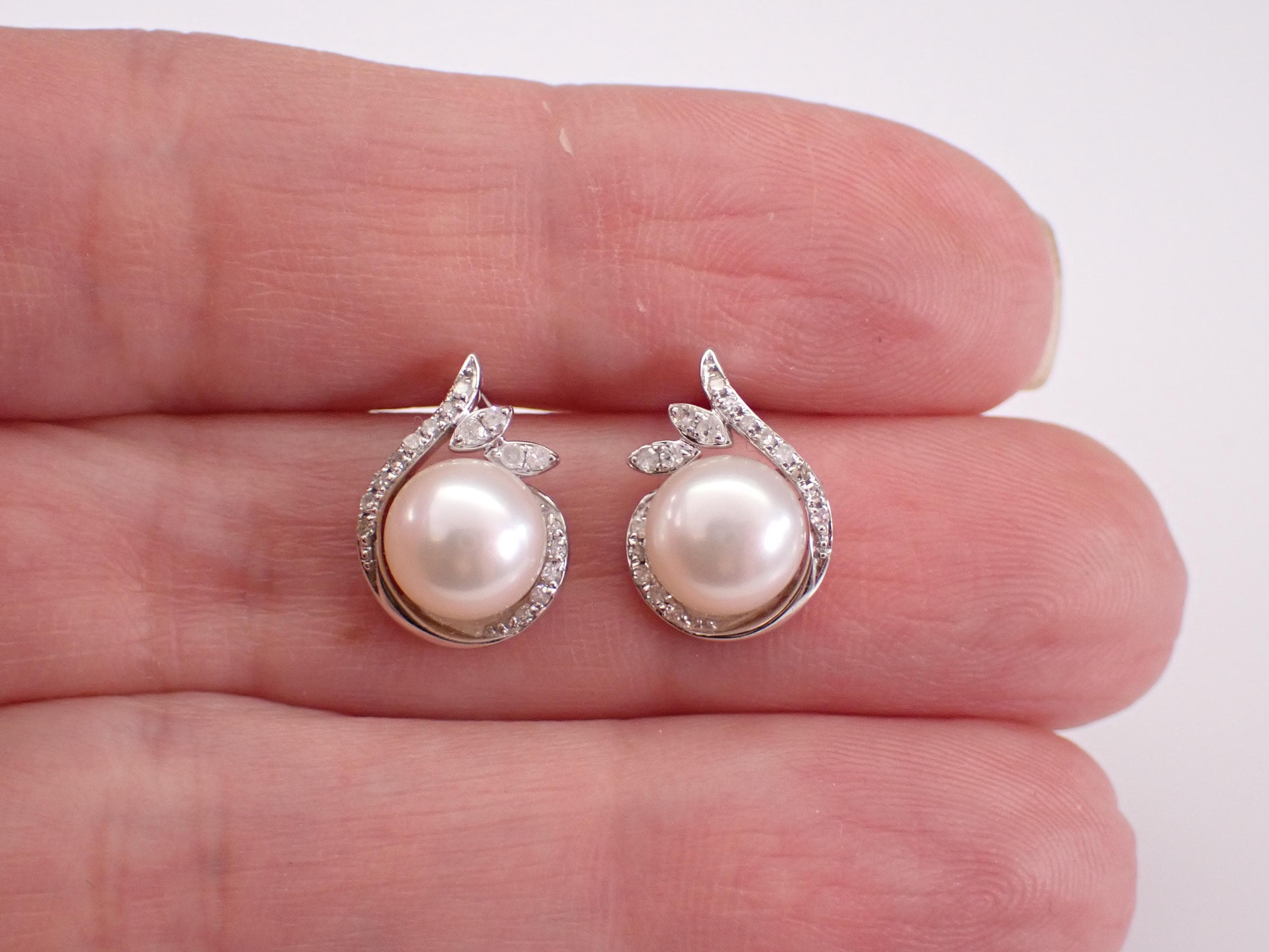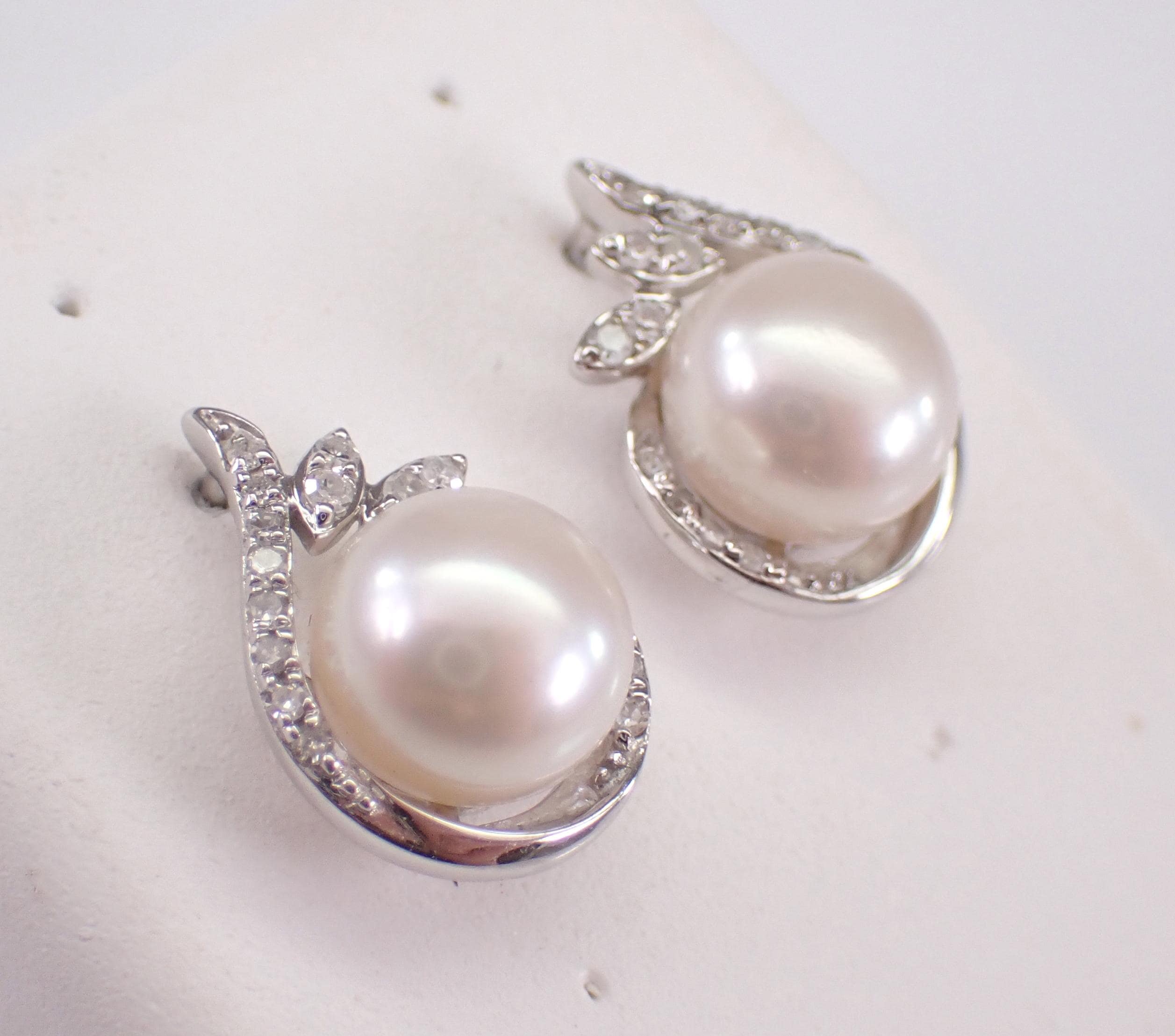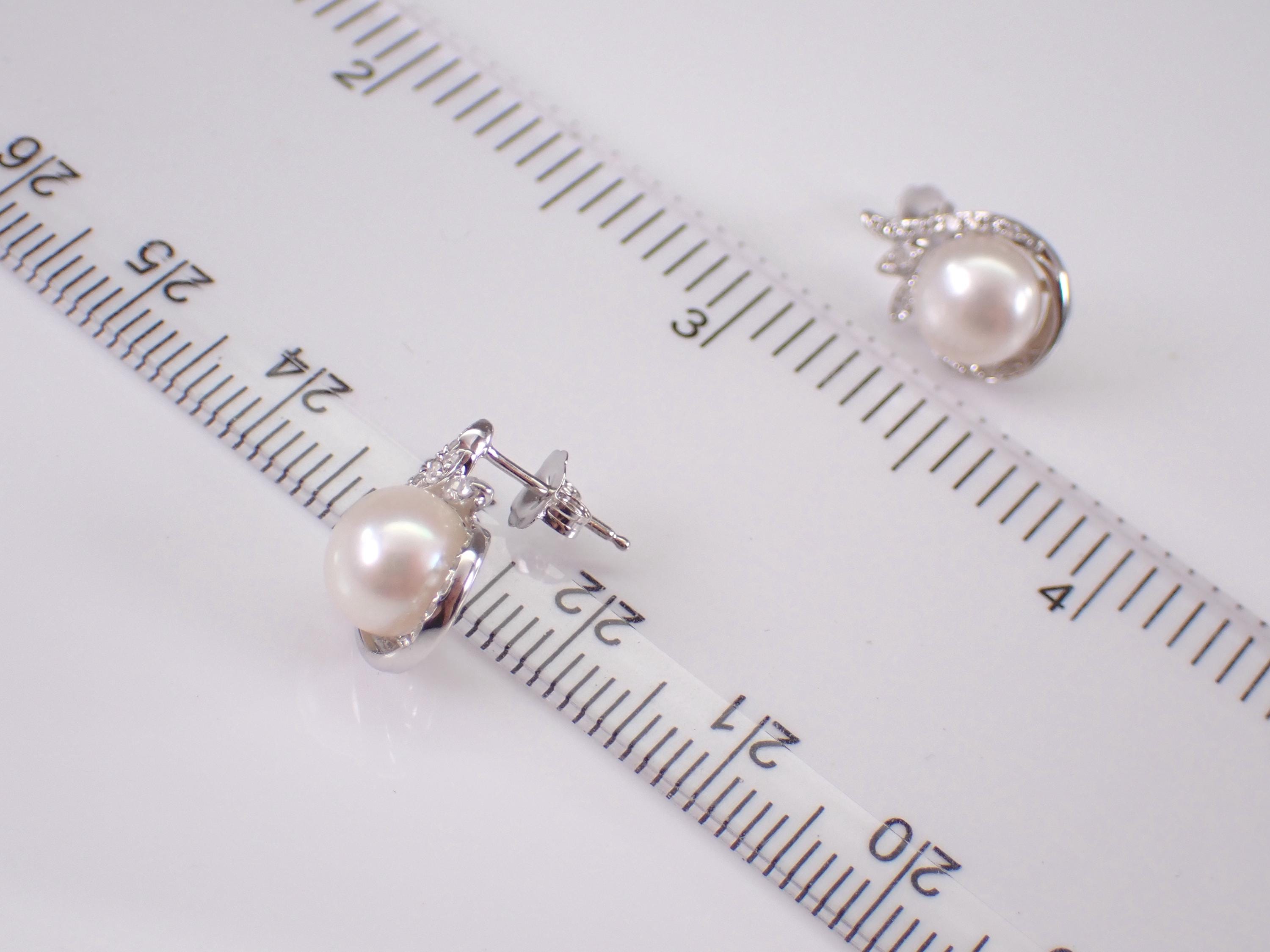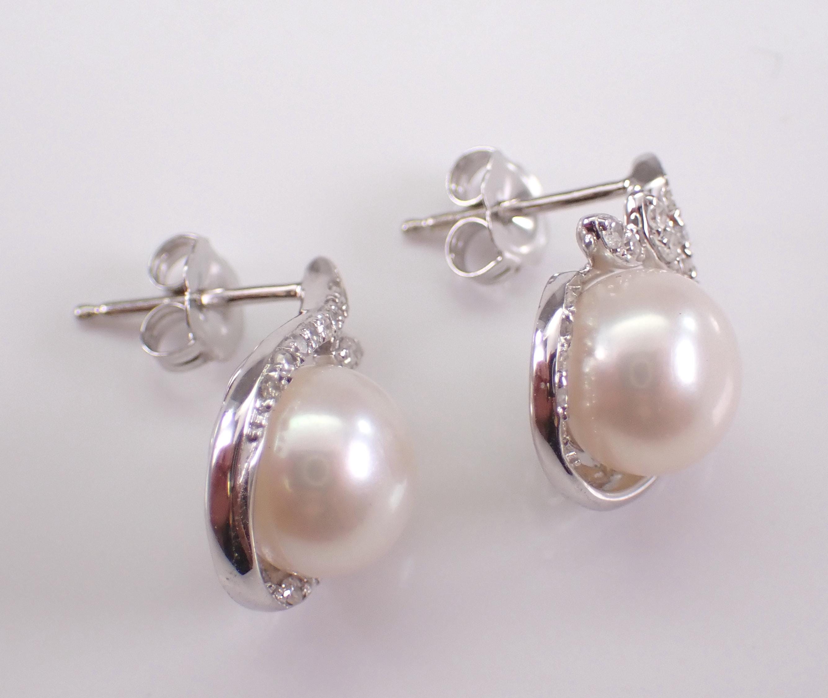 14K White Gold Pearl and Diamond Stud Earrings. These earrings are set with two Round White Pearls and thirty-two genuine Round Brilliant Diamonds. These Pearls measure 7.4 mm in diameter each. The Diamonds in these earrings are H color, SI/I1 clarity and weigh a total of .17 carat. These earrings are 14KT White Gold and weigh a total of 3.0 grams. These earrings are for pierced ears, measure 14 X 10 mm and the earrings have friction post backings. These earrings will be accompanied by an appraisal written by a GIA Certified Diamond Grader with the retail replacement value of $1,495.00. I will ship these earrings promptly in a gift box.