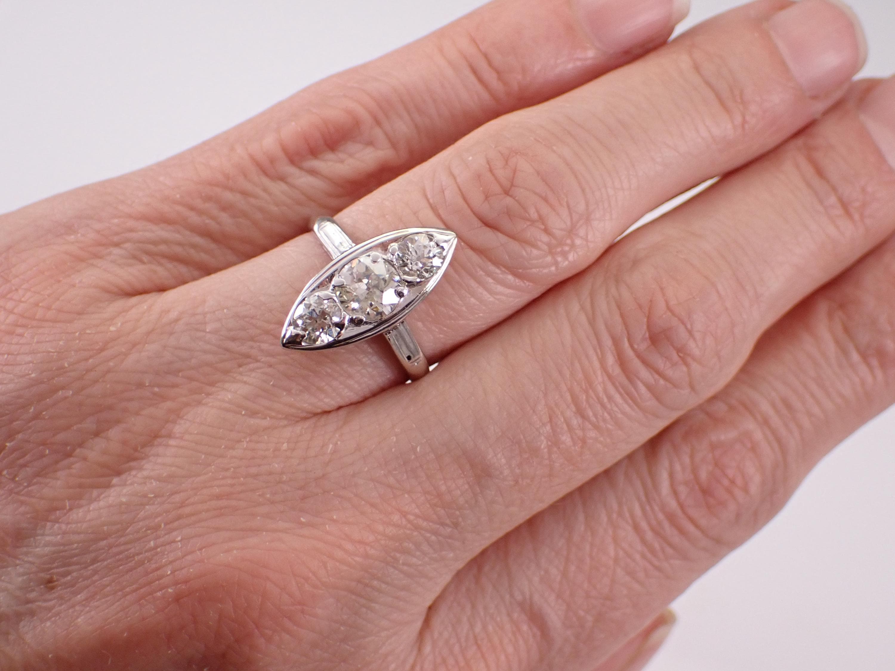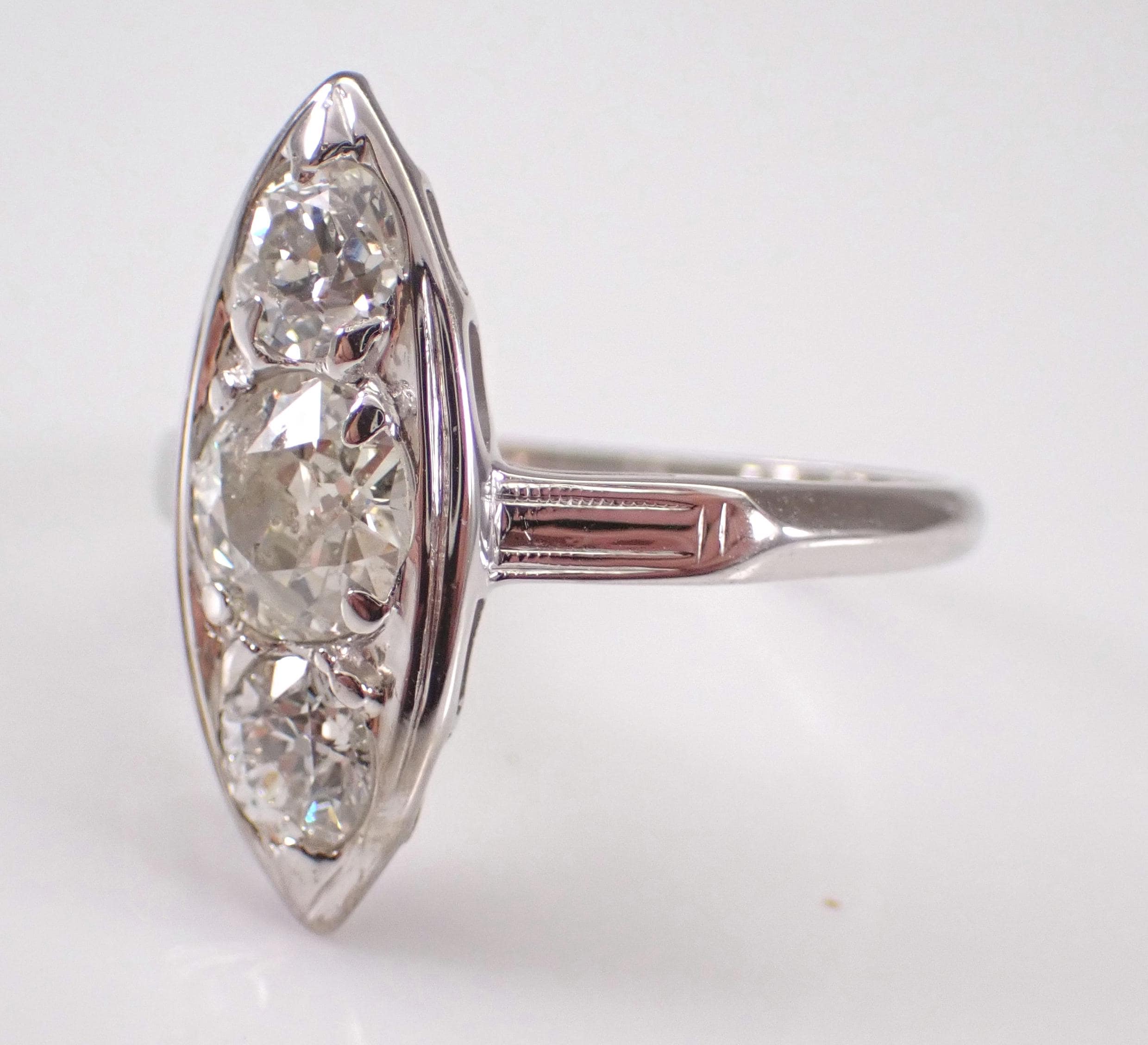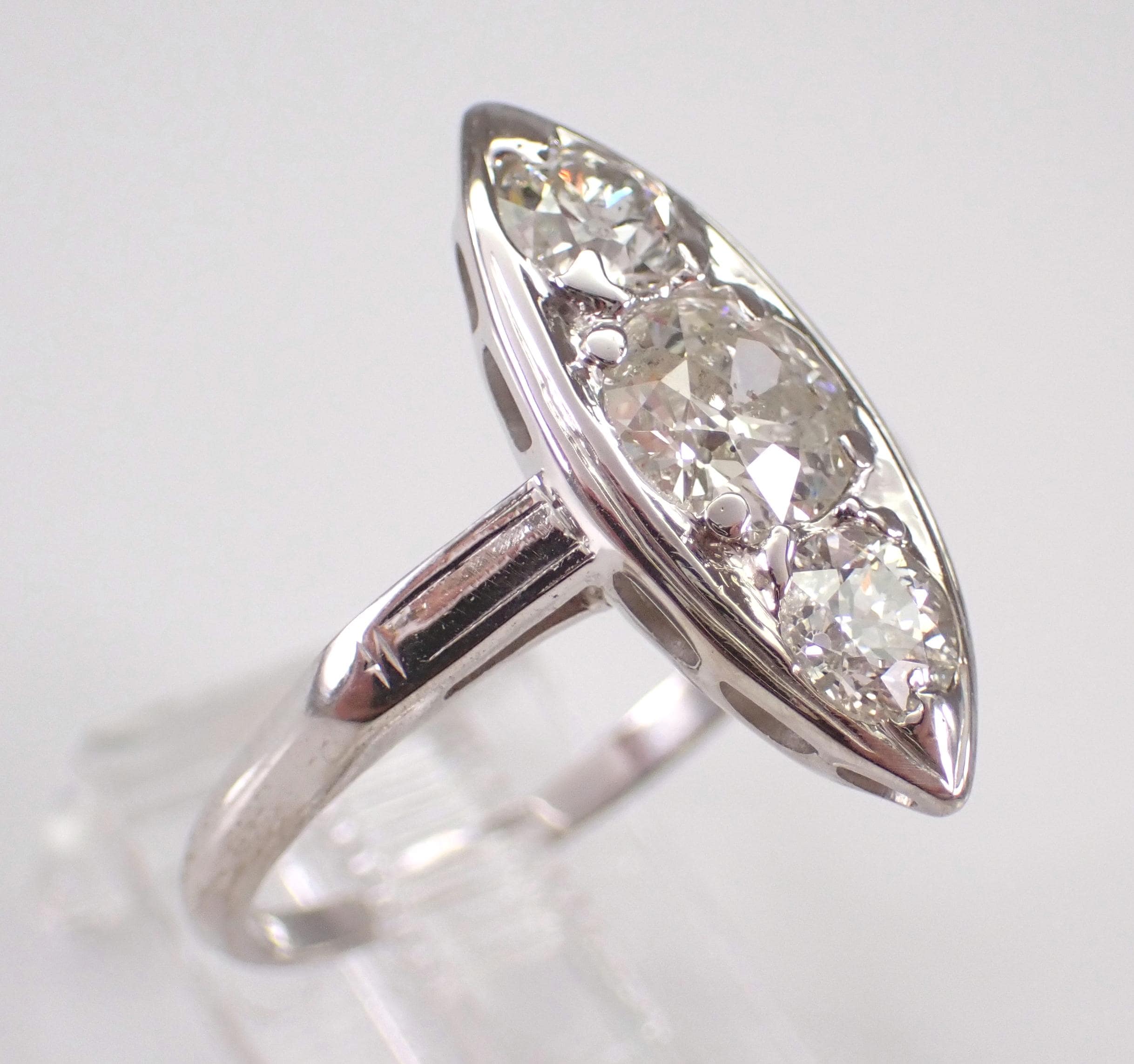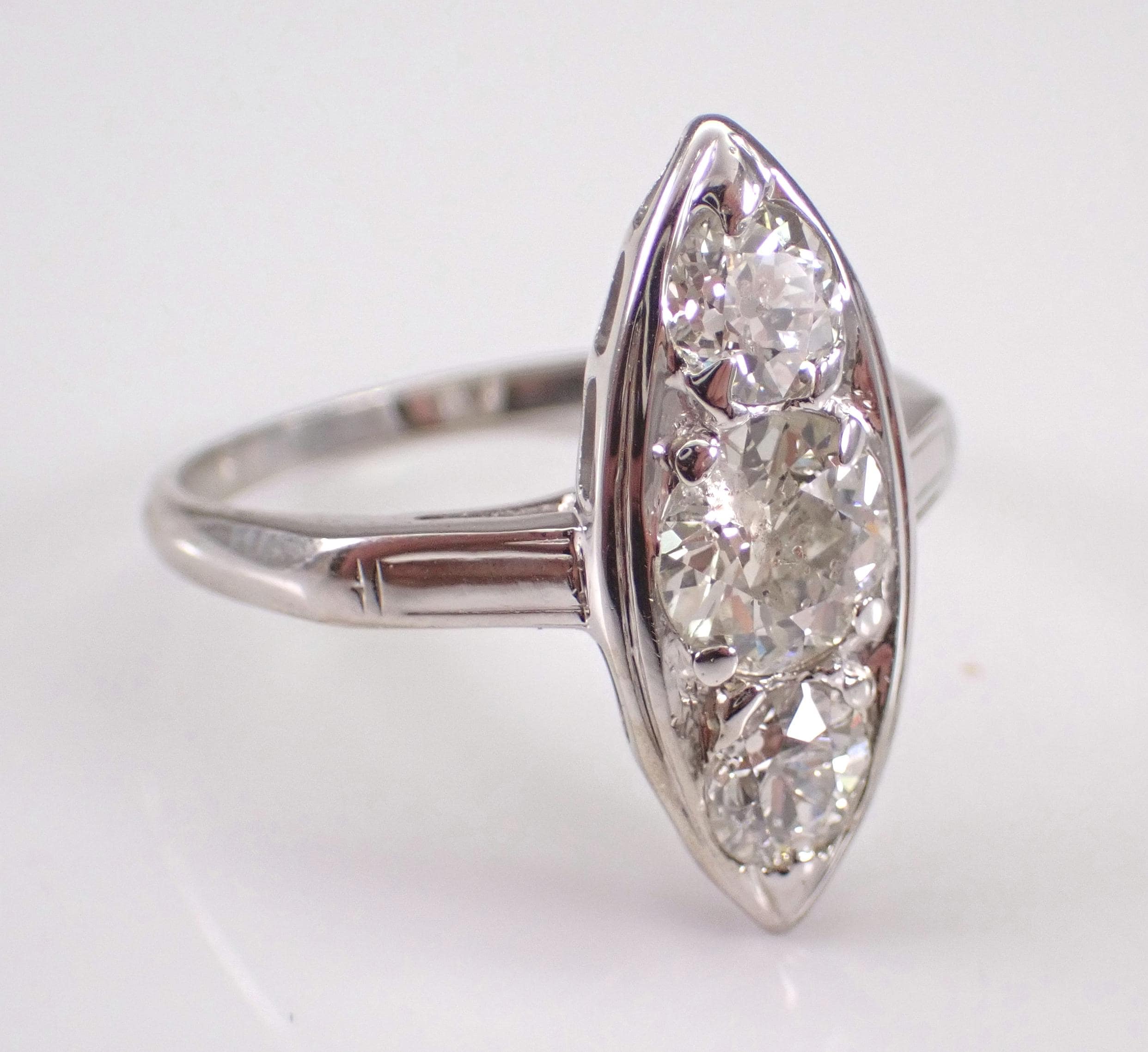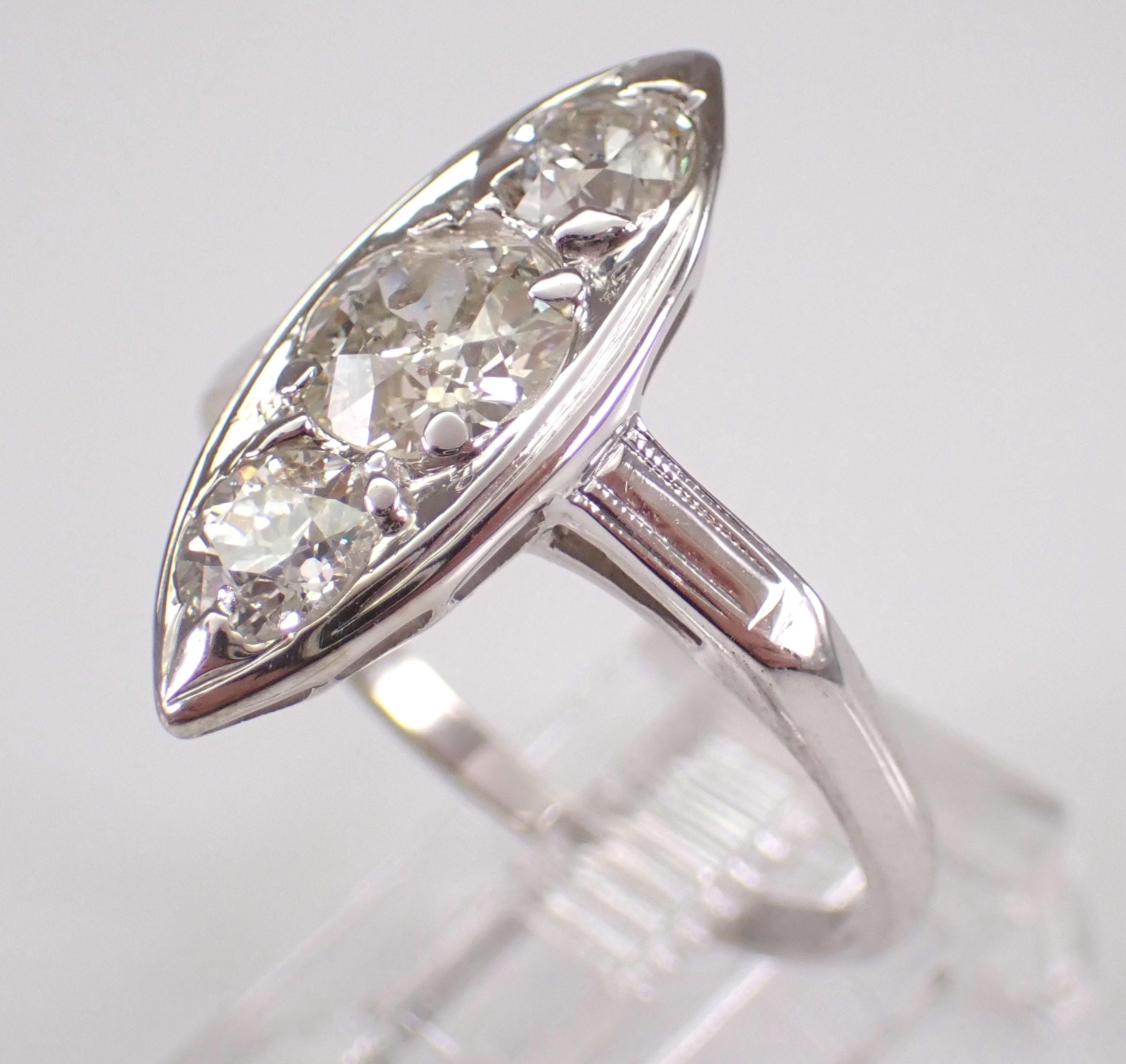 Antique Vintage 14K White Gold Diamond Ring. This ring is set with three genuine Round Old Miner Diamonds. The center diamond is H color, I1 clarity and weighs .90 carat. The two side diamonds are H color, I1 clarity and weigh a total of .60 carat. This ring is 14KT White Gold, weighs 3.3 grams, measures 19.5 mm along the finger and is a finger size 6 3/4, which can be resized (please inquire about sizing with the finger size that you need). This ring is in excellent condition and will be accompanied by an appraisal by a GIA Certified Diamond Grader with the retail replacement value of $6,495.00. I will ship this ring promptly in a gift box.