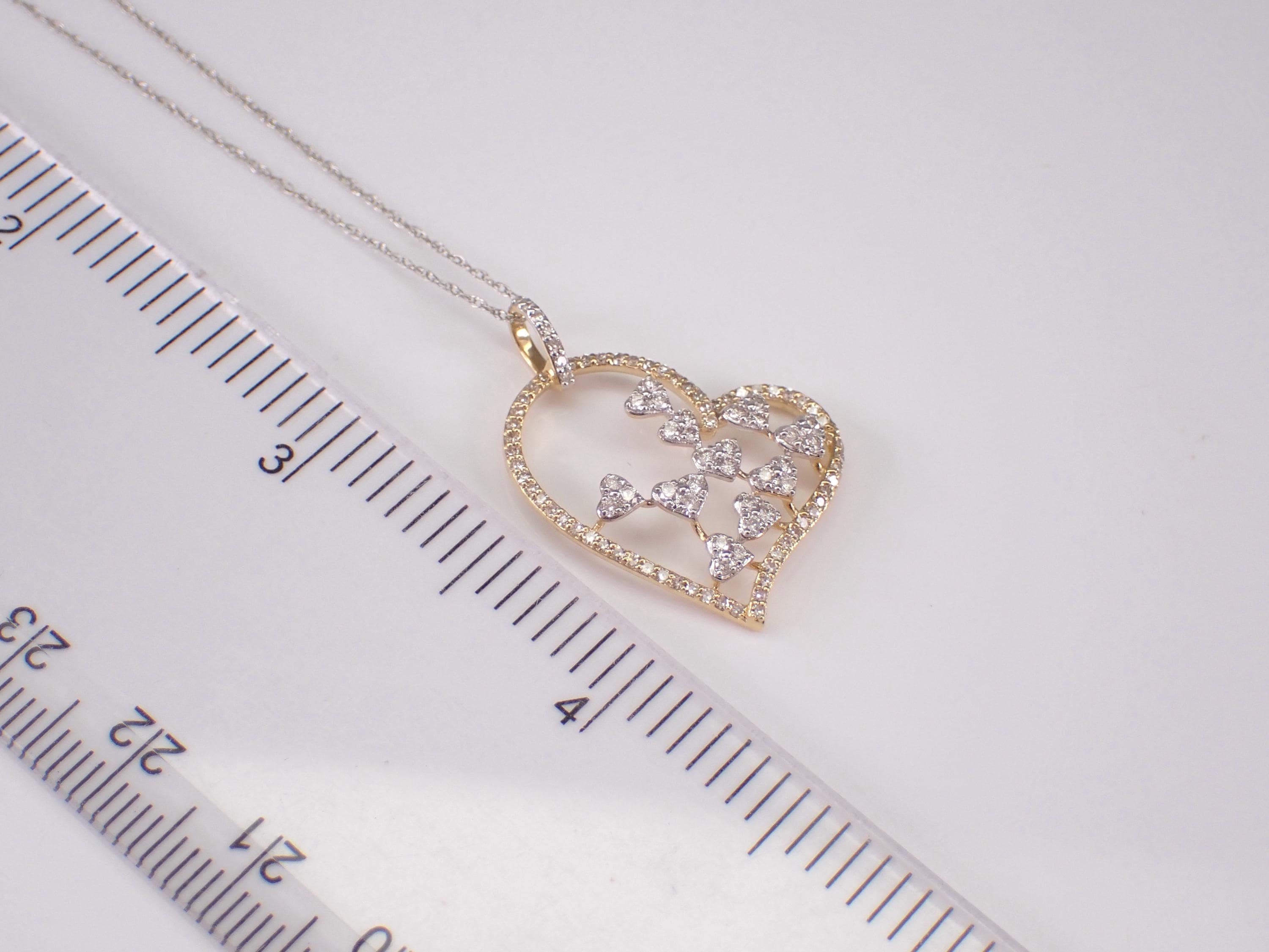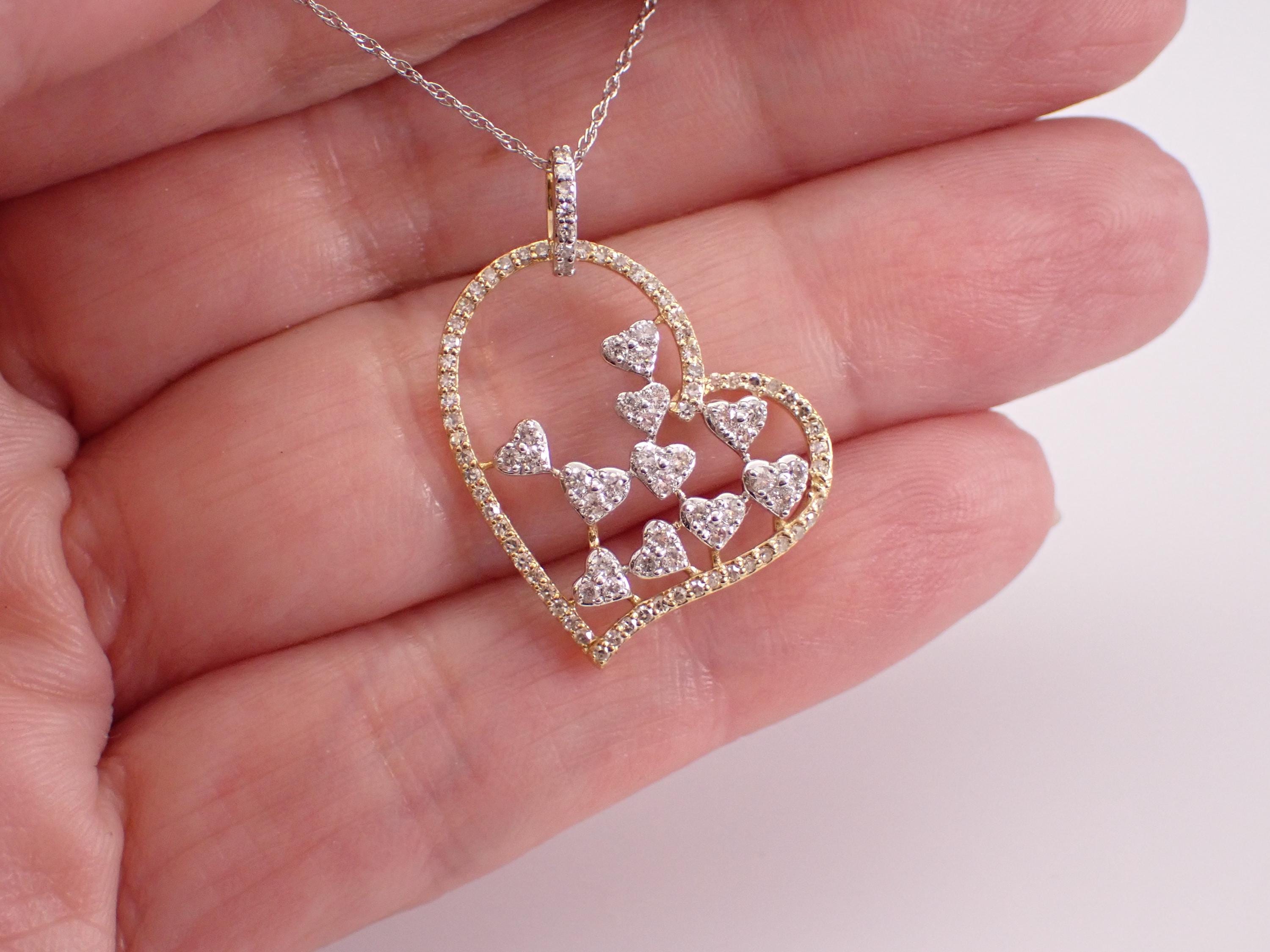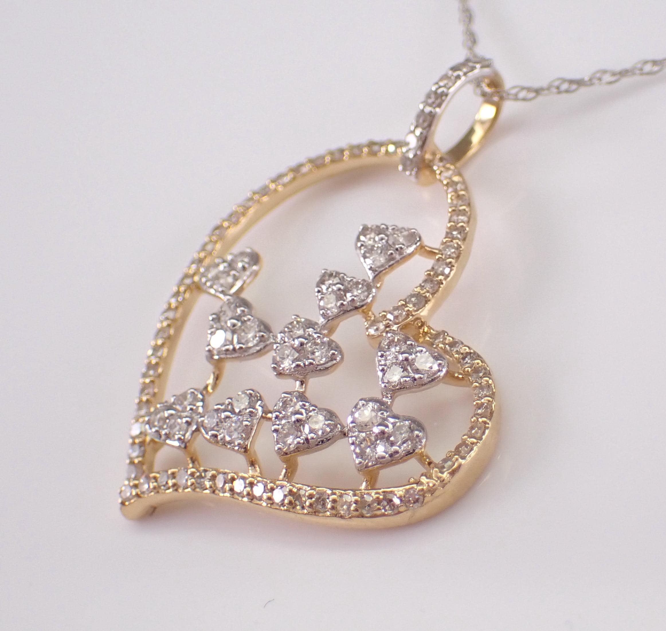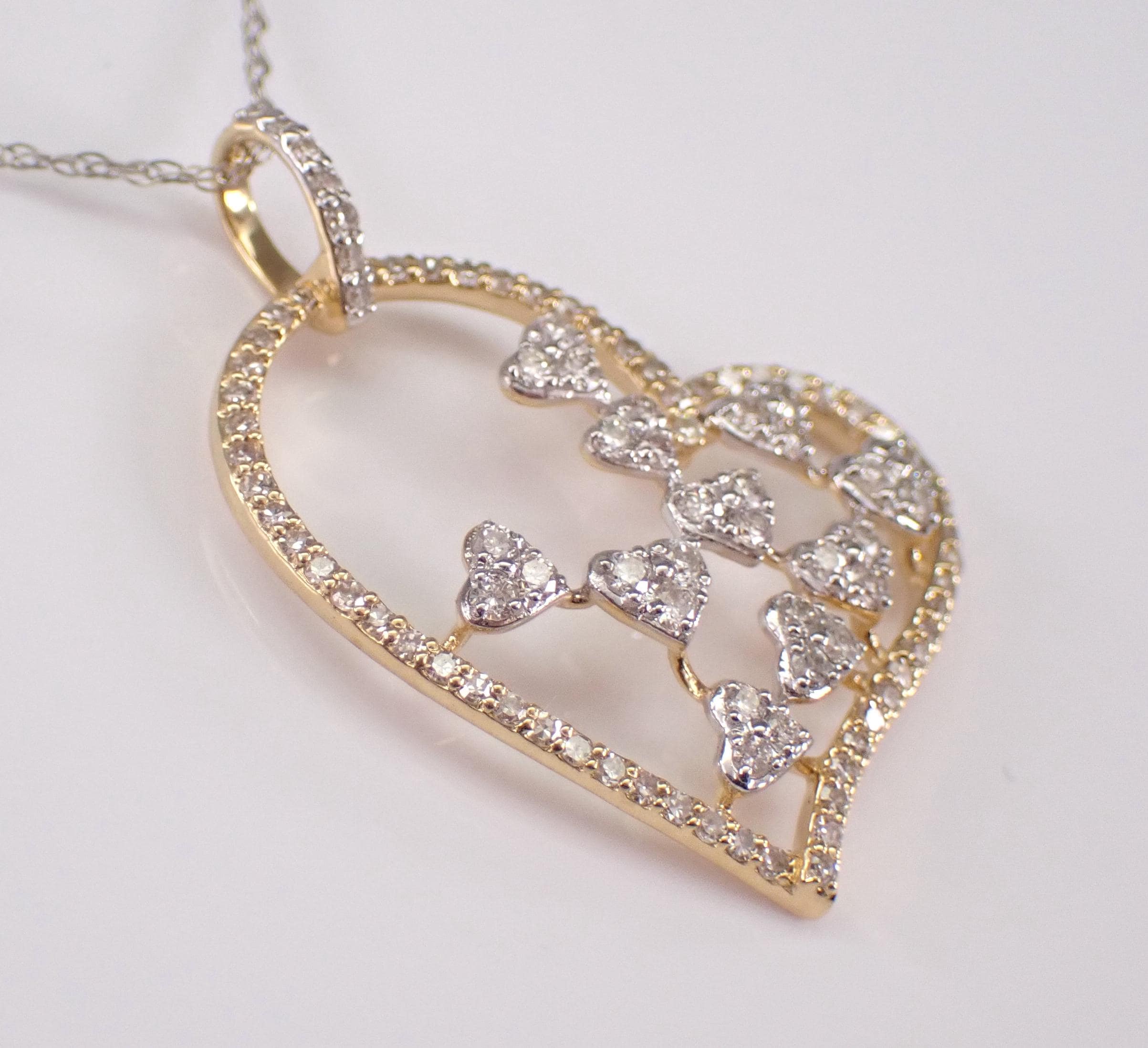 14K White and Yellow Gold Diamond Heart Pendant with Chain. This heart is set with ninety-three genuine Round Brilliant Diamonds. These diamonds are H color, SI/I1 clarity and combine to a total weight of .65 carat. This heart is 14K White and Yellow gold and comes with an 18" 14K White Gold Chain. The heart measures 27 X 21 mm and together with the chain weighs 2.4 grams. The pendant and the chain are accompanied by an appraisal for insurance and authentication purposes, valued at $2,389.00. The necklace will be shipped promptly in a gift box.